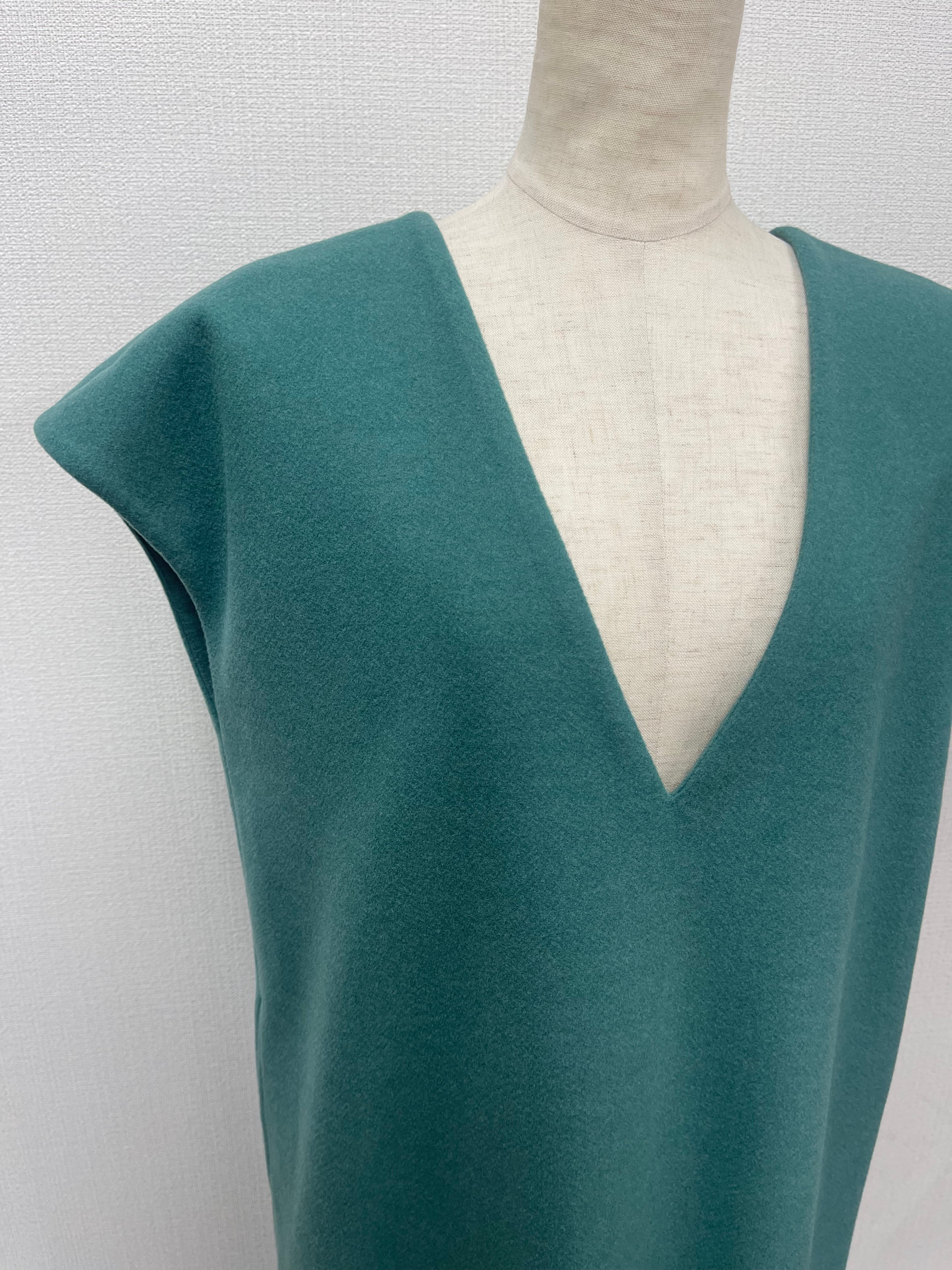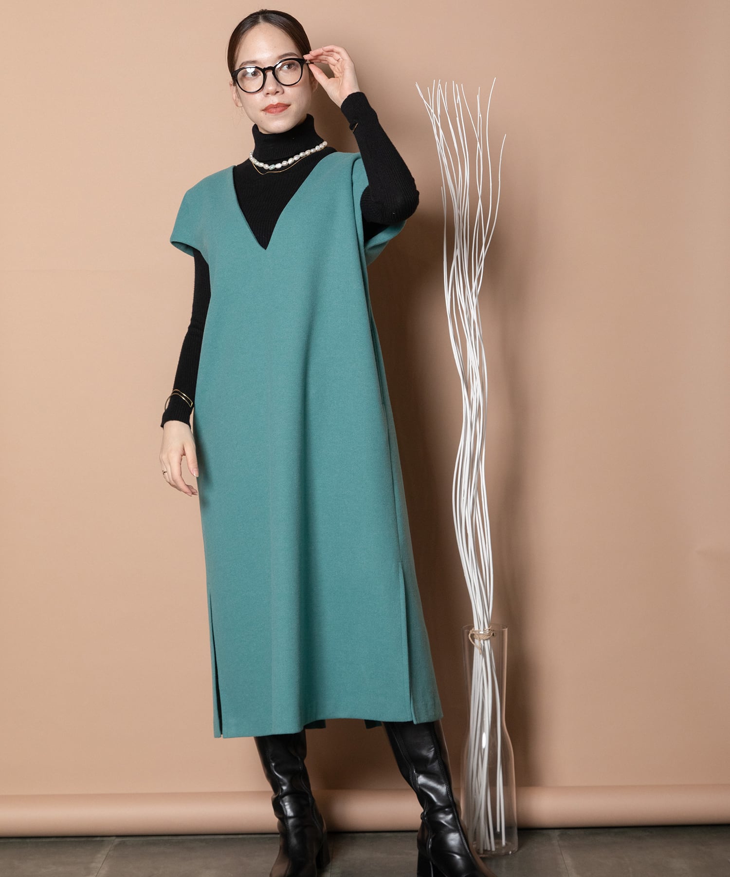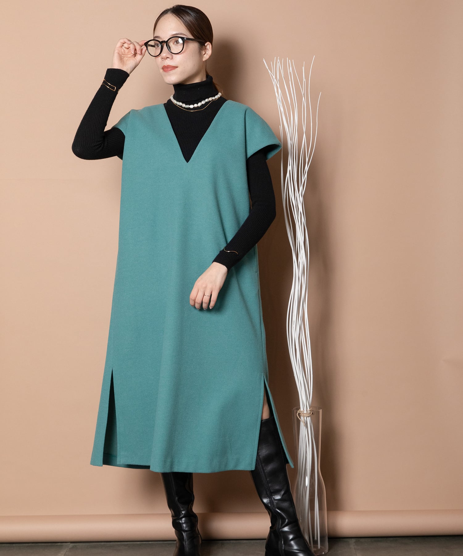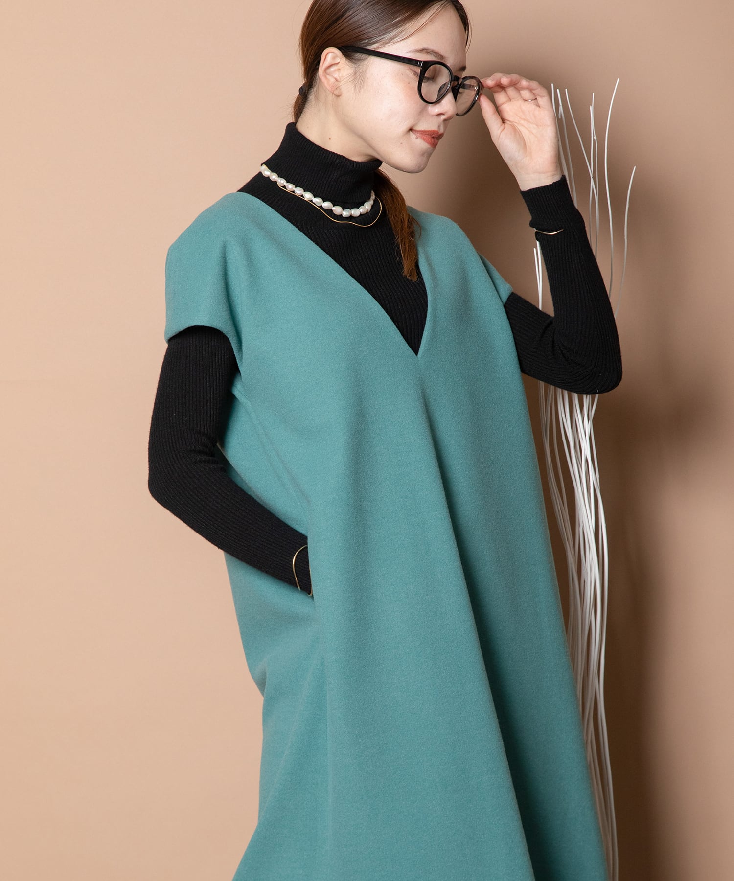 ・深めのVネックが魅力でインナーにはタートルでシンプルコーデがおすすめ