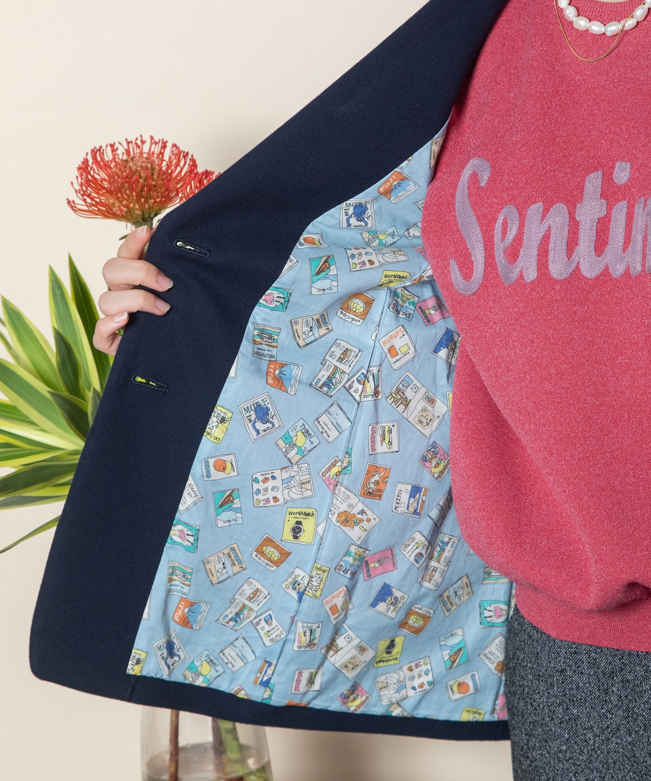 リスペック名品のシングルテーラードジャケット。少し着丈は長めのミドル丈。裏地にこだわりがあり、マガジン柄のイラストがプリントされた柄裏地を使用。メンズ仕立てに作り込まれたマニッシュなシンプルデザイン。