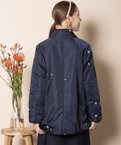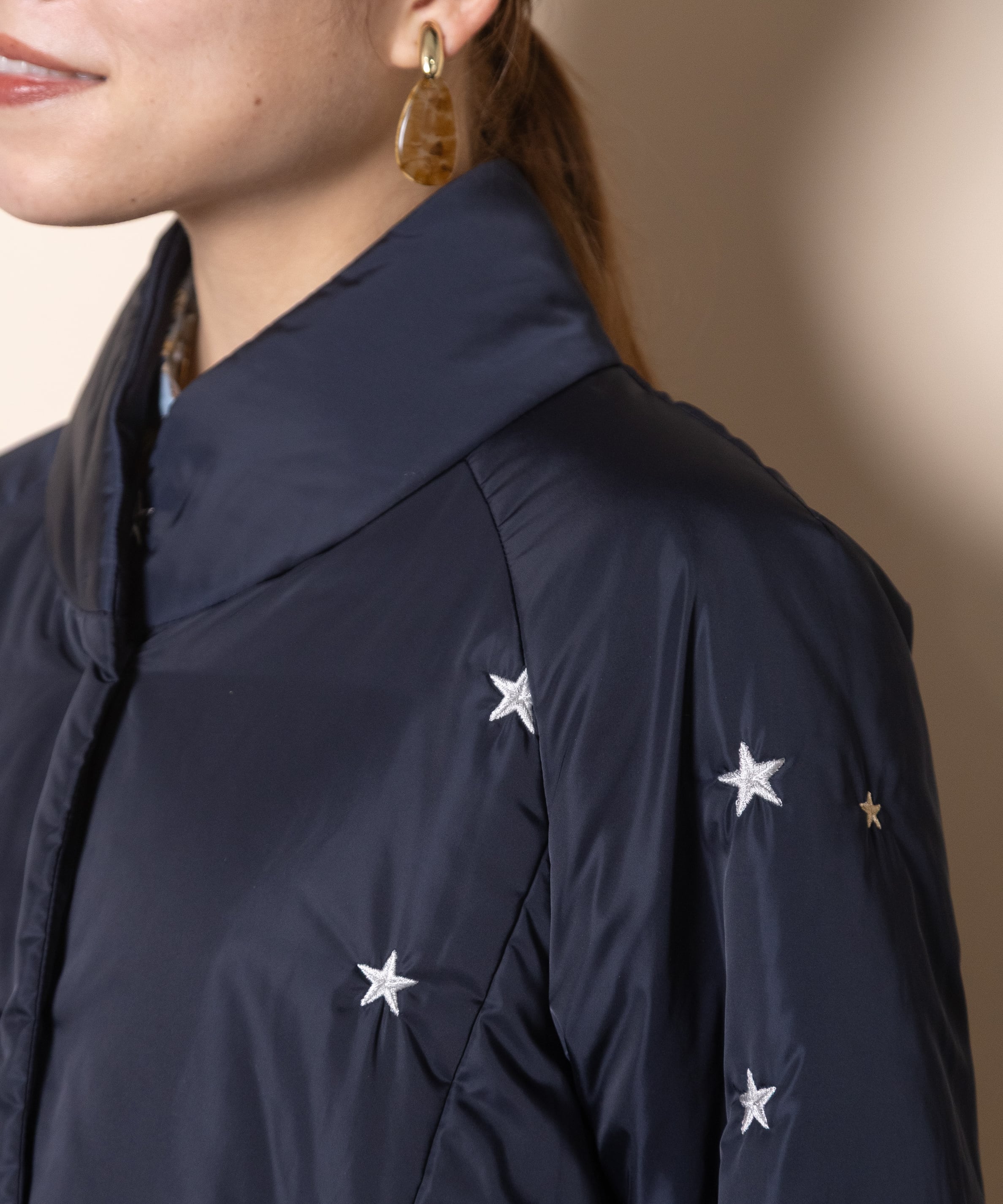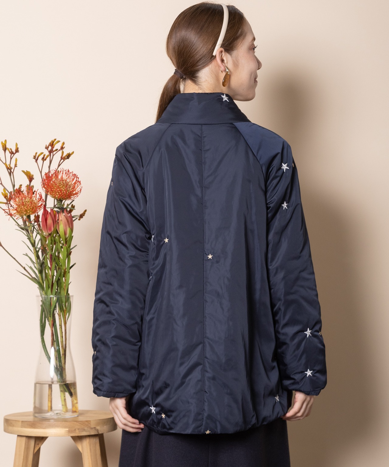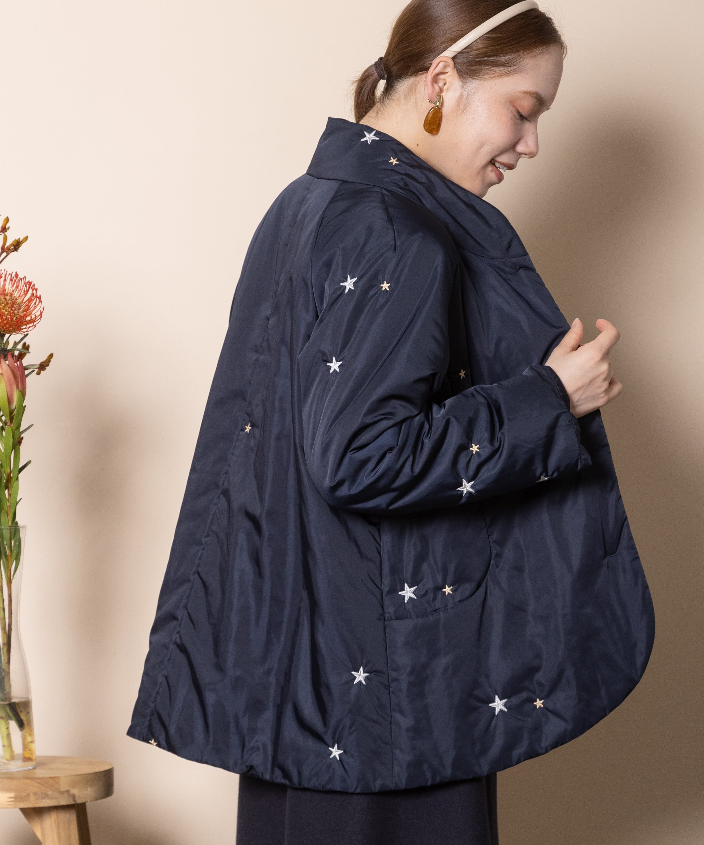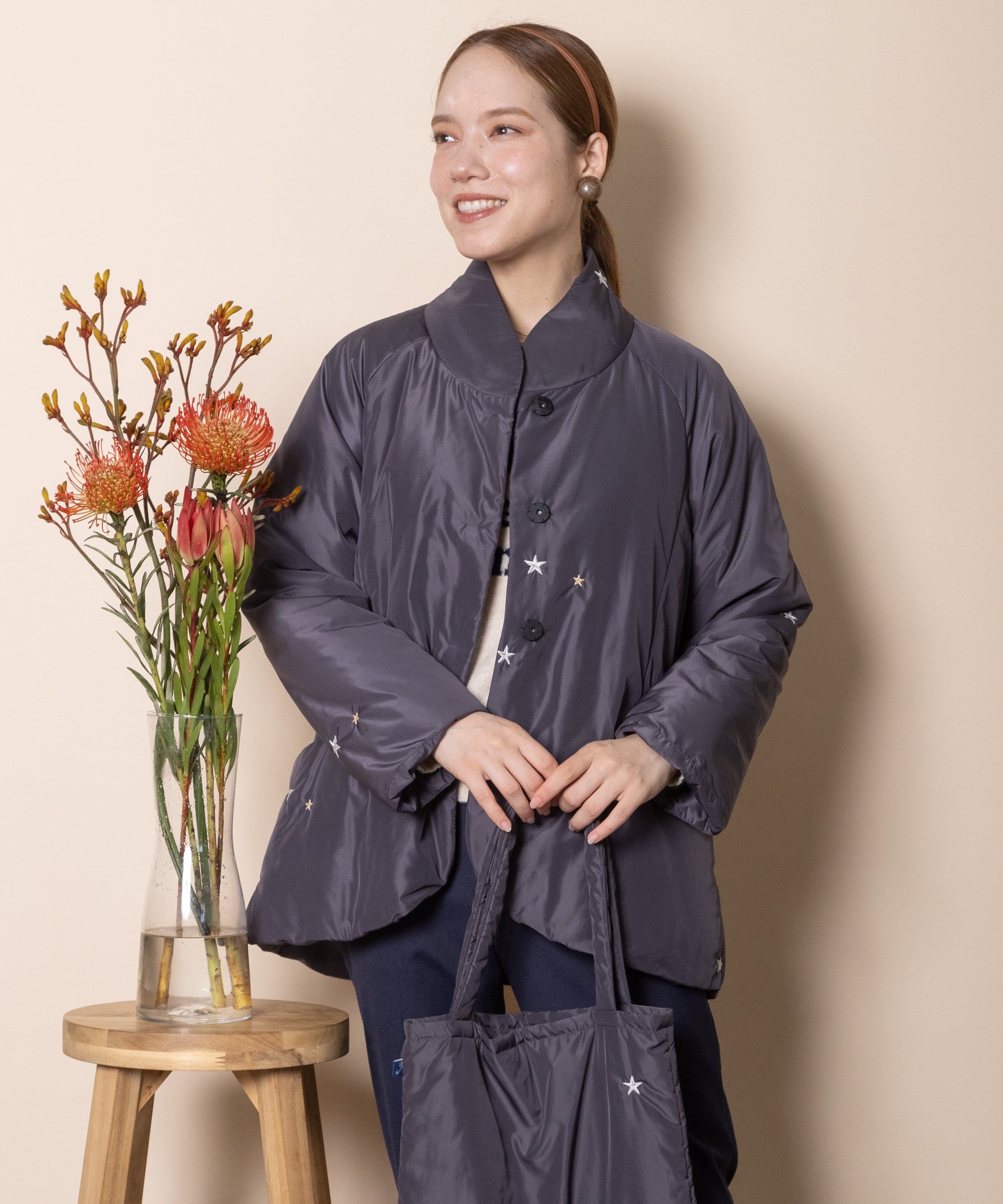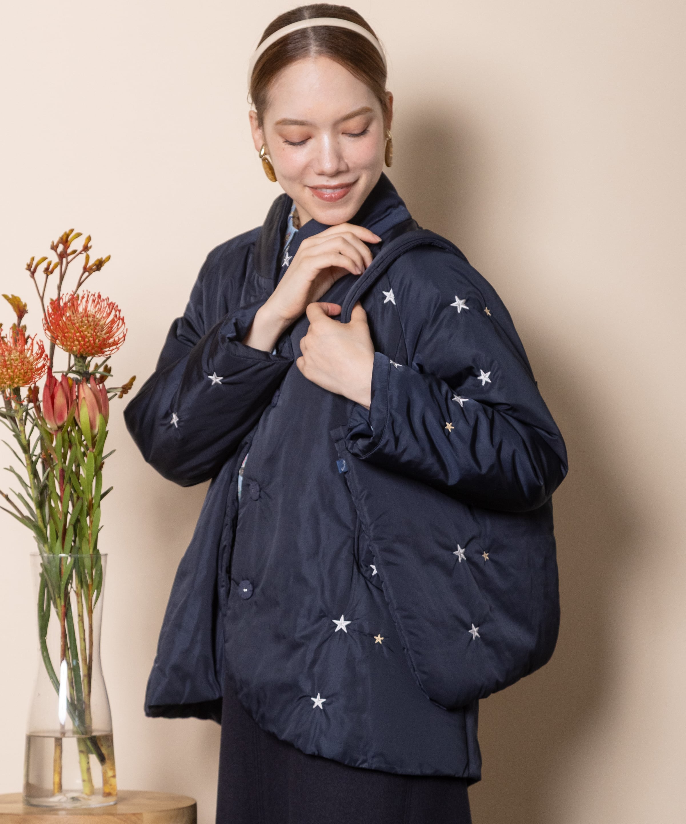 こだわりの星刺繍が全面に施された中綿ジャケット。なんと同素材のトートバックがセットになったオシャレなアイテム。襟元は暖かなショールカラー、比翼仕立てのスナップボタン、裾はラウンドデザインと可愛らしさの中に上品さのあるアウター。