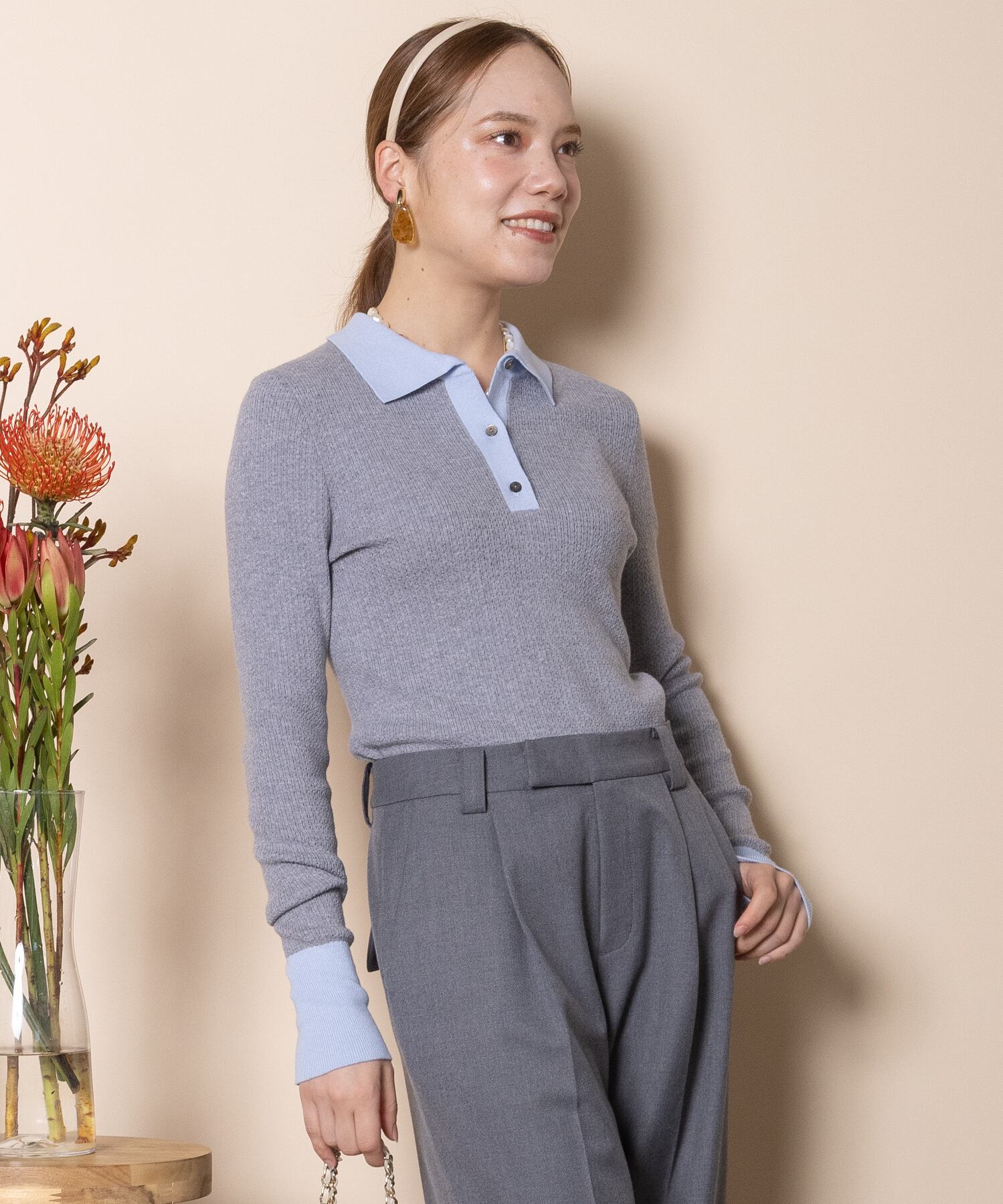 今人気のガーリーなポロニット。襟元と袖口が配色になった映え感あるガーリーなアイテム。程よいフィット感のある編み地でスタイルアップが叶うオシャレなニットです。