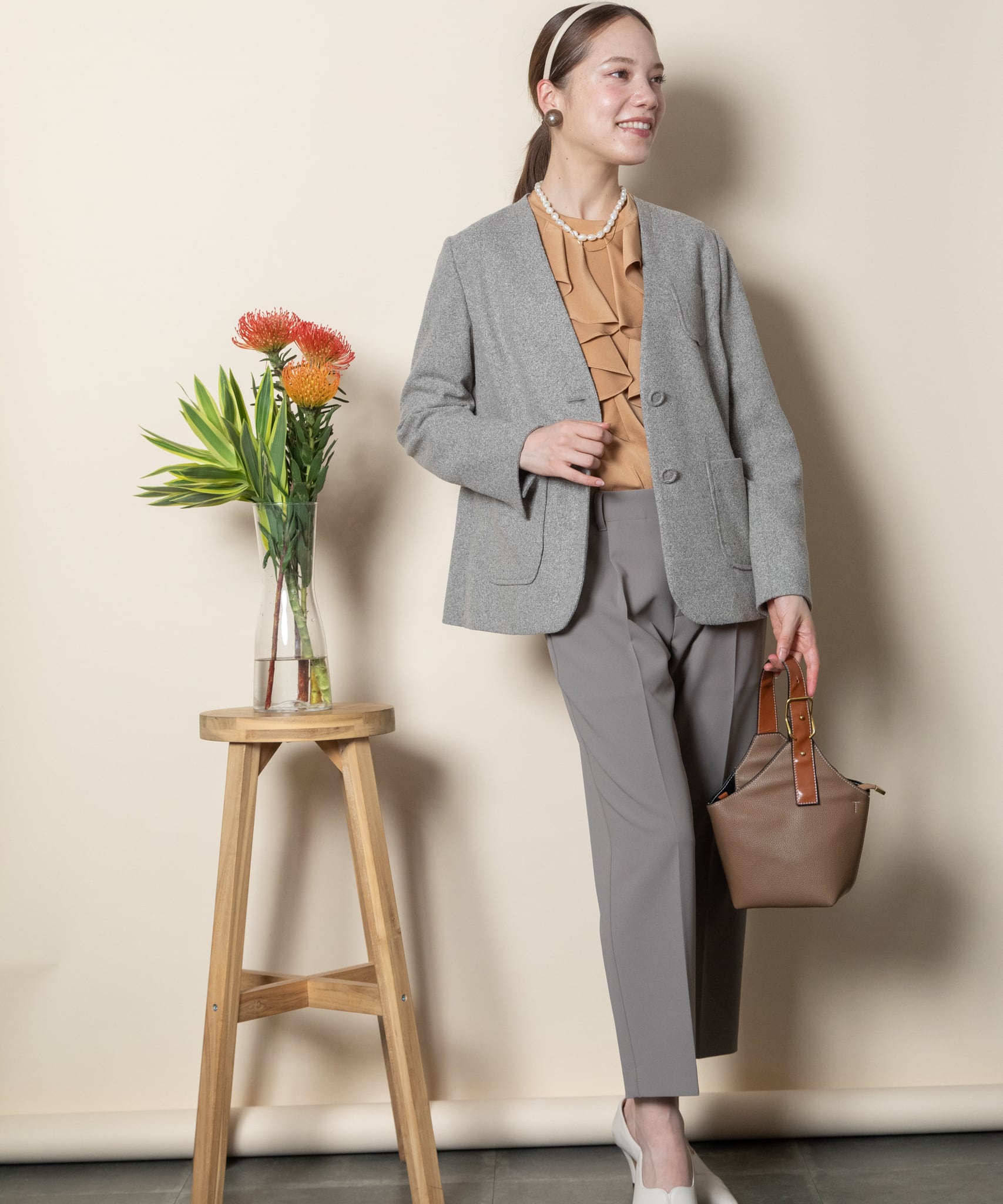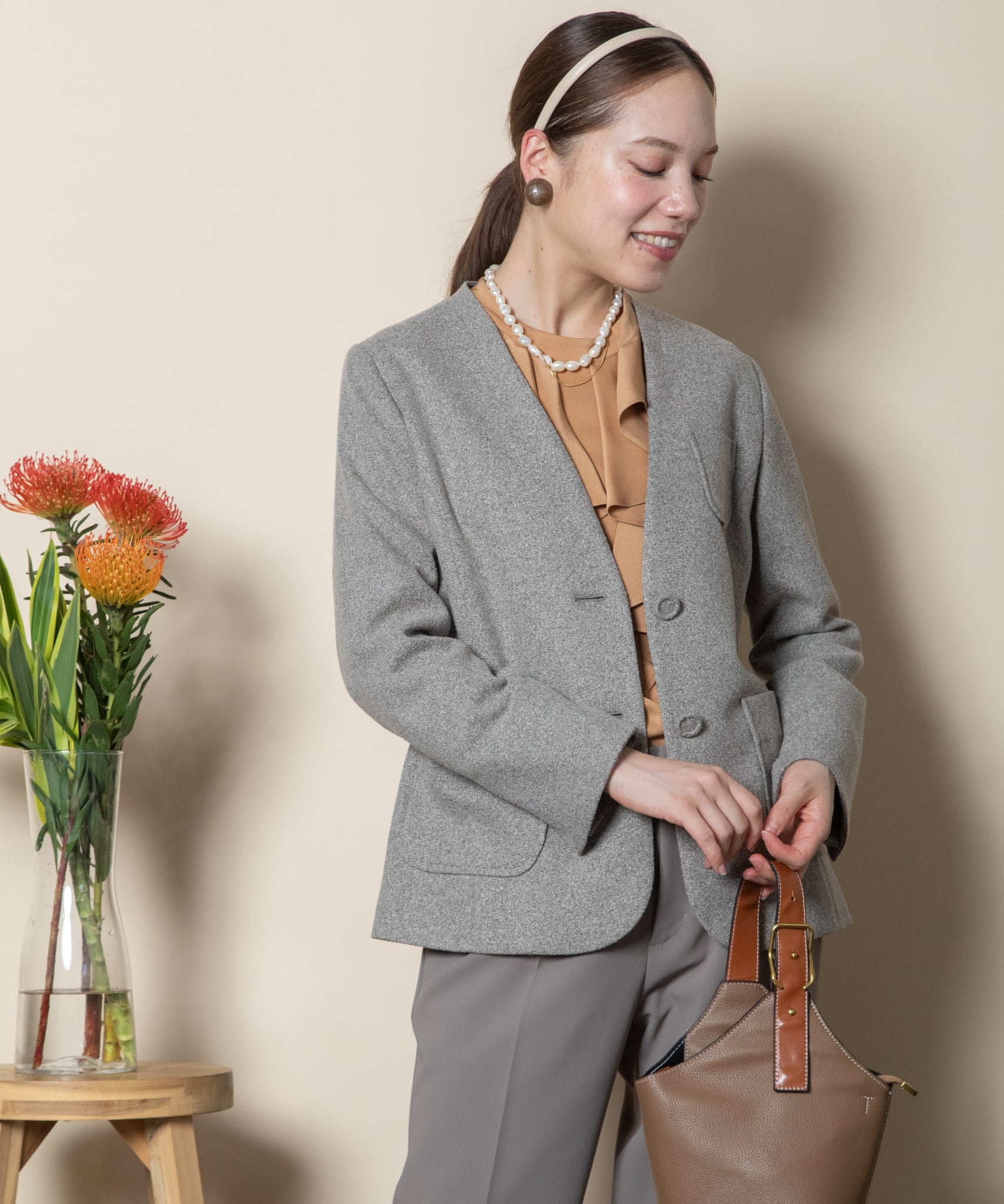 セットアップ派におすすめの上質なハリスツイード見えするノーカラージャケット。アウトポケットがクラシカルな雰囲気。同素材のテーパードパンツとあわせれば、ミニマルなマニッシュスタイルが完成。きっちりした丸の内スタイルのセットアップスーツ。
