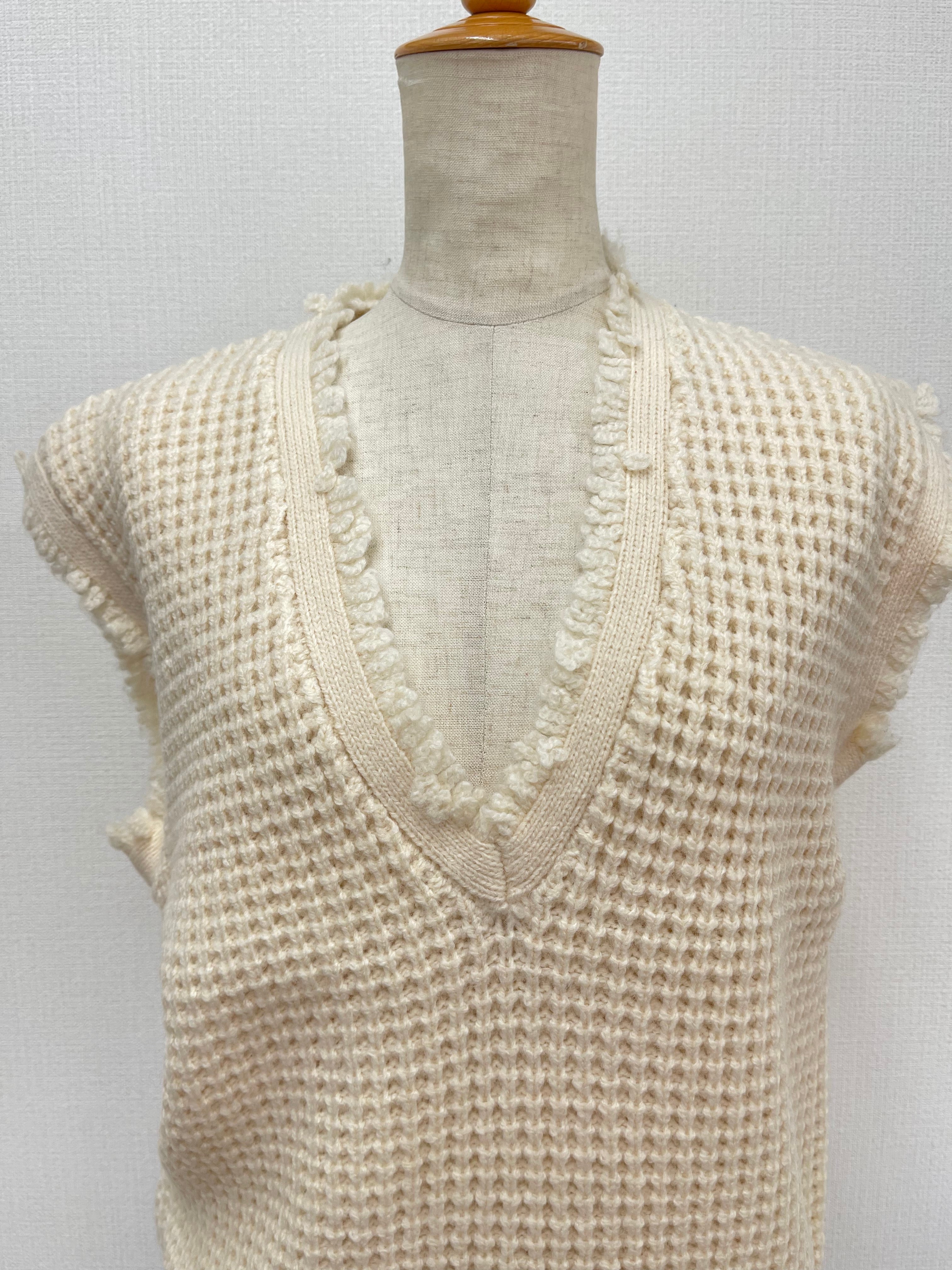 ざっくりした畦編みが特徴的なニットベスト。首元と袖部分はフリンジ仕様のデザイン。ワンポイントのオシャレにおすすめのアイテム。インにはタートルやブラウスとのコーデがおすすめ。