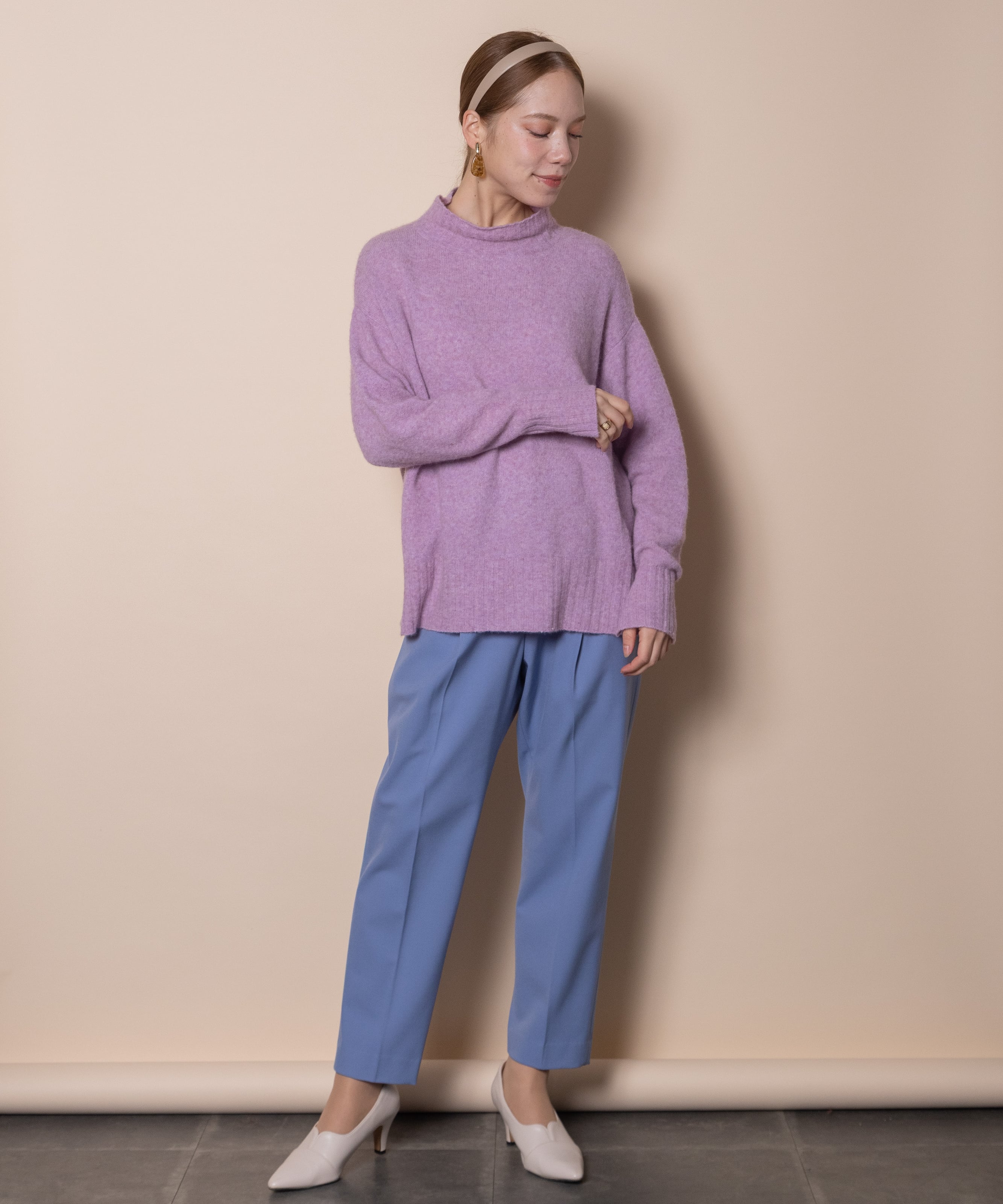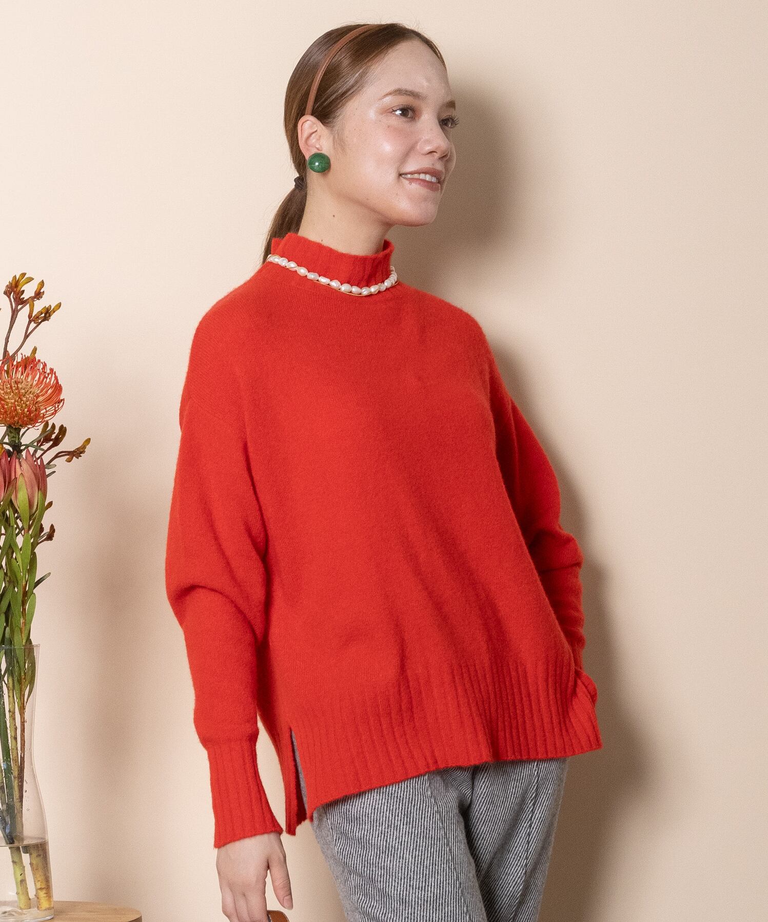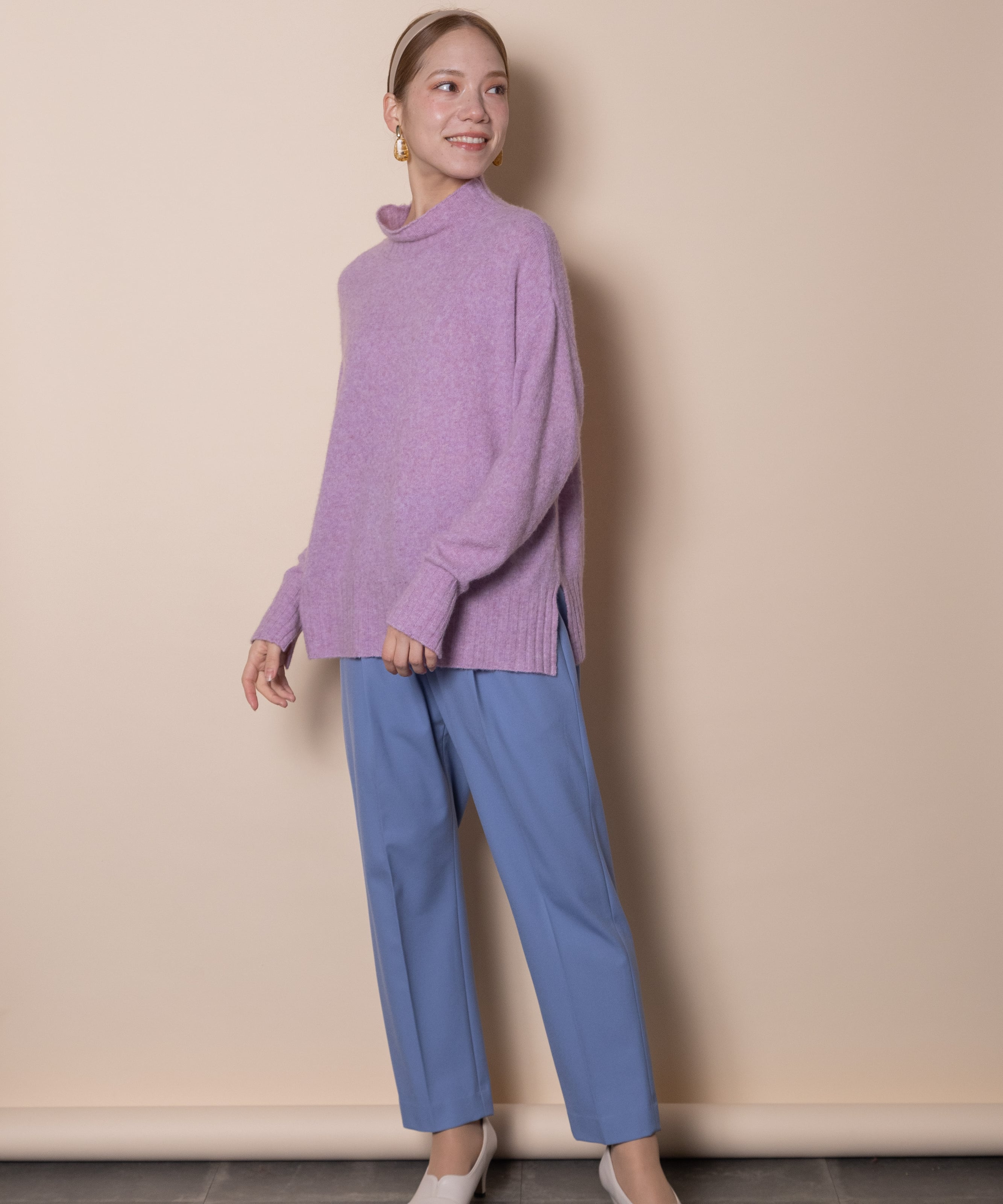 フォックスやヤクのような軽くて暖かなラクーンウールのハイネックニット。着丈は長めリラックスシルエットで着心地もソフトでデイリーに大活躍間違いなし。シンプルなハイネックに袖口と裾にスリットデザインがポイント。発色の良いカラーニットです。