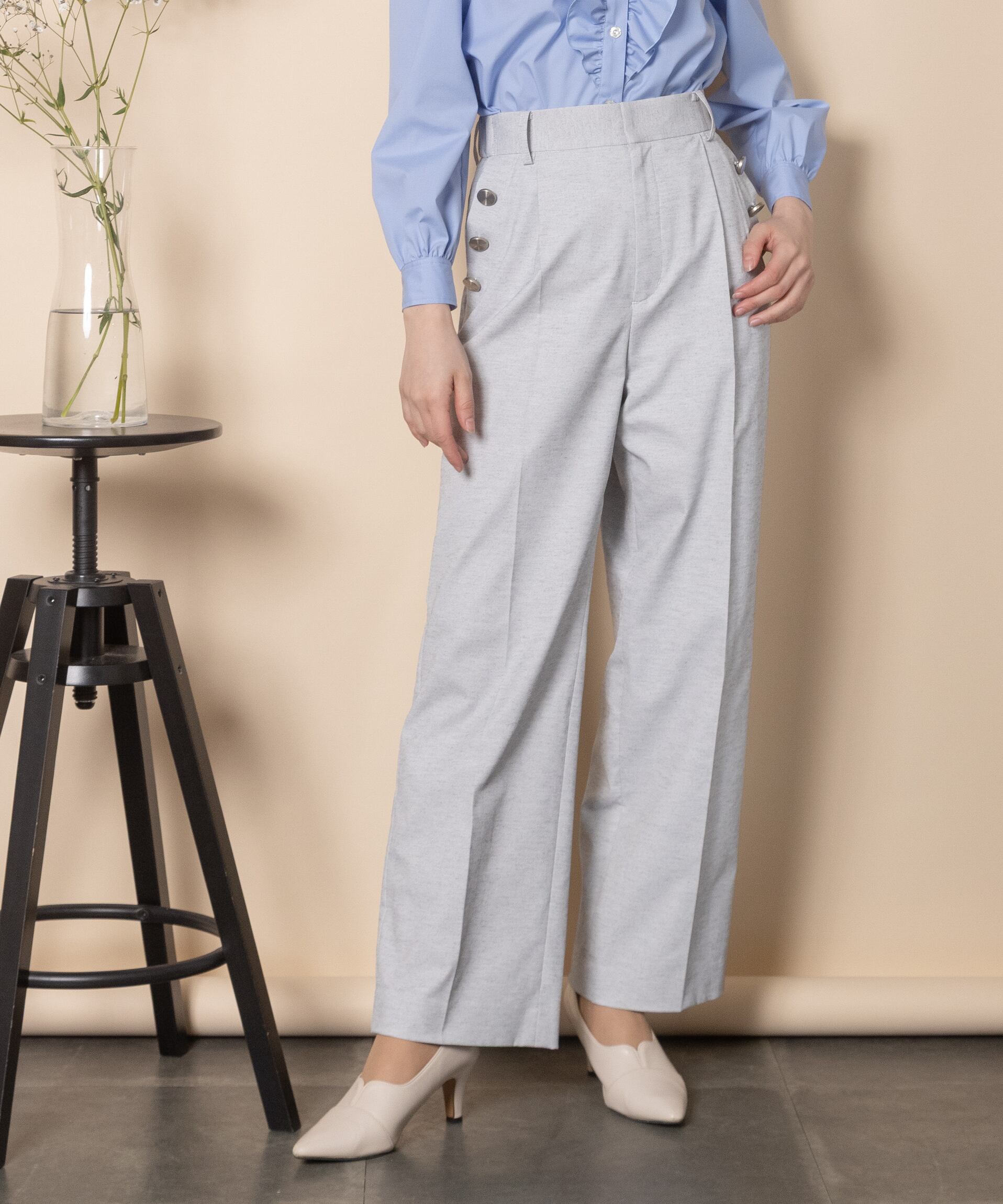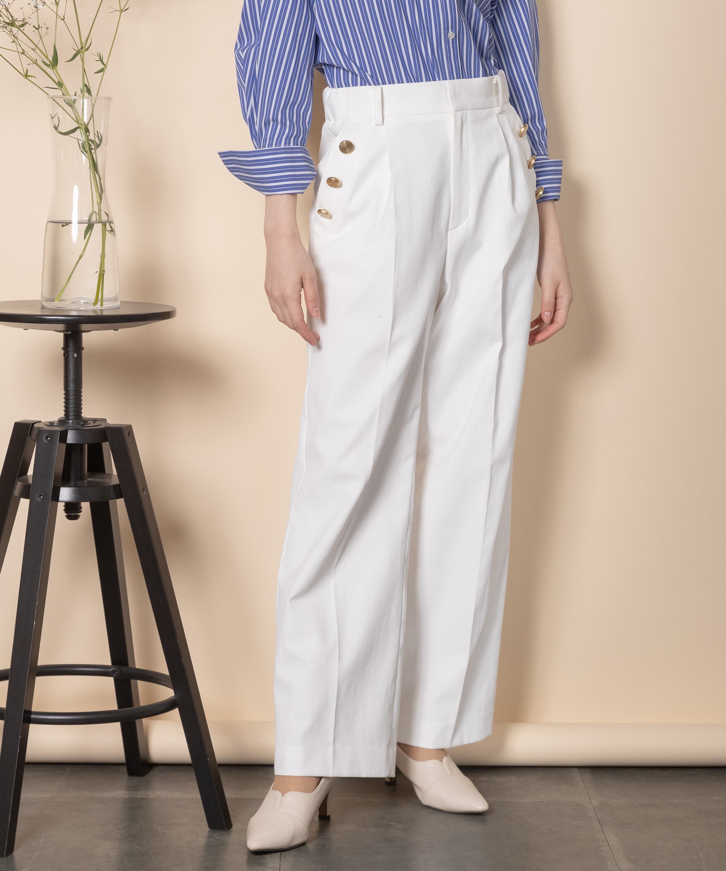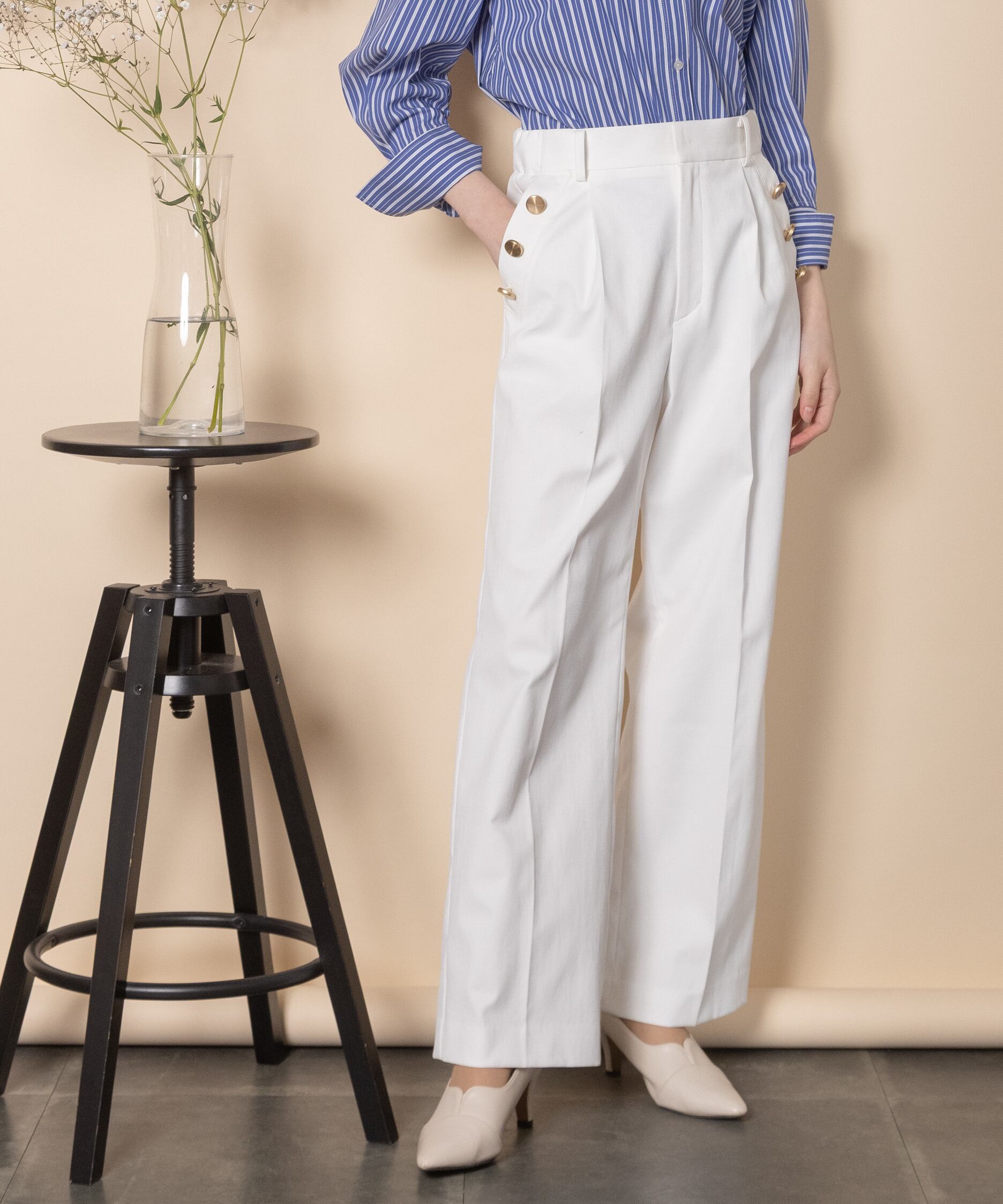大人カジュアル派におすすめのキレイめワイドフレアパンツ。脚長効果抜群のセンタープレスにハイウエストタイプ。ポケットボタンのデザインがセーラーパンツ風でオシャレ。両サイドがゴム仕様。マニッシュ・クール・エレガントに決まります。