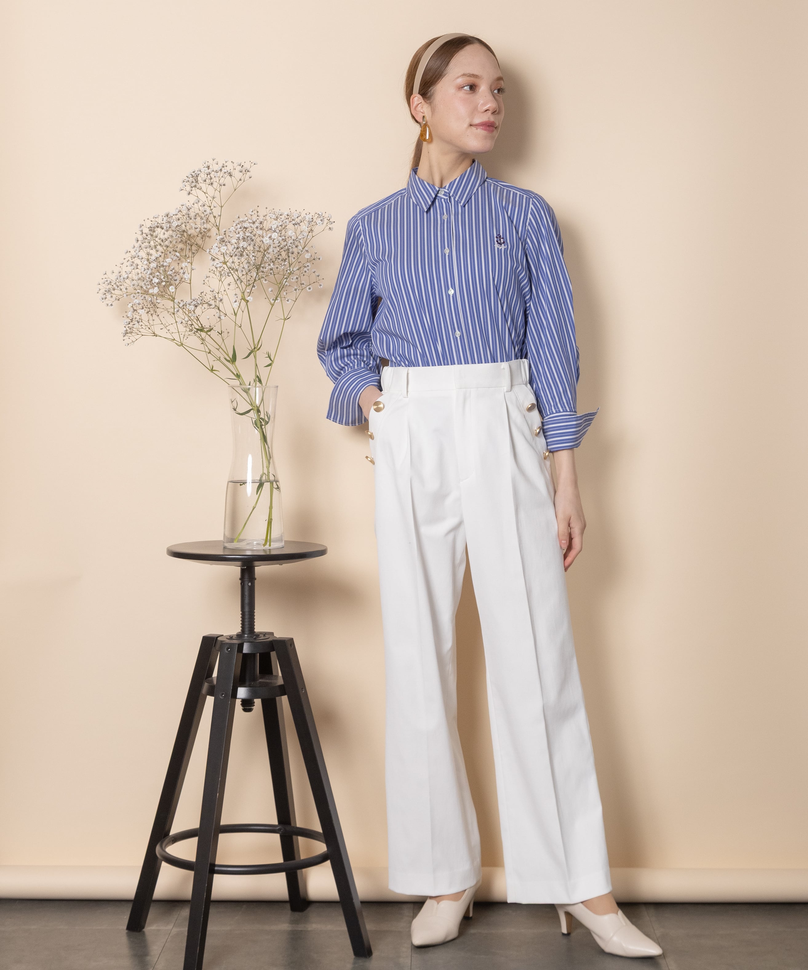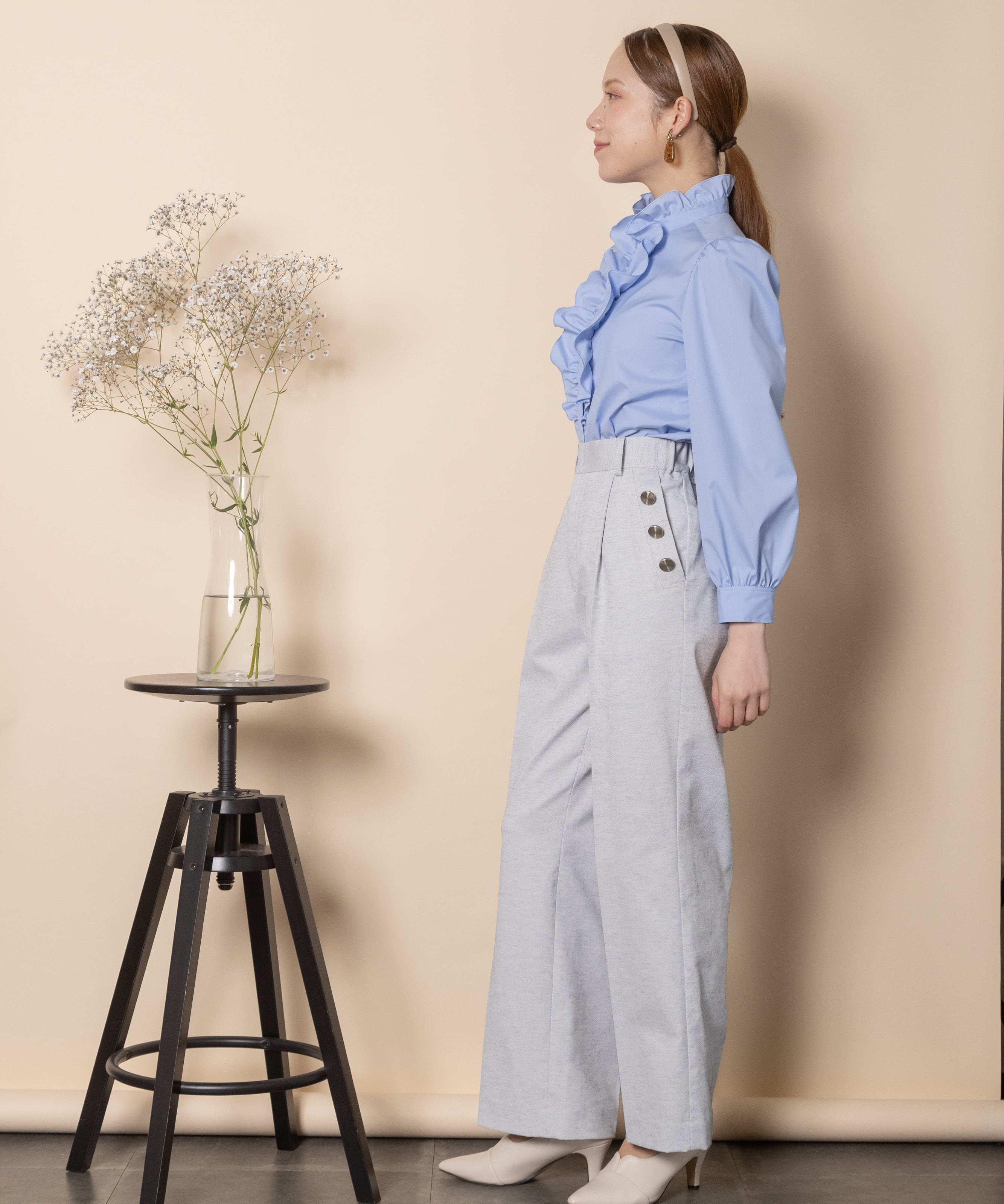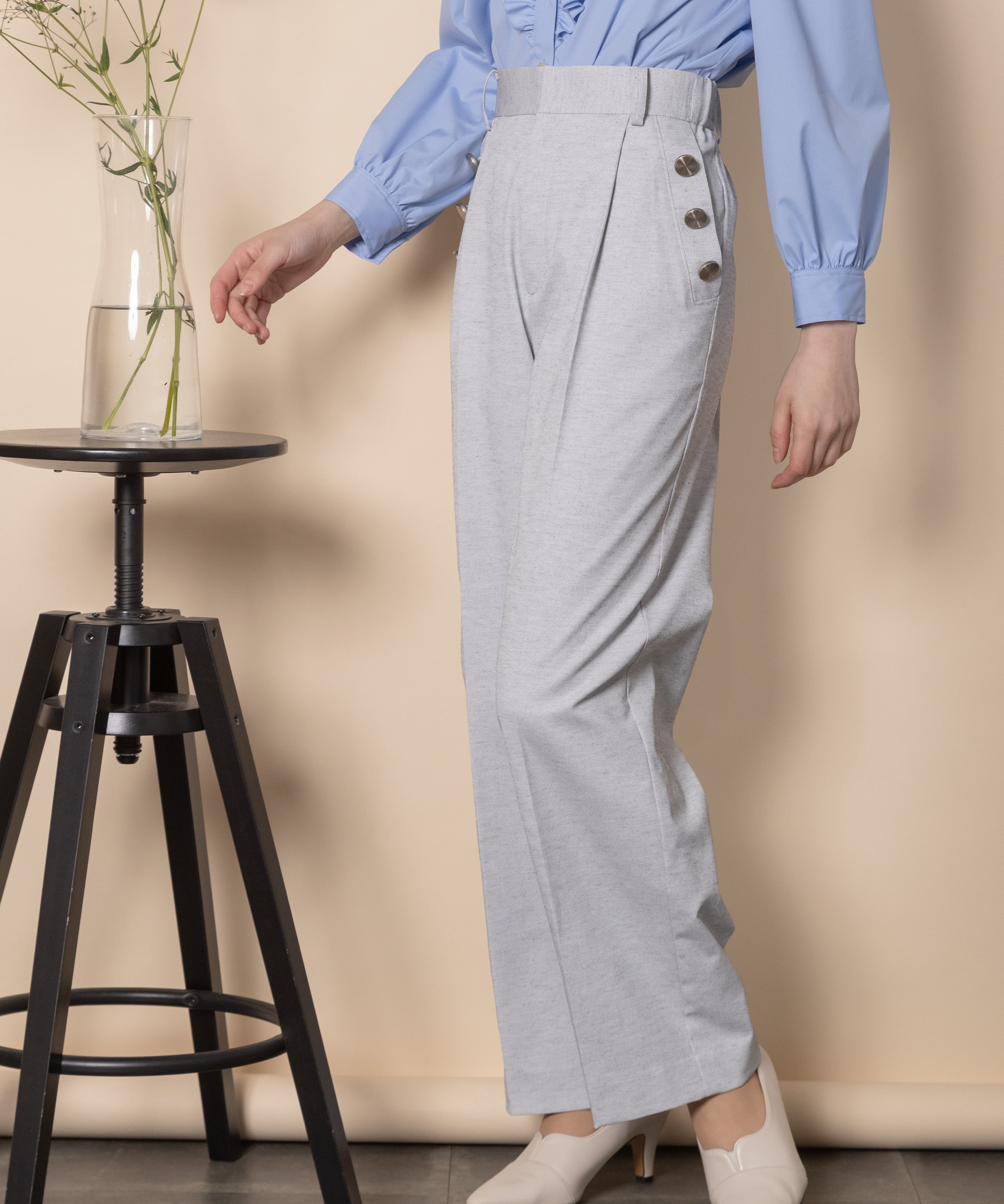 大人カジュアル派におすすめのキレイめワイドフレアパンツ。脚長効果抜群のセンタープレスにハイウエストタイプ。ポケットボタンのデザインがセーラーパンツ風でオシャレ。両サイドがゴム仕様。マニッシュ・クール・エレガントに決まります。