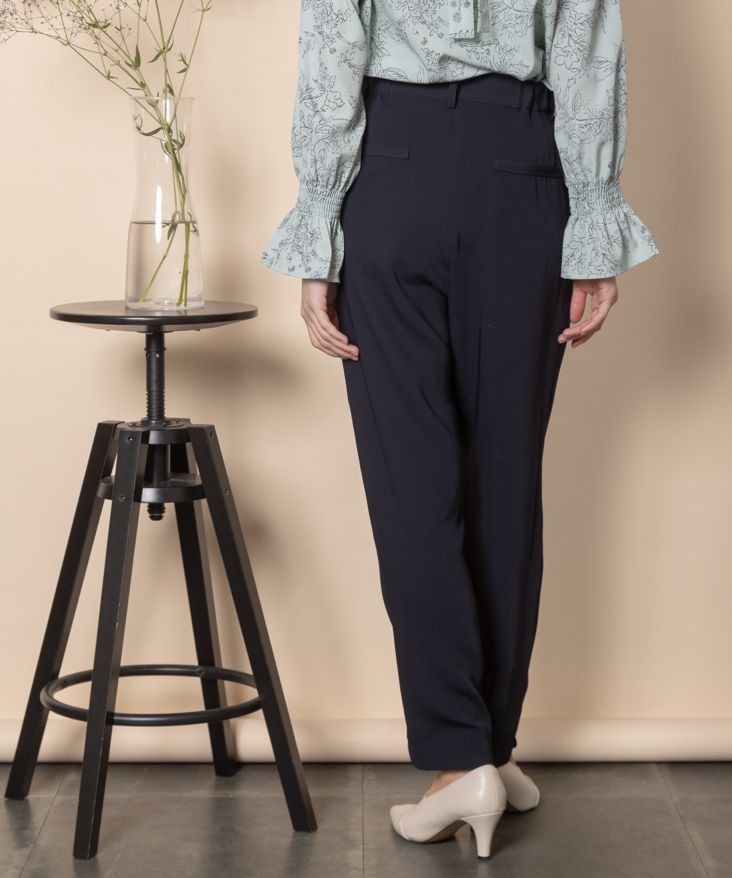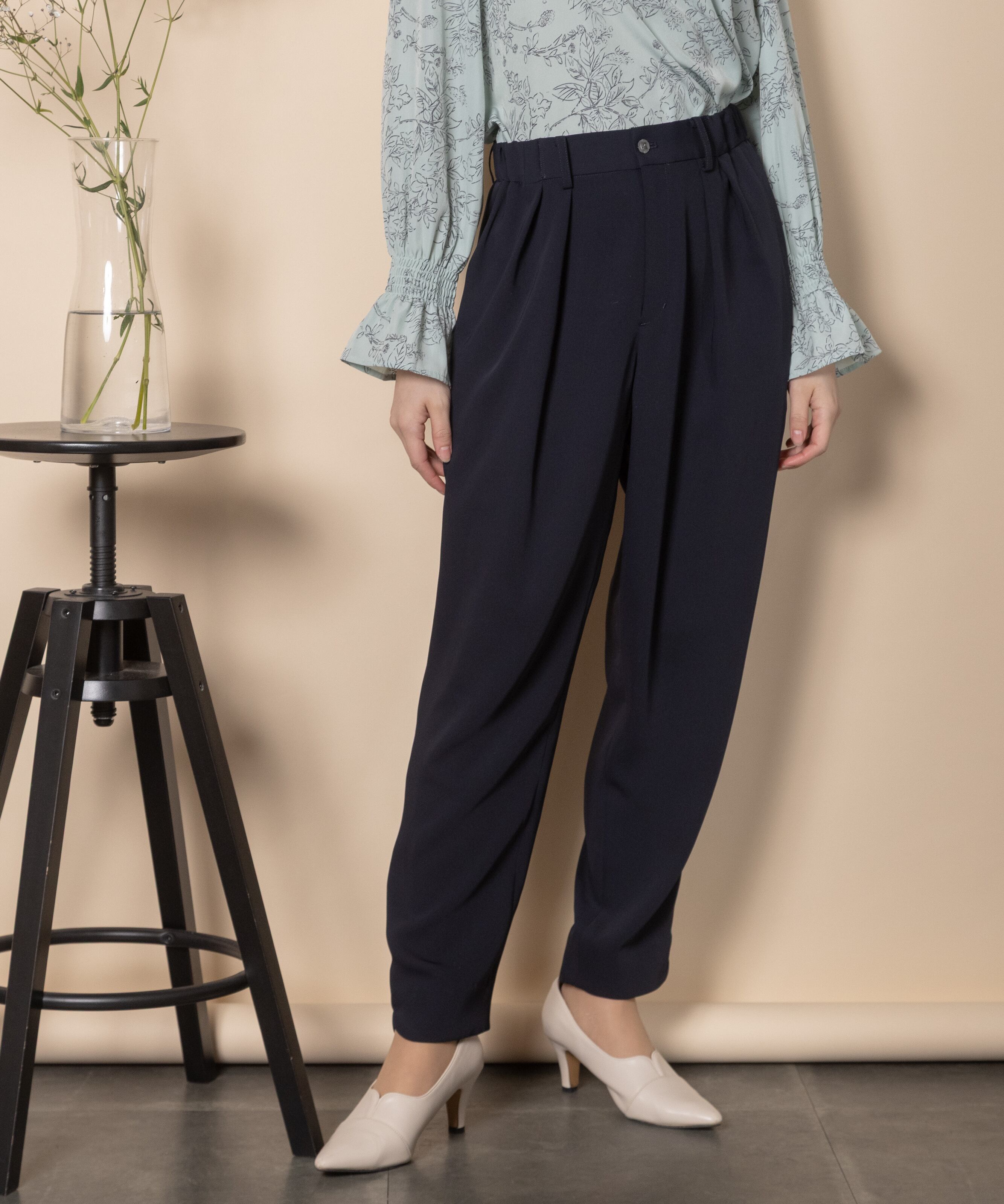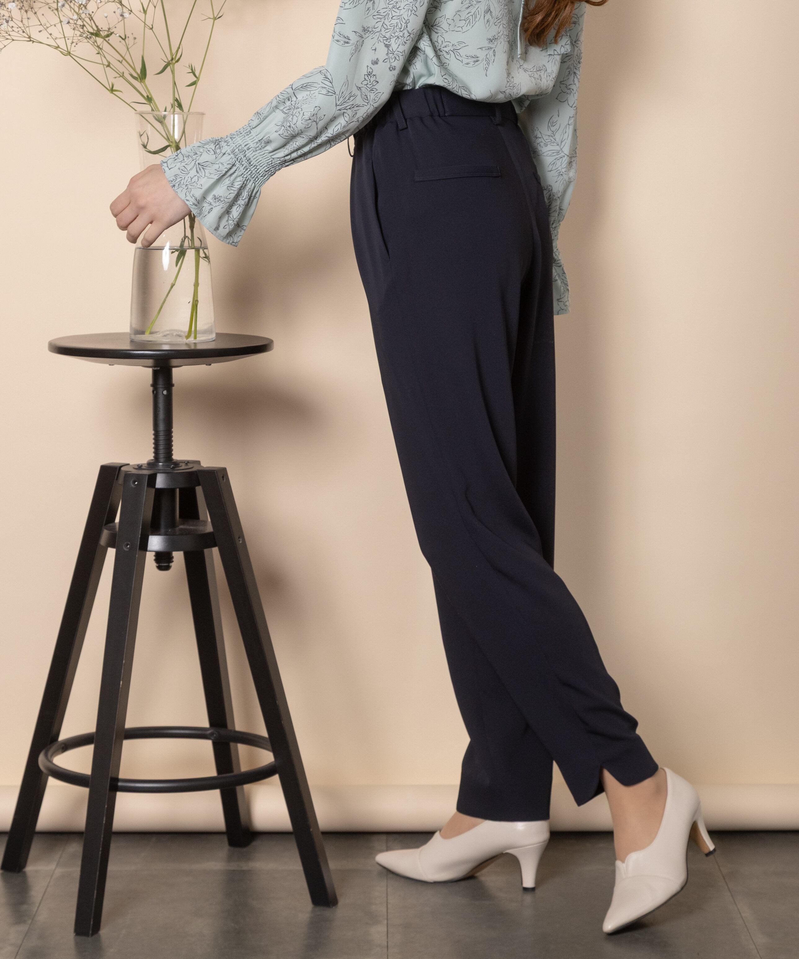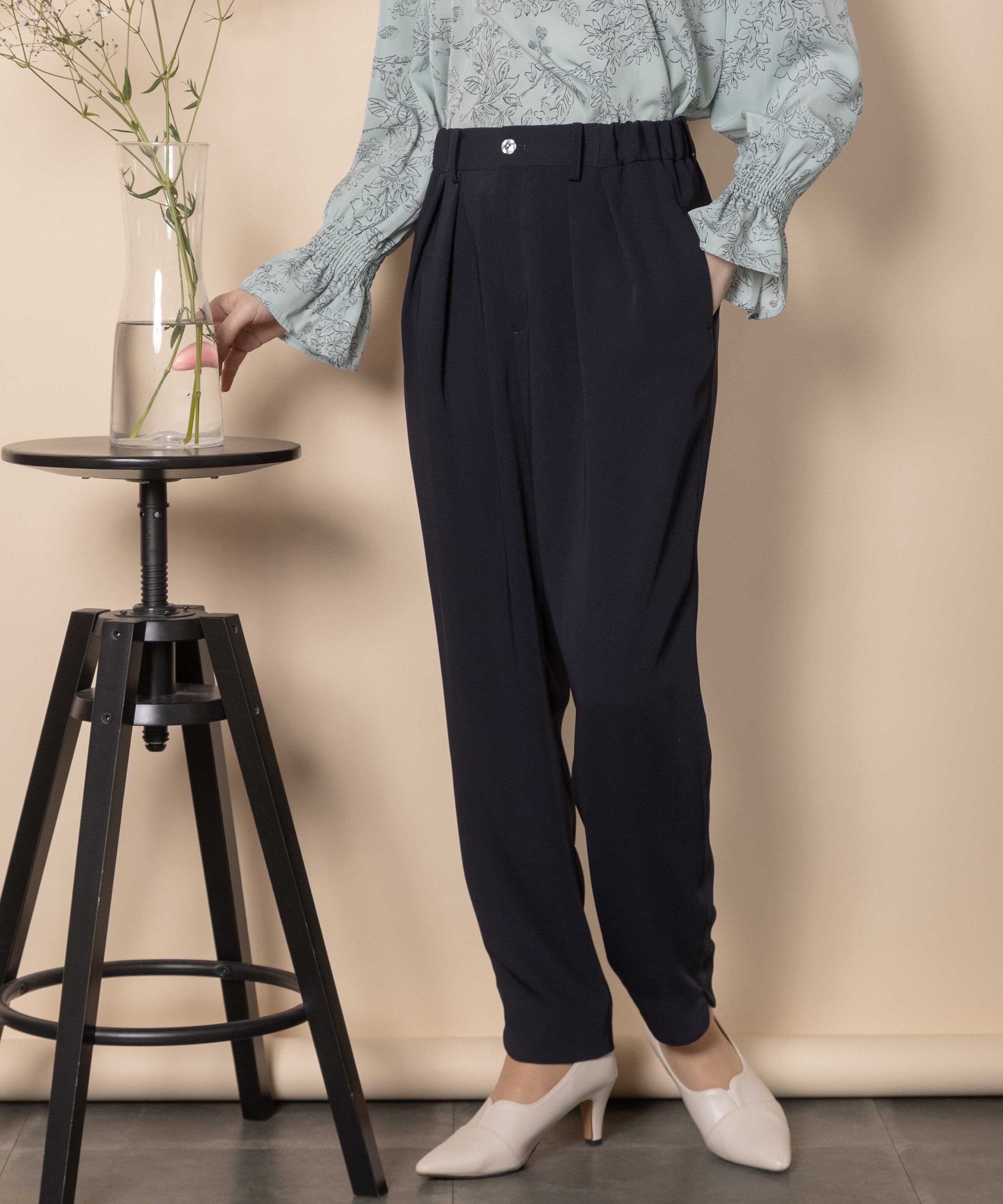 オフィスシーンやセレモニーシーンなどきちんとしたシーンで大活躍するパンツ。キレイめブラウスとの相性抜群です。