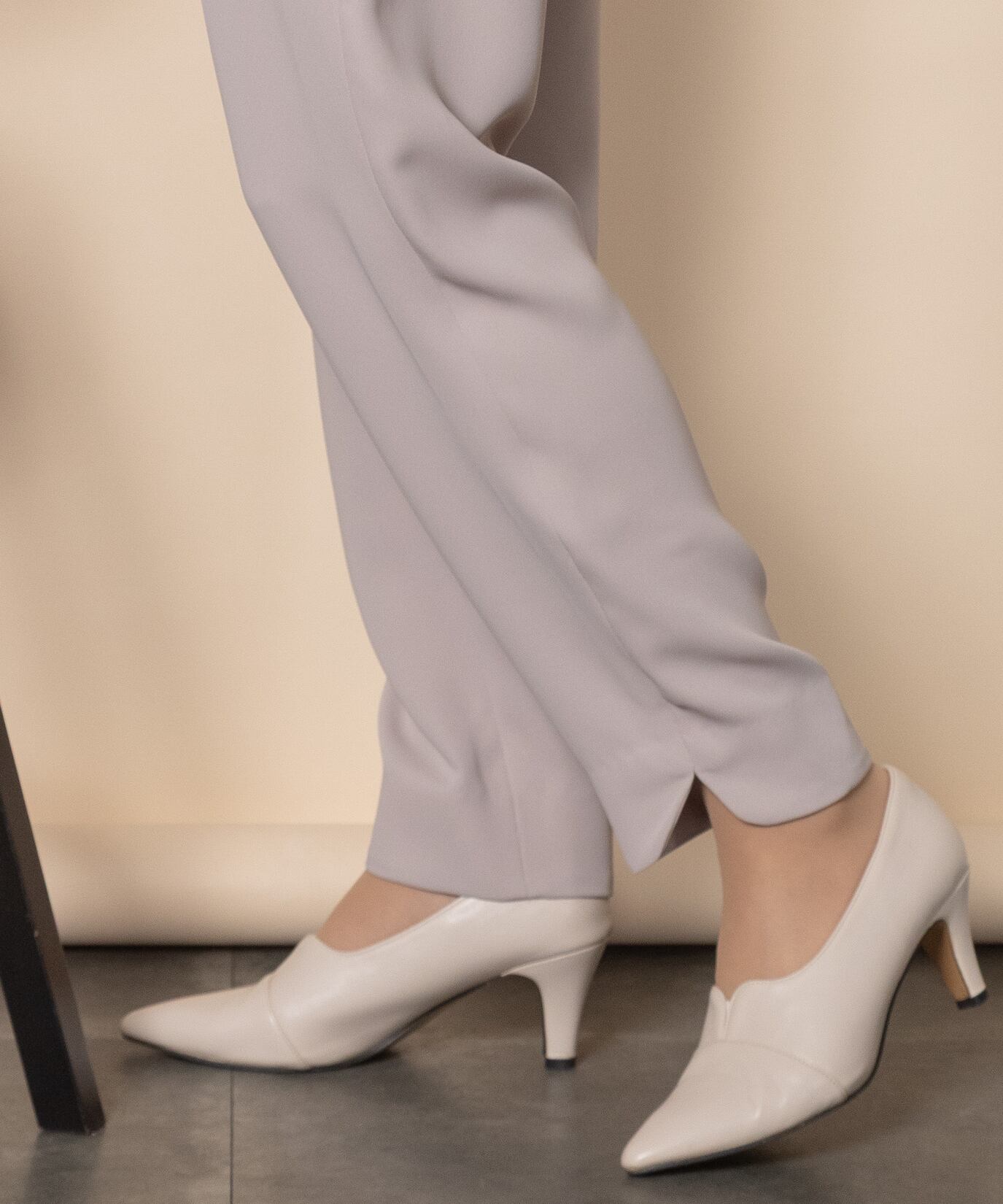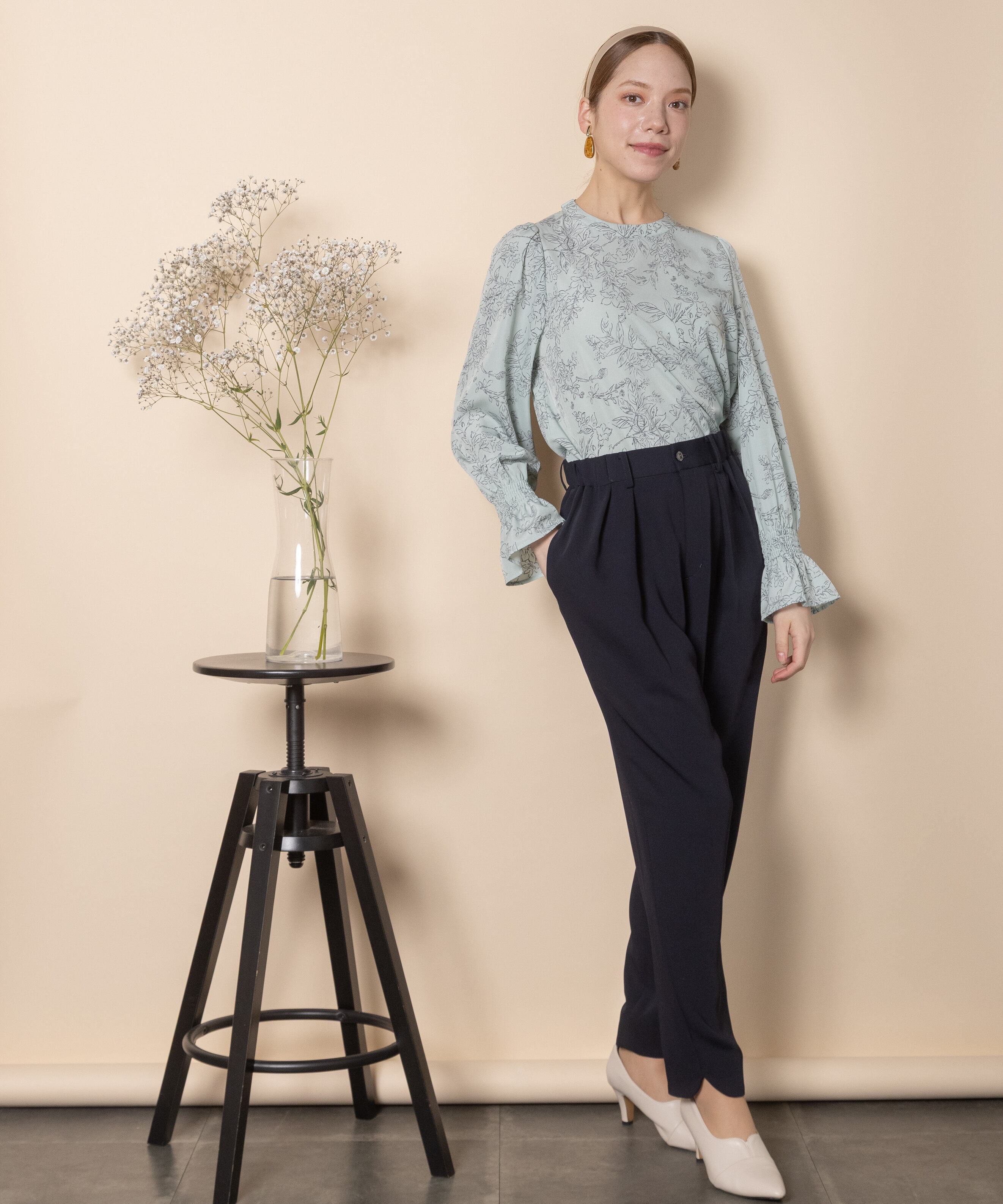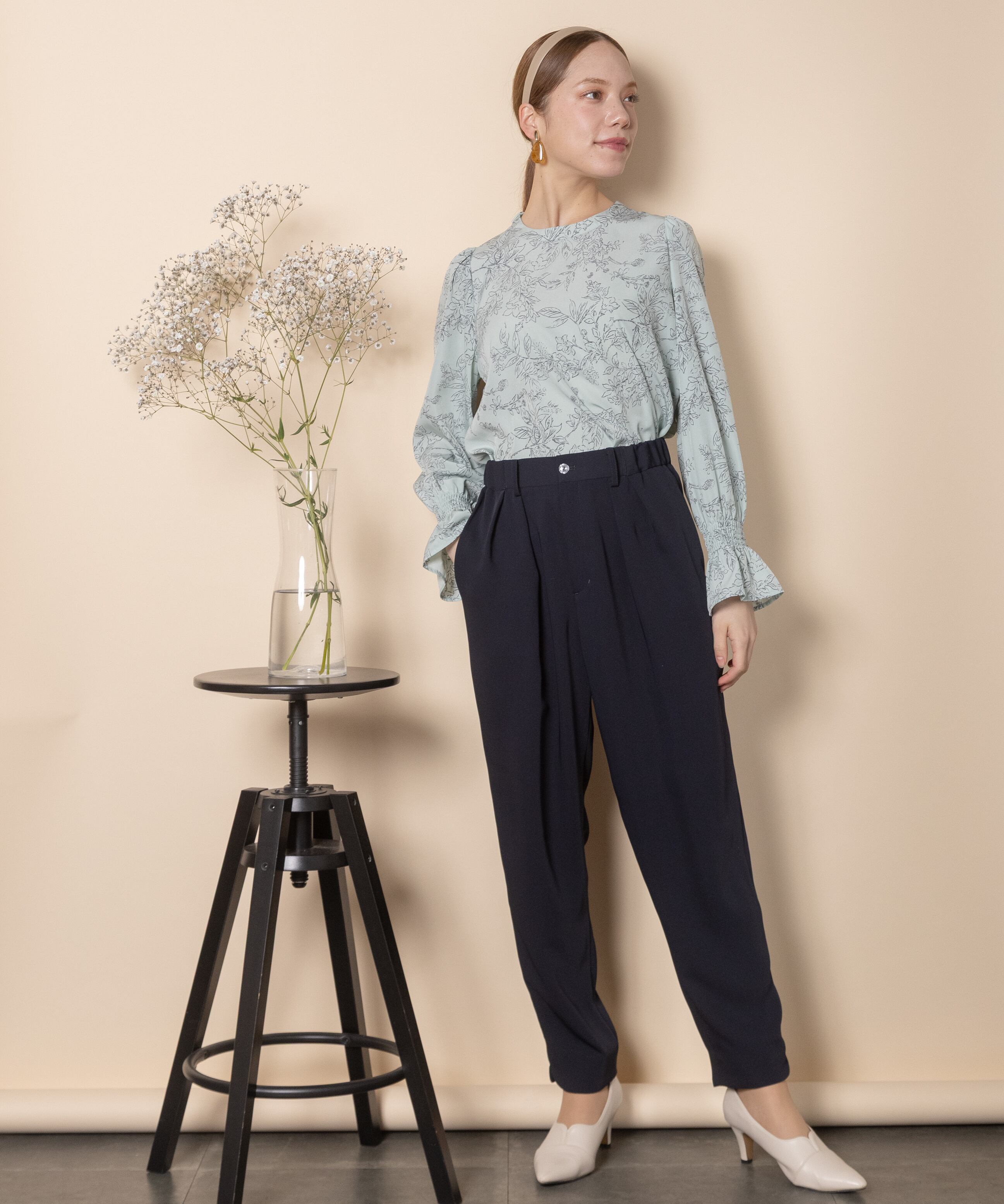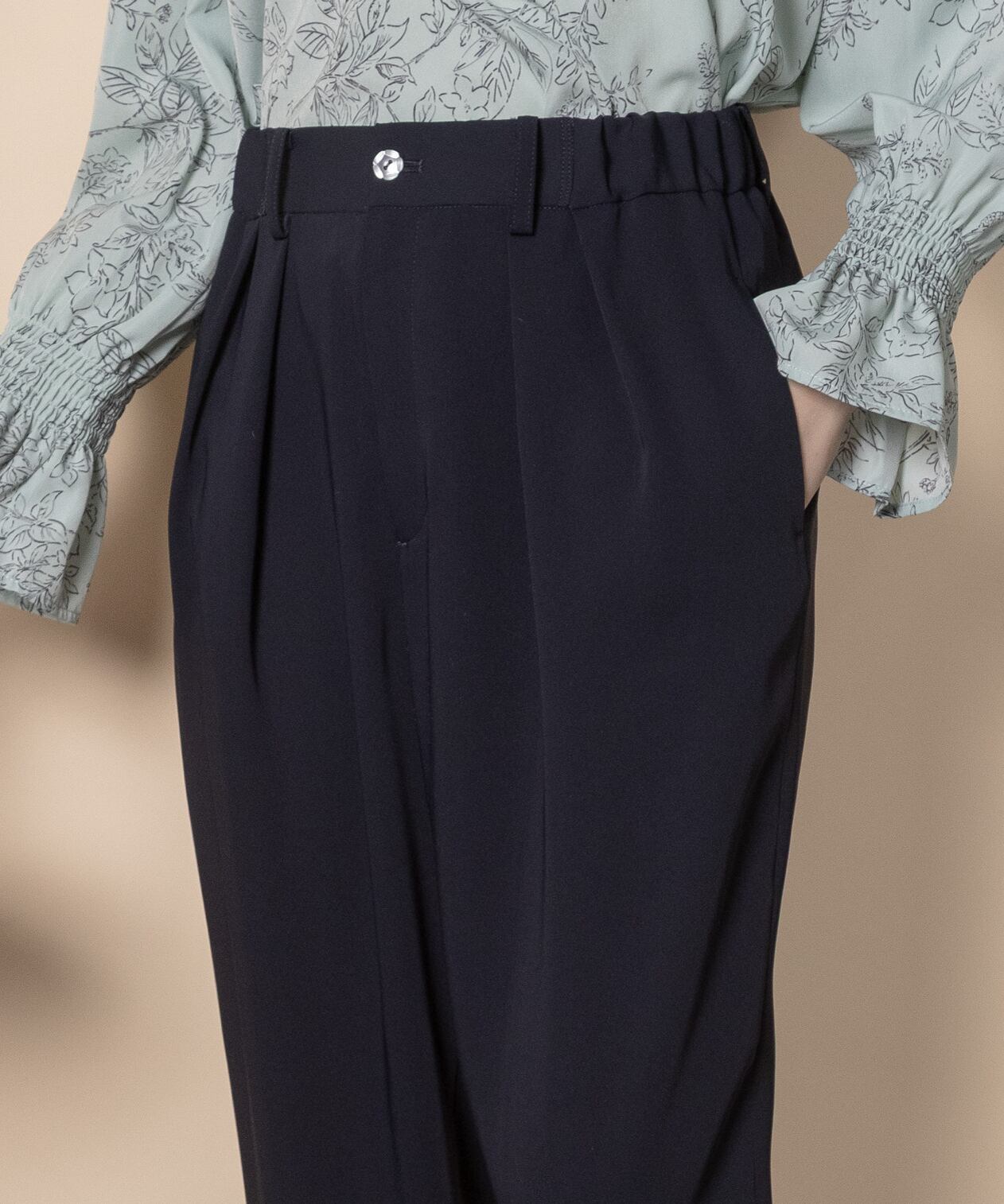 オフィスシーンやセレモニーシーンなどきちんとしたシーンで大活躍するパンツ。キレイめブラウスとの相性抜群です。