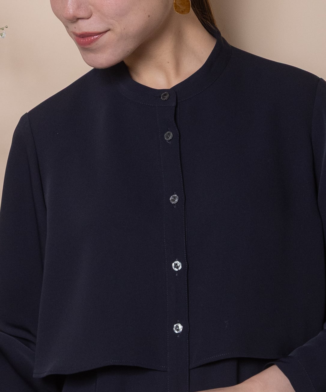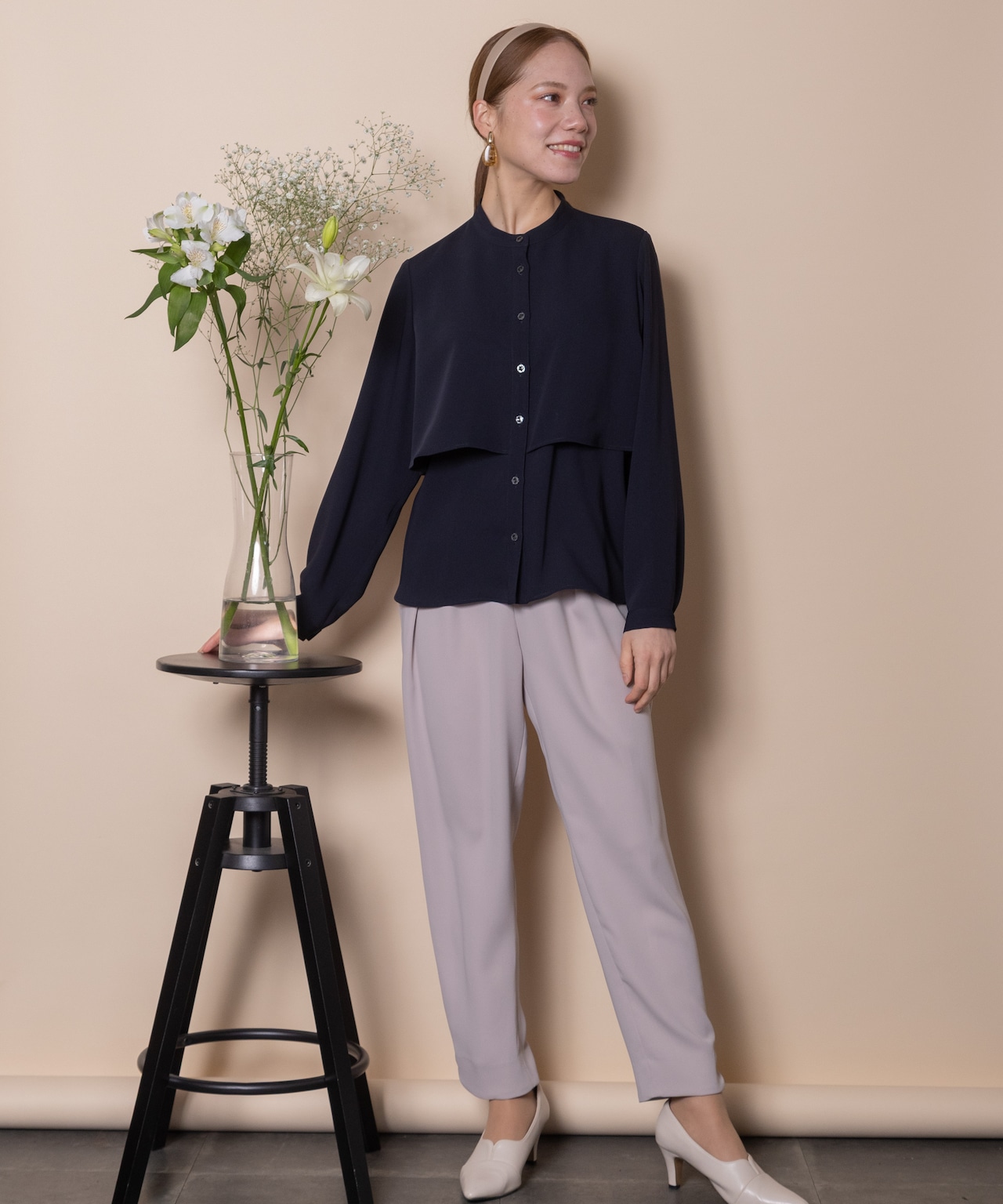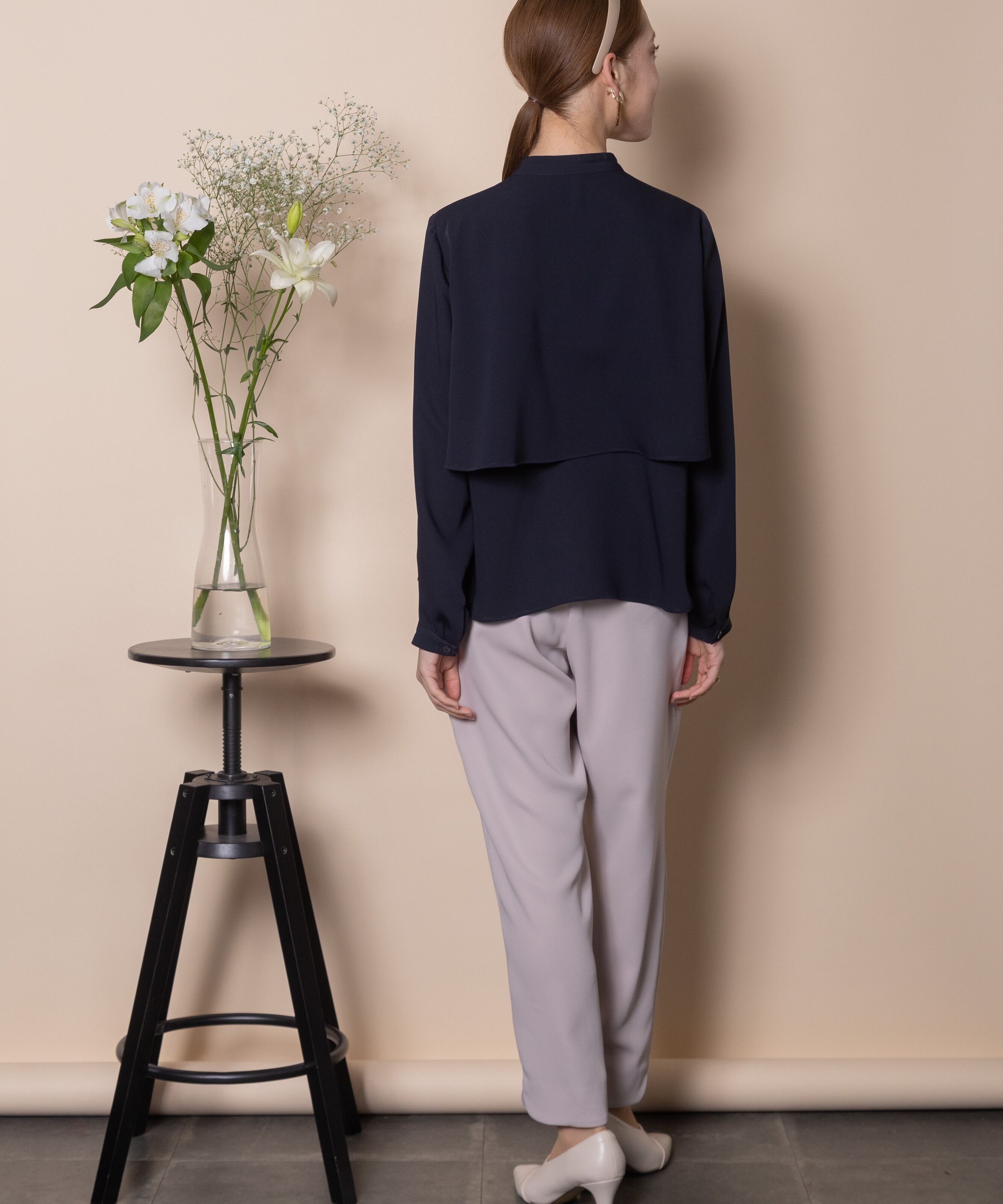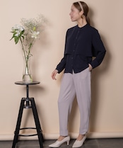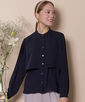 身頃に重ねたレイヤードデザインがポイント。パンツと合わせて身頃をインにするとコンパクトなフレアーブラウスに変身する2WAYブラウス。視線を引き上げる効果のあるスタイルアップのデザイン。マニッシュにクールに決まります。