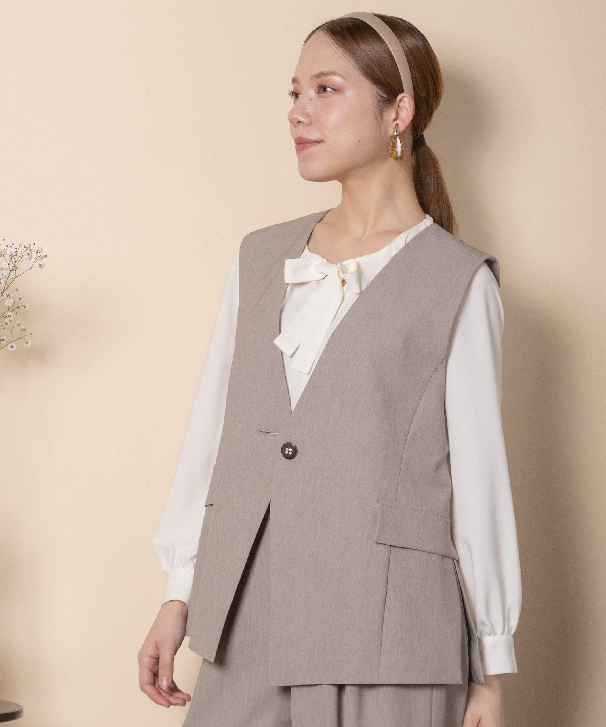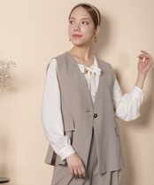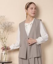 深めのVネックに1ボタンのシンプルかつスマートに仕上げたジレベスト。ウエスト位置には脚長効果の飾りフラップポケット。両脇には深めのスリット。視線を引き上げる効果のあるスタイルアップのデザイン。マニッシュにクールに決まります。