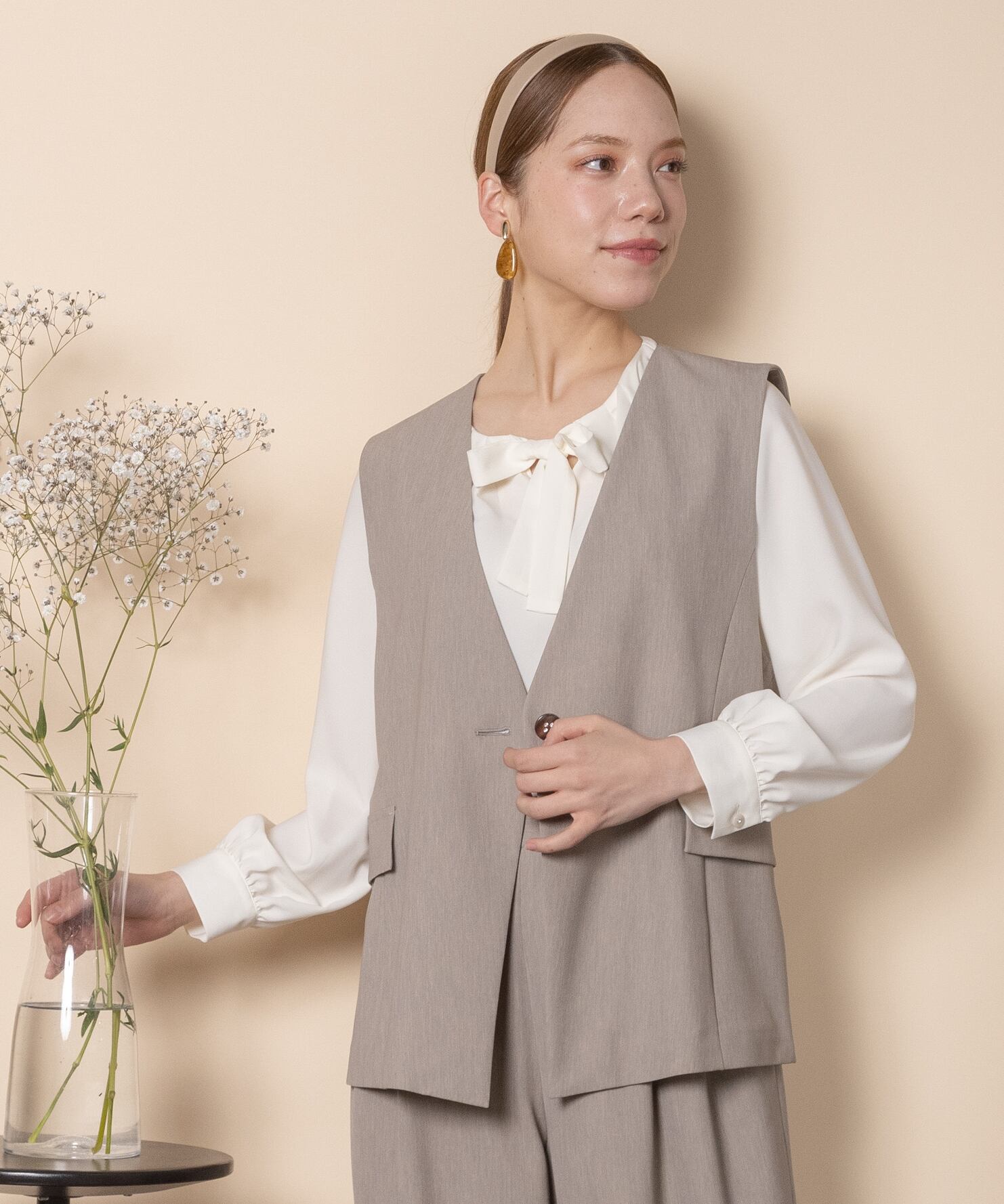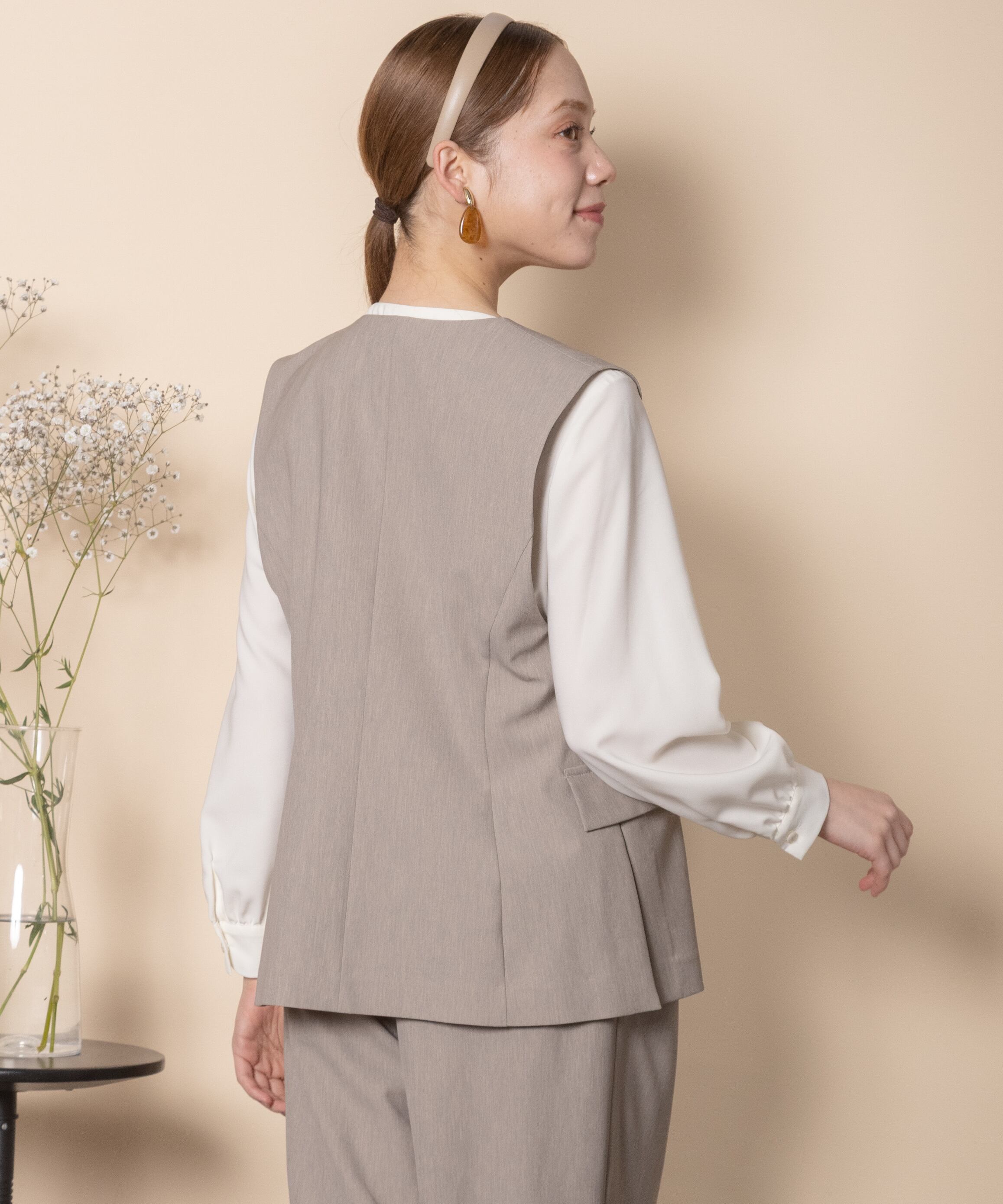 セレモニーシーンやオフィスシーンなどきちんとしたシーンで大活躍するセットアイテム。インには綺麗めのブラウスがおすすめ。