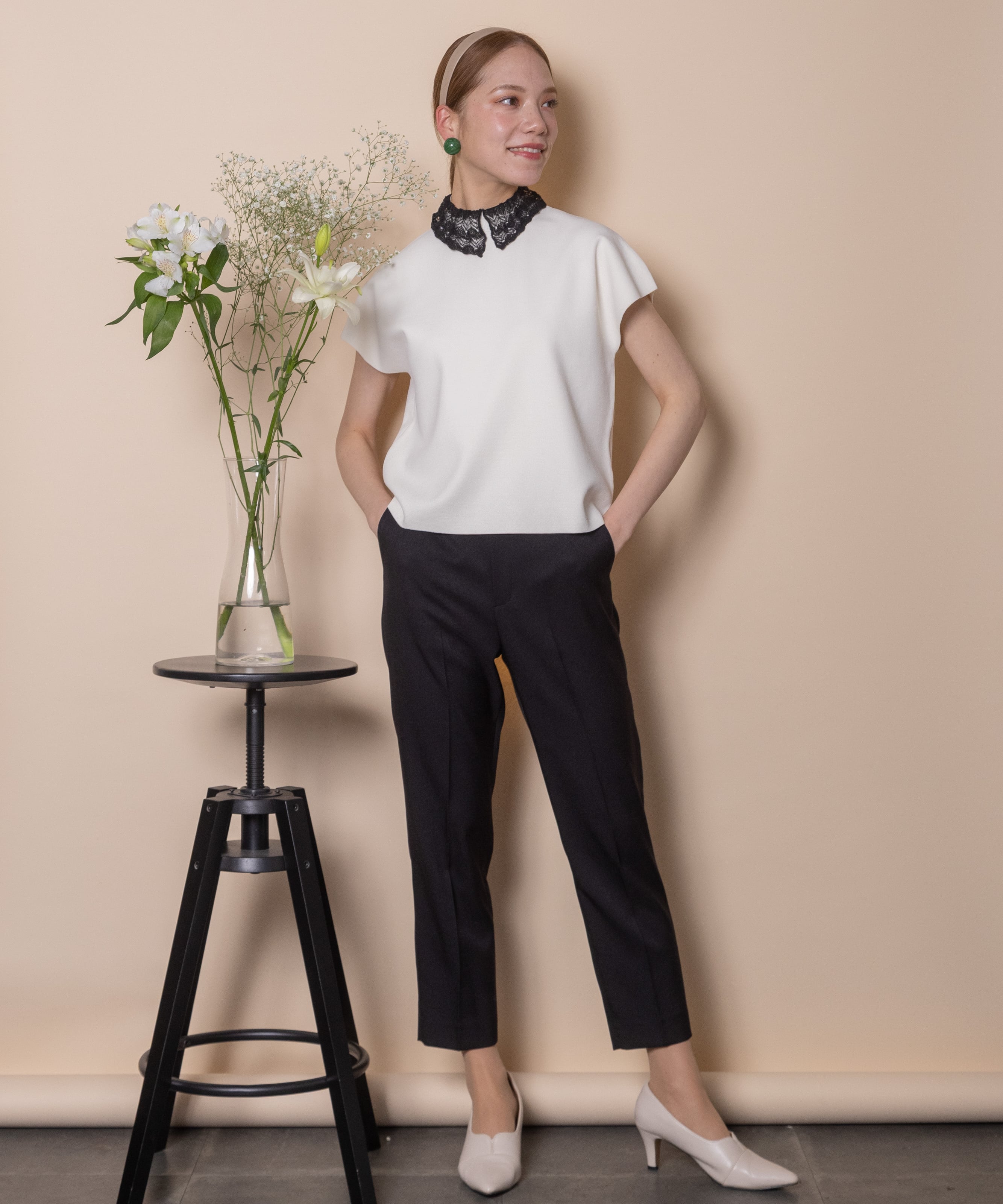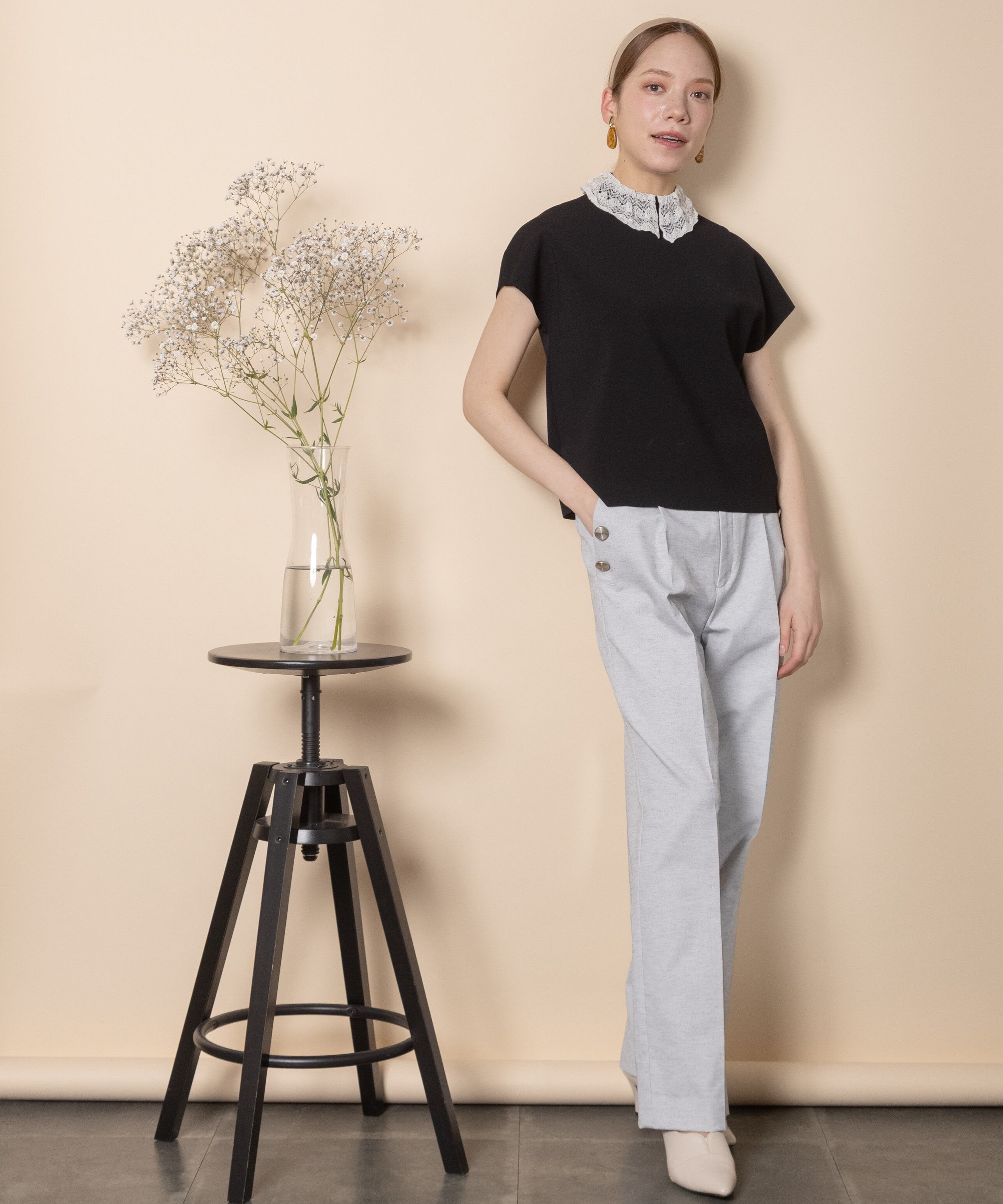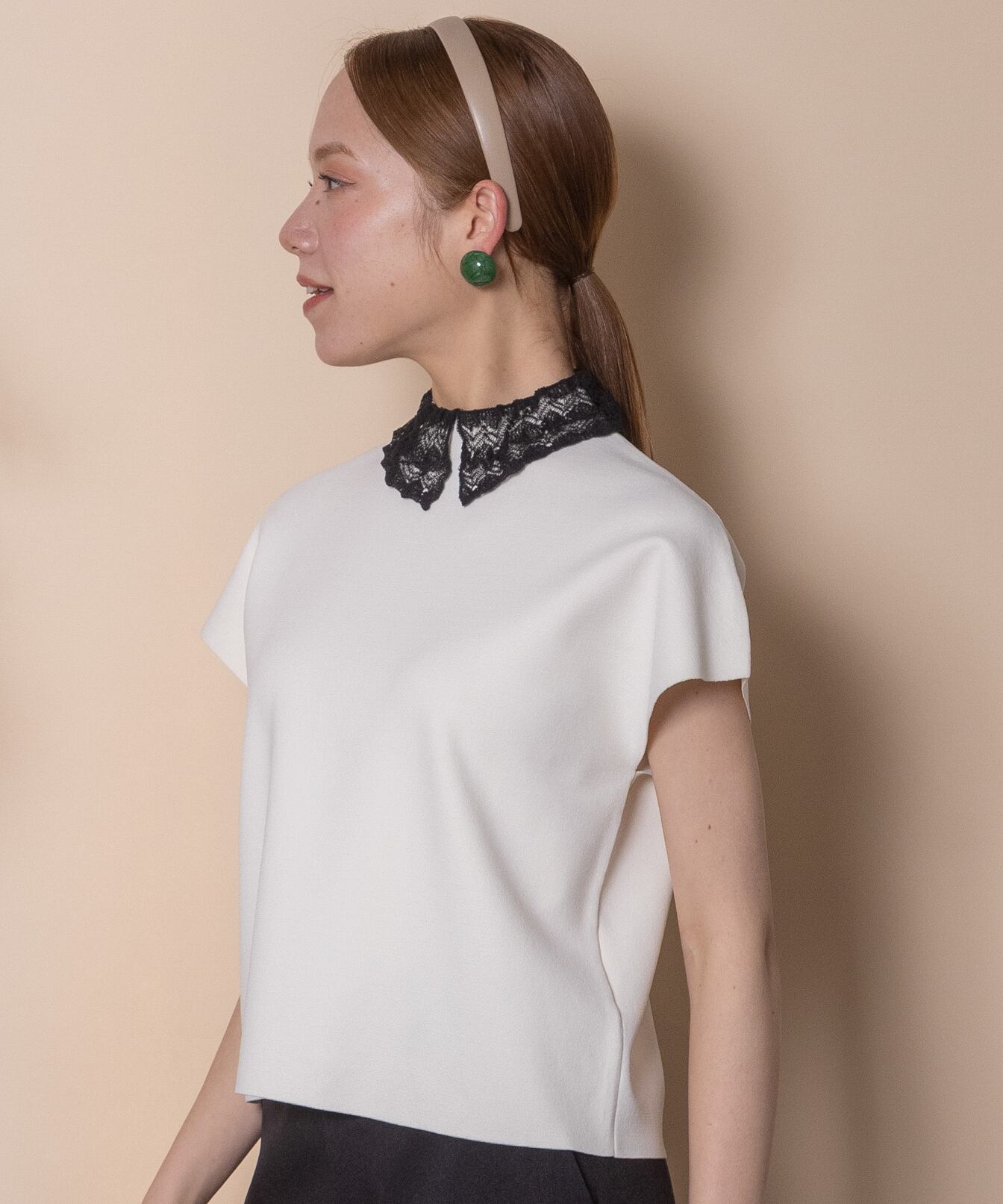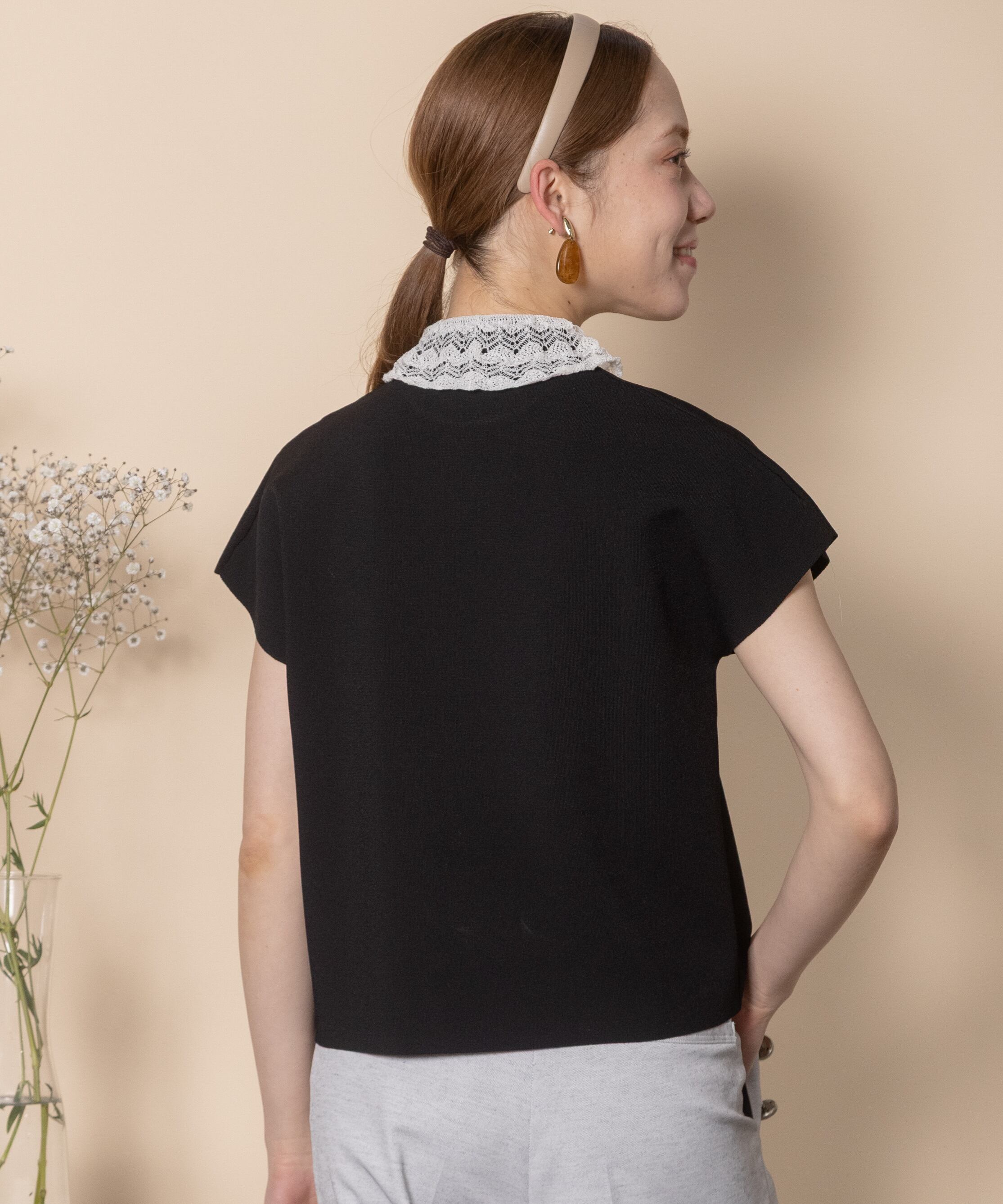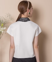 少しドレスアップした特別な日に着たい繊細なレースをあしらった襟デザインがオシャレなクラシカルなニット。フレンチ袖にボックスシルエットとパリジェンヌの雰囲気漂うおすすめオシャレアイテム。