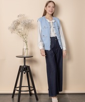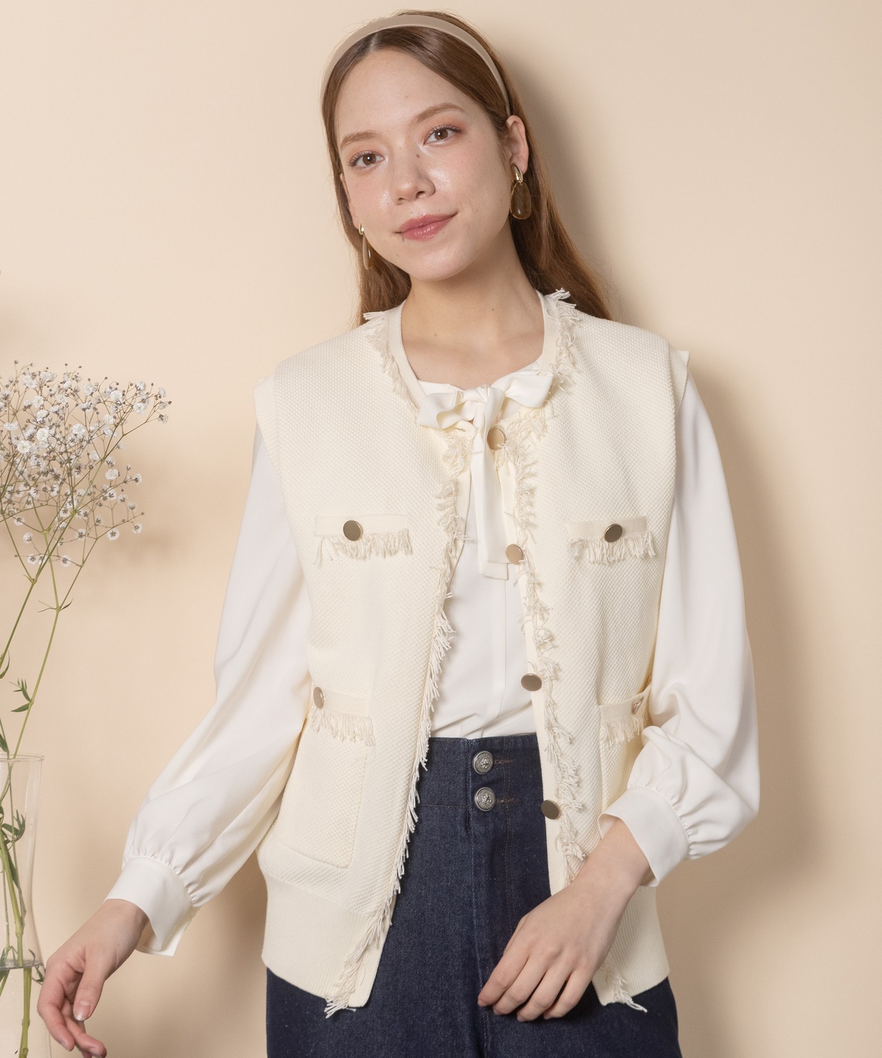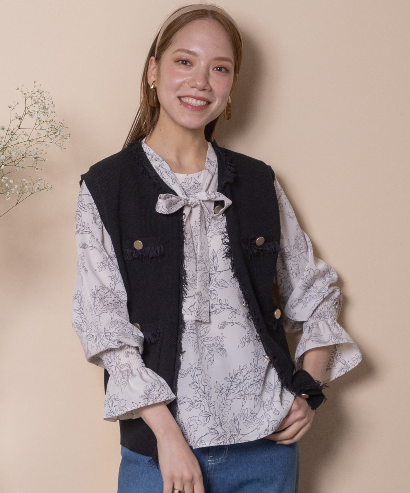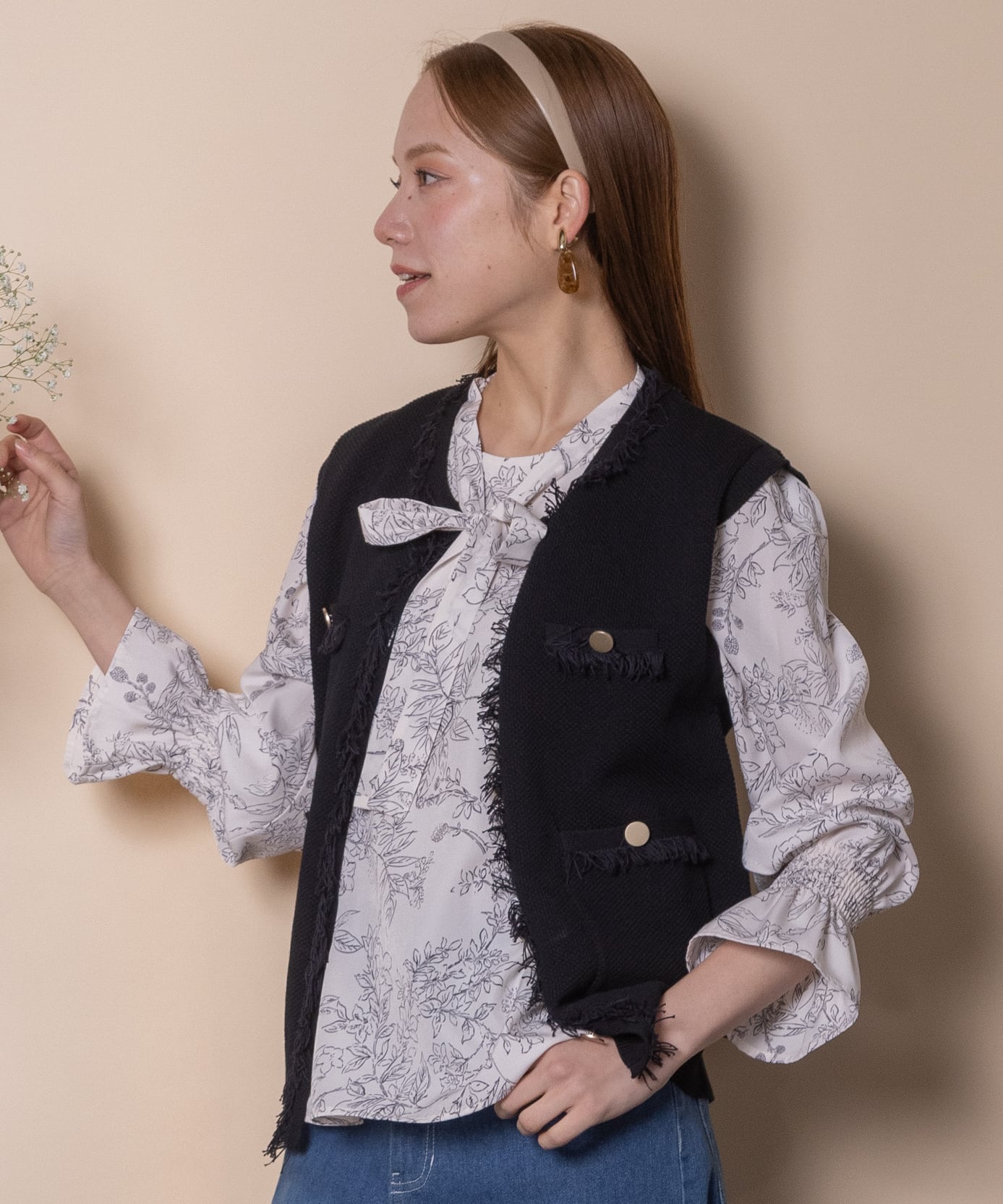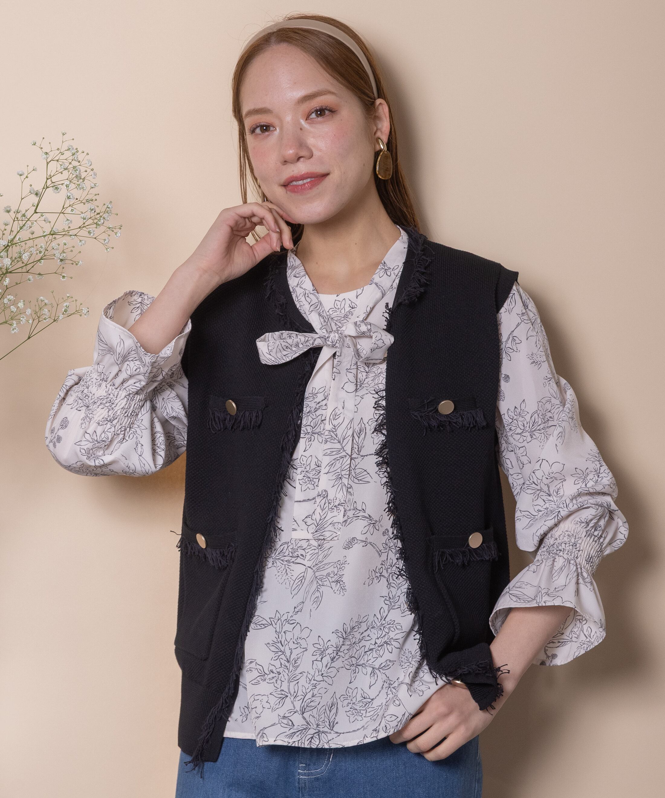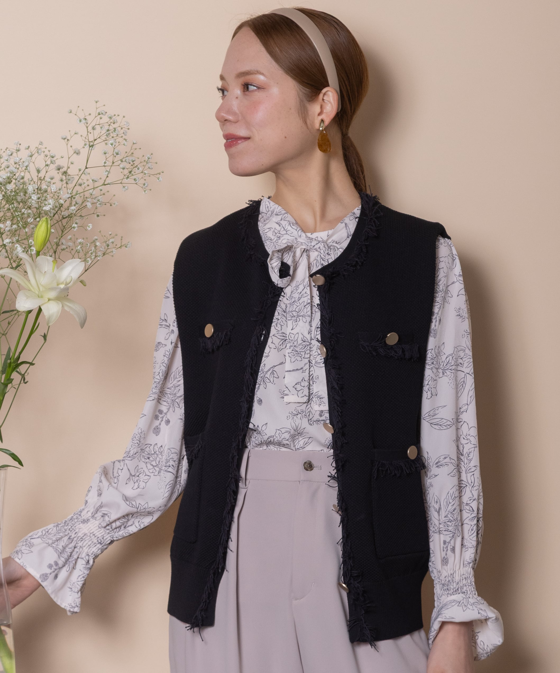 ツイード風のニットを採用したクラシカルなニットベスト。襟、前縦、ポケットはフリンジ仕様、アウトポケットにアンティーク風金ボタンとこだわりのデザイン。