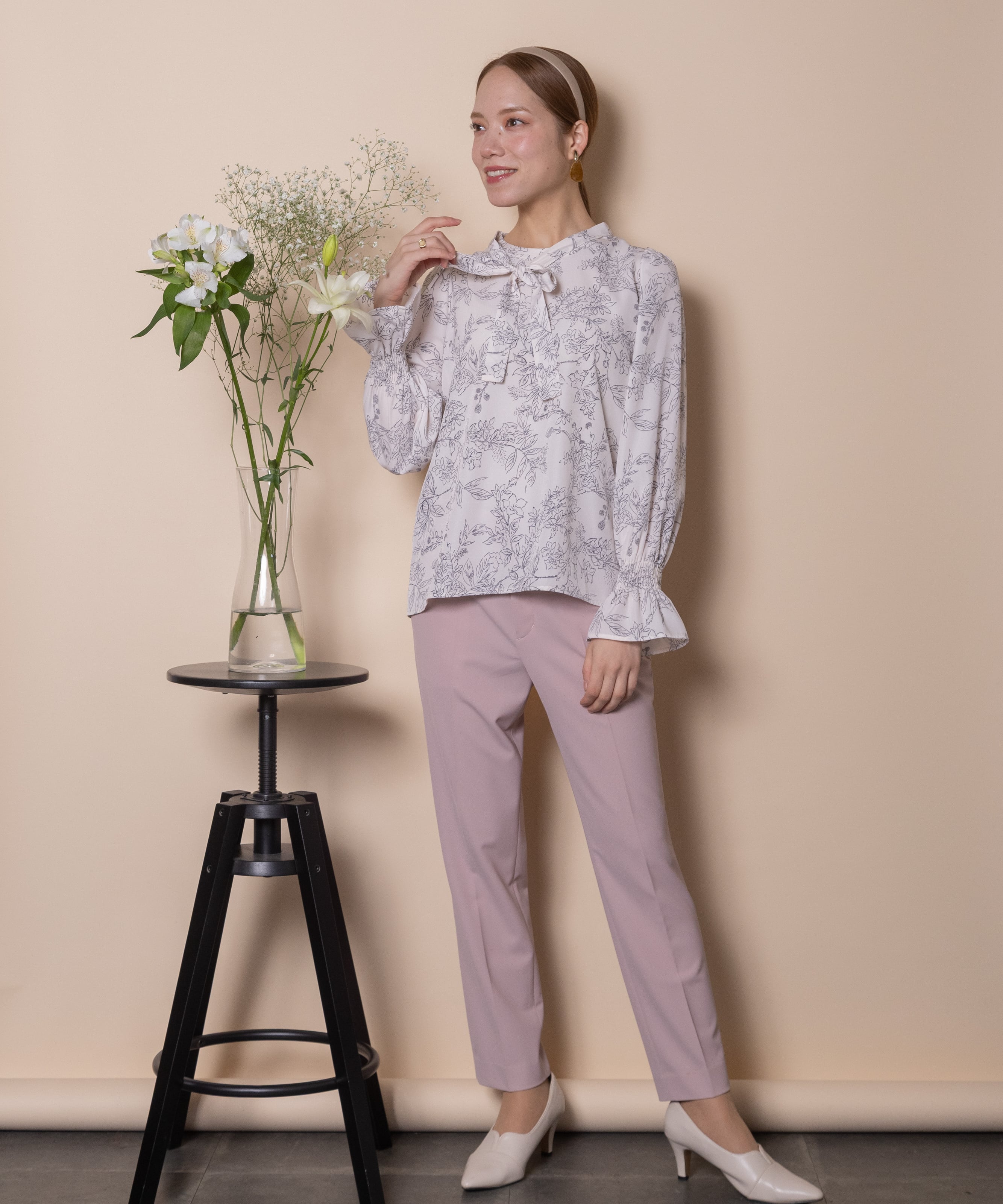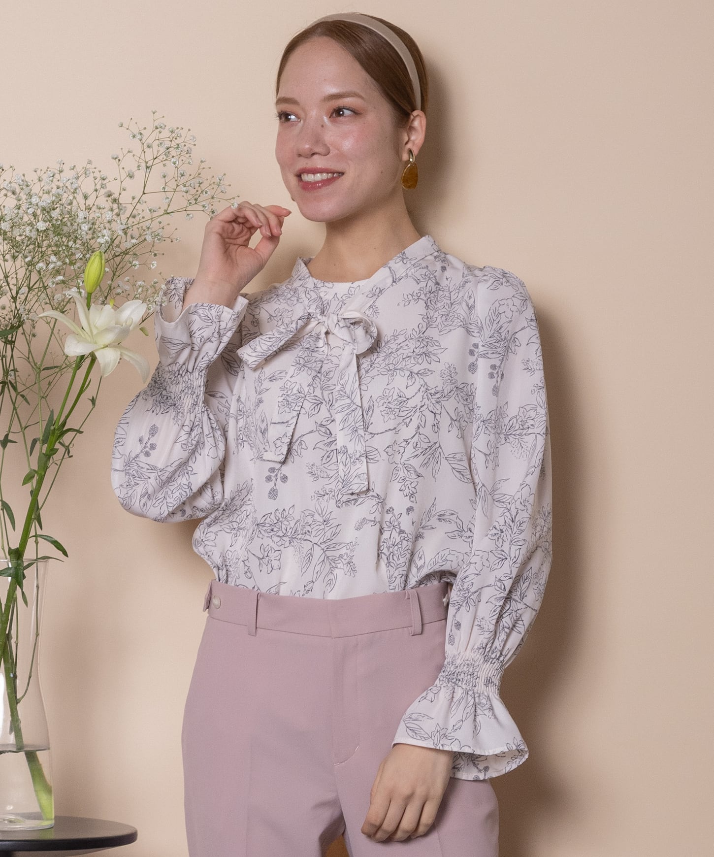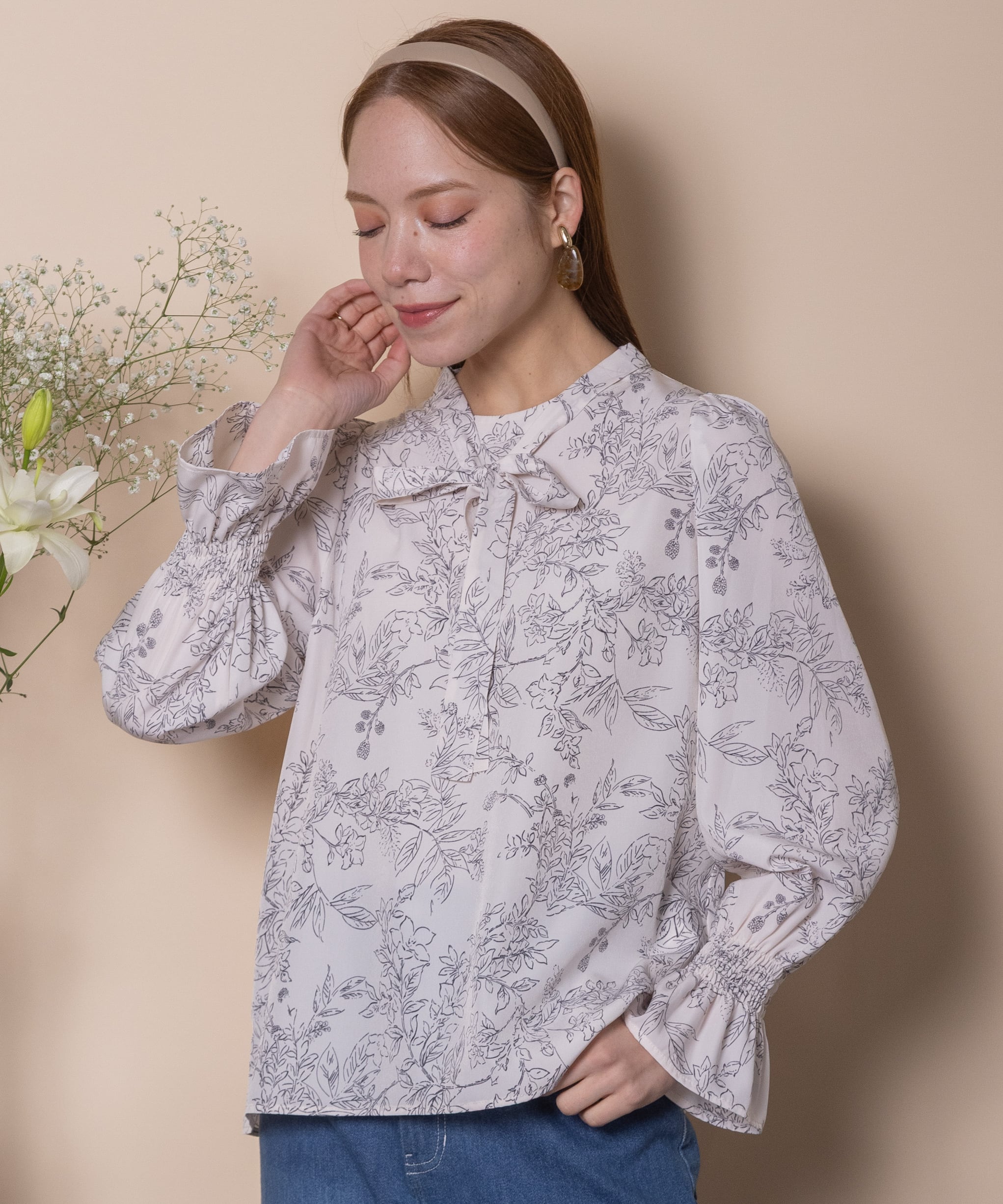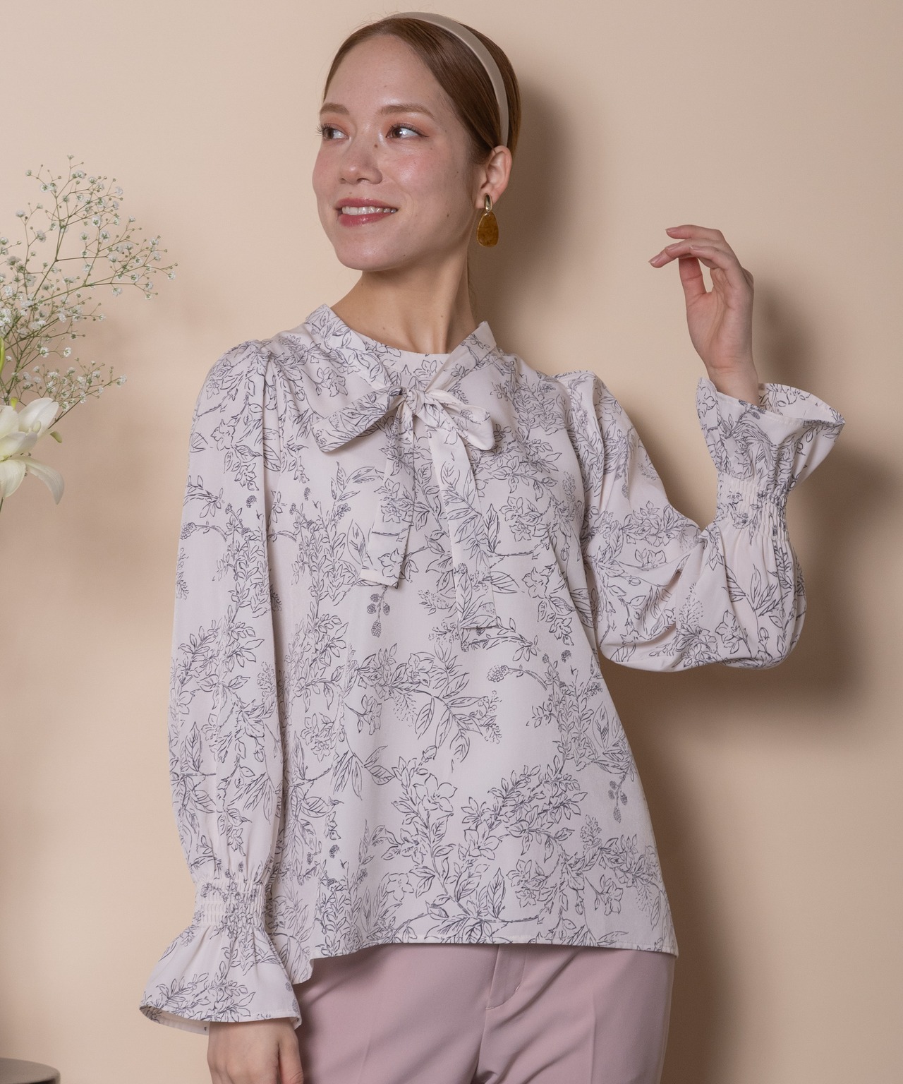 繊細な手書き風の線描きのフラワープリントのフェミニンなブラウス。ボウタイが首元を美しく見せ、ジャケットのインナーにも映える上品な仕上がり。肩はキュッとコンパクトに、袖口はたくし上げのできるゴムギャザーのフレアデザイン。