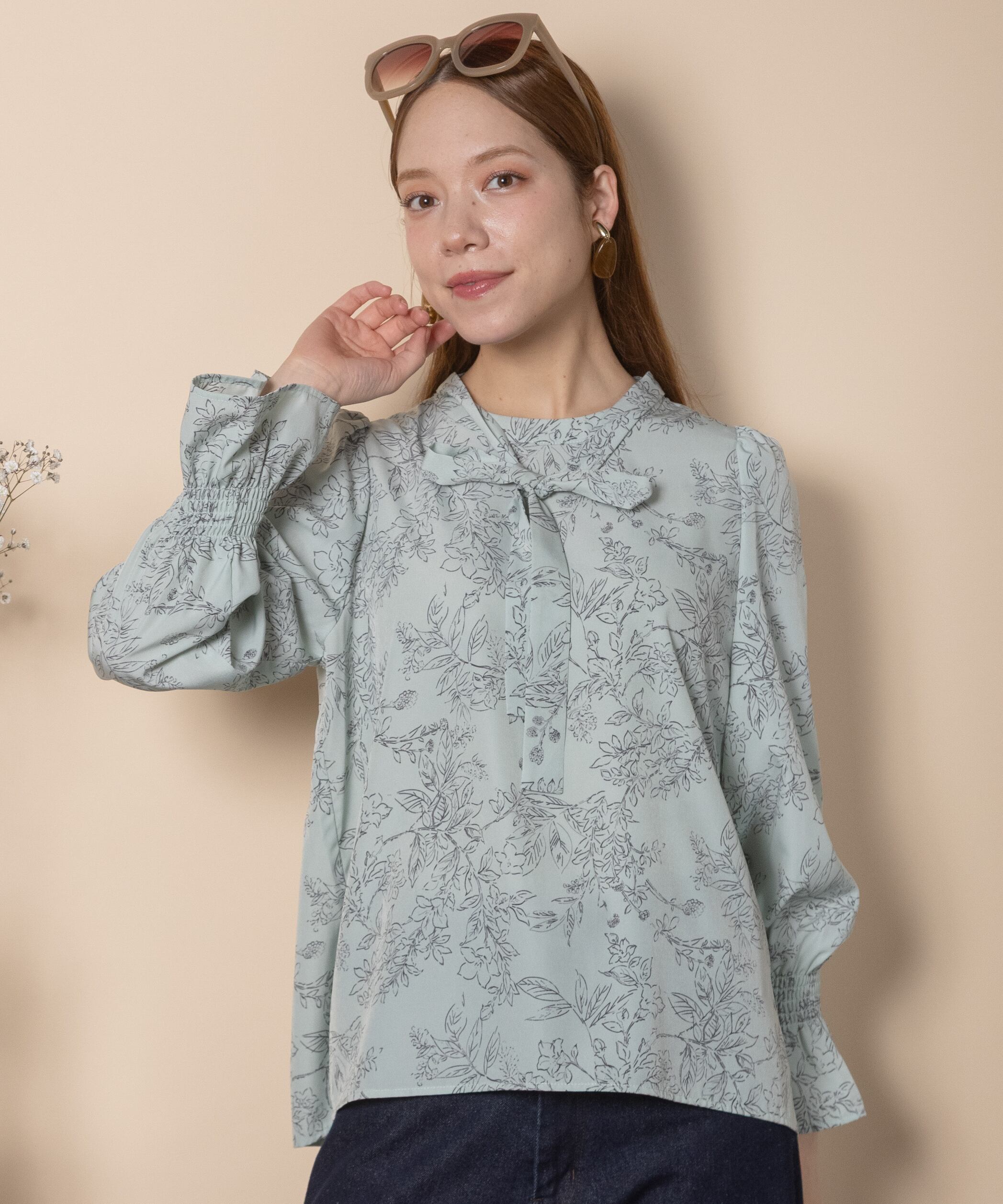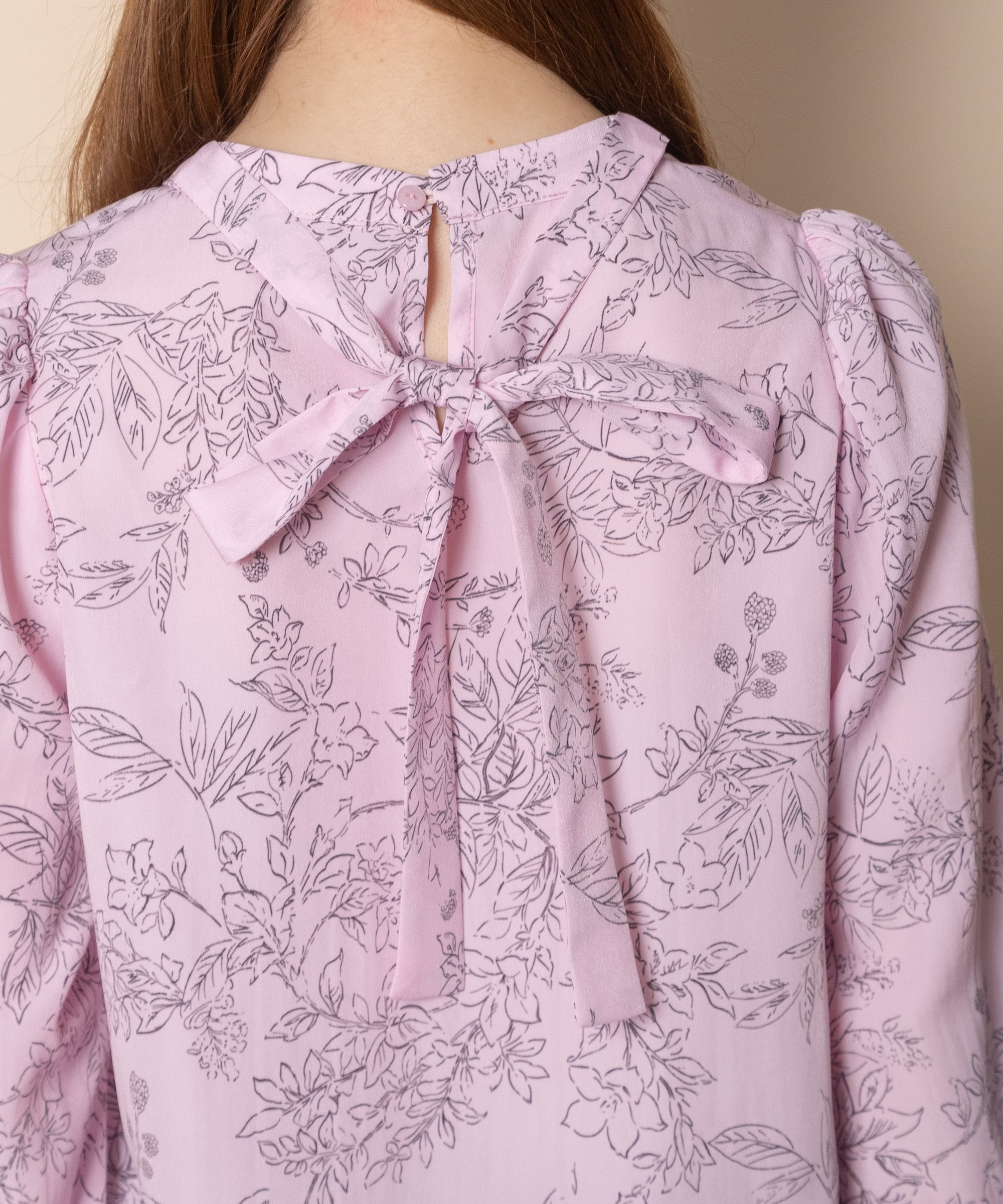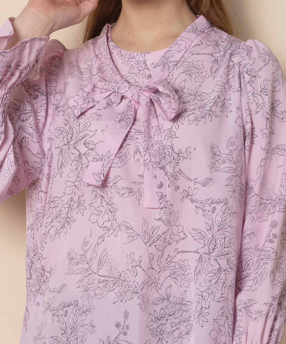 繊細な手書き風の線描きのフラワープリントのフェミニンなブラウス。ボウタイが首元を美しく見せ、ジャケットのインナーにも映える上品な仕上がり。肩はキュッとコンパクトに、袖口はたくし上げのできるゴムギャザーのフレアデザイン。