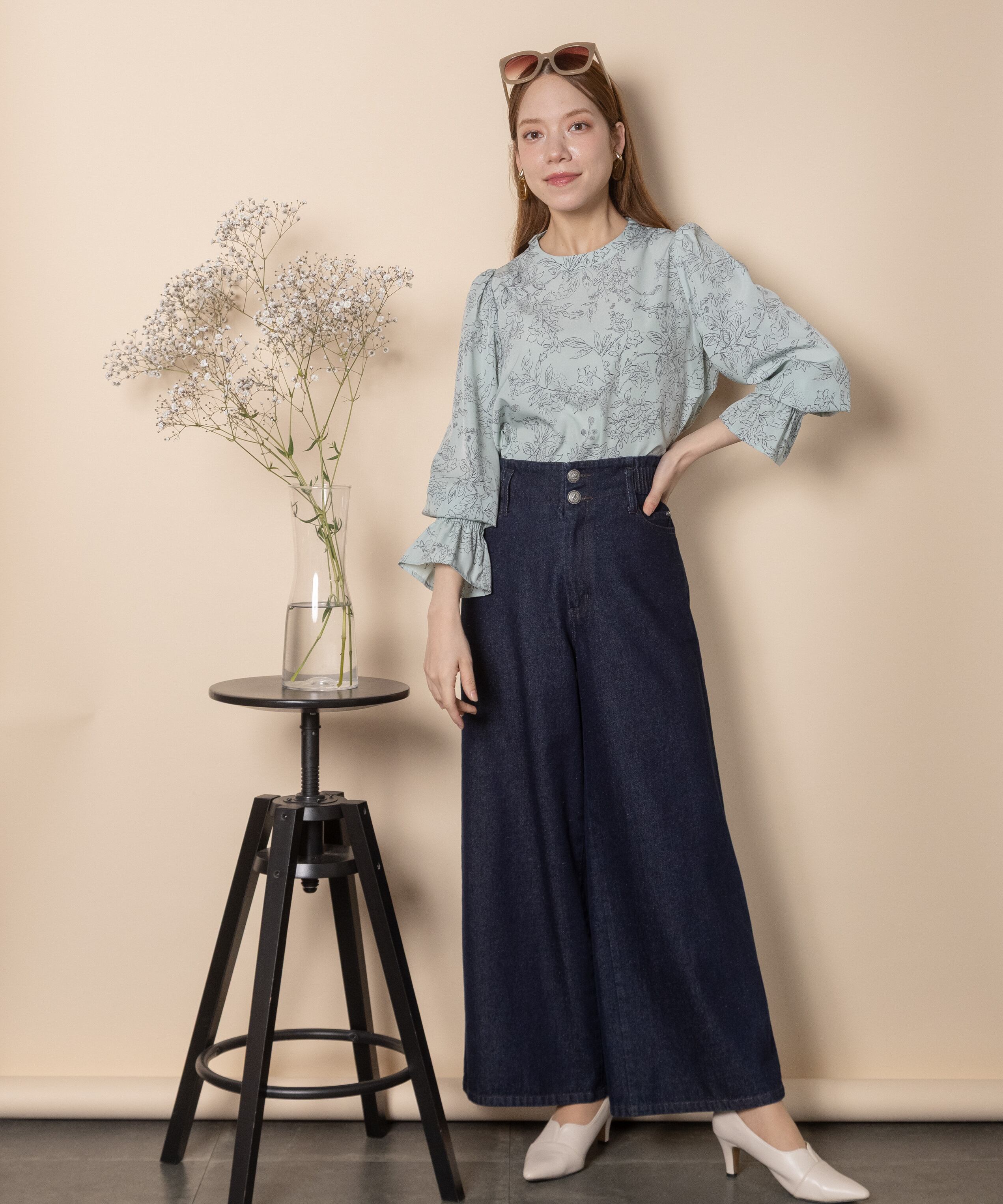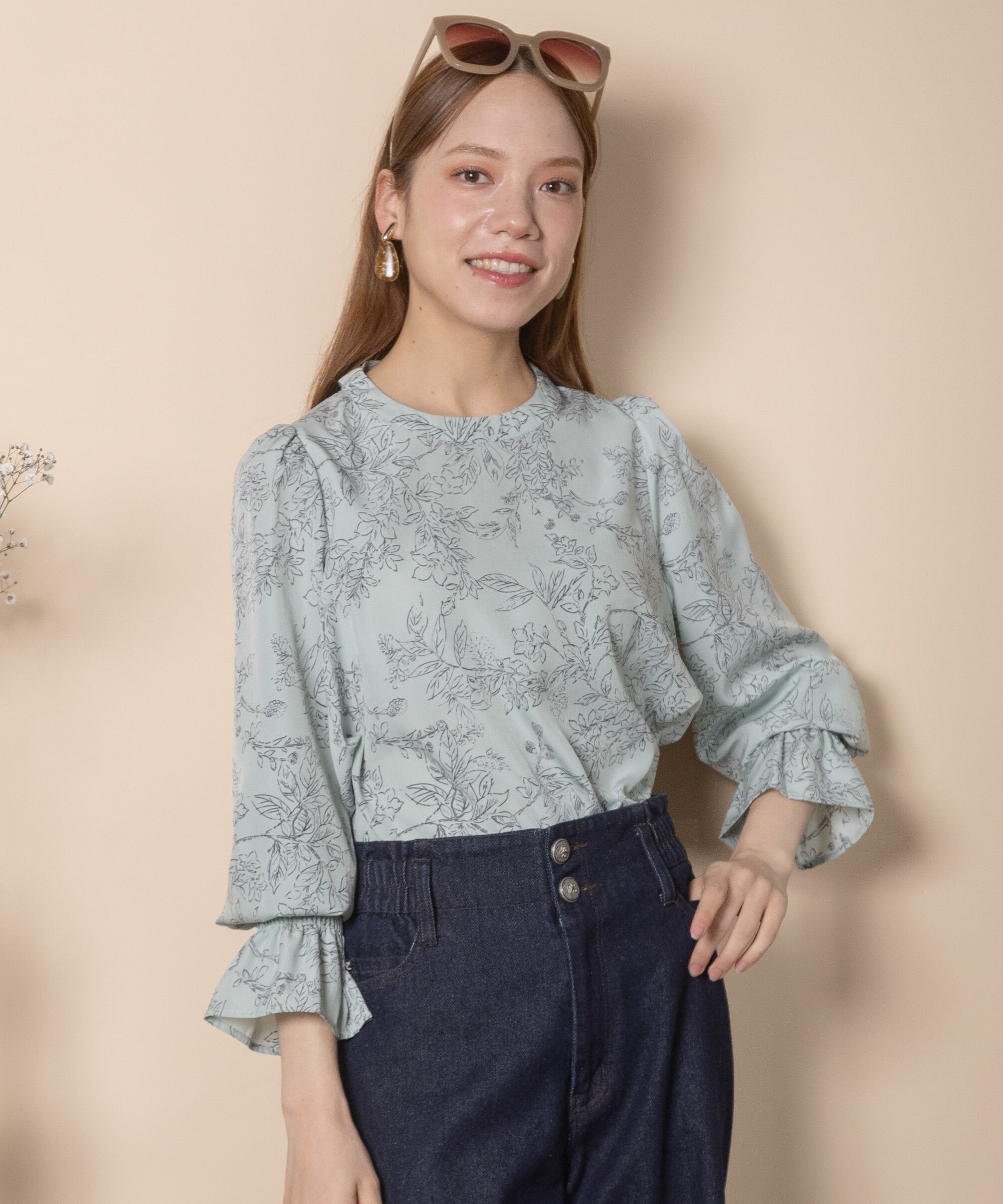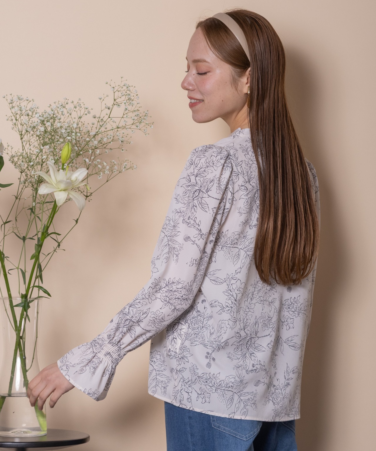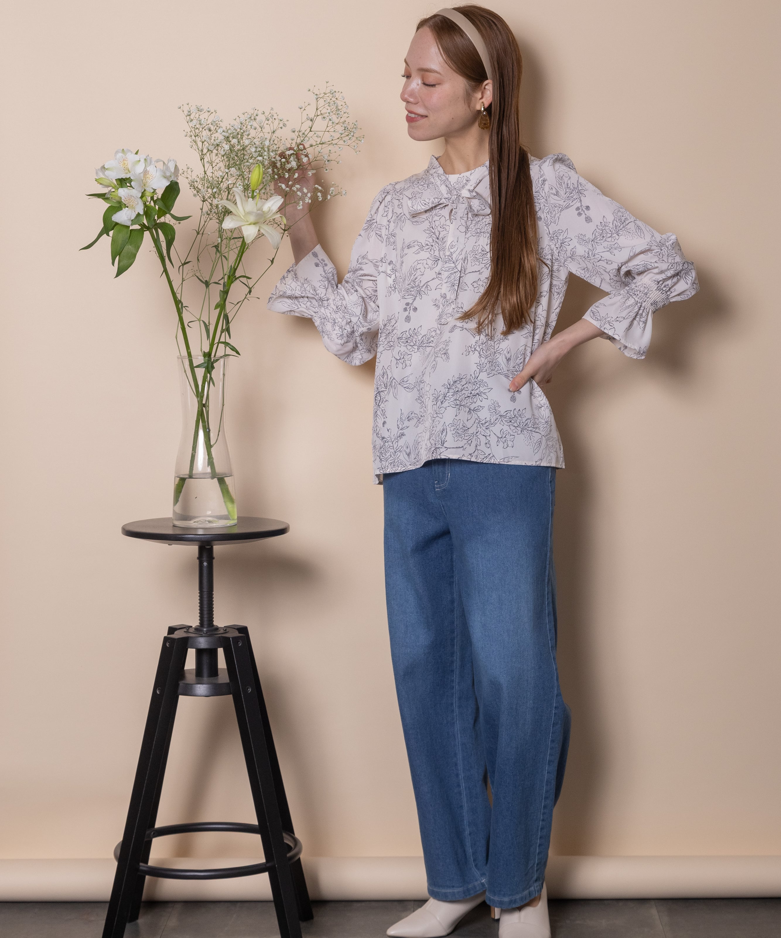 繊細な手書き風の線描きのフラワープリントのフェミニンなブラウス。ボウタイが首元を美しく見せ、ジャケットのインナーにも映える上品な仕上がり。肩はキュッとコンパクトに、袖口はたくし上げのできるゴムギャザーのフレアデザイン。