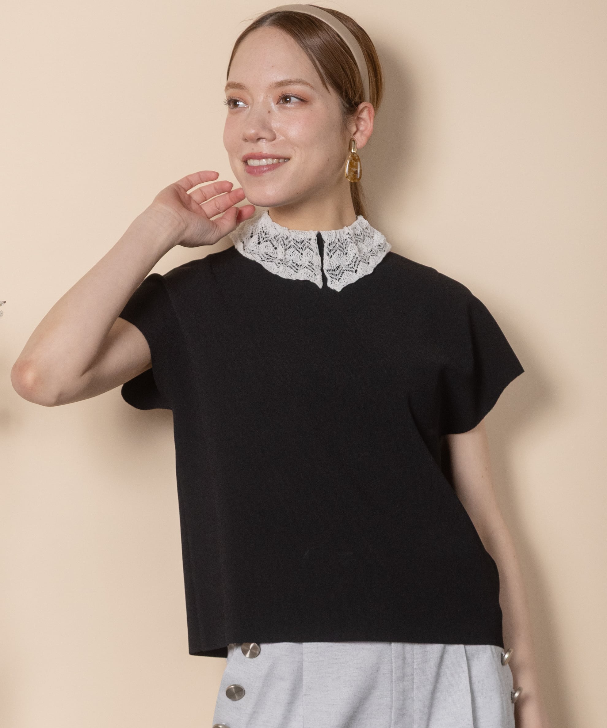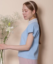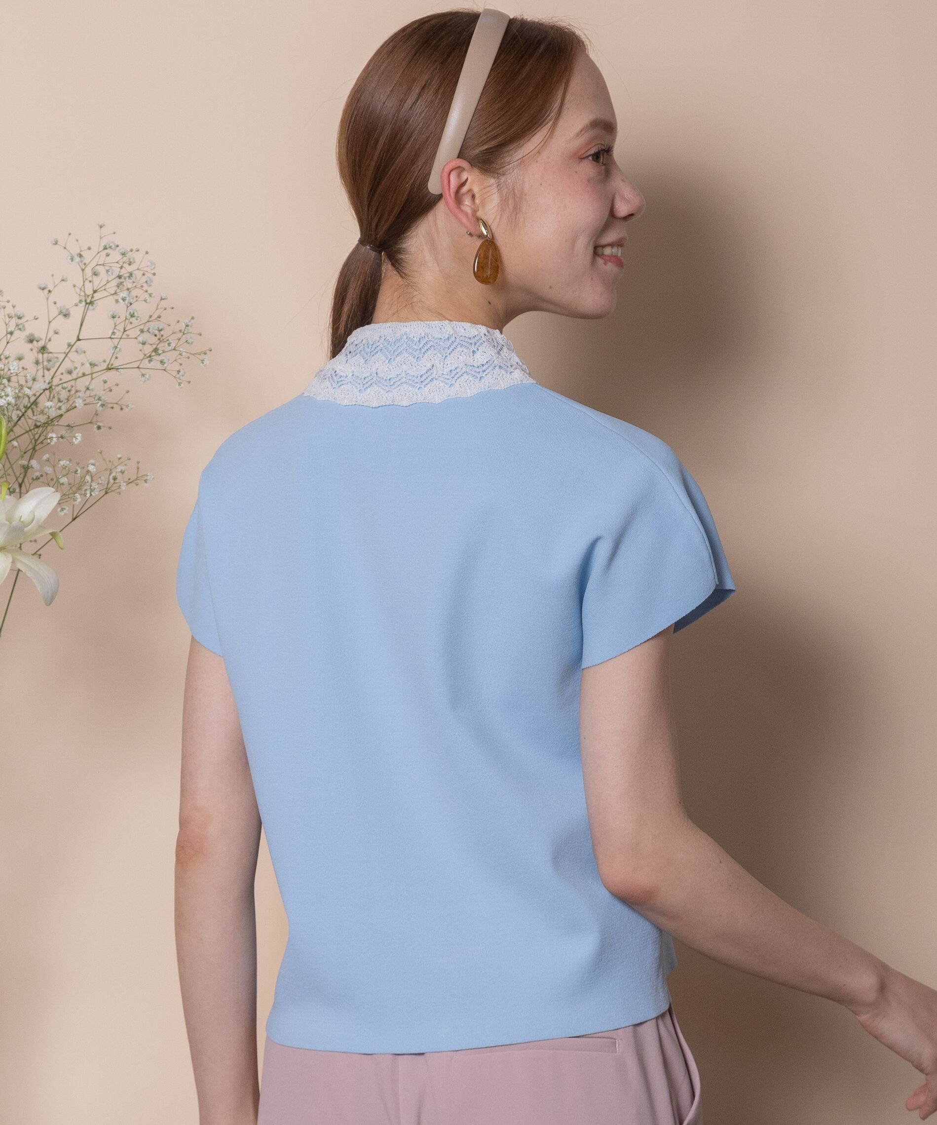 少しドレスアップした特別な日に着たい繊細なレースをあしらった襟デザインがオシャレなクラシカルなニット。フレンチ袖にボックスシルエットとパリジェンヌの雰囲気漂うおすすめオシャレアイテム。