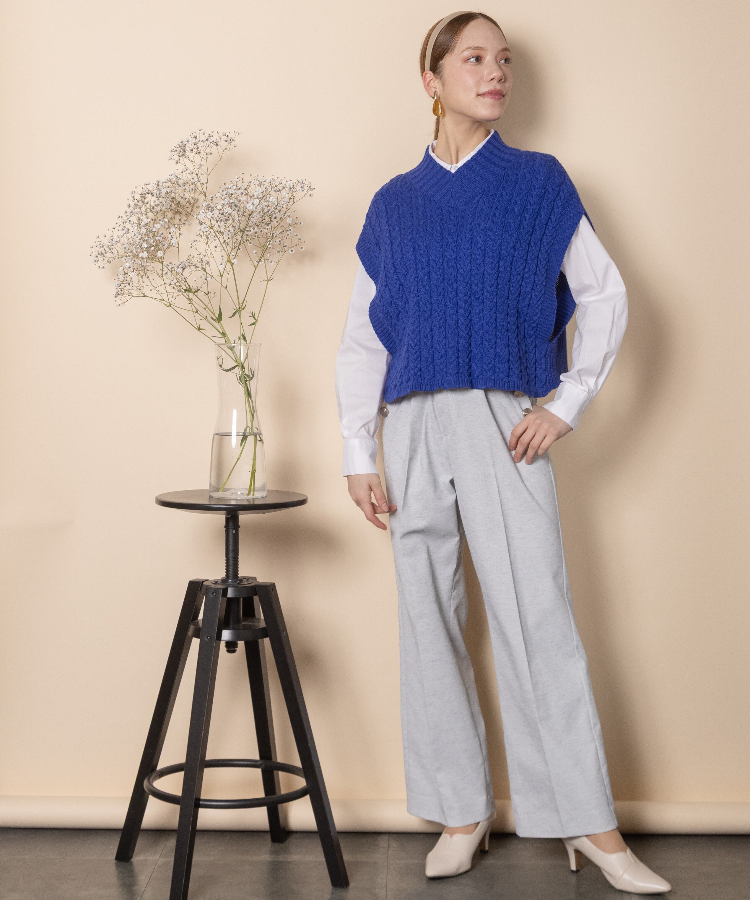 プラスワンアイテムで人気のニットベスト。今シーズンはトレンドのケーブル編みベスト。オーバーサイズのボックスシルエットにバックスリットのリラックスデザイン。インにはTシャツやシャツがおすすめ。