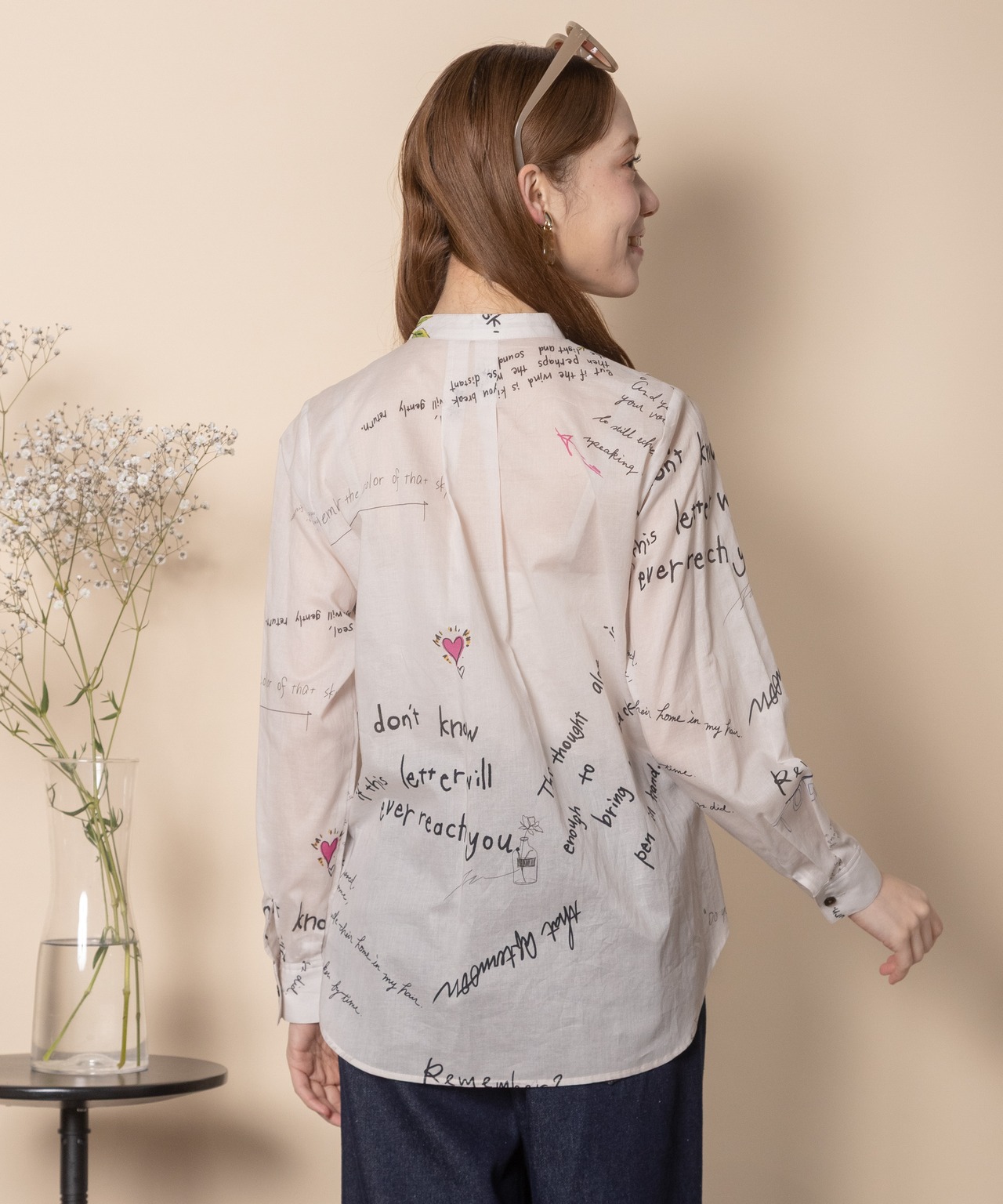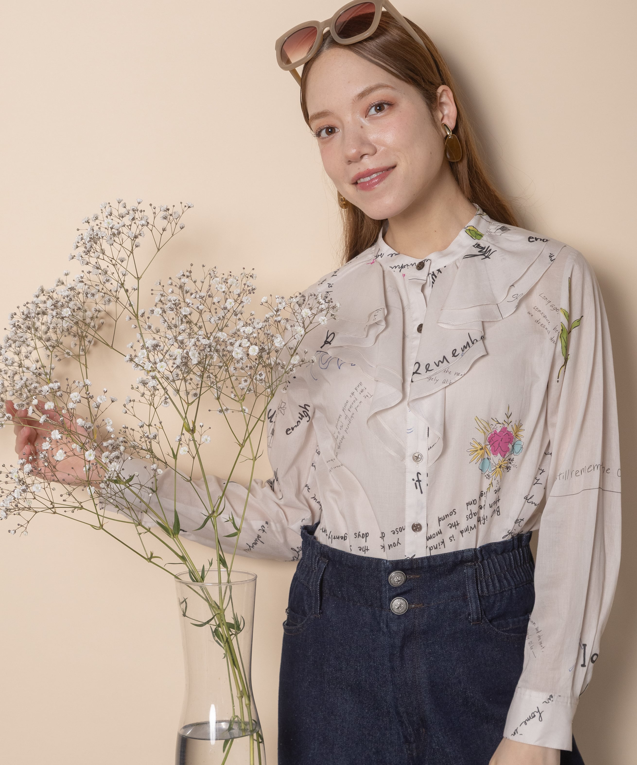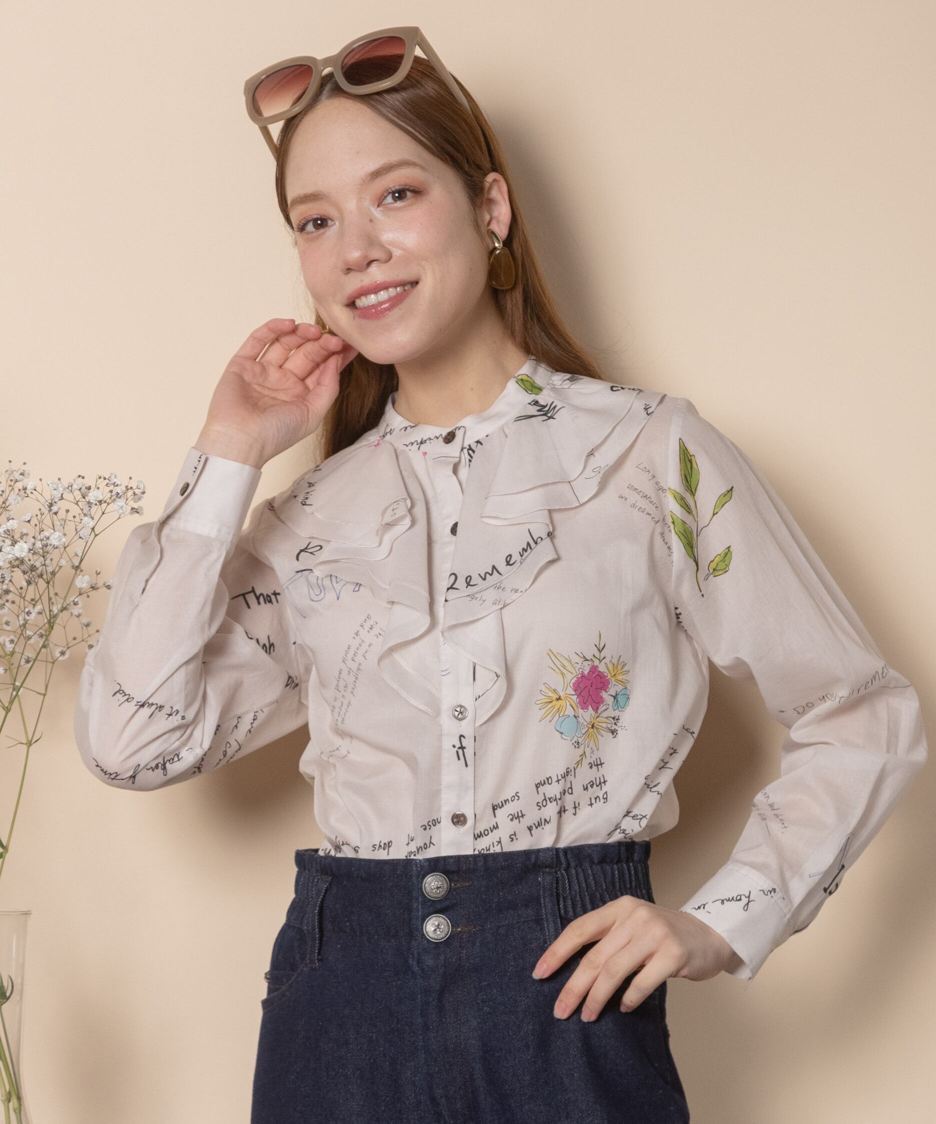 手書き風プリントのインポート生地を使用したデザインシャツ。甘さが魅力のラッフルフリルに肩がキュッと入ったコンパクトショルダーがオシャレなアイテム。