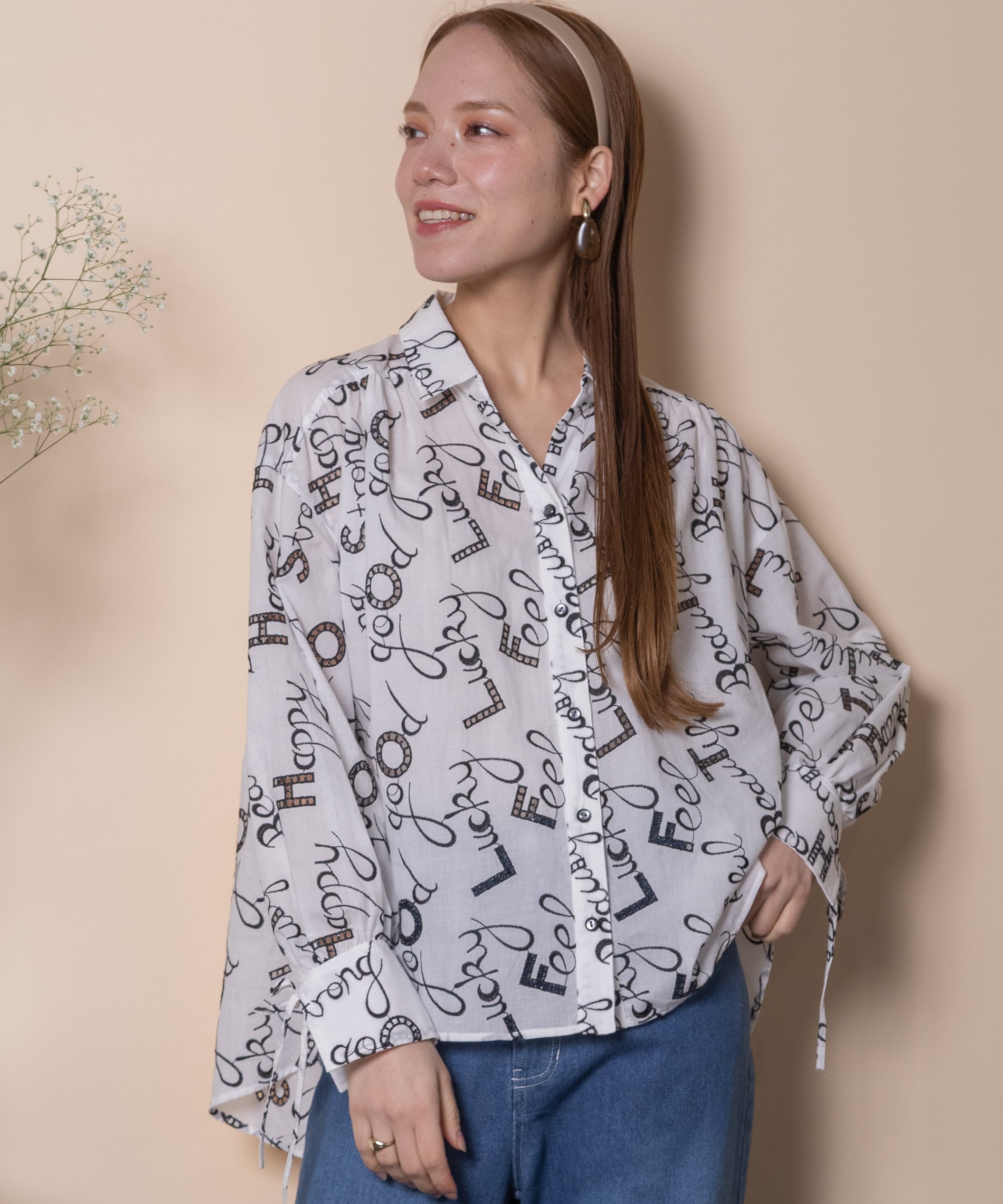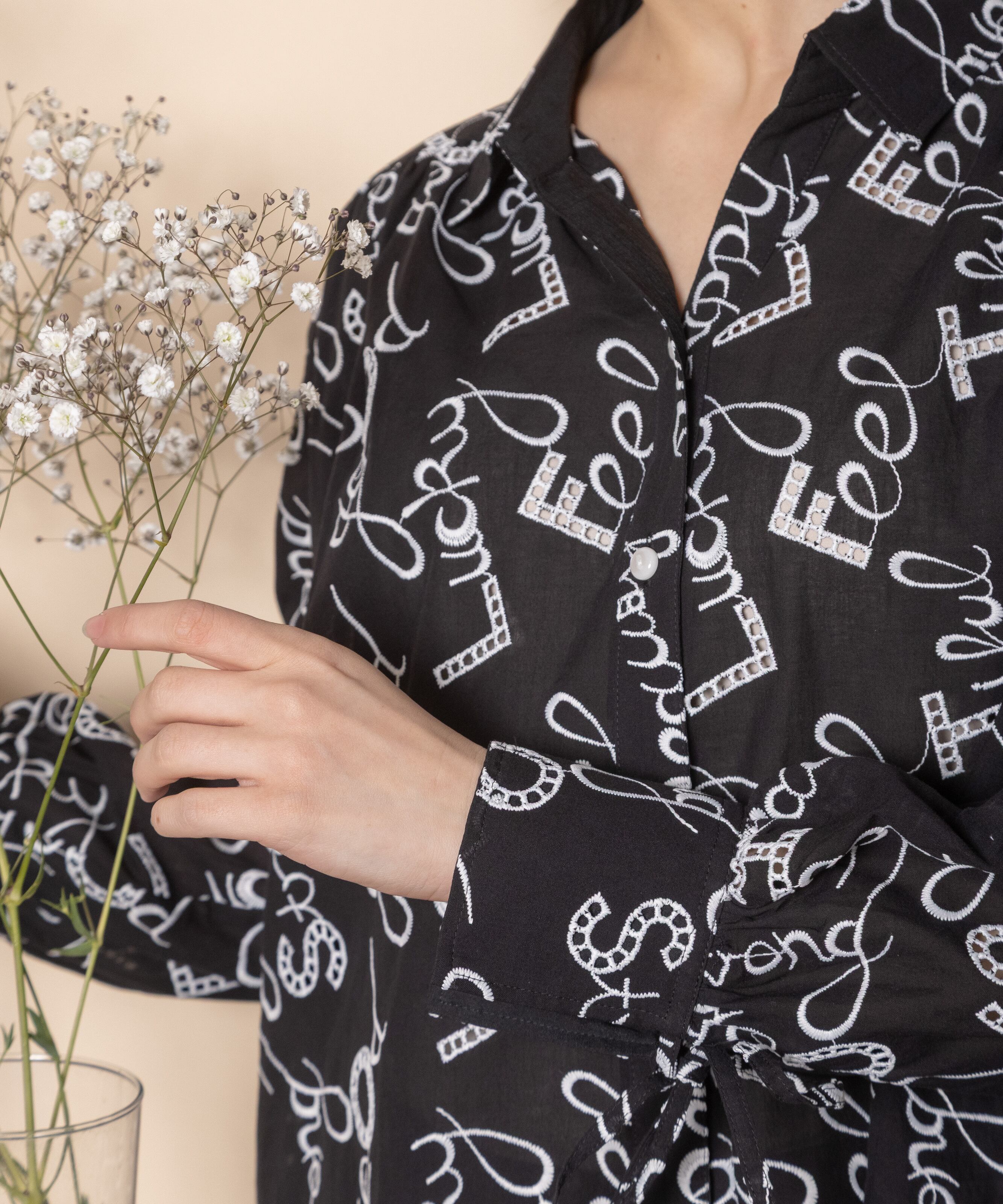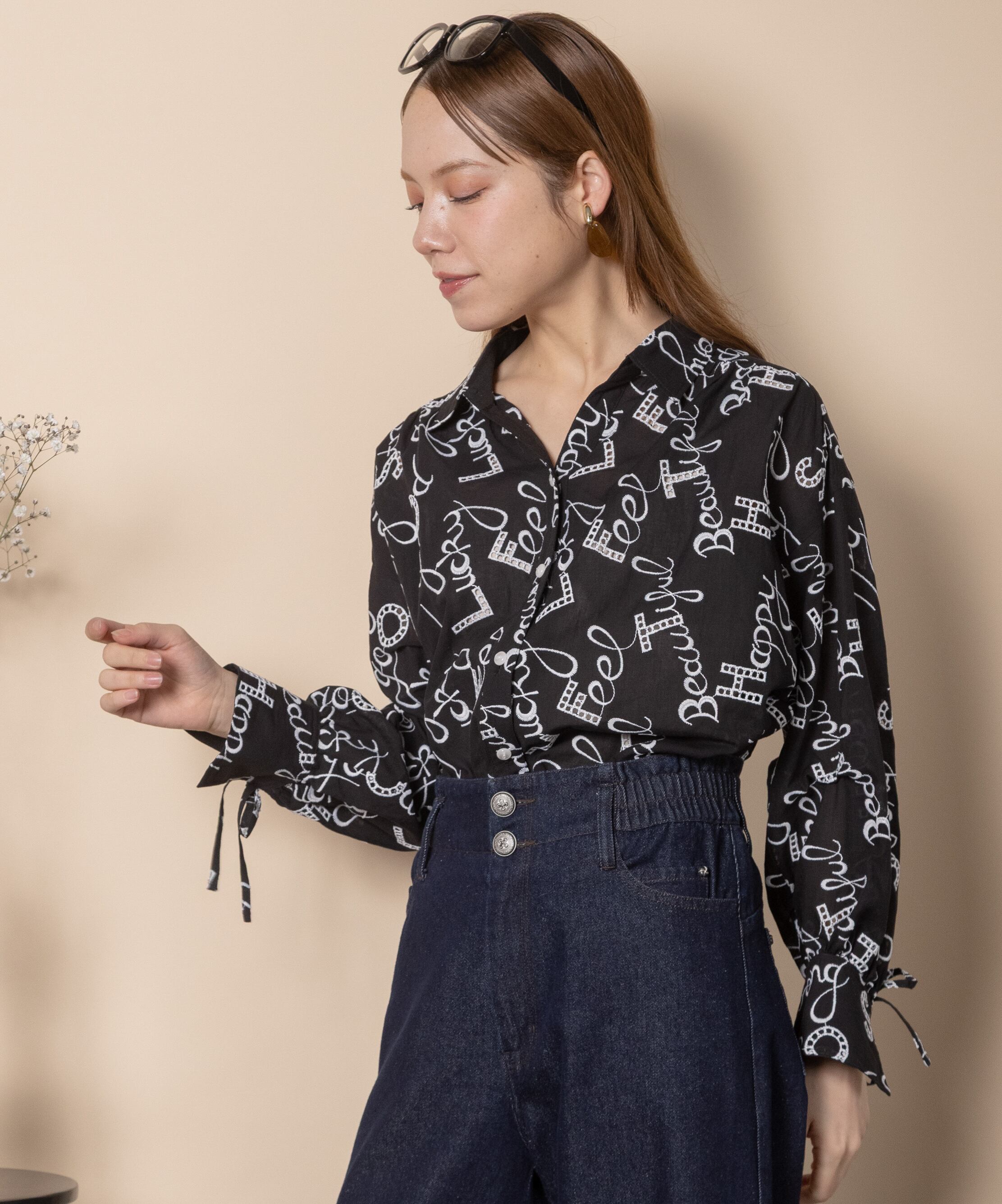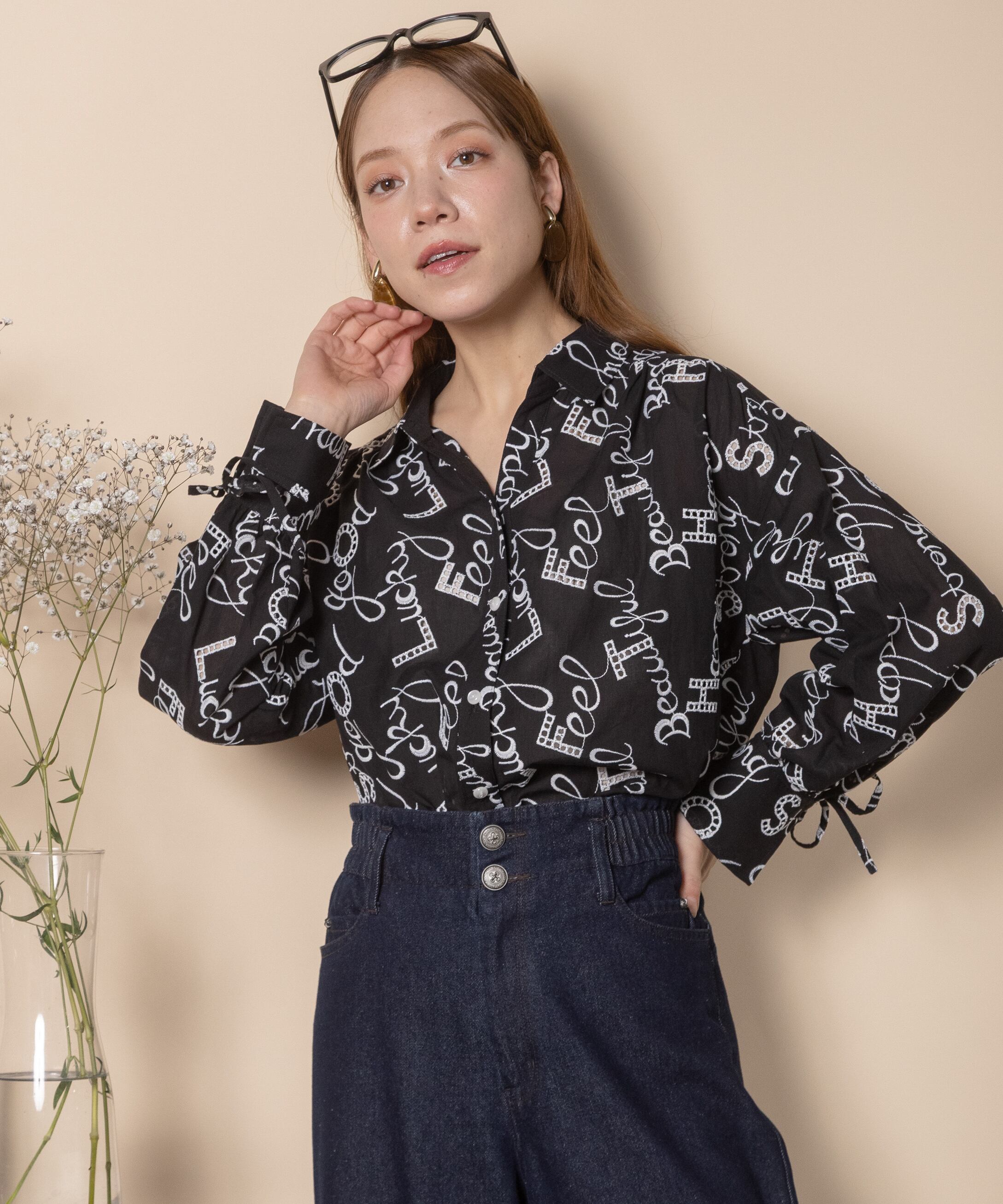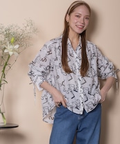ロゴモチーフに細かく刺繍が施されたインポート生地を使用したオープンカラーシャツ。肩がキュッと入ったコンパクトショルダーにフレアシルエットがオシャレなバランス。袖口はリボン仕様で程よい甘さをプラス。