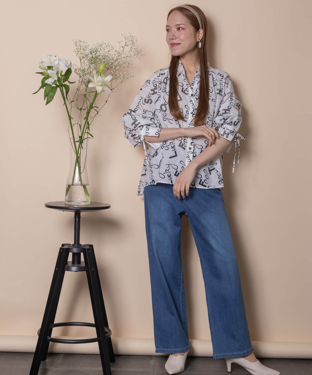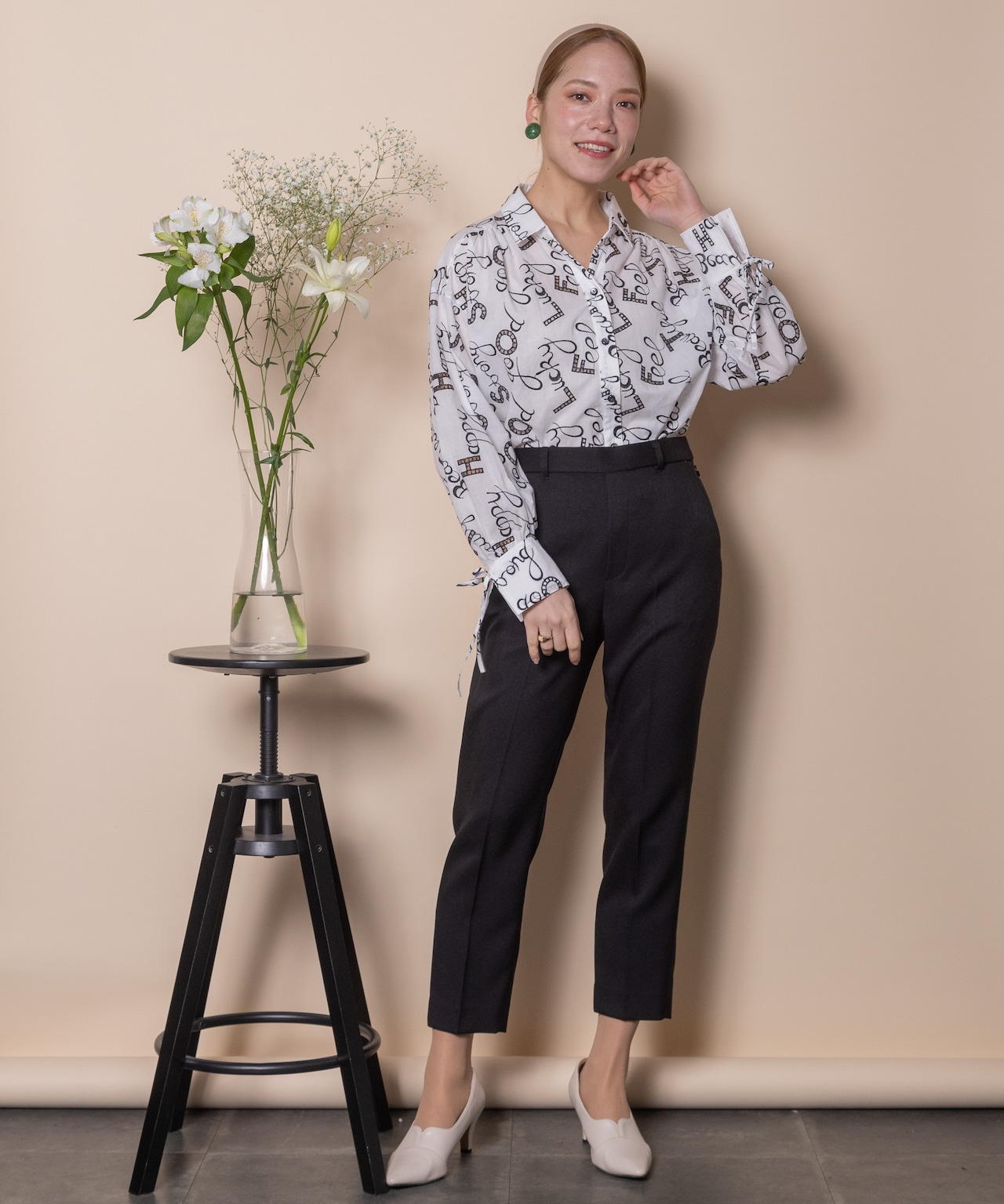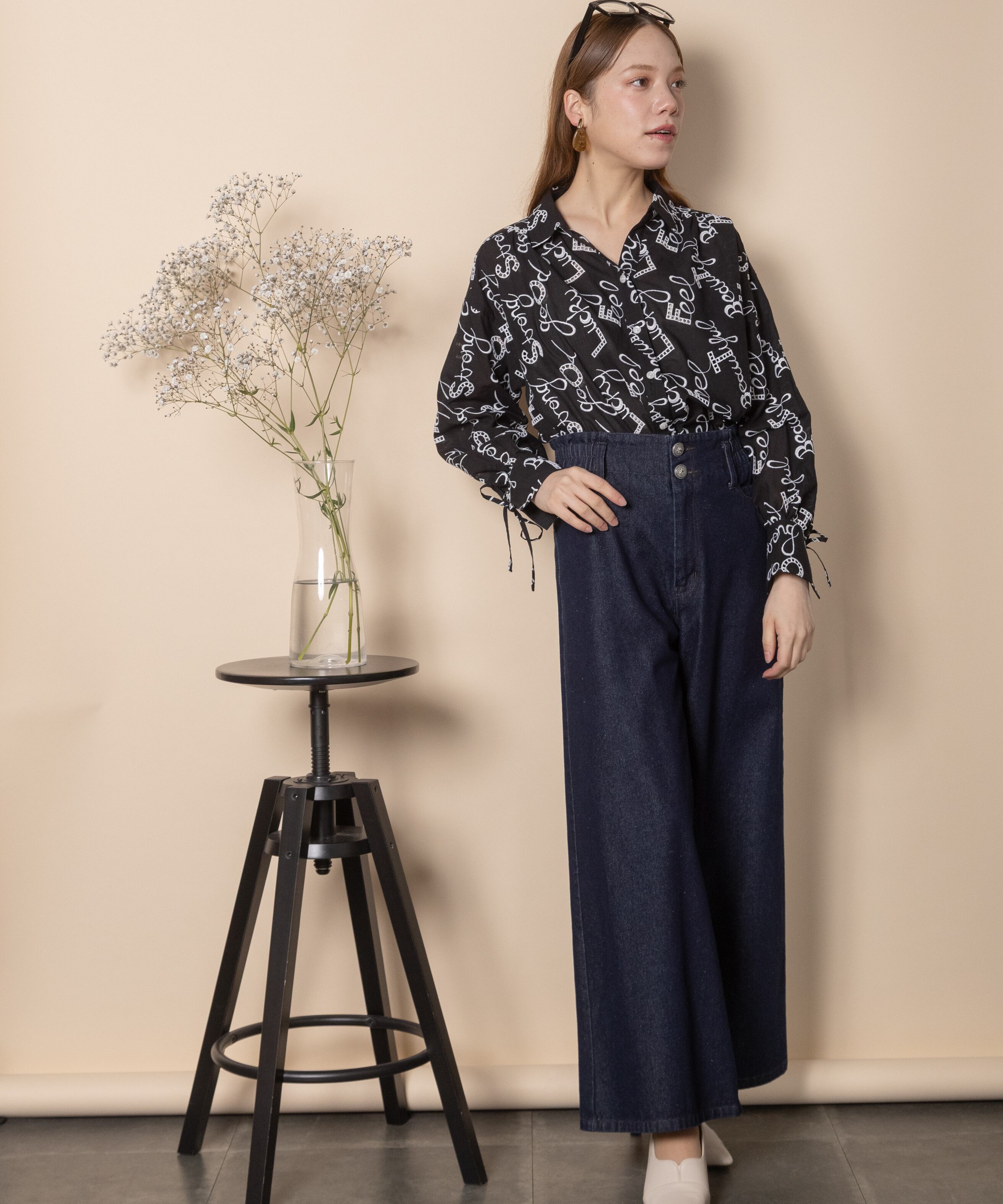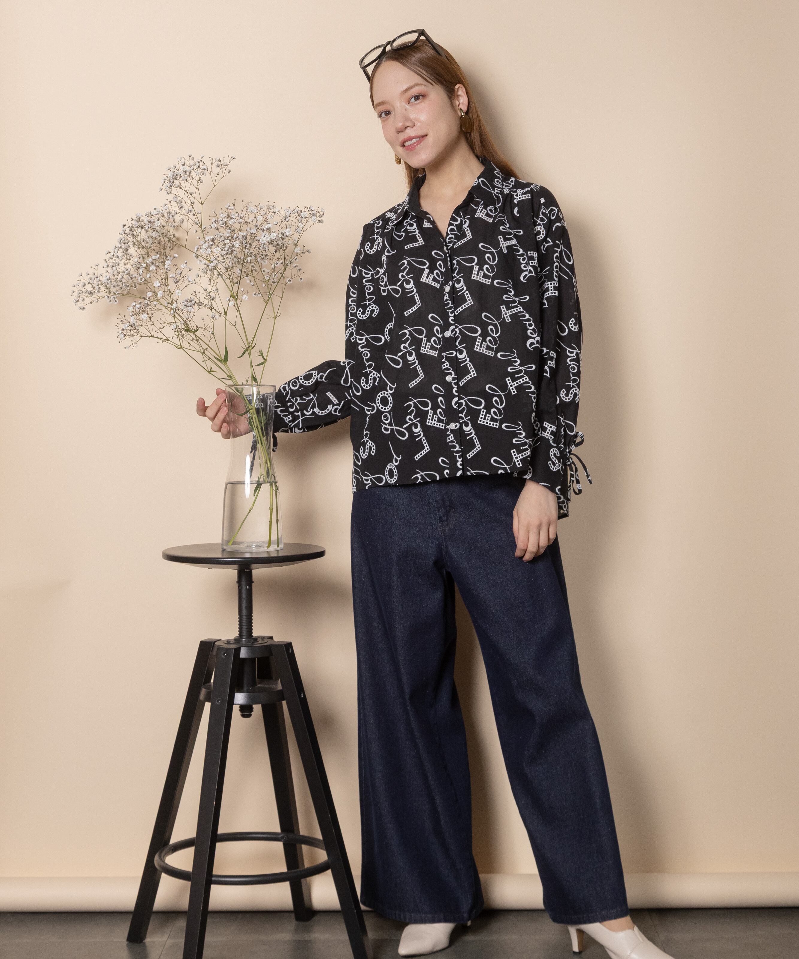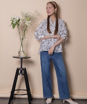 ロゴモチーフに細かく刺繍が施されたインポート生地を使用したオープンカラーシャツ。肩がキュッと入ったコンパクトショルダーにフレアシルエットがオシャレなバランス。袖口はリボン仕様で程よい甘さをプラス。