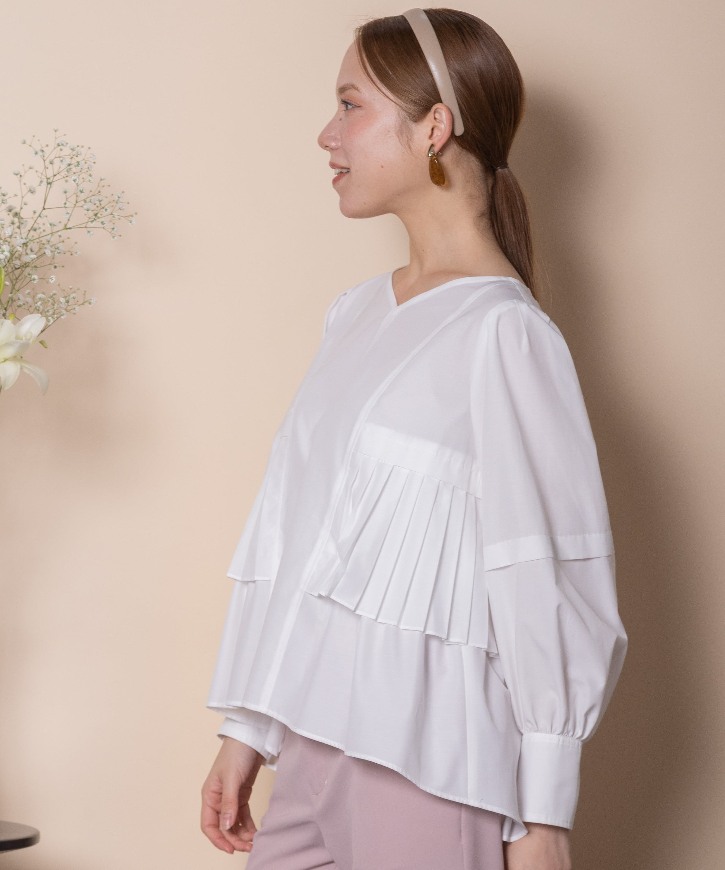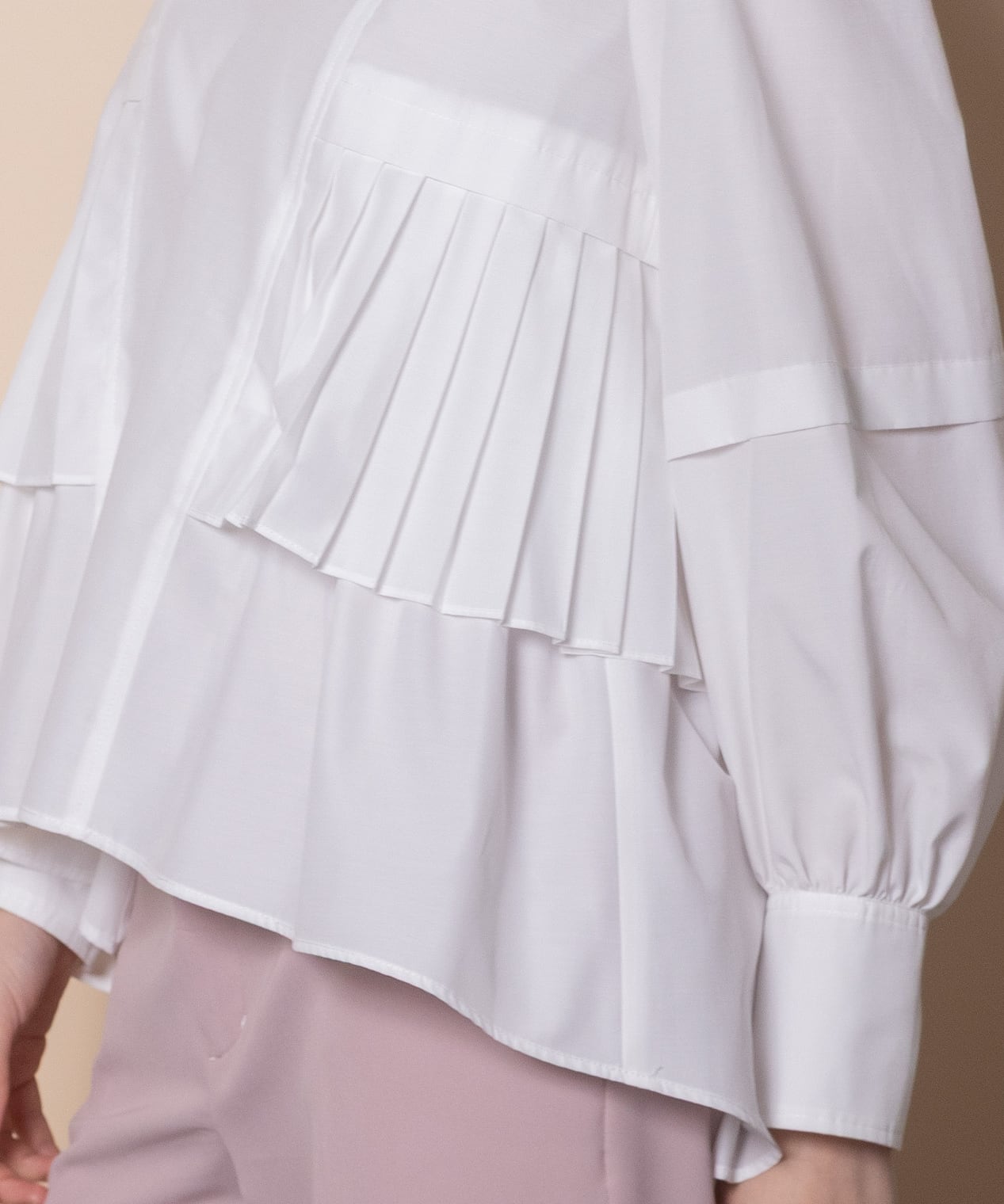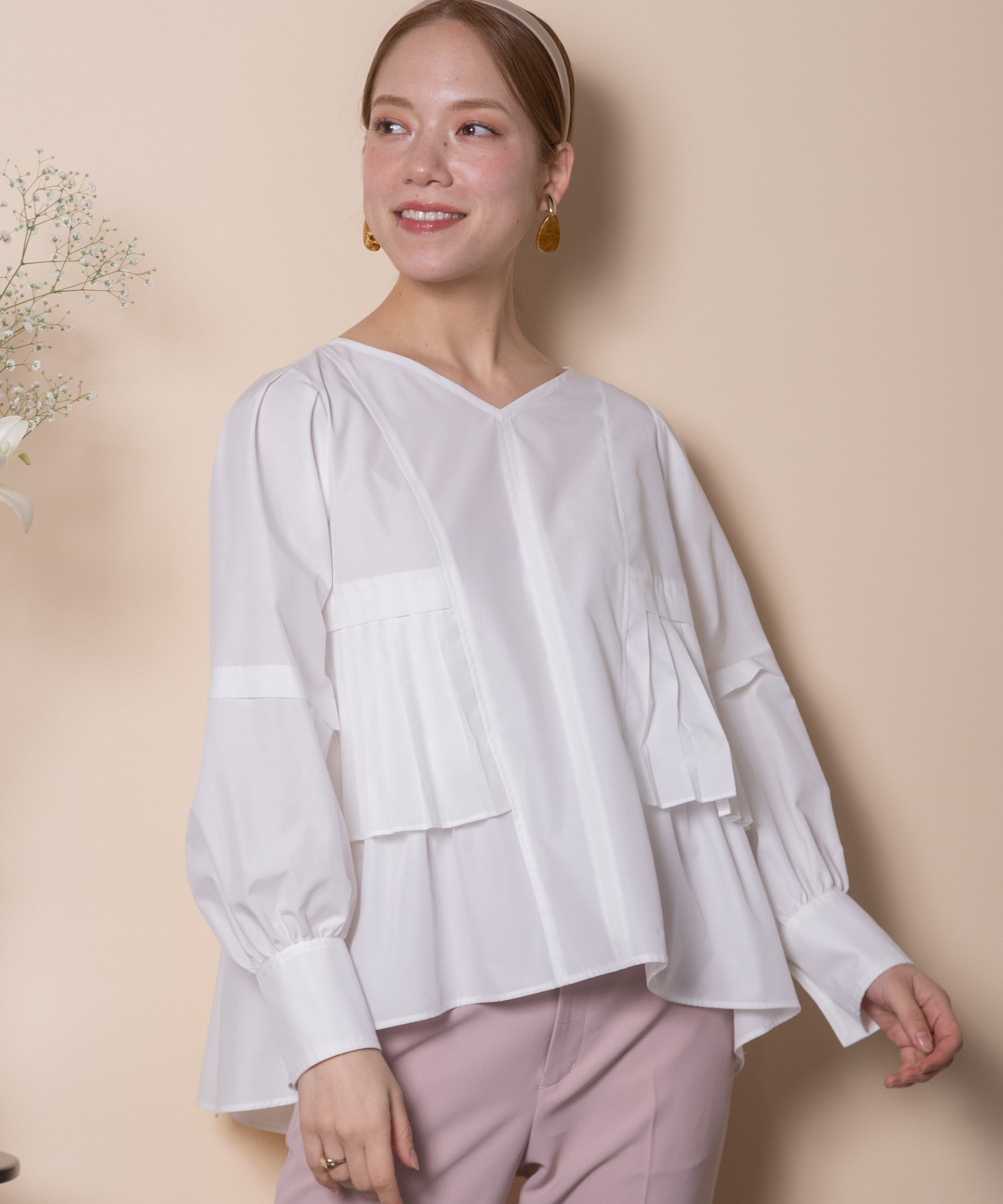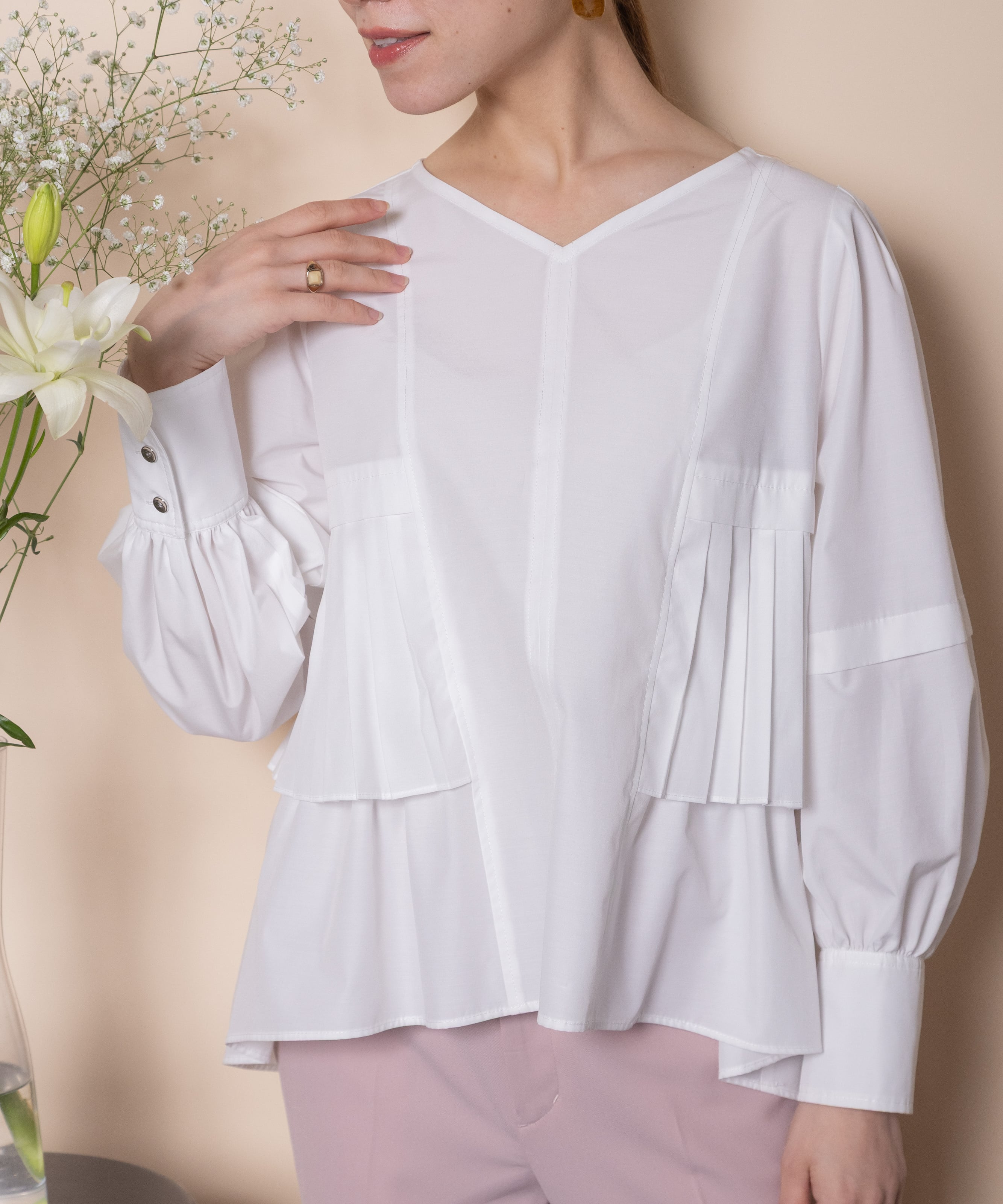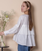 プリーツとギャザーをたっぷり施したデザインシャツブラウス。ウエスト部分にはタックプリーツ、その中にはギャザーが施されたこだわり。立体的なボリューム袖、袖口はカフスにギャザーとこだわり抜いたアイテム。