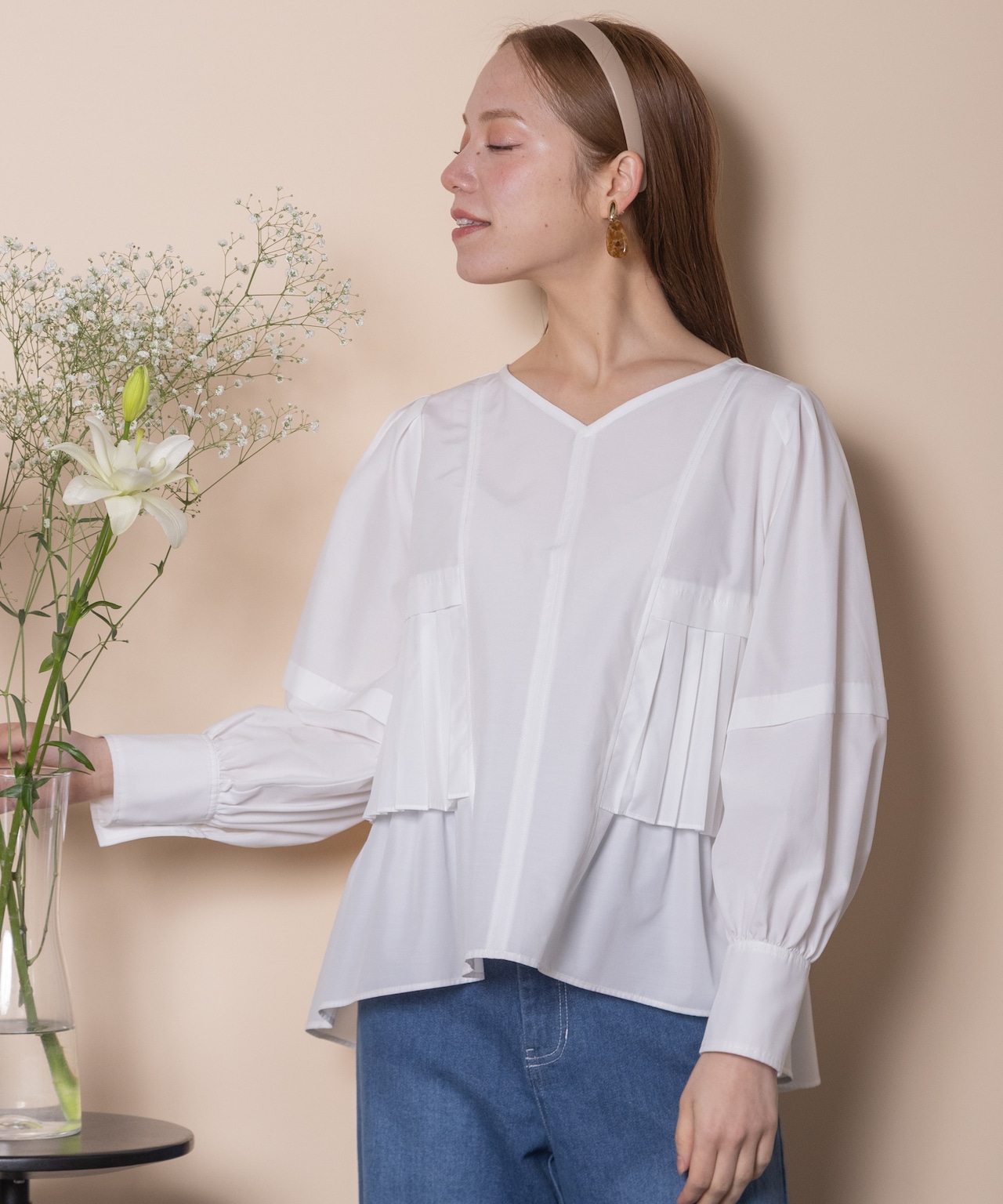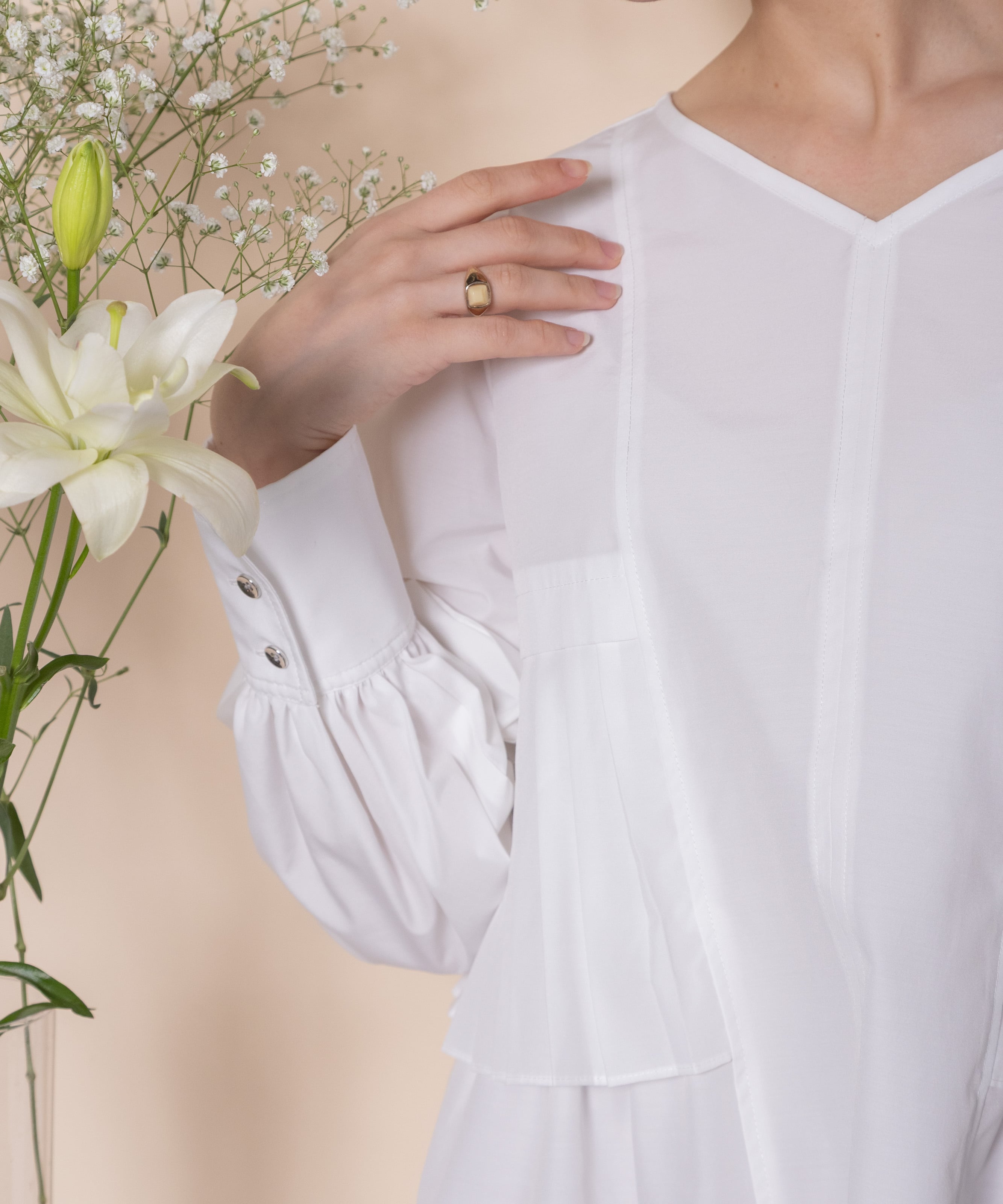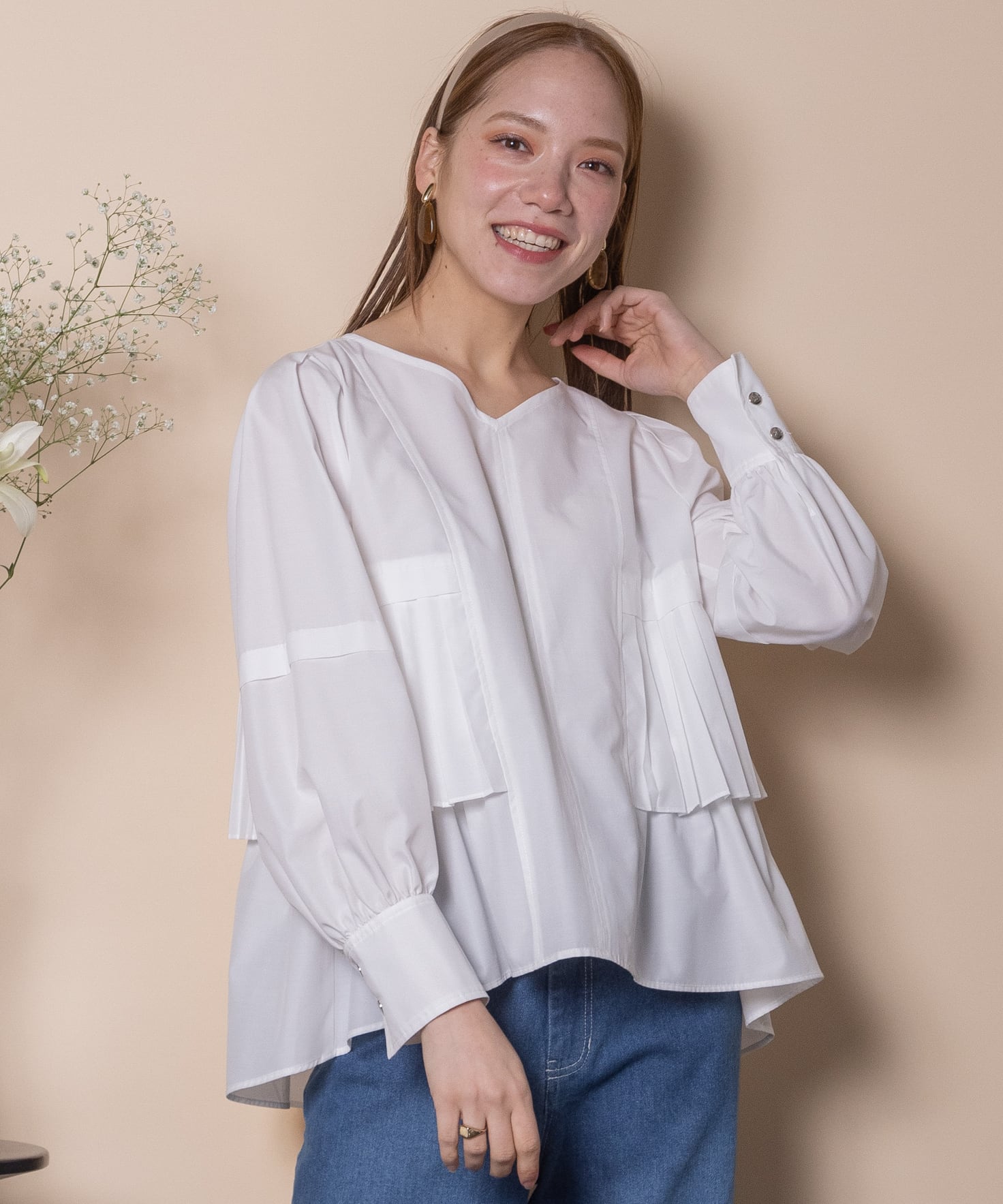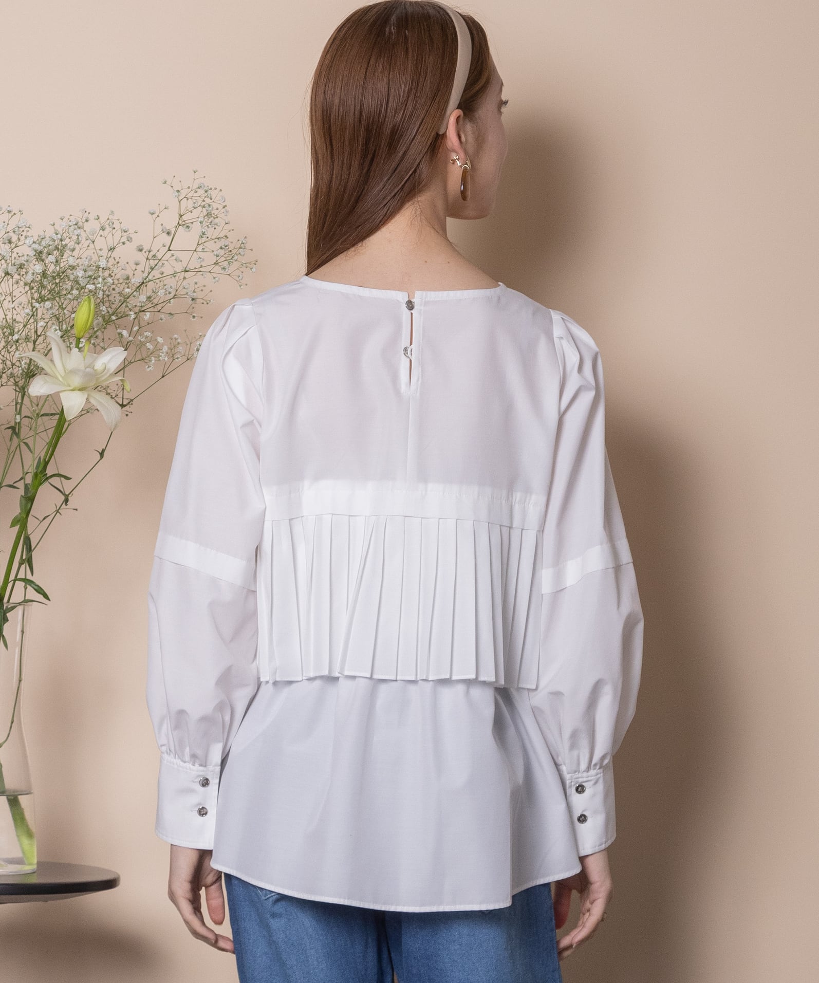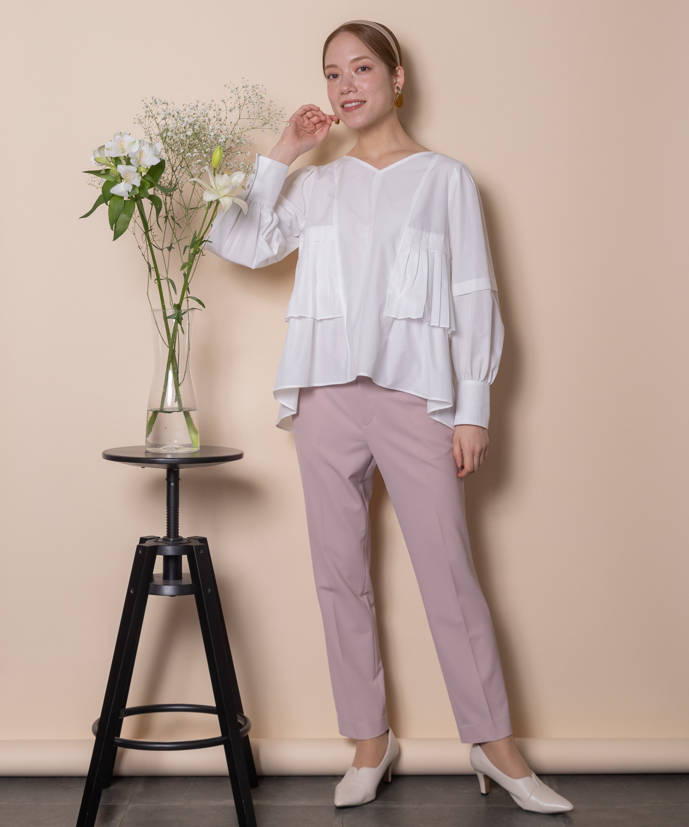 プリーツとギャザーをたっぷり施したデザインシャツブラウス。ウエスト部分にはタックプリーツ、その中にはギャザーが施されたこだわり。立体的なボリューム袖、袖口はカフスにギャザーとこだわり抜いたアイテム。