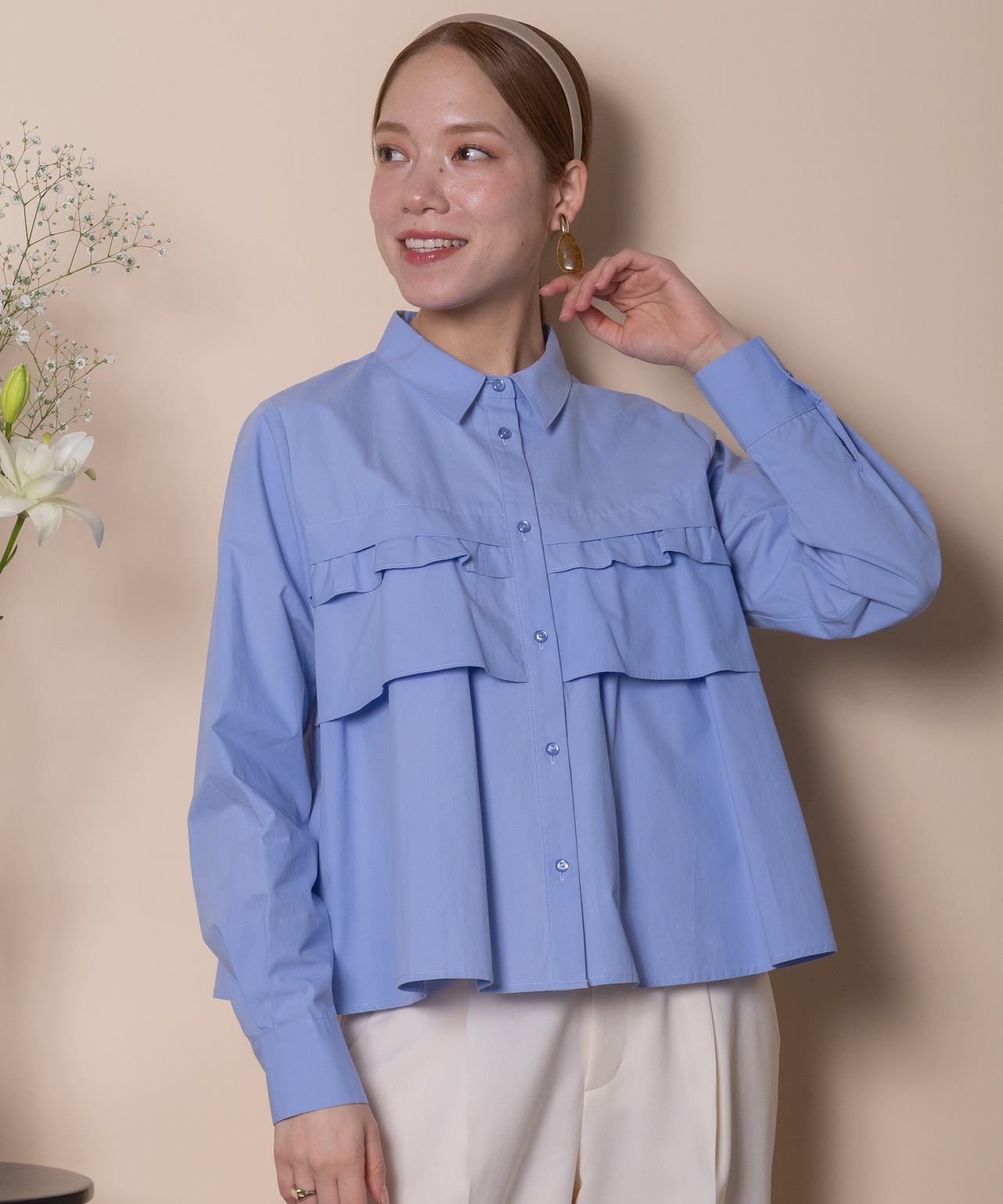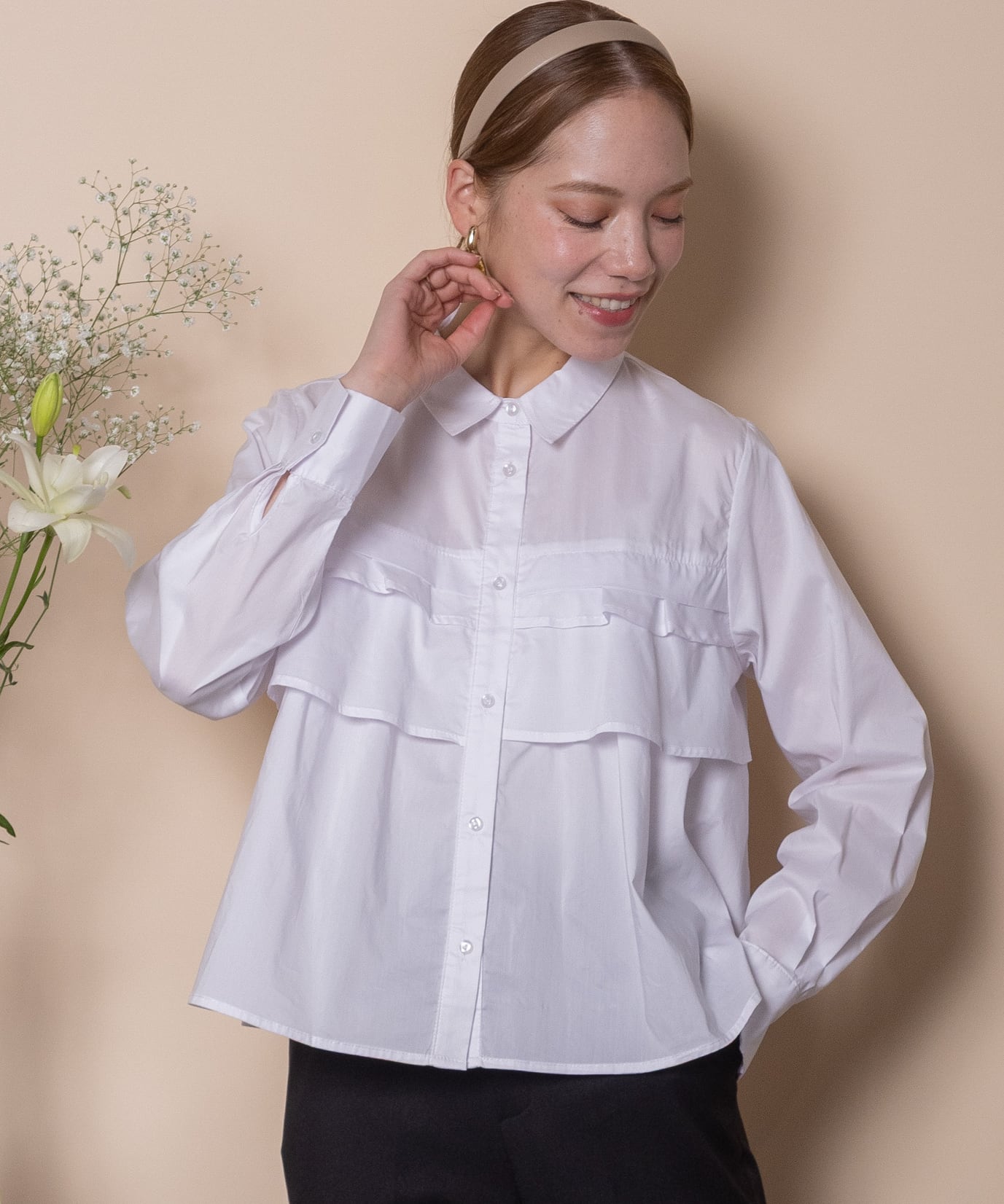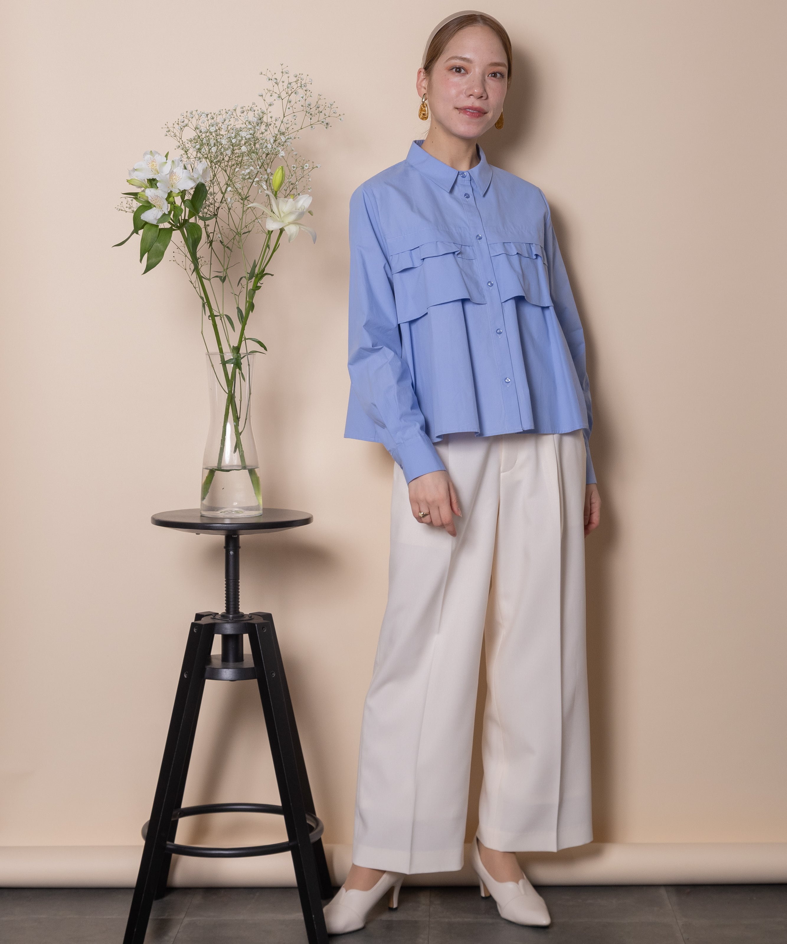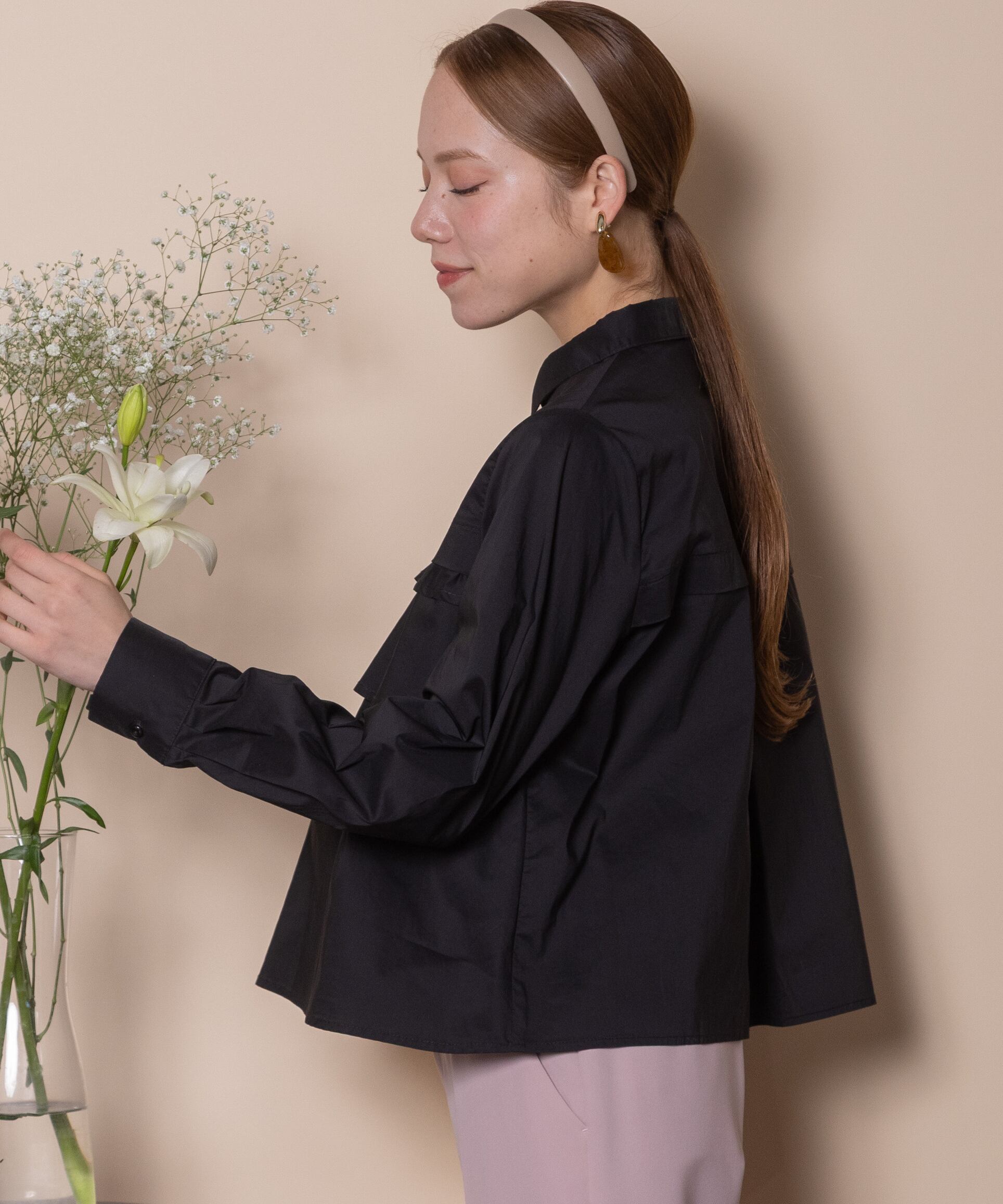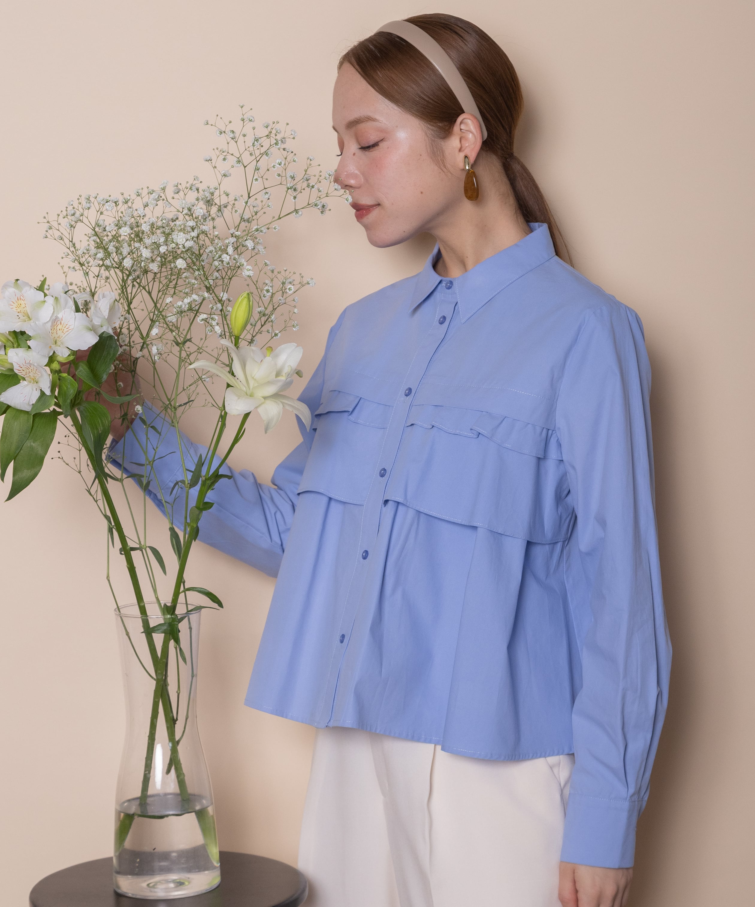 大人フェミニン派におすすめのフリルたっぷり施したデザインシャツ。肩がキュッと入ったコンパクトショルダーにショート丈フレアシルエットがオシャレなバランス。レギュラーカラーにすることで甘すぎない大人フェミニンなブラウスに。