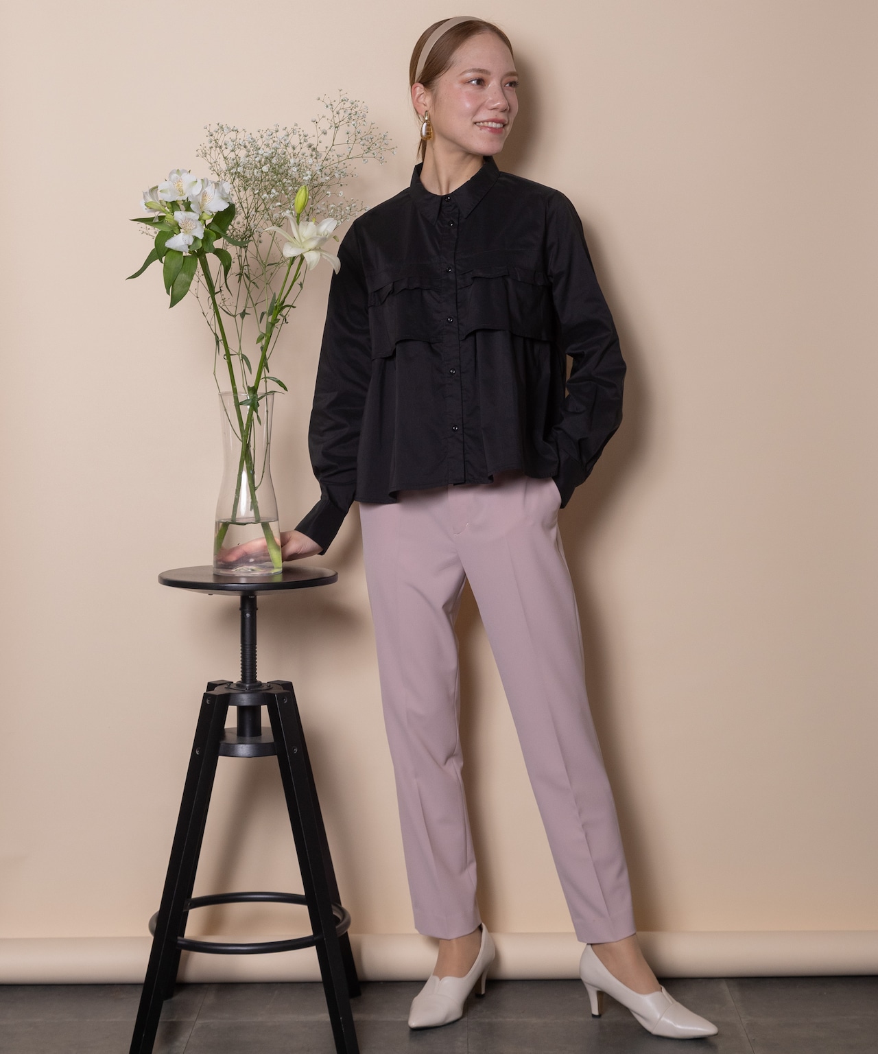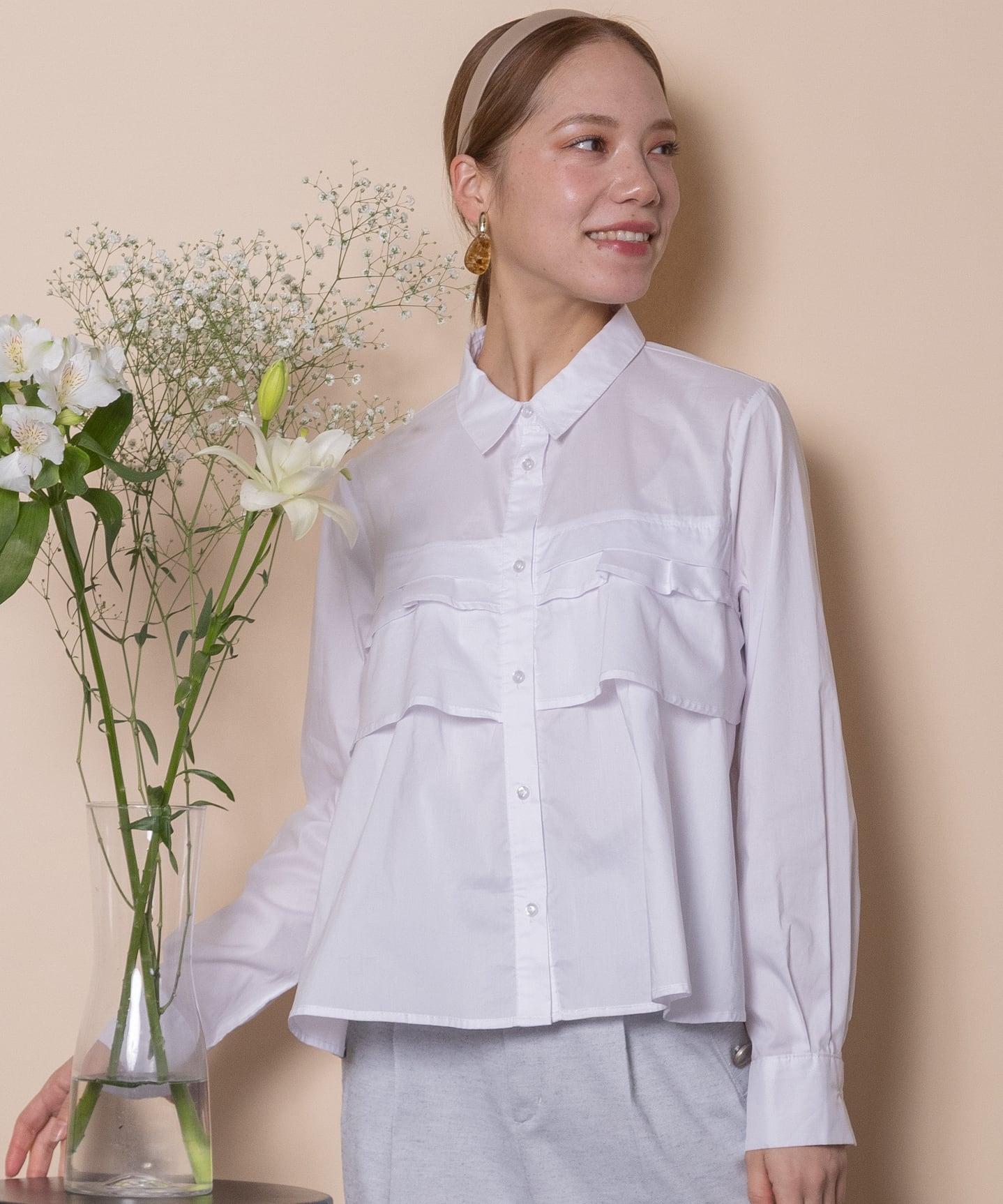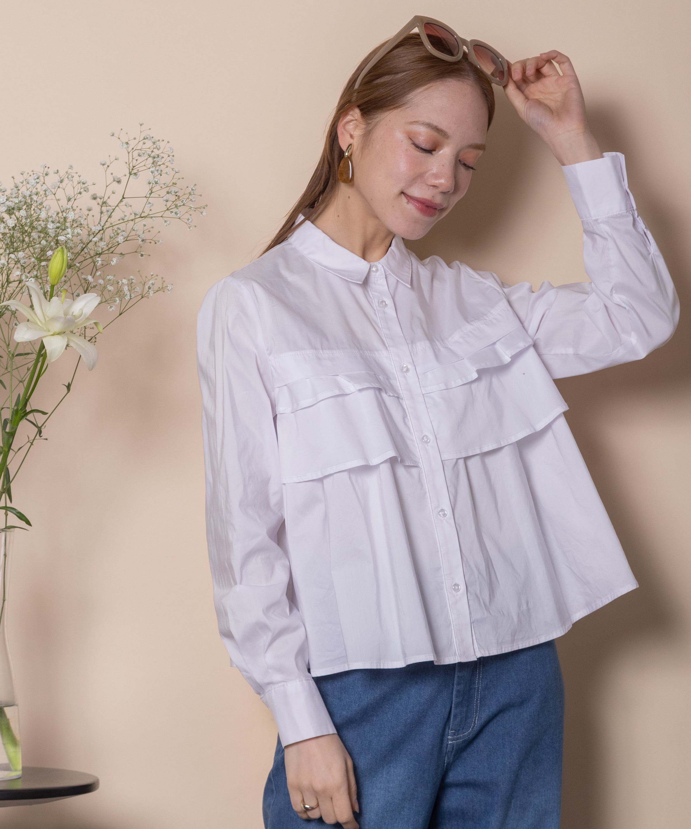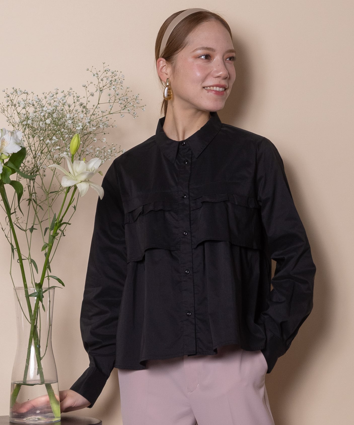 大人フェミニン派におすすめのフリルたっぷり施したデザインシャツ。肩がキュッと入ったコンパクトショルダーにショート丈フレアシルエットがオシャレなバランス。レギュラーカラーにすることで甘すぎない大人フェミニンなブラウスに。