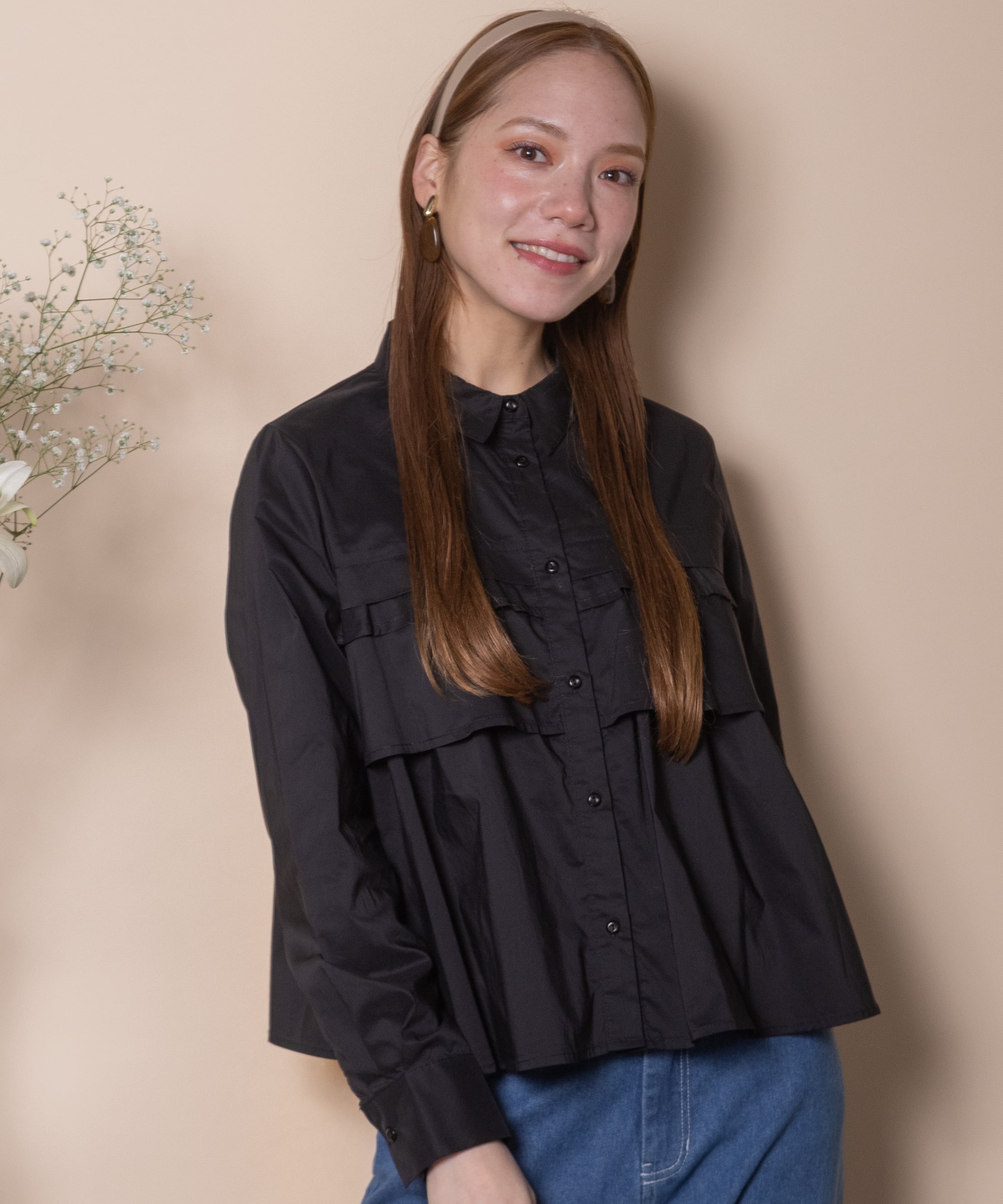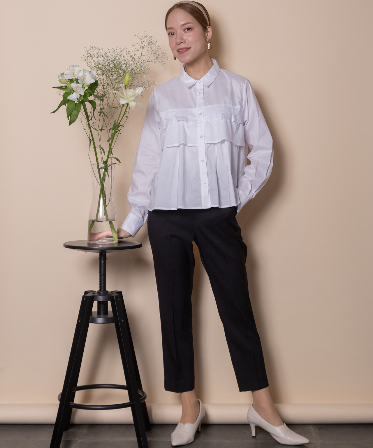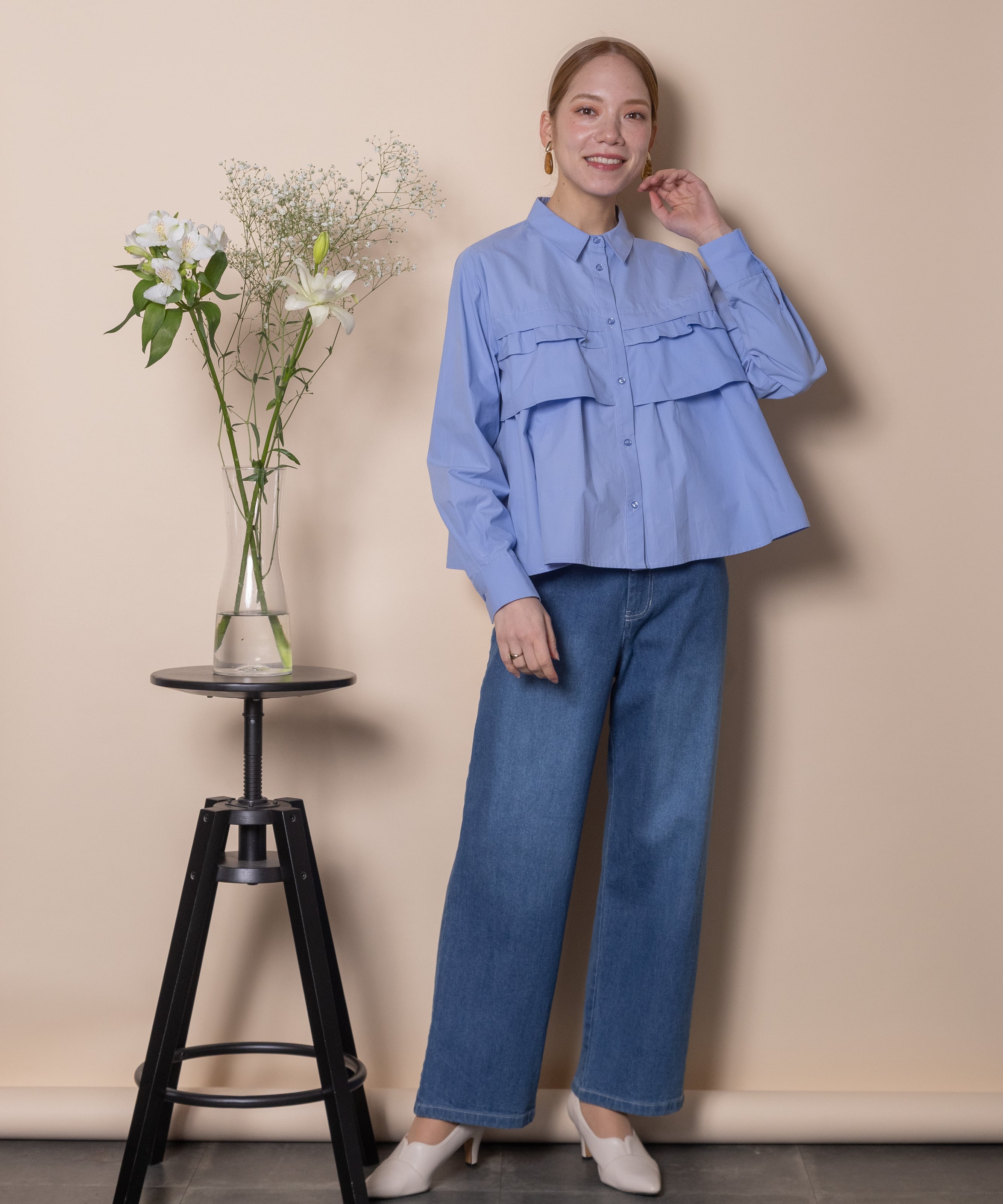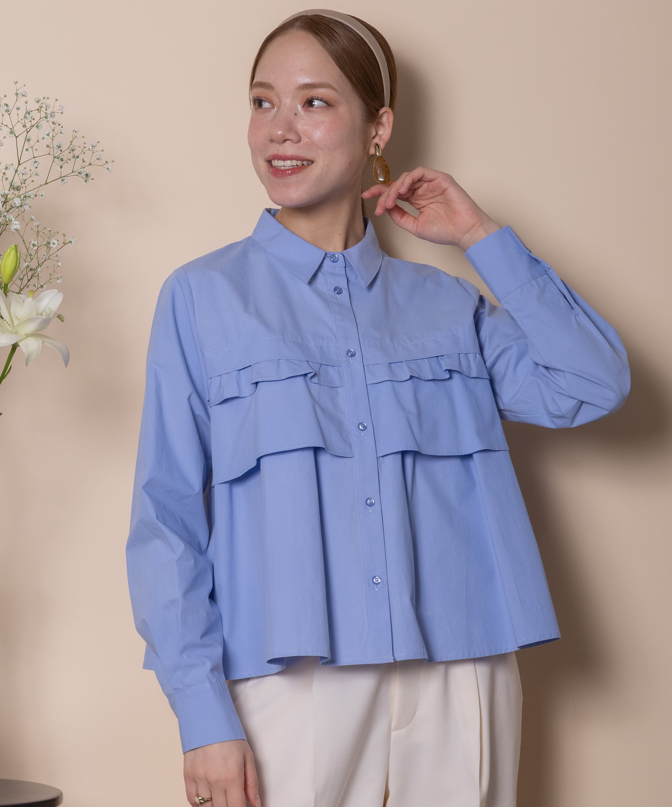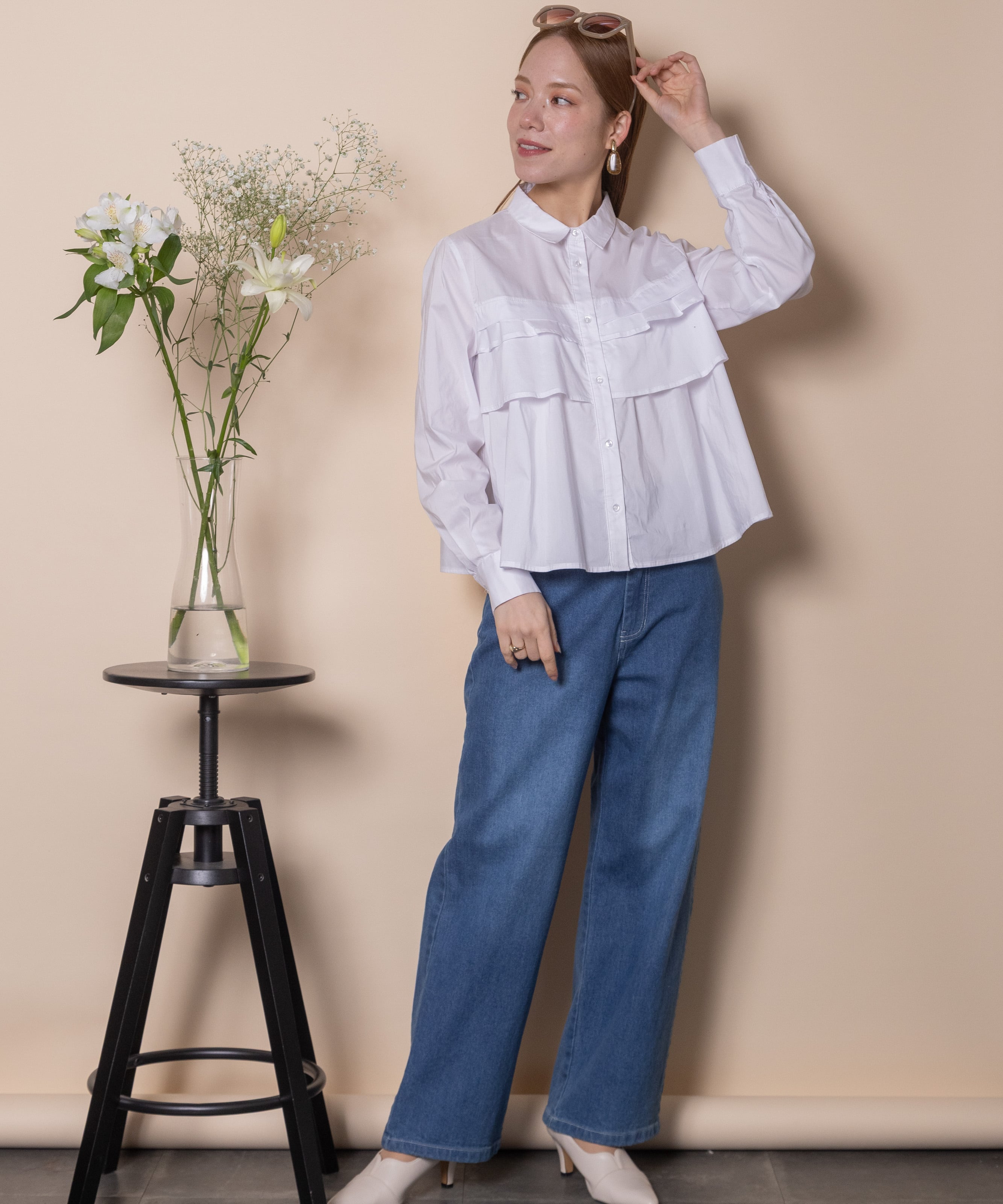 大人フェミニン派におすすめのフリルたっぷり施したデザインシャツ。肩がキュッと入ったコンパクトショルダーにショート丈フレアシルエットがオシャレなバランス。レギュラーカラーにすることで甘すぎない大人フェミニンなブラウスに。