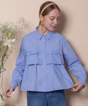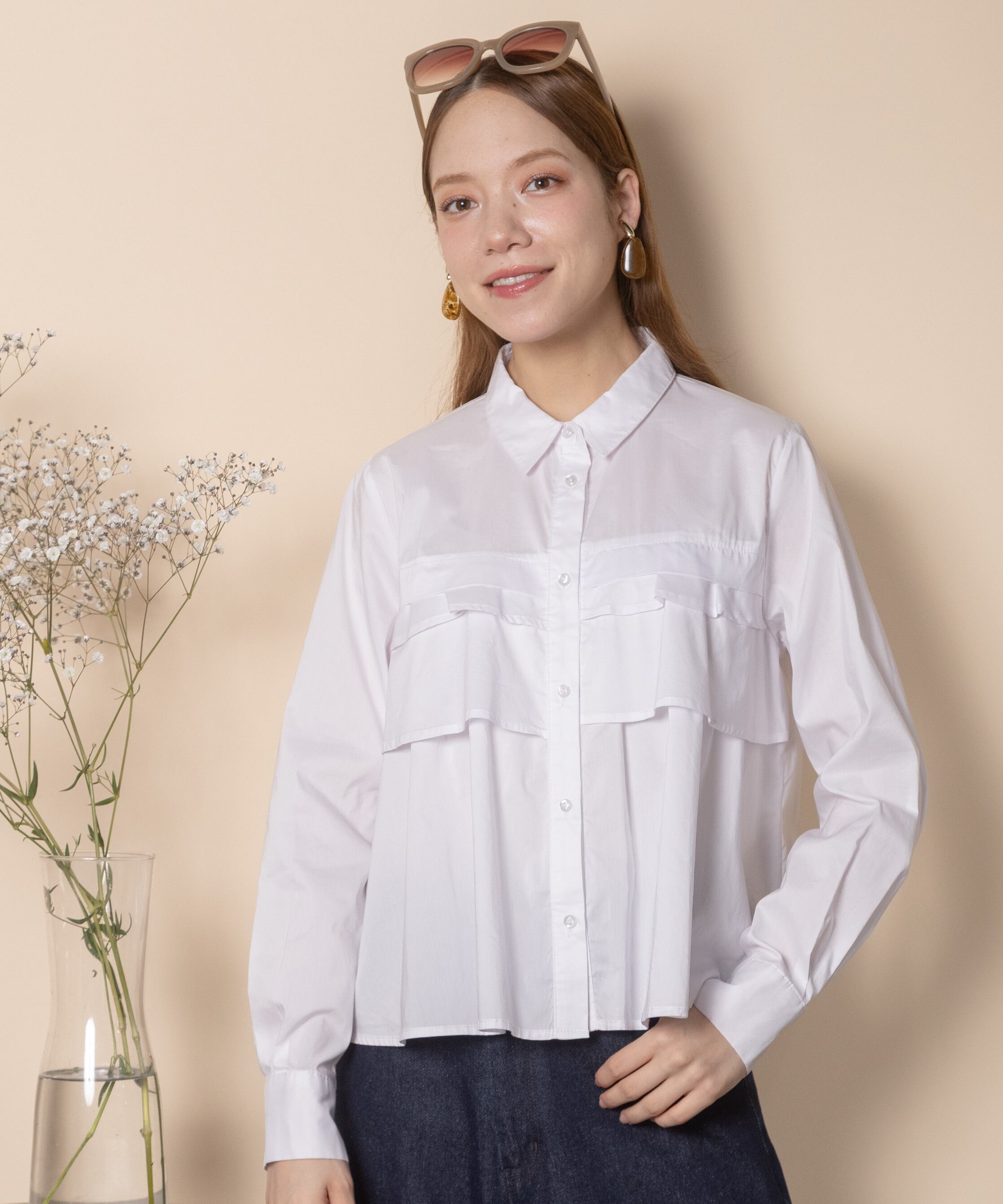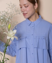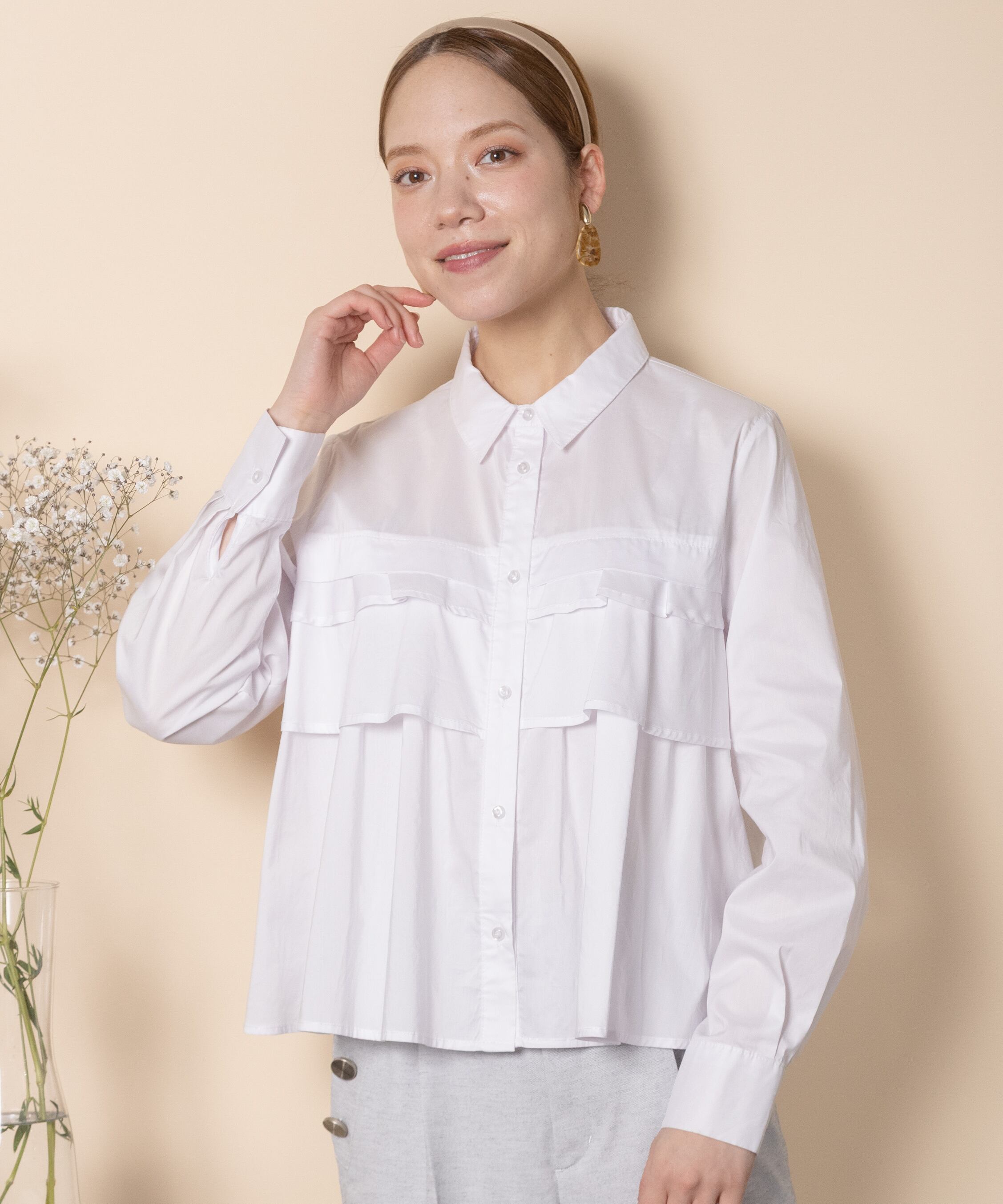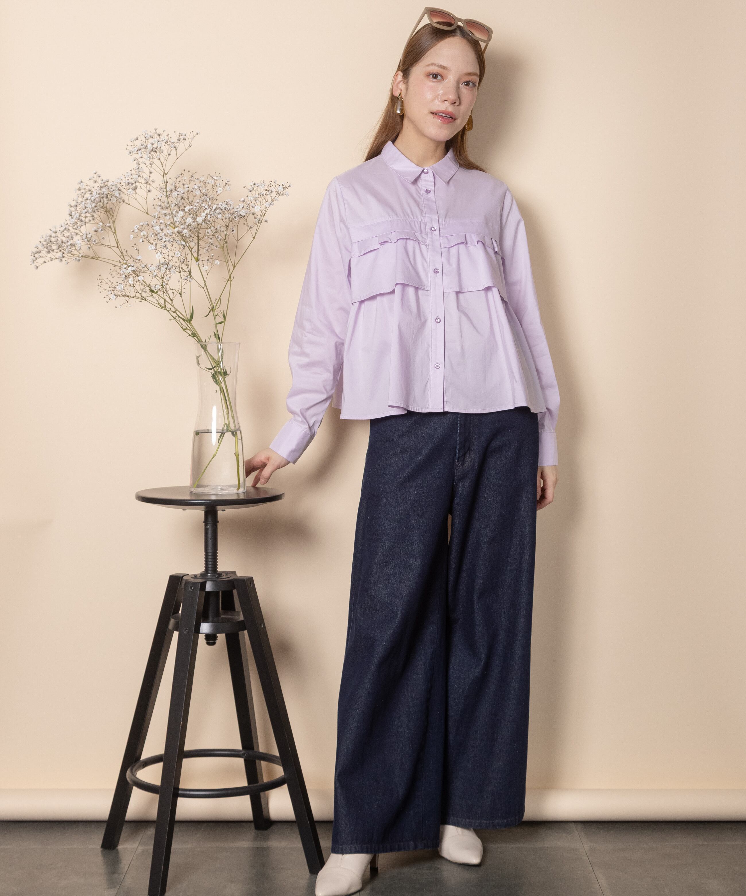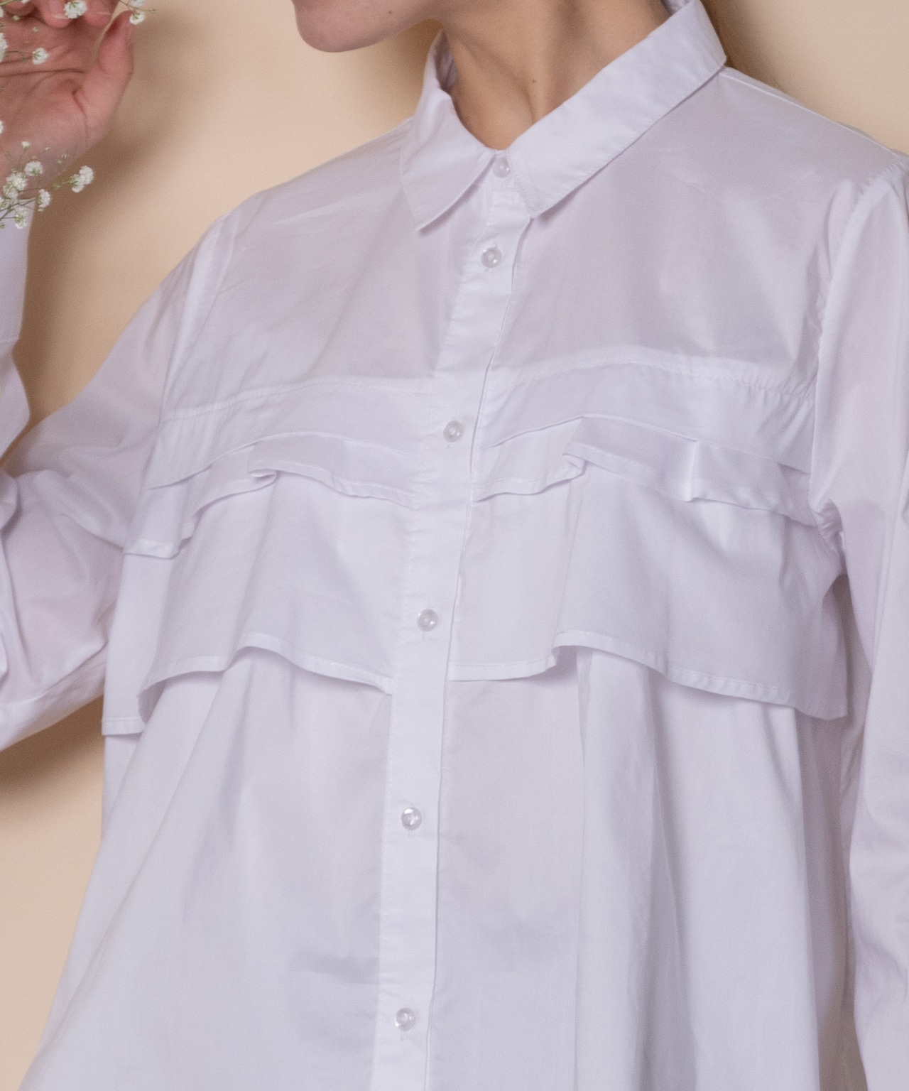 大人フェミニン派におすすめのフリルたっぷり施したデザインシャツ。肩がキュッと入ったコンパクトショルダーにショート丈フレアシルエットがオシャレなバランス。レギュラーカラーにすることで甘すぎない大人フェミニンなブラウスに。