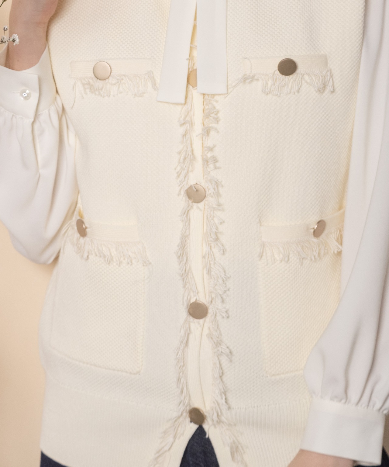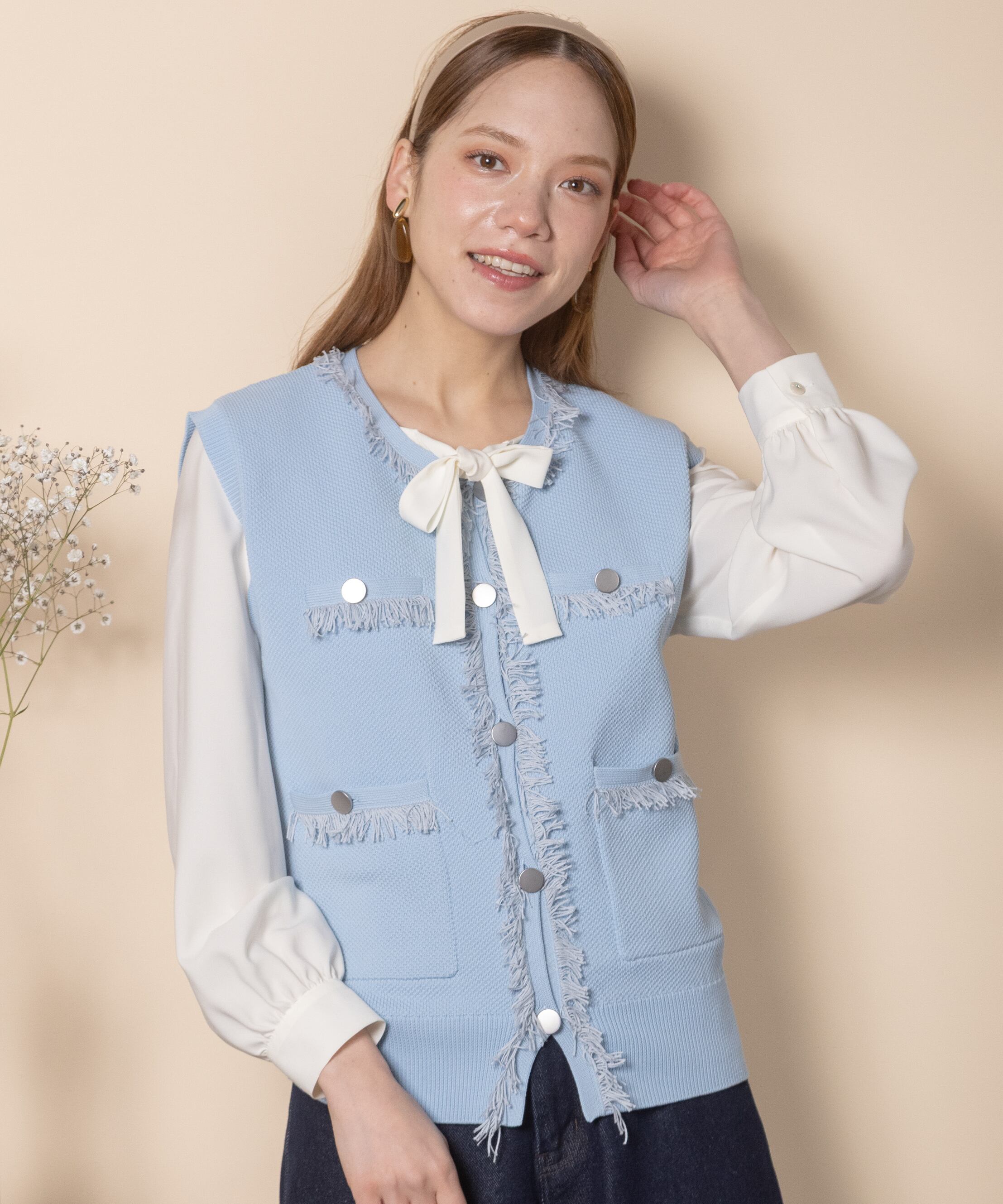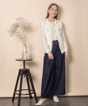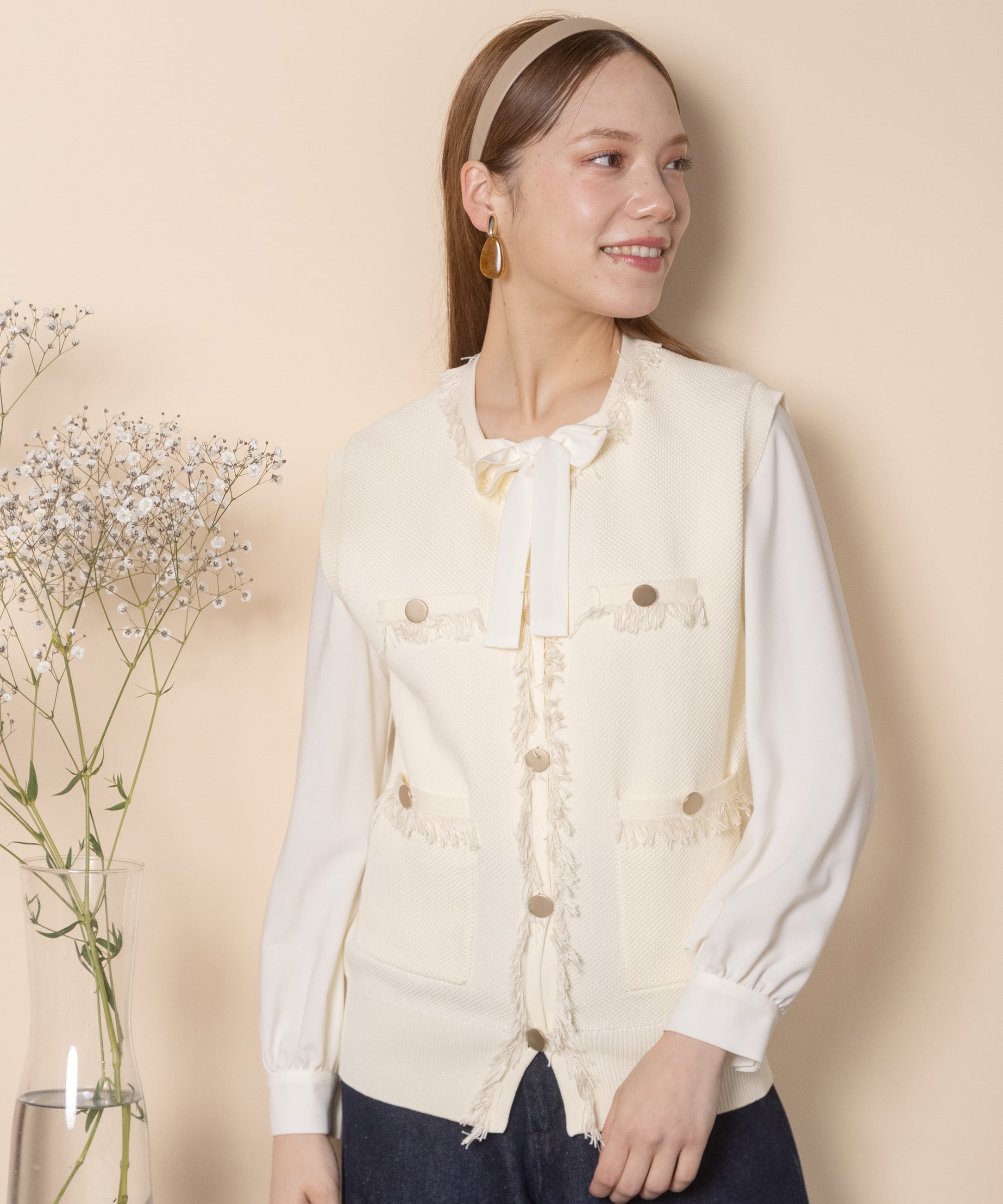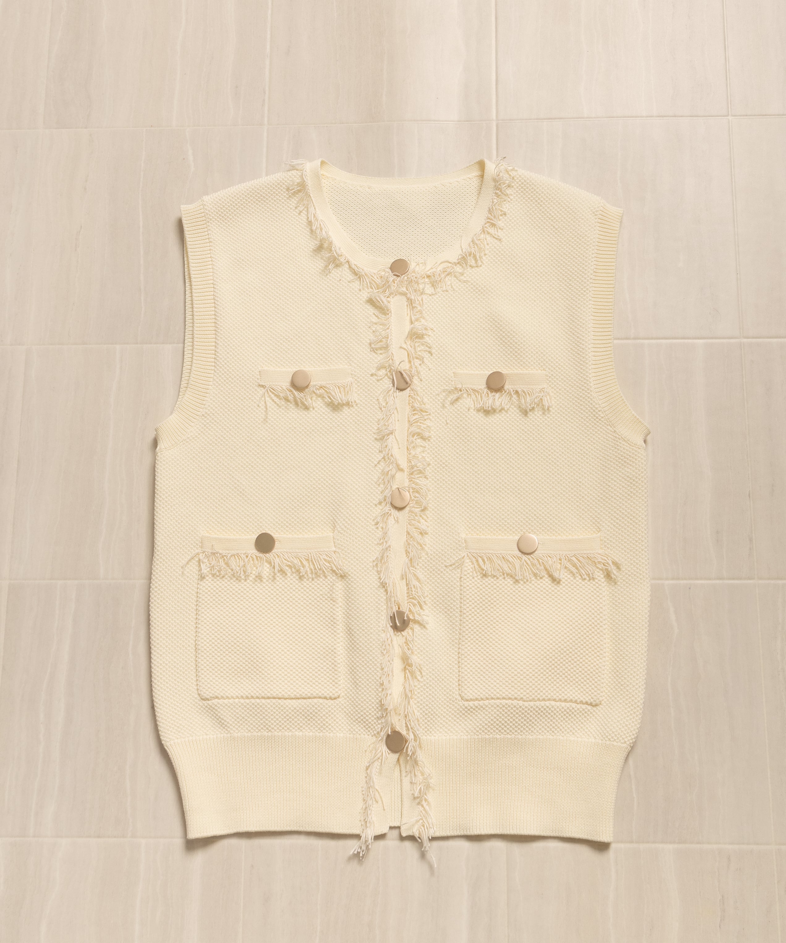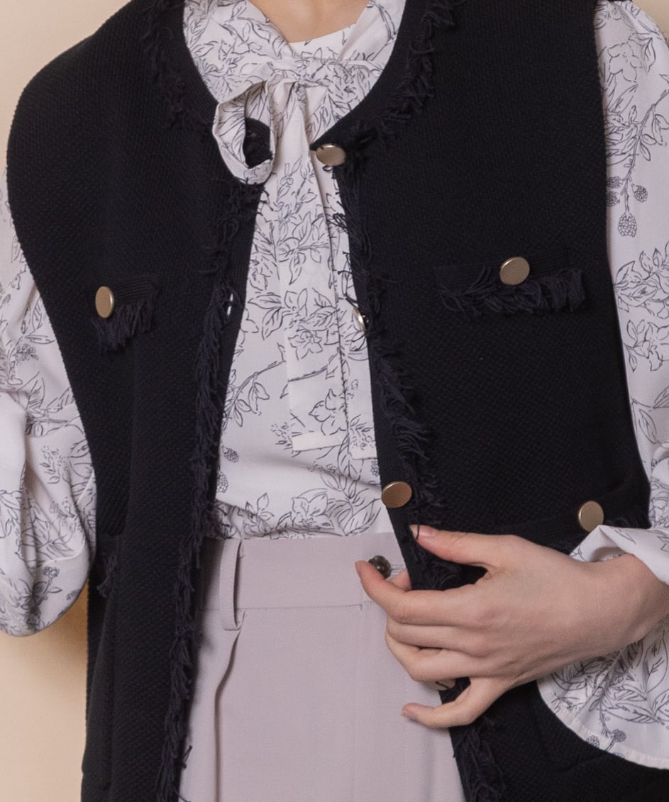 ツイード風のニットを採用したクラシカルなニットベスト。襟、前縦、ポケットはフリンジ仕様、アウトポケットにアンティーク風金ボタンとこだわりのデザイン。