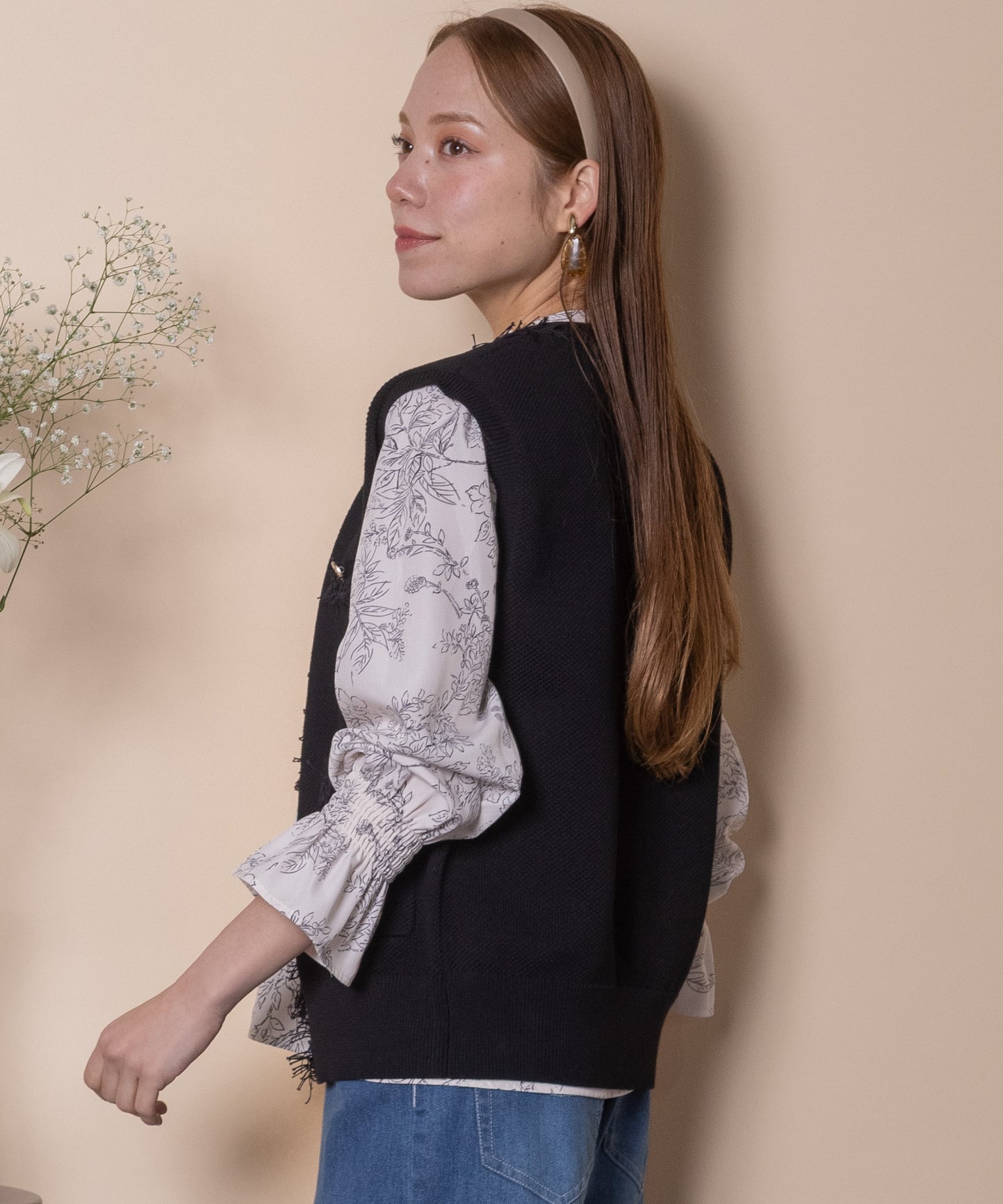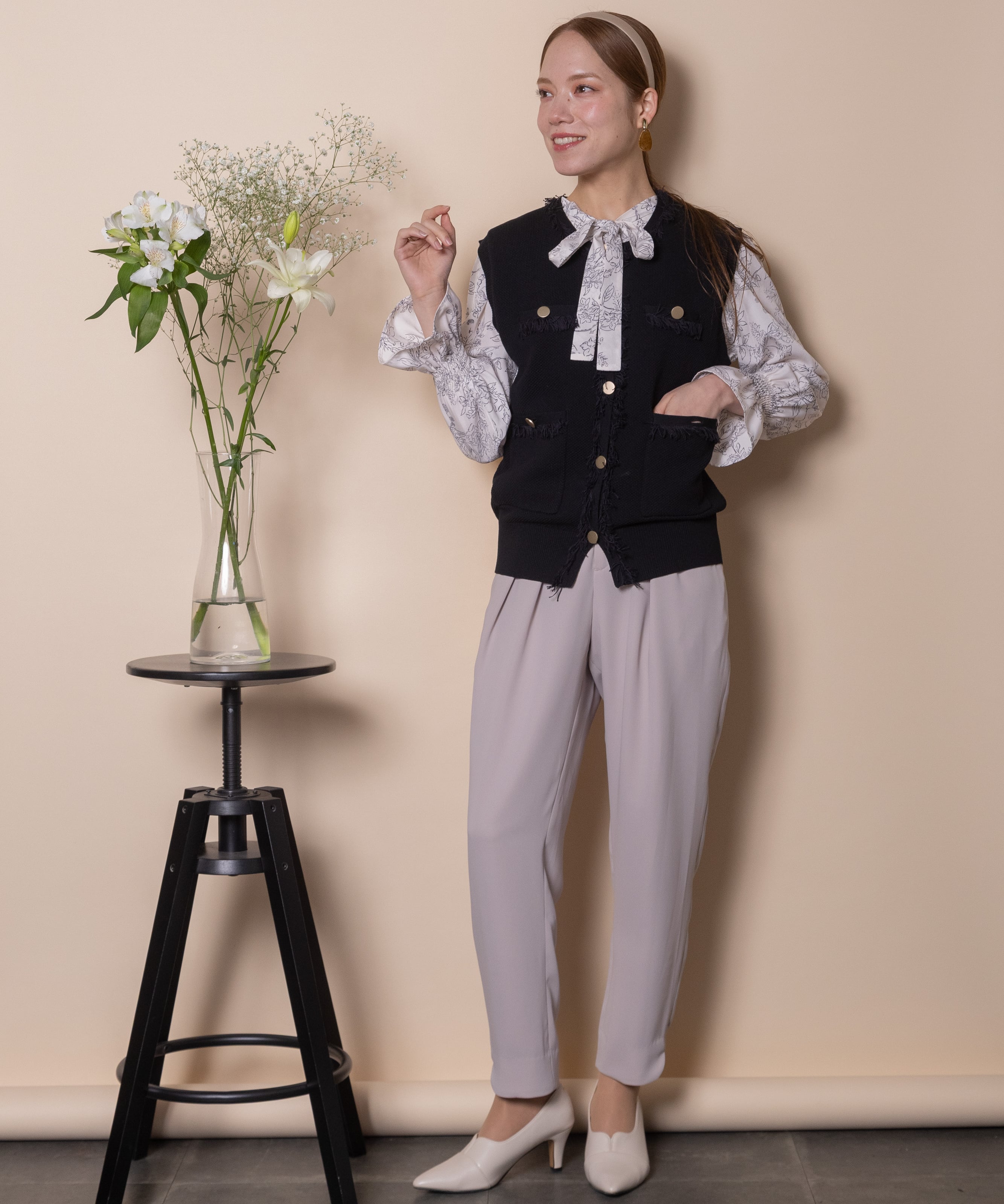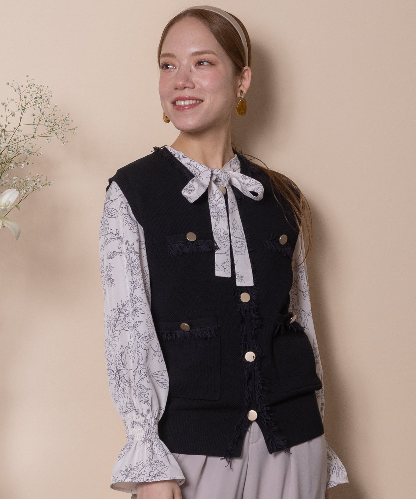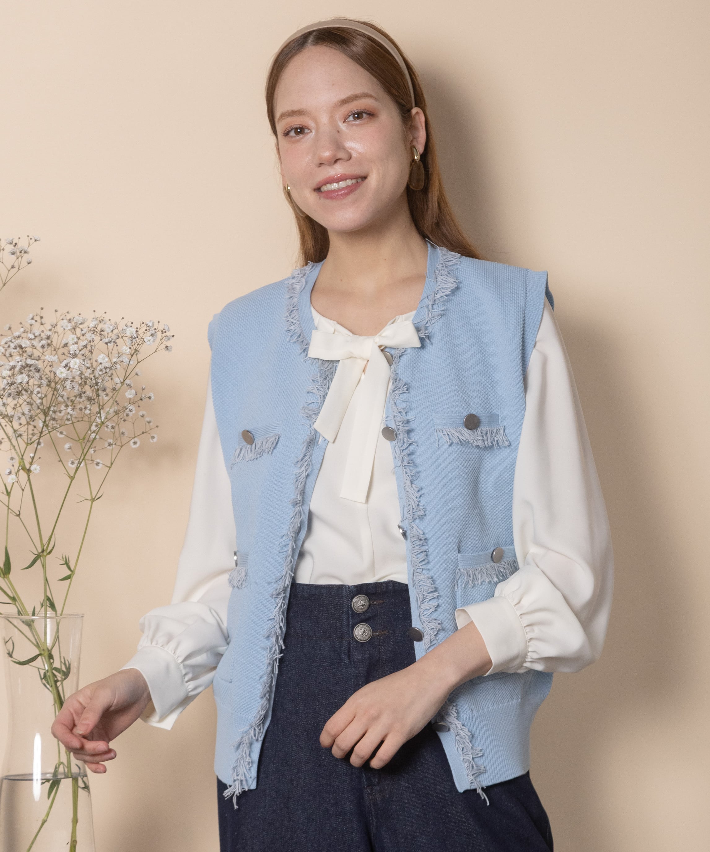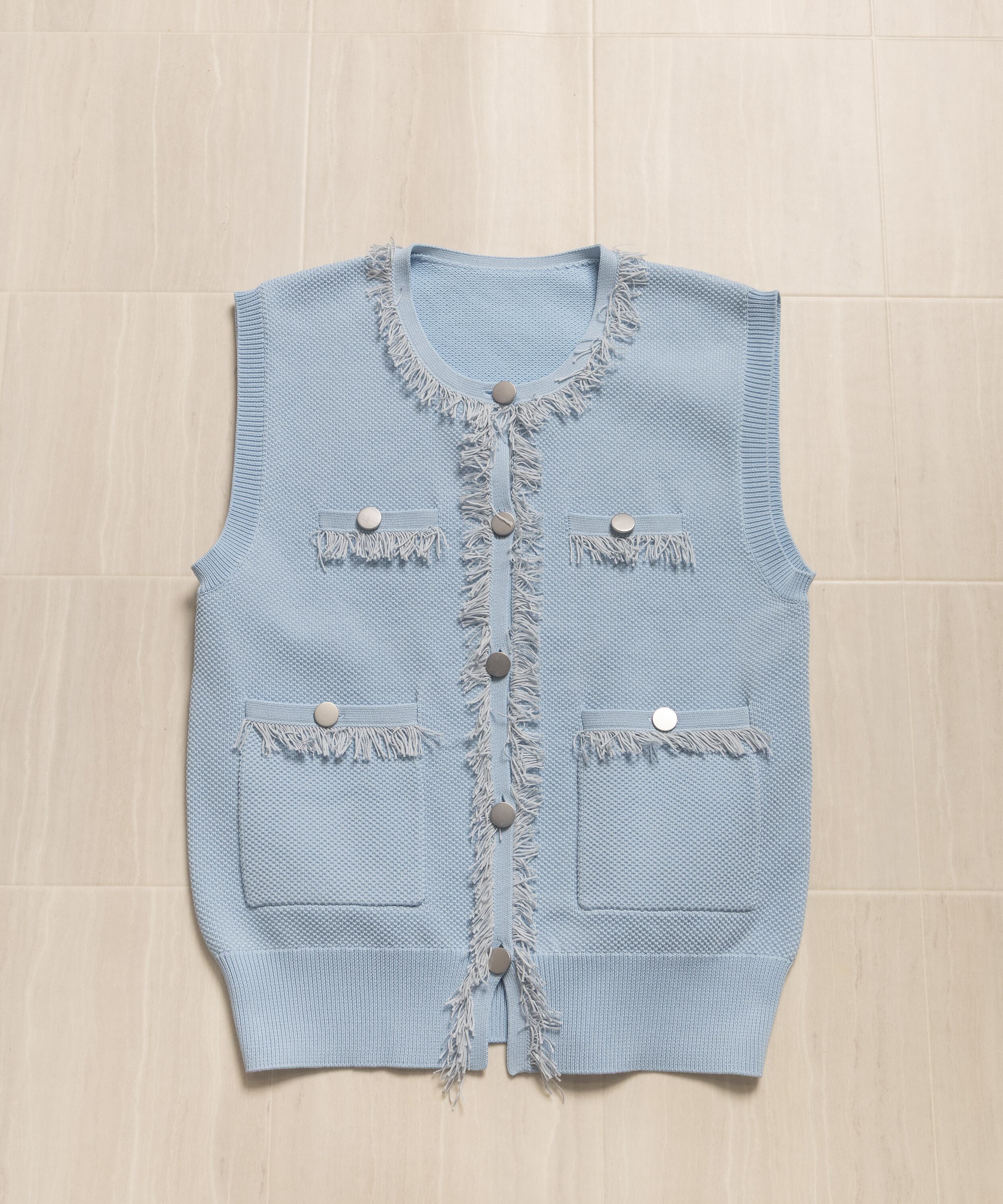 ツイード風のニットを採用したクラシカルなニットベスト。襟、前縦、ポケットはフリンジ仕様、アウトポケットにアンティーク風金ボタンとこだわりのデザイン。