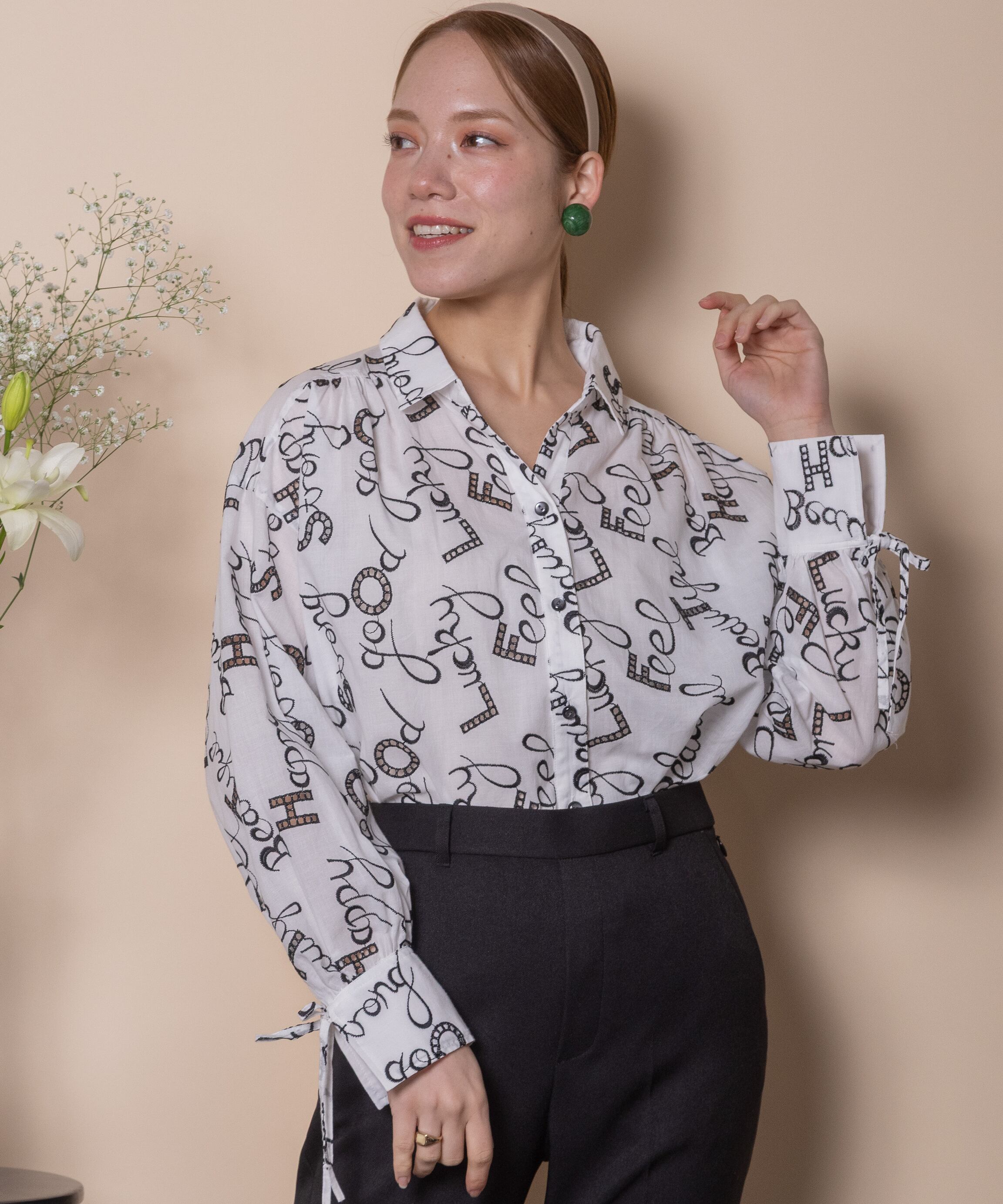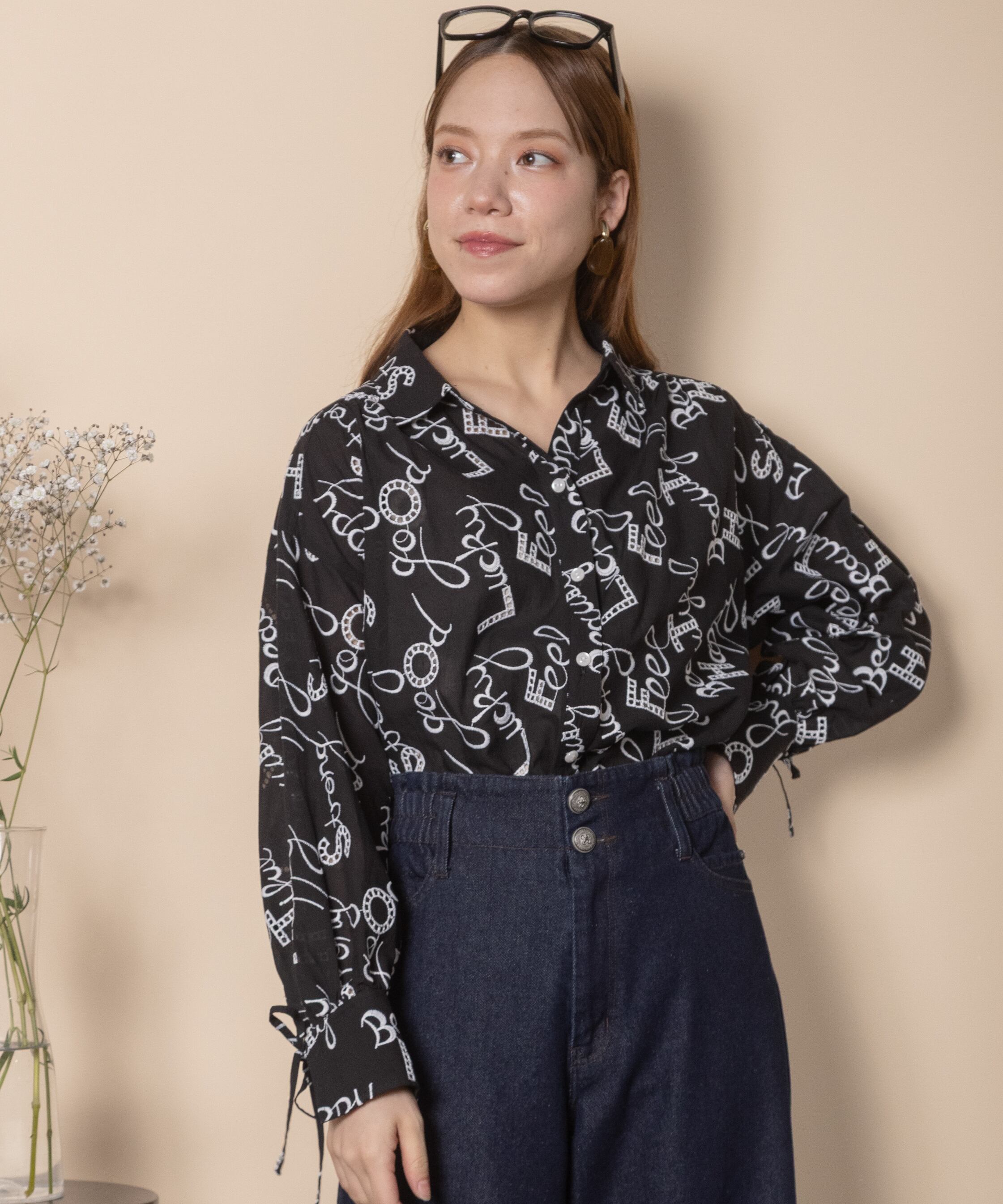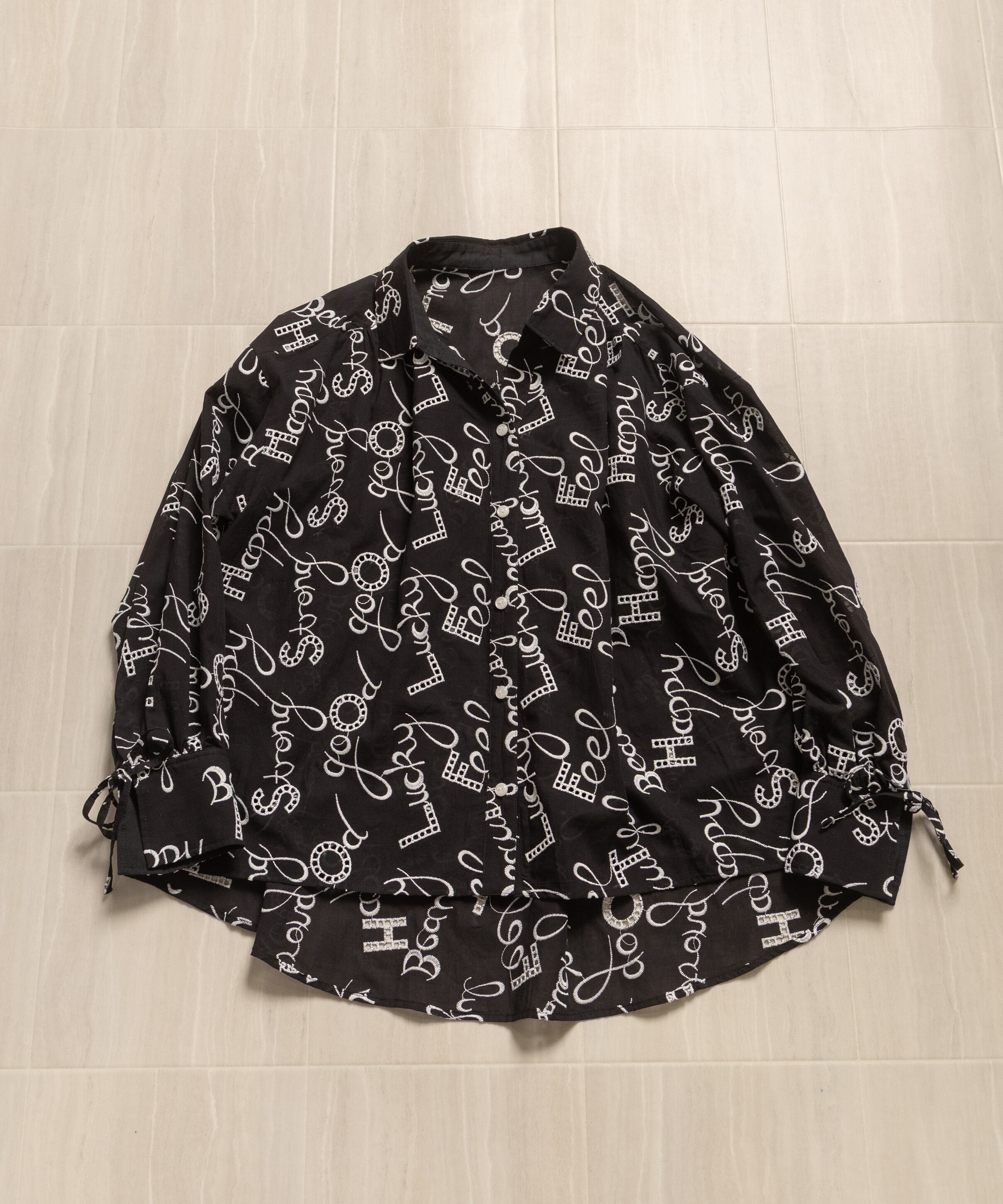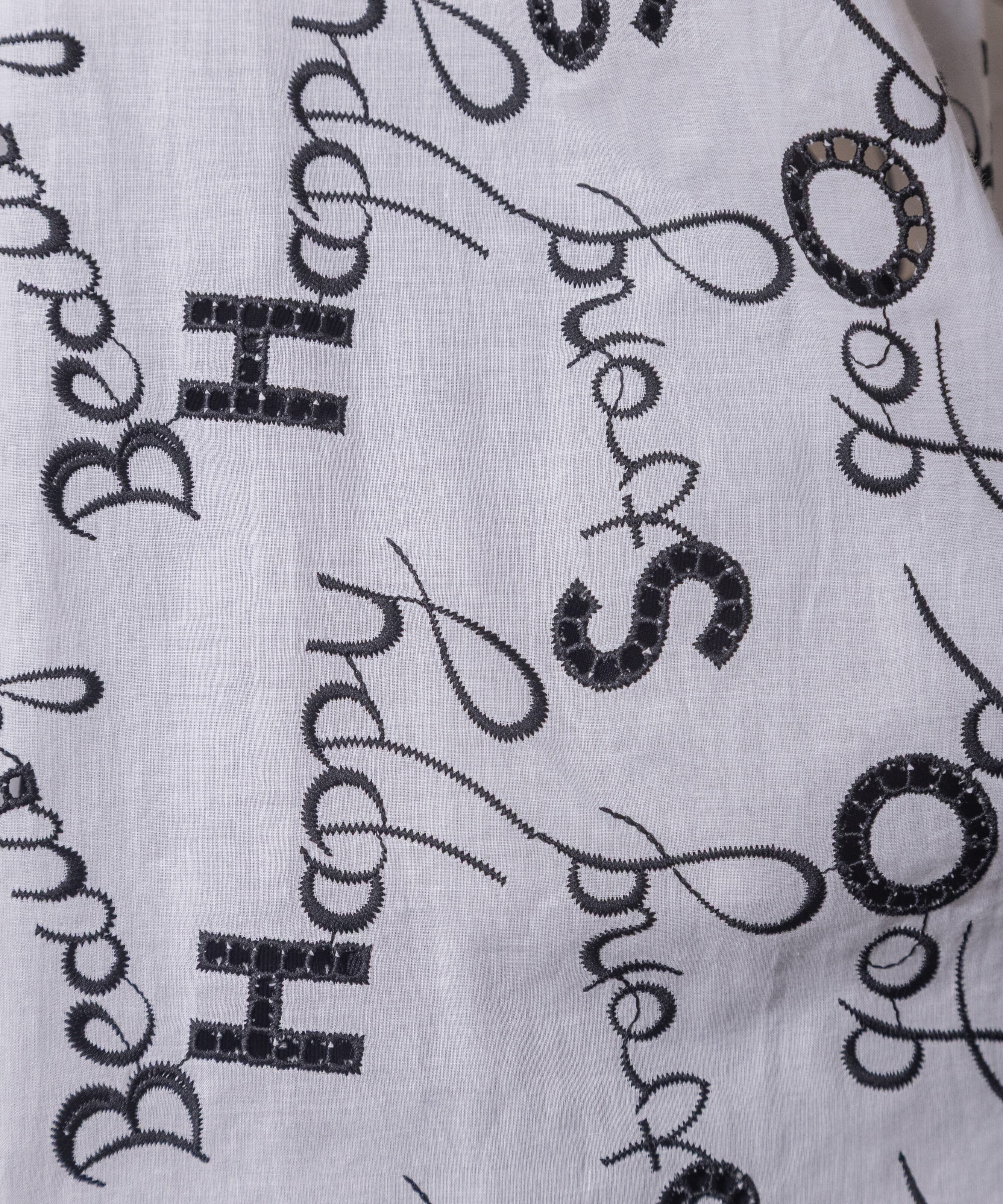 ロゴモチーフに細かく刺繍が施されたインポート生地を使用したオープンカラーシャツ。肩がキュッと入ったコンパクトショルダーにフレアシルエットがオシャレなバランス。袖口はリボン仕様で程よい甘さをプラス。