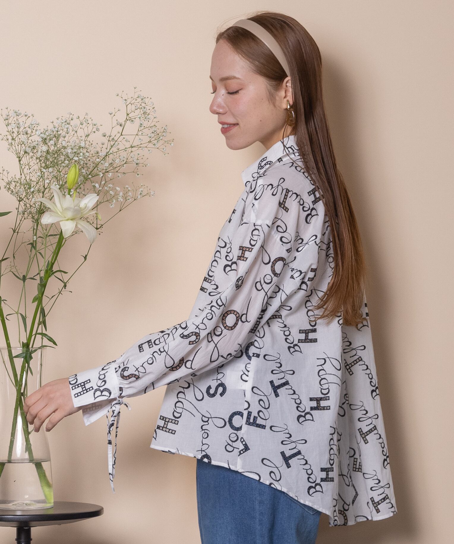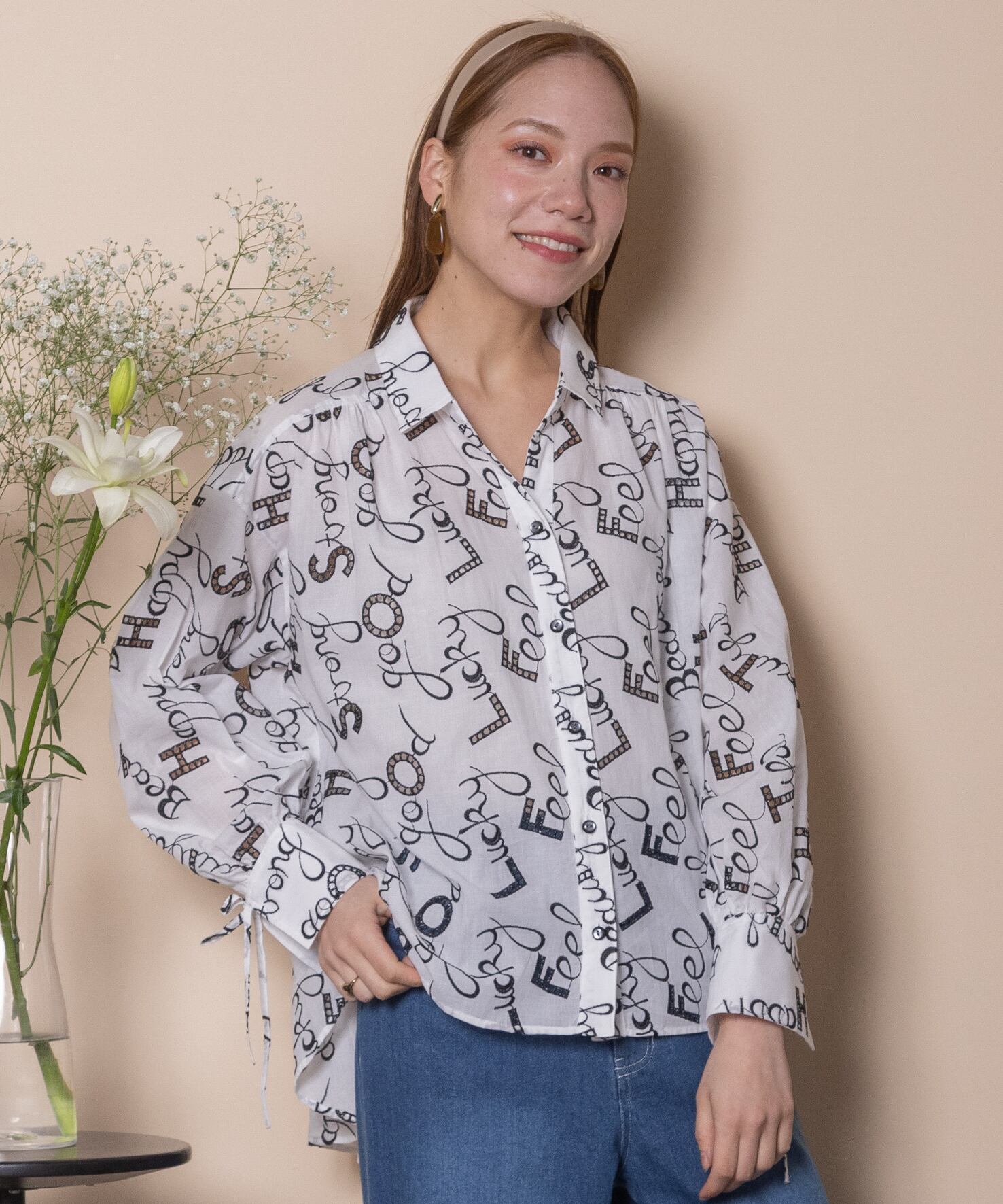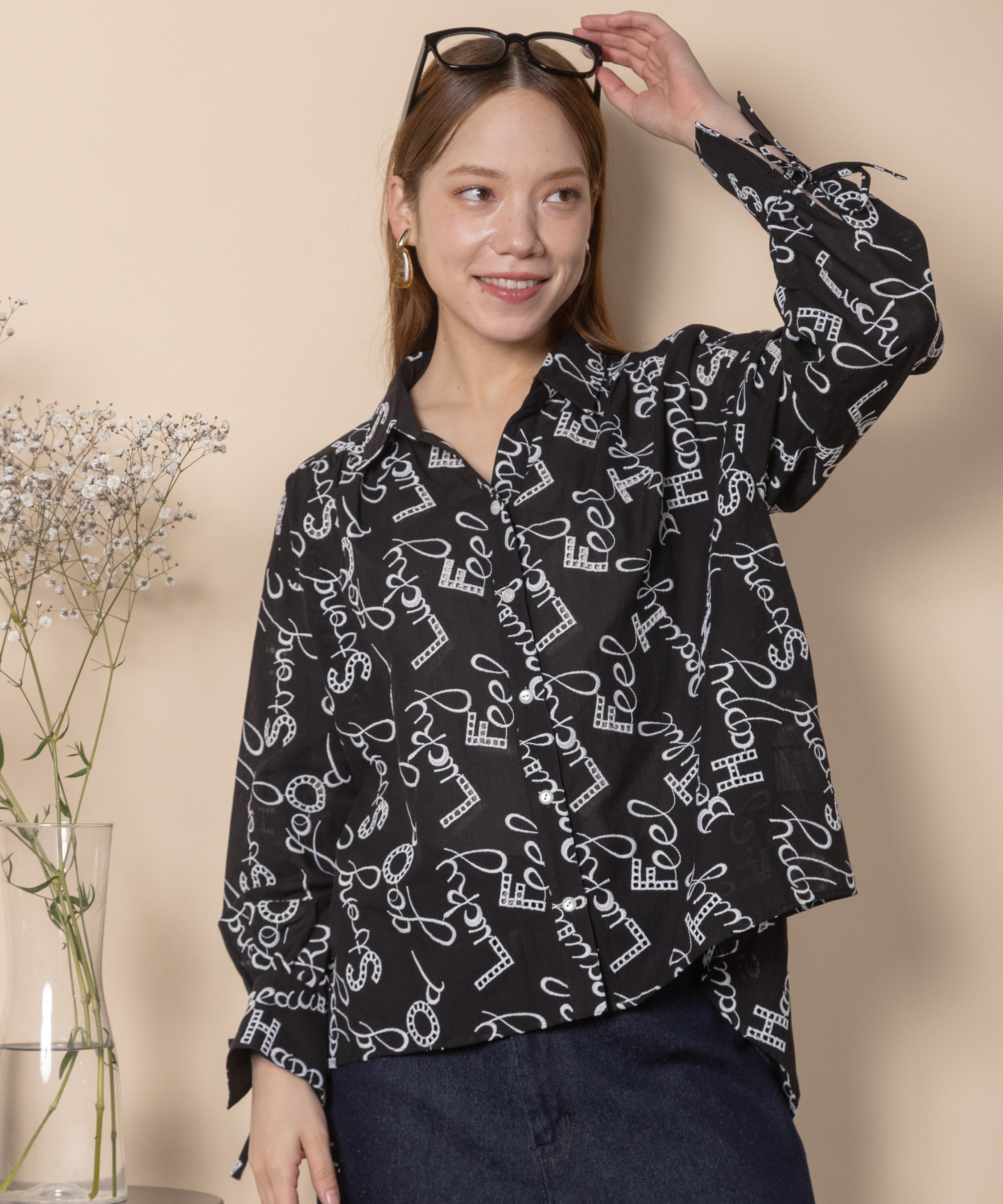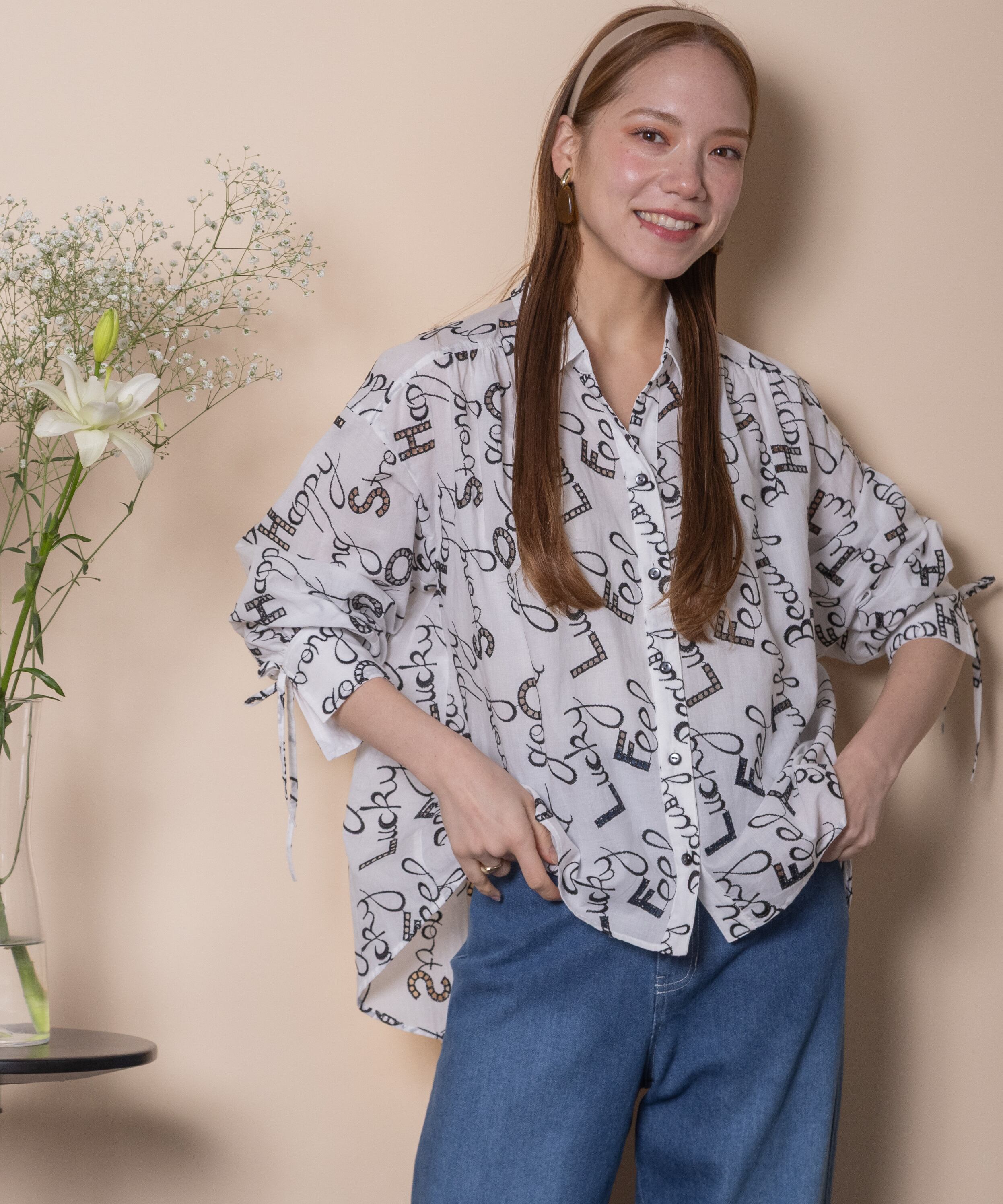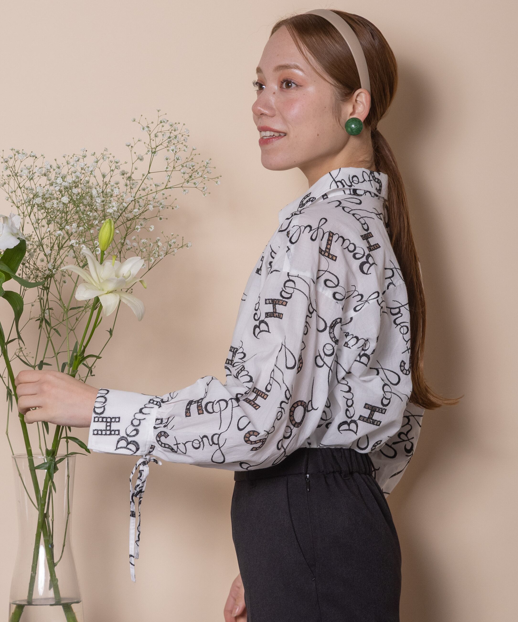ロゴモチーフに細かく刺繍が施されたインポート生地を使用したオープンカラーシャツ。肩がキュッと入ったコンパクトショルダーにフレアシルエットがオシャレなバランス。袖口はリボン仕様で程よい甘さをプラス。