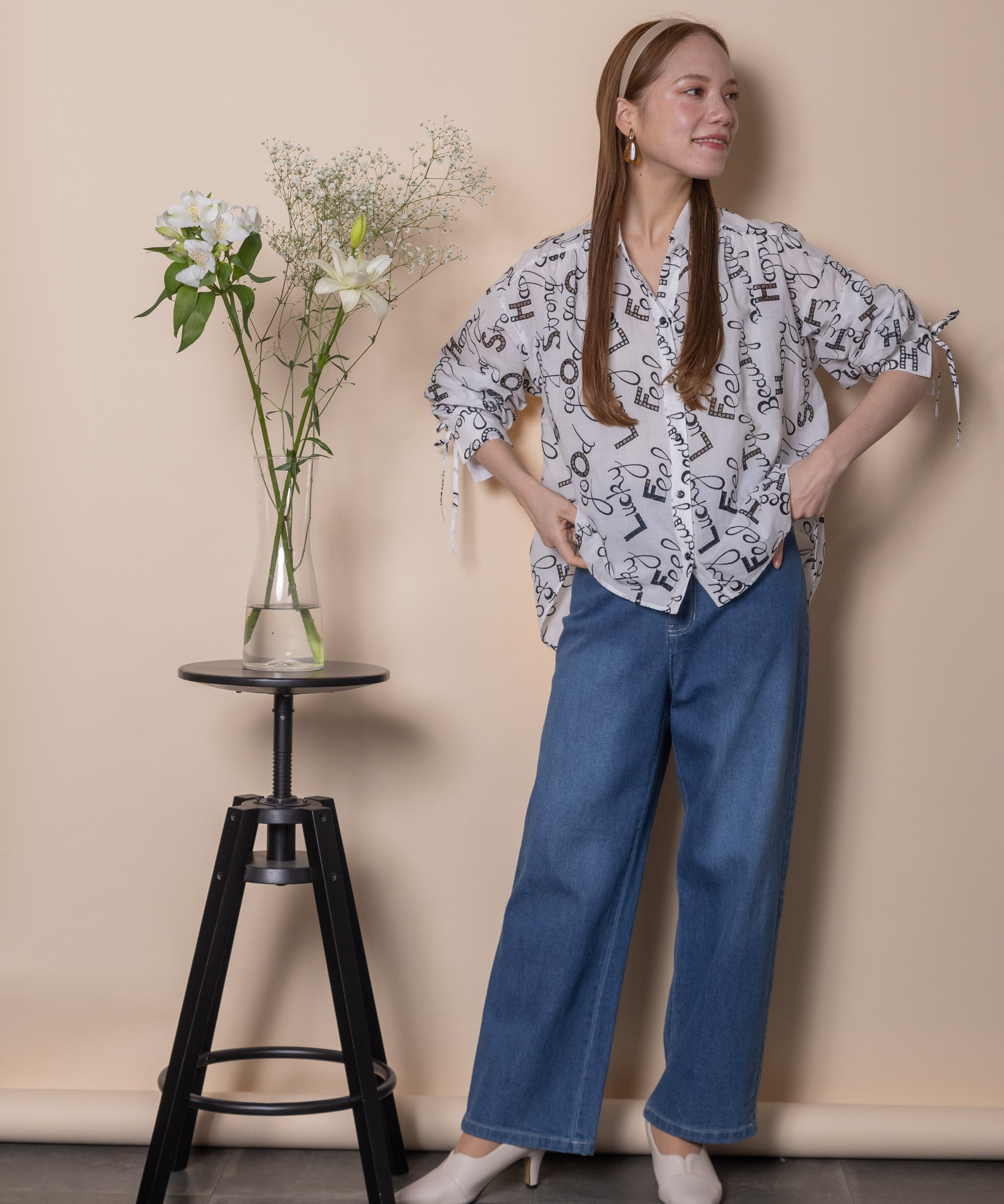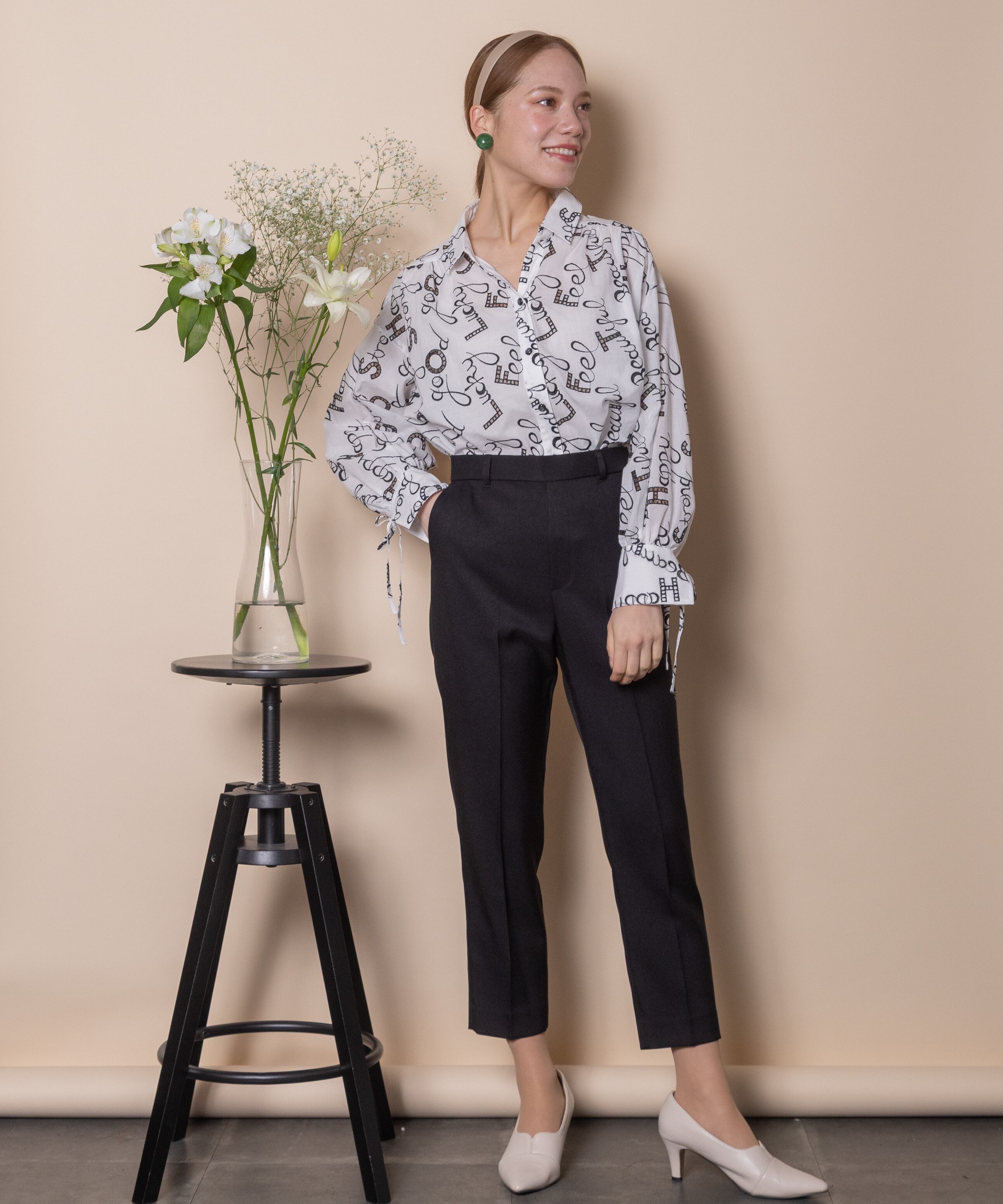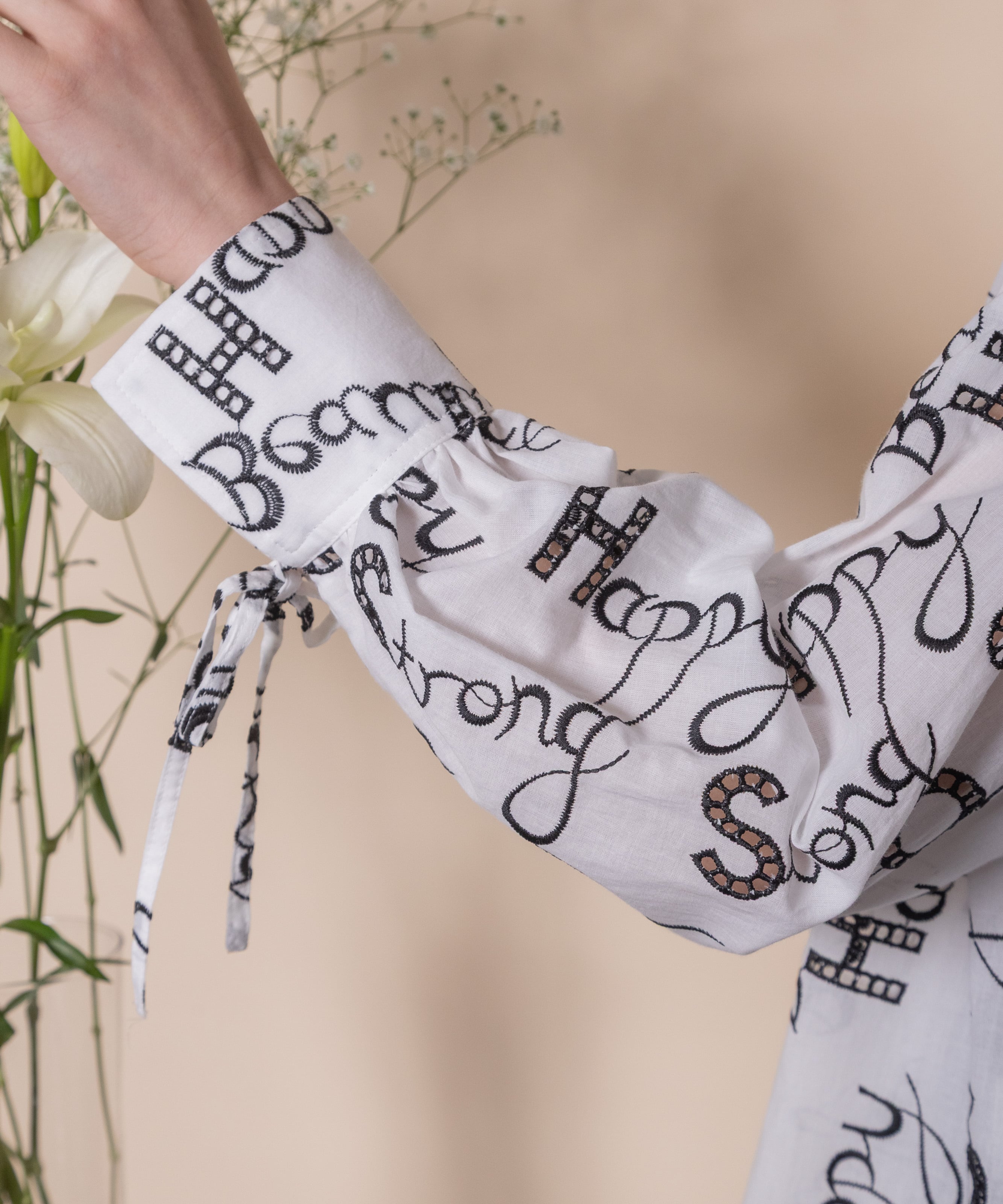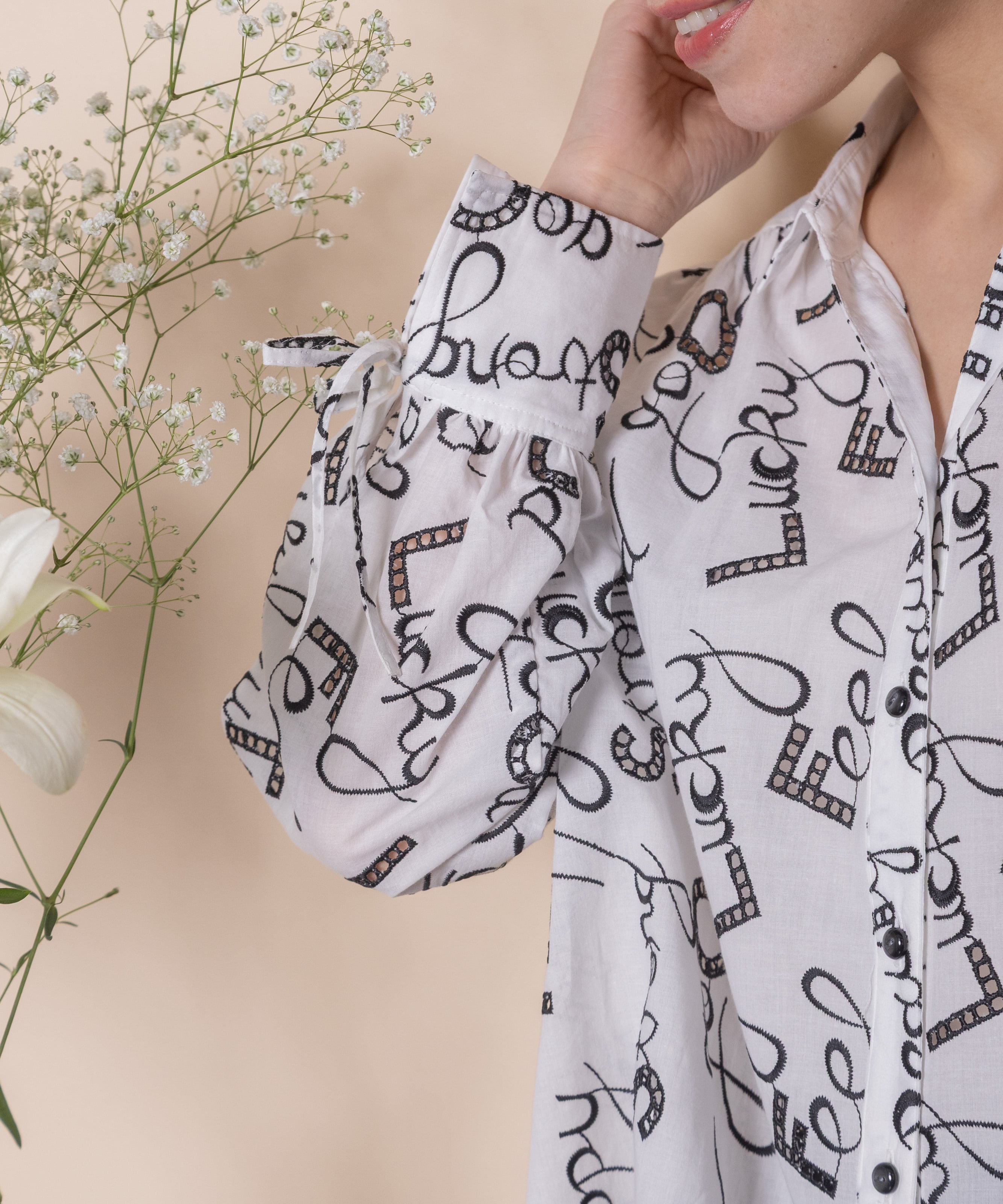 ロゴモチーフに細かく刺繍が施されたインポート生地を使用したオープンカラーシャツ。肩がキュッと入ったコンパクトショルダーにフレアシルエットがオシャレなバランス。袖口はリボン仕様で程よい甘さをプラス。