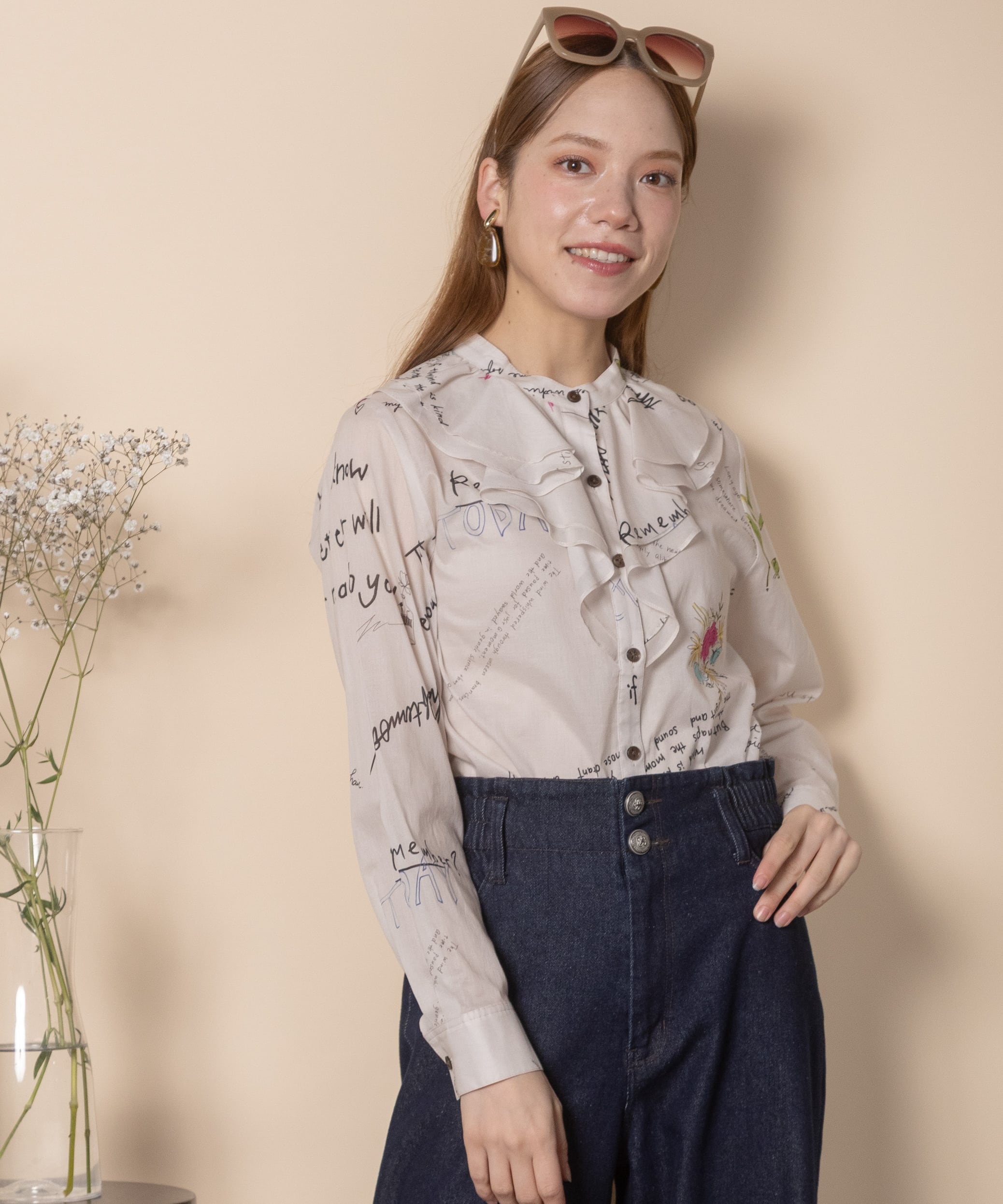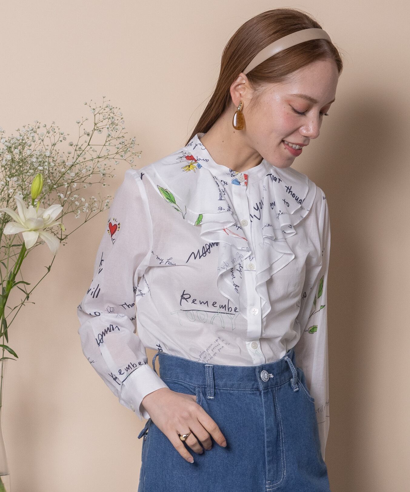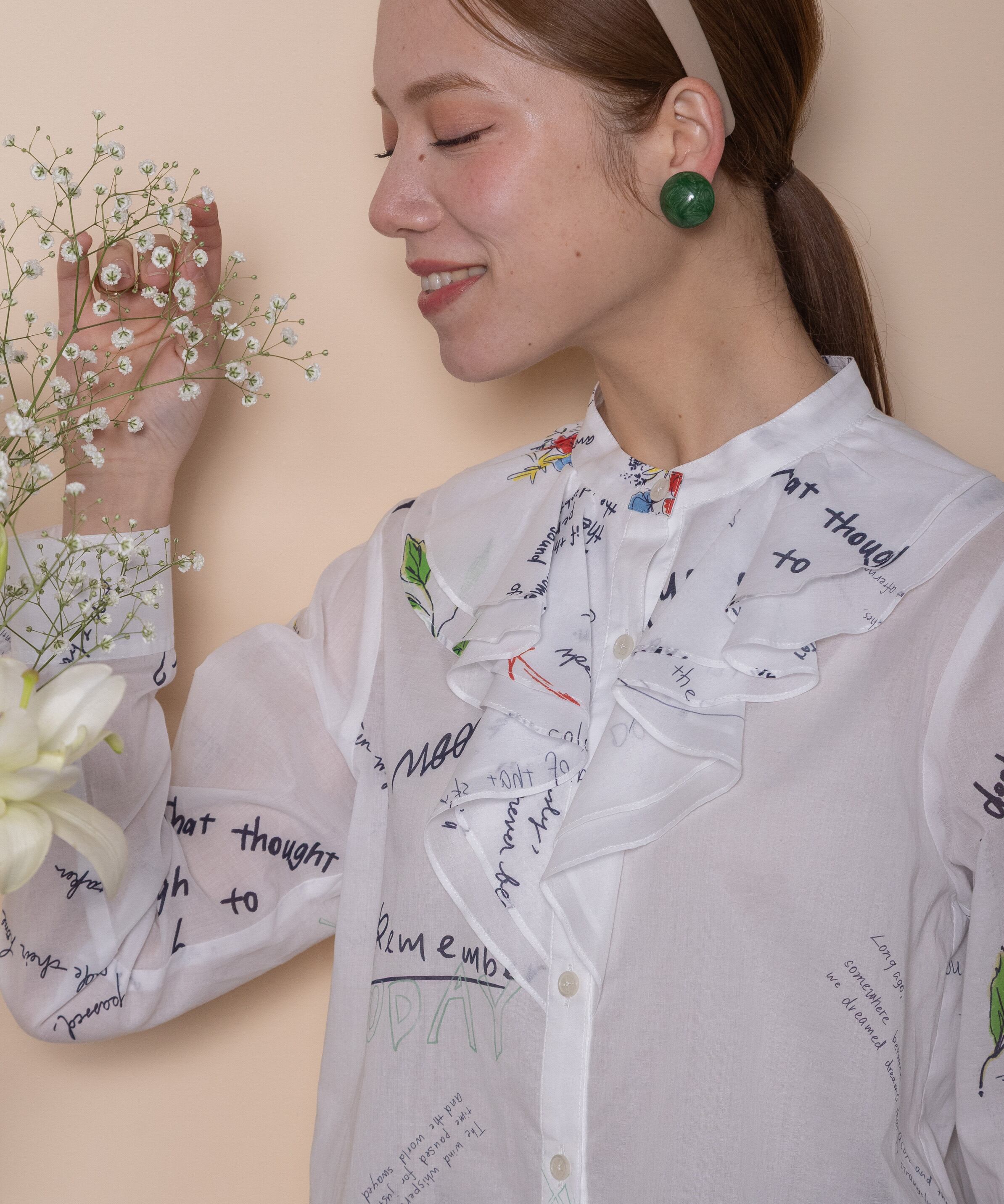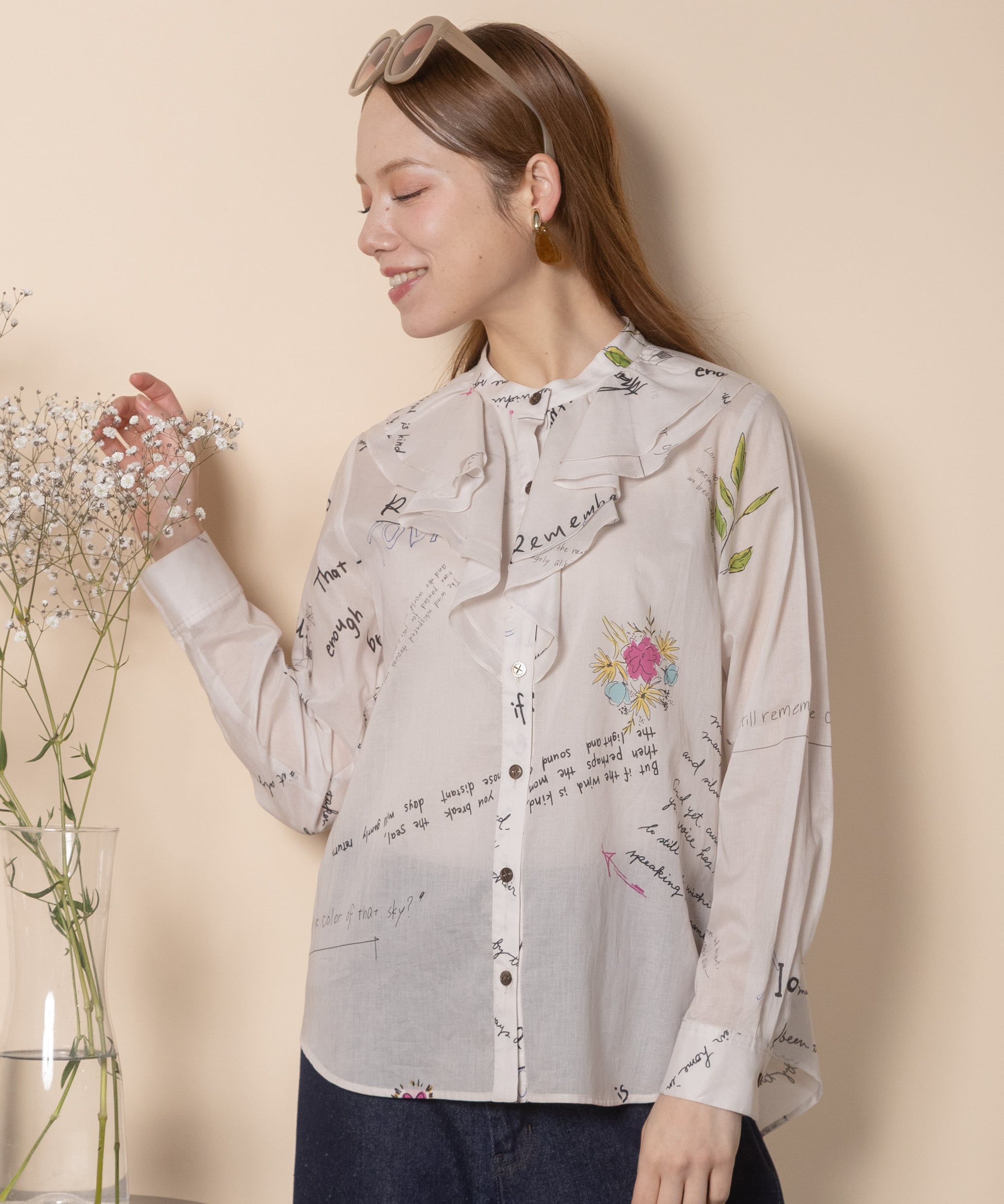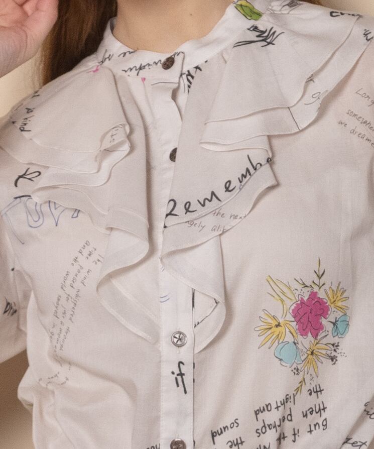 手書き風プリントのインポート生地を使用したデザインシャツ。甘さが魅力のラッフルフリルに肩がキュッと入ったコンパクトショルダーがオシャレなアイテム。