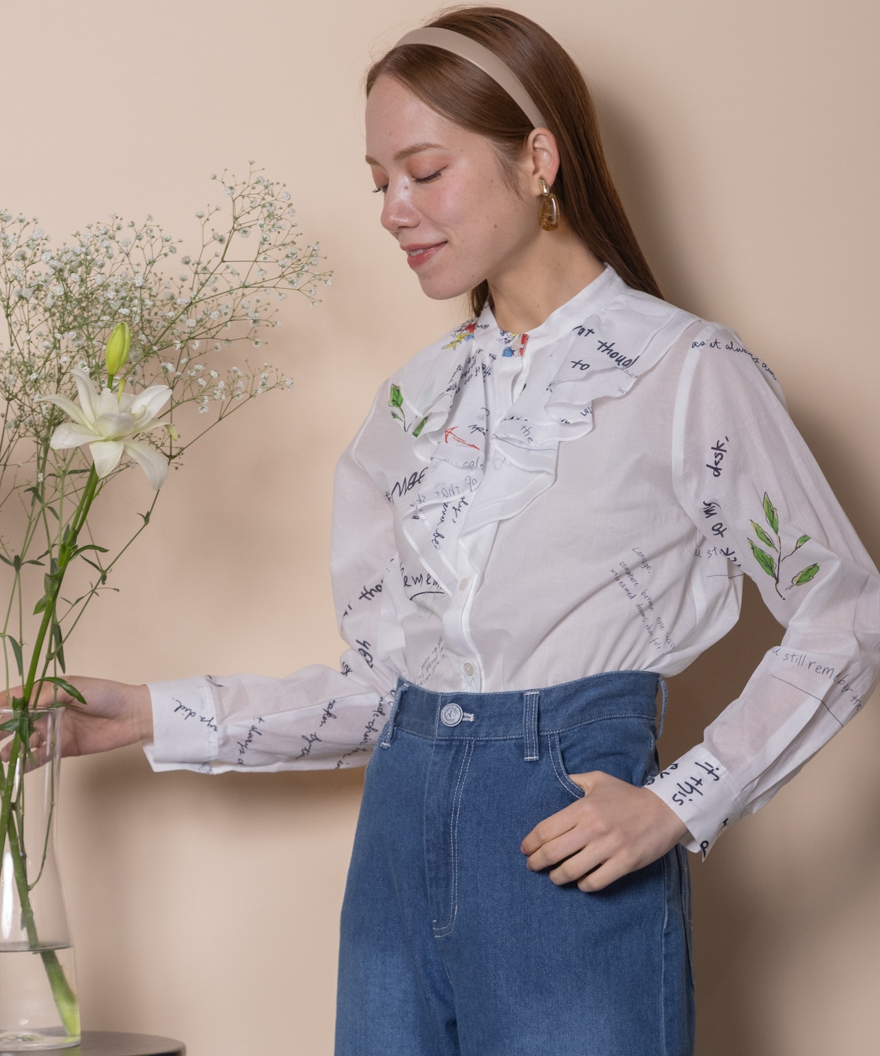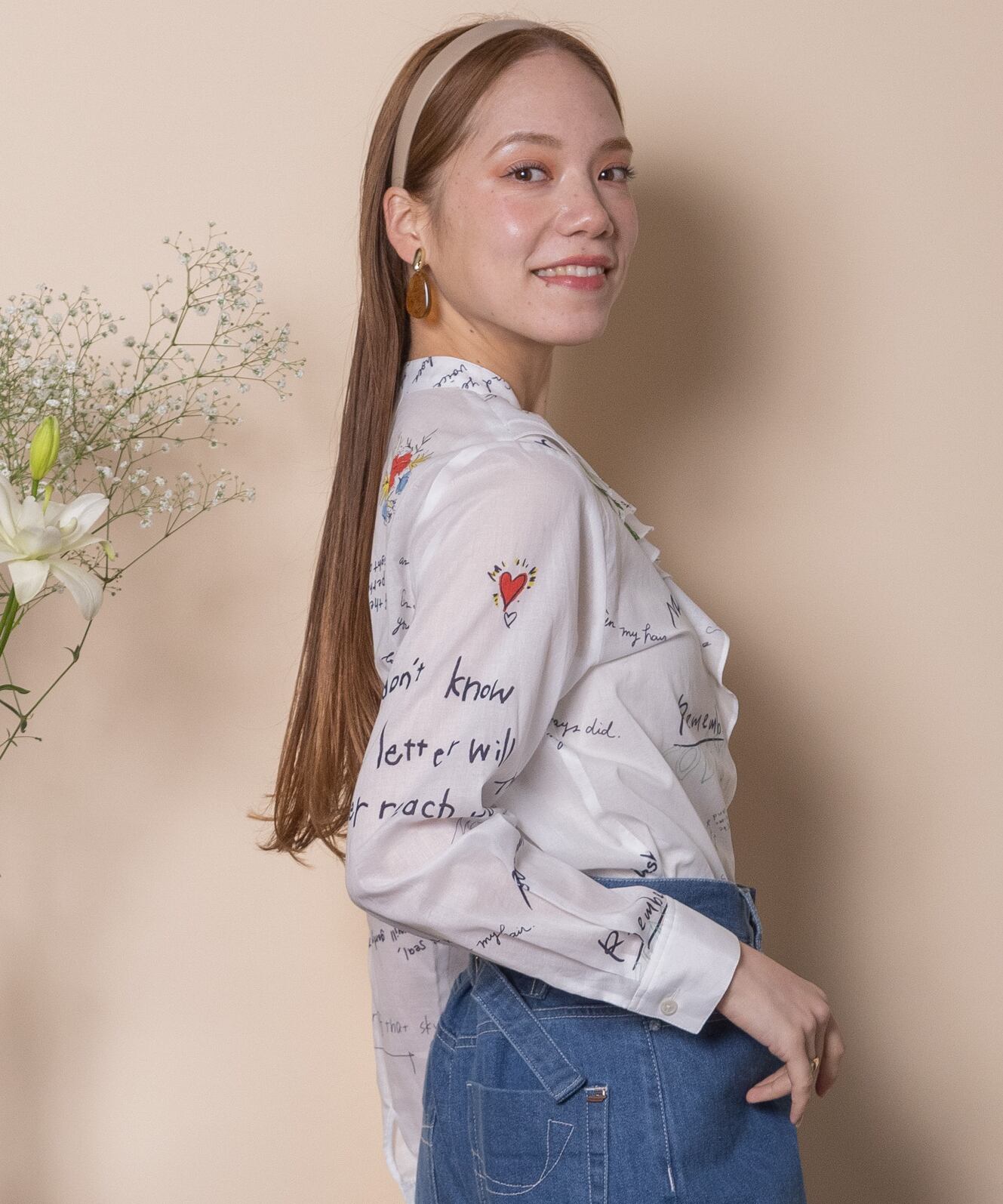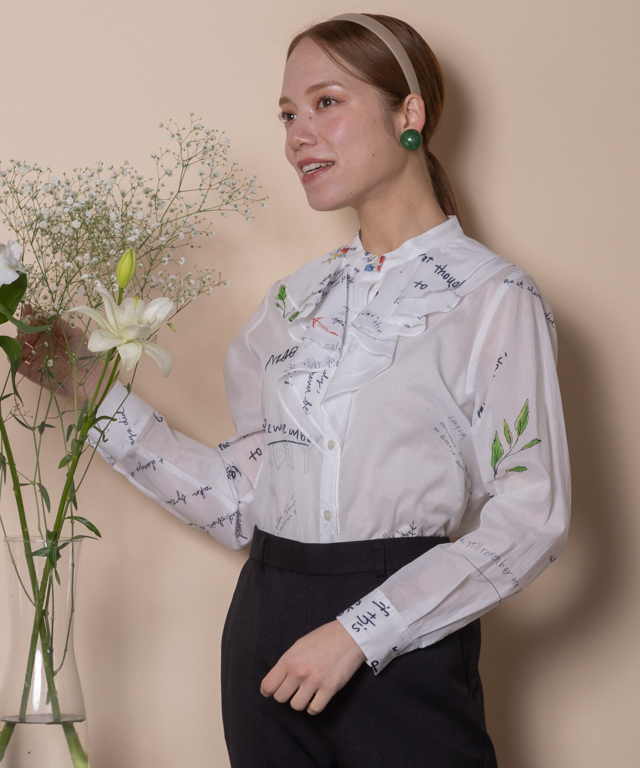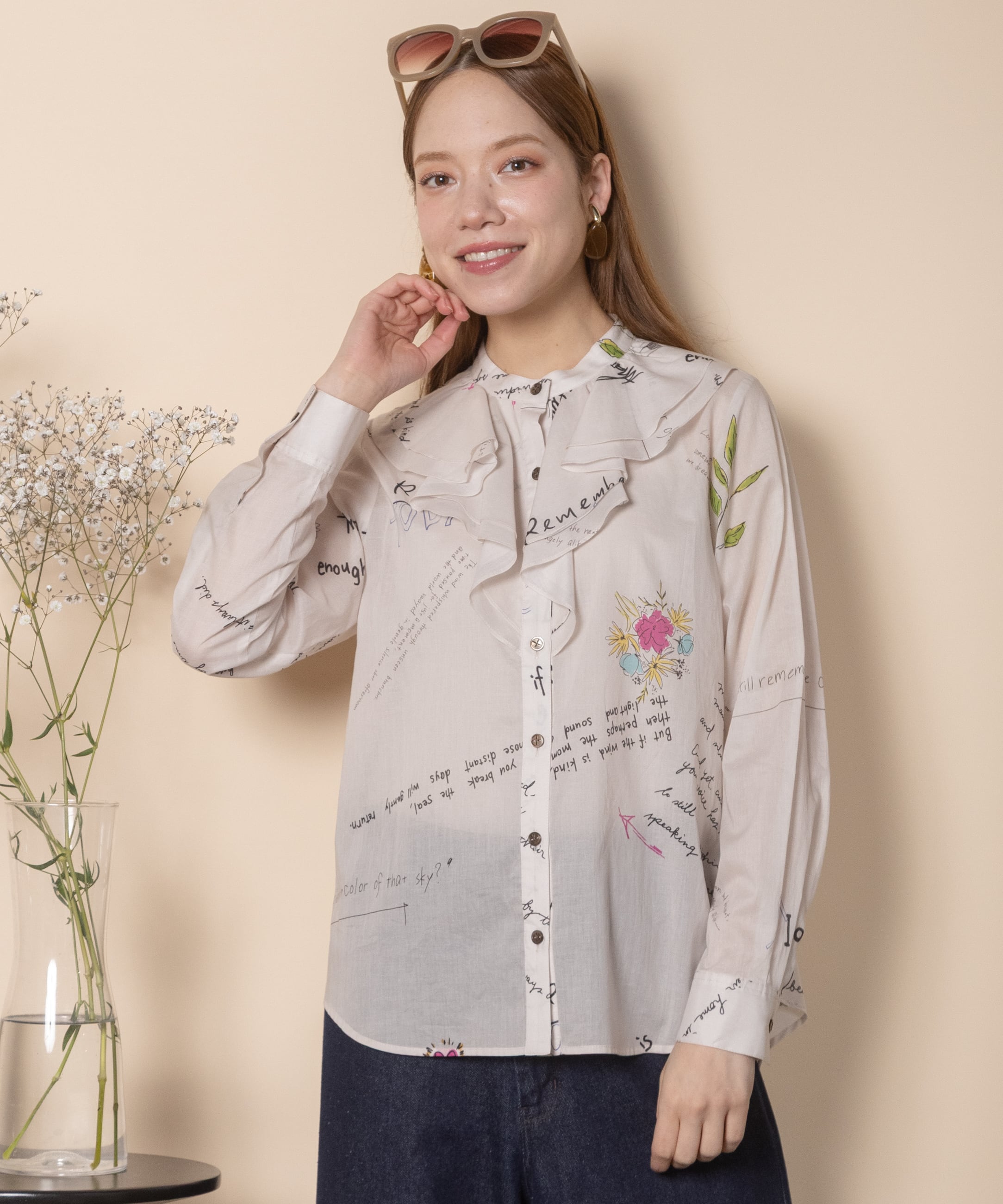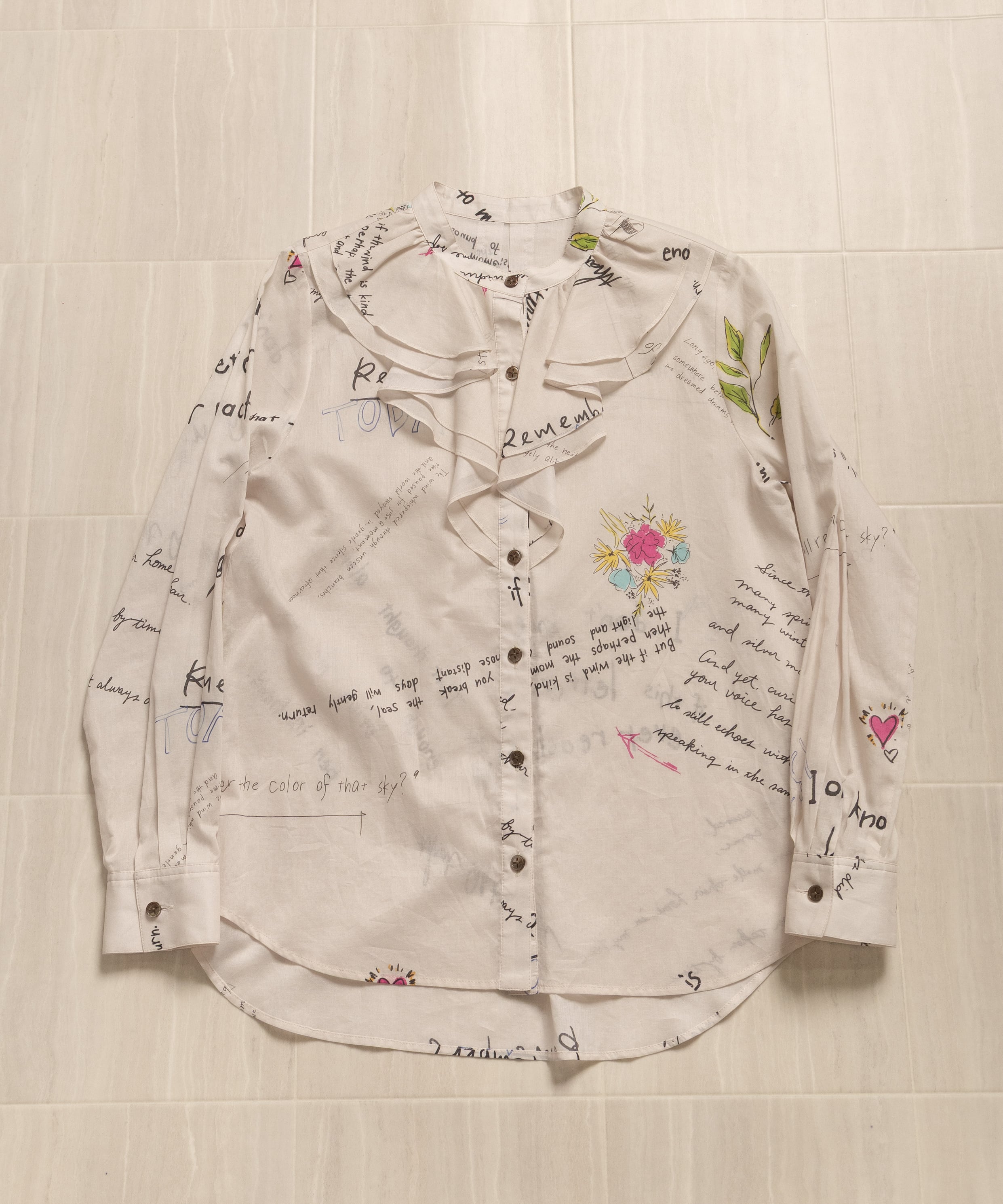 手書き風プリントのインポート生地を使用したデザインシャツ。甘さが魅力のラッフルフリルに肩がキュッと入ったコンパクトショルダーがオシャレなアイテム。