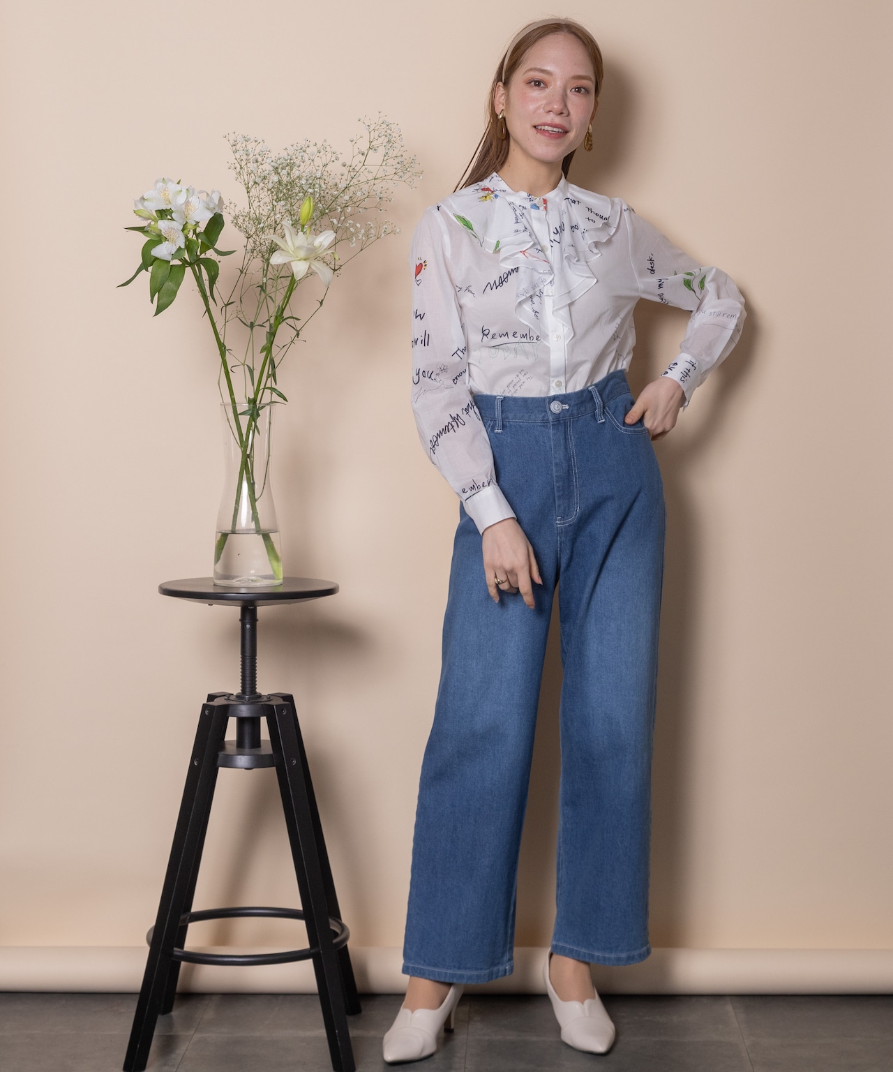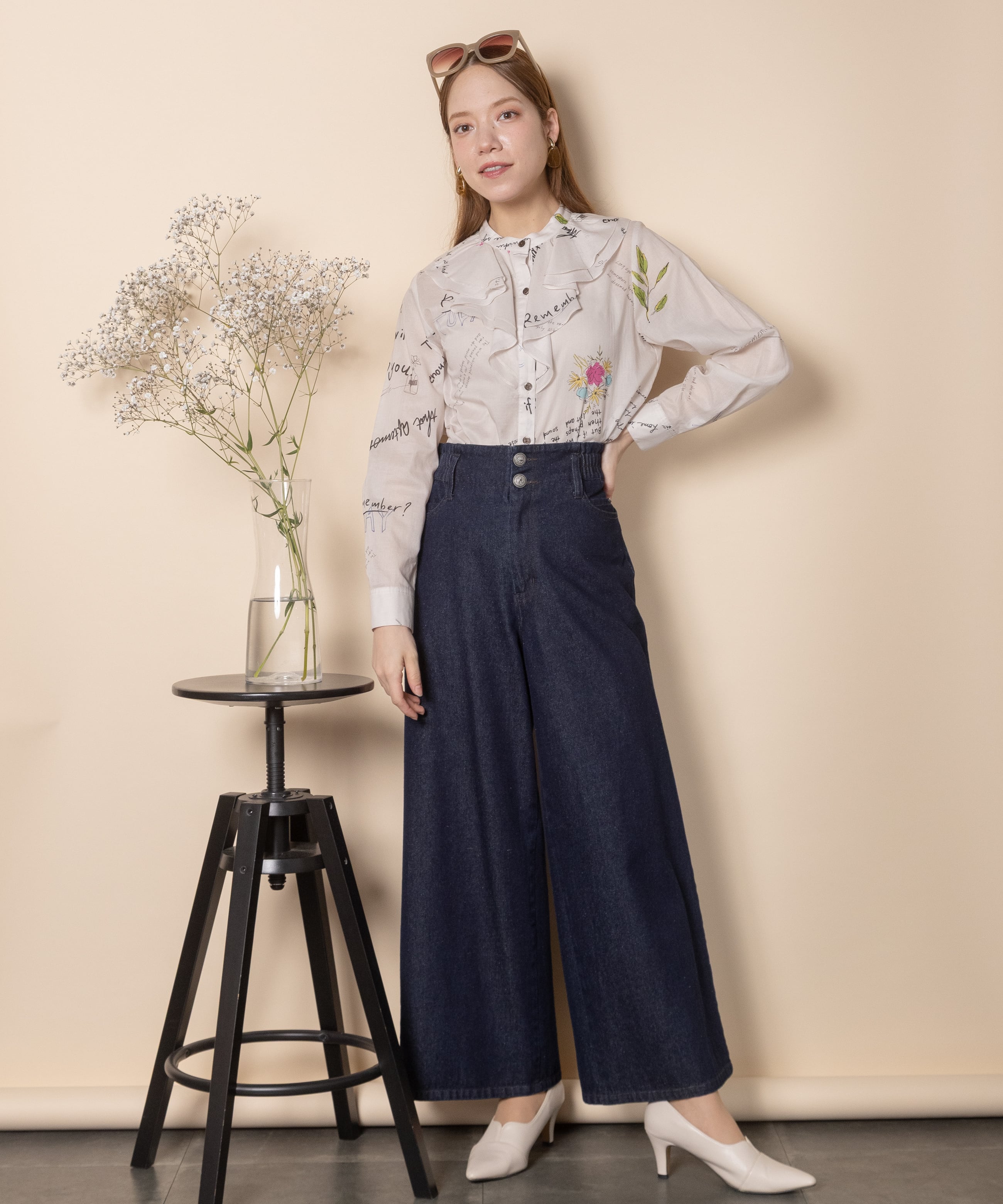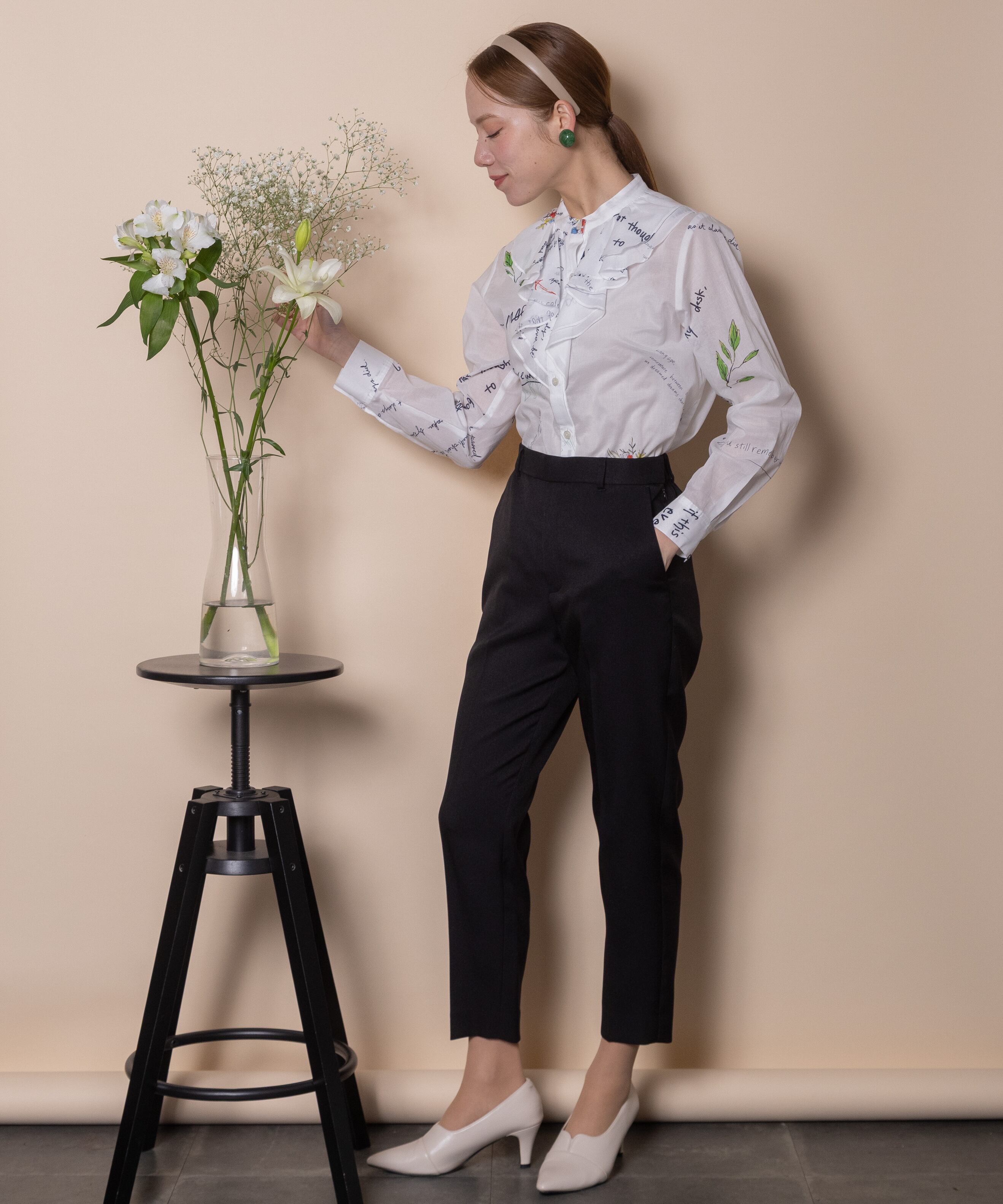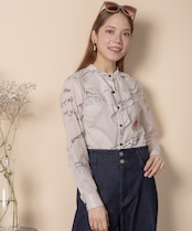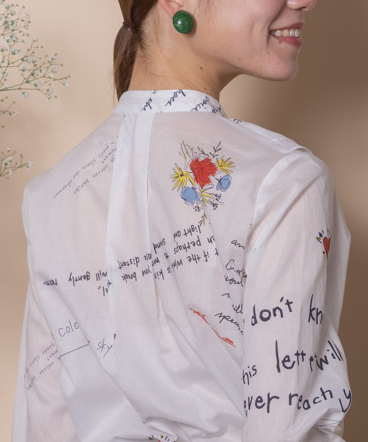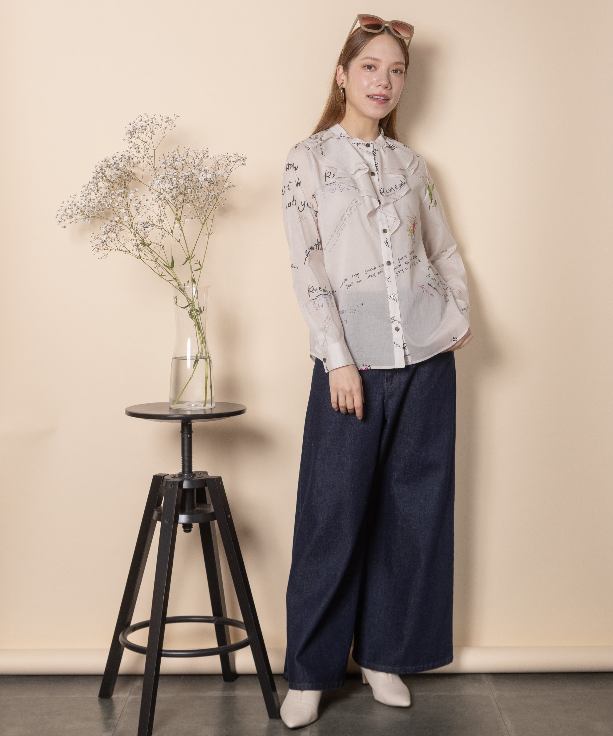 手書き風プリントのインポート生地を使用したデザインシャツ。甘さが魅力のラッフルフリルに肩がキュッと入ったコンパクトショルダーがオシャレなアイテム。