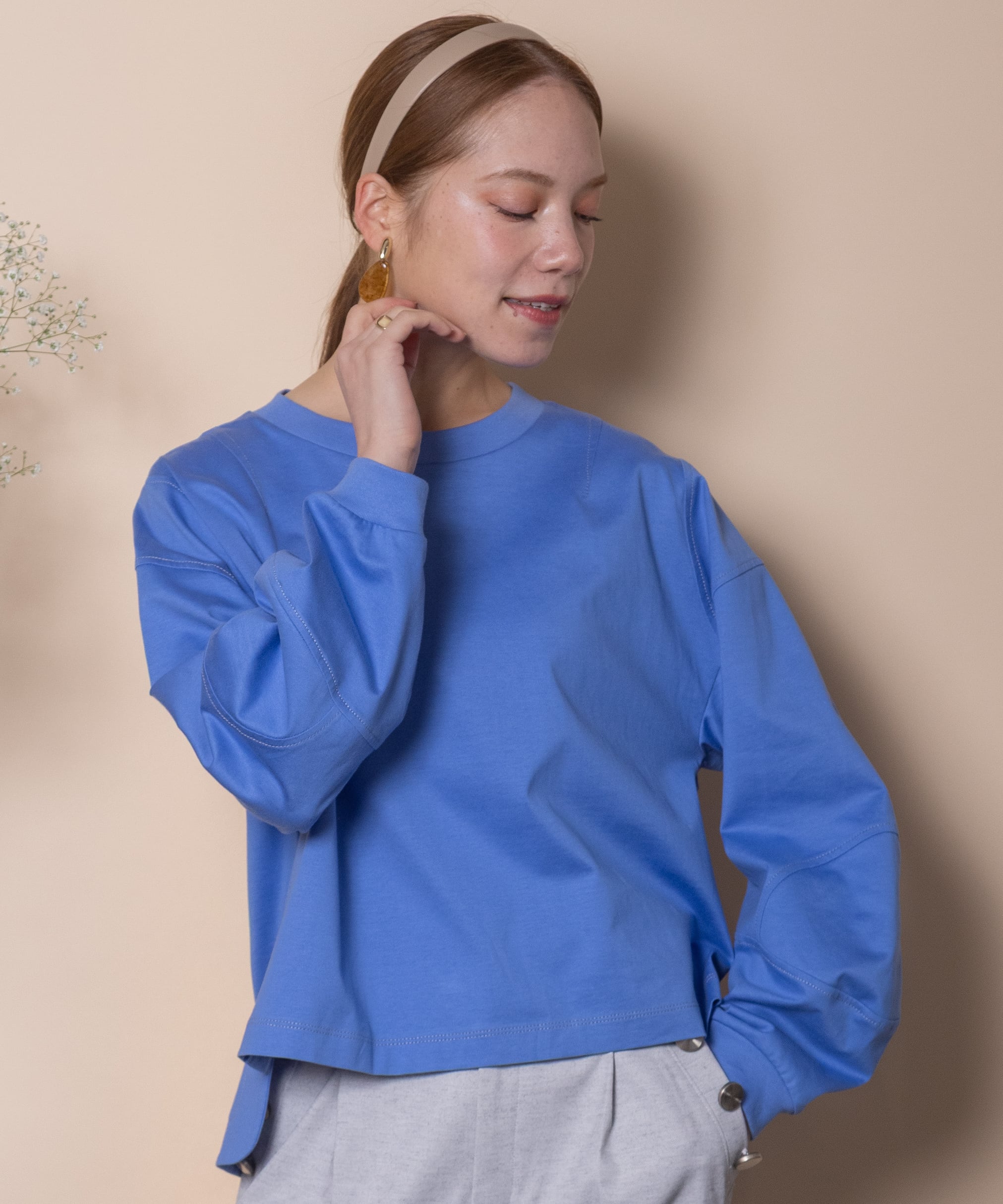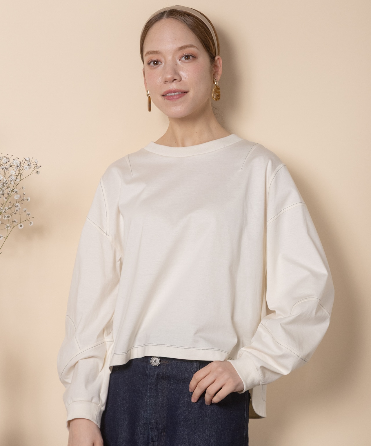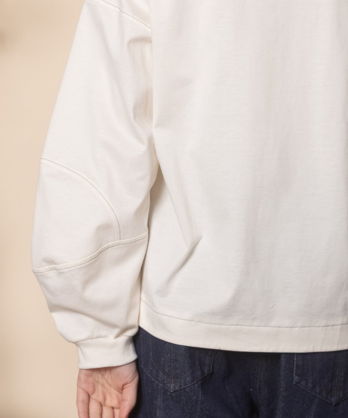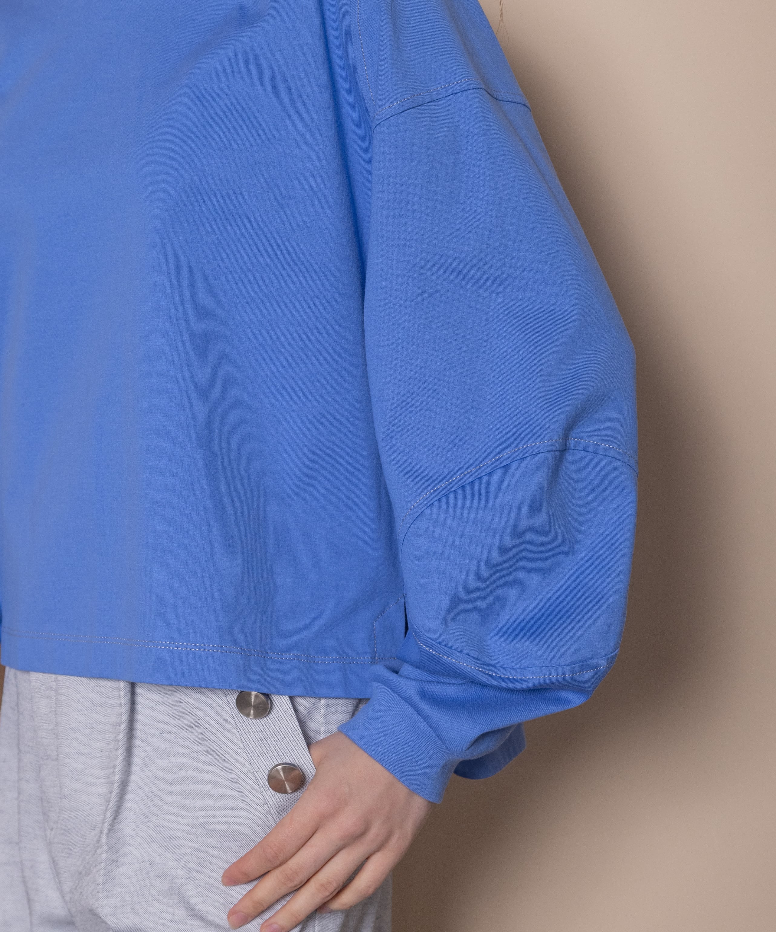 シンプルながらも1枚で主役級のこだわりデザイントップス。全体的に配色ステッチが効いており、肘の部分が立体的なデザイン。トレンドのショート丈にボックスシルエット。