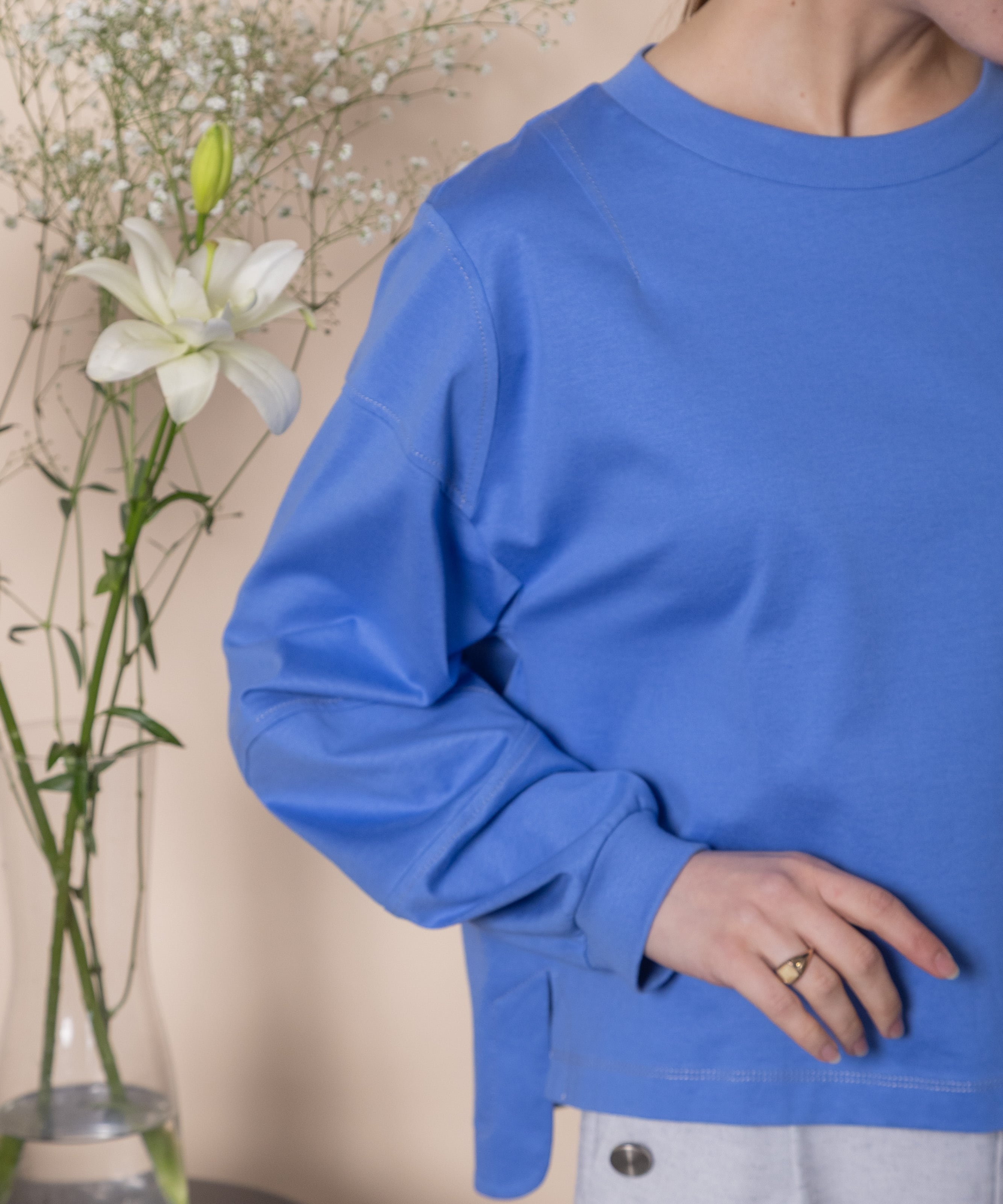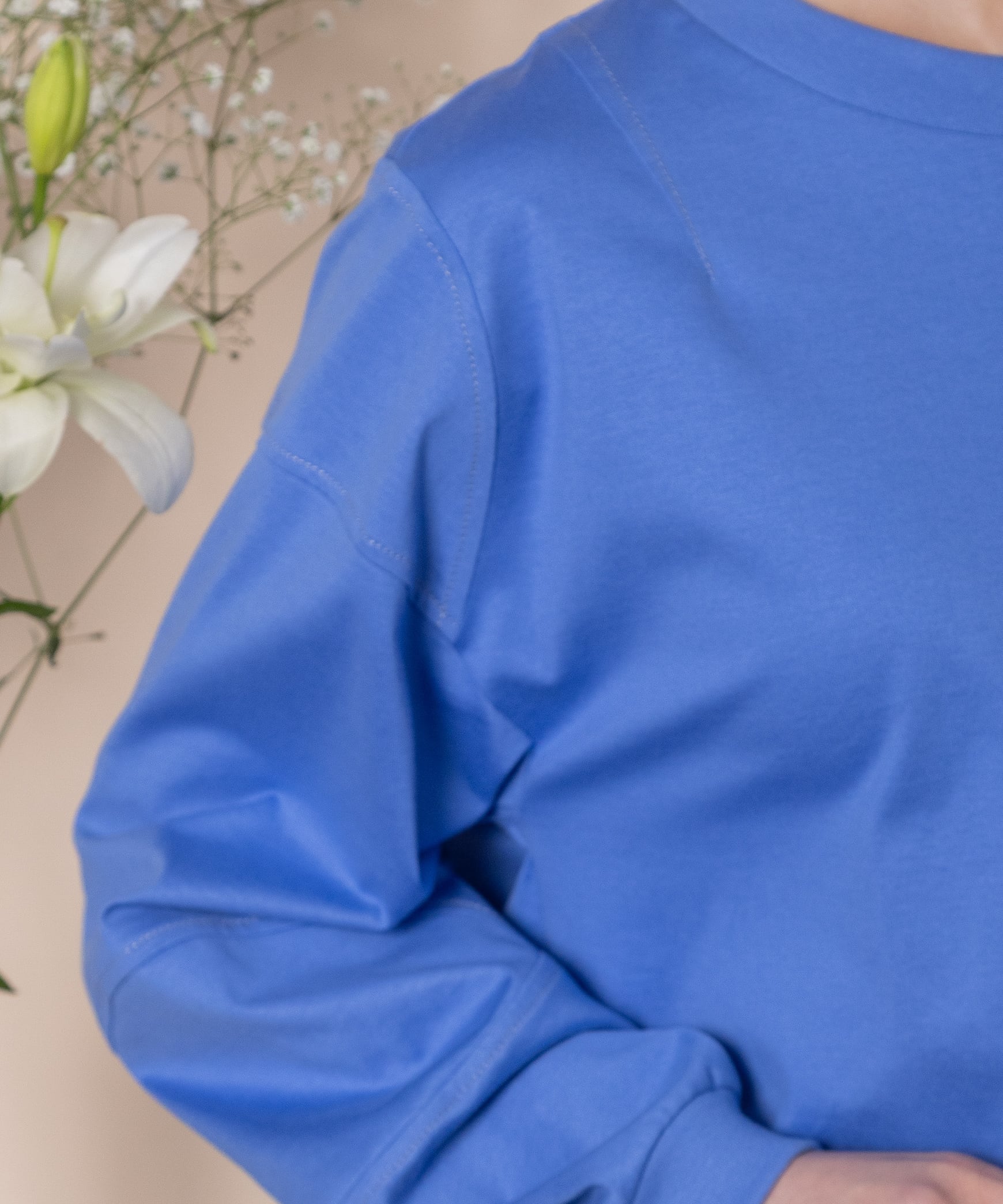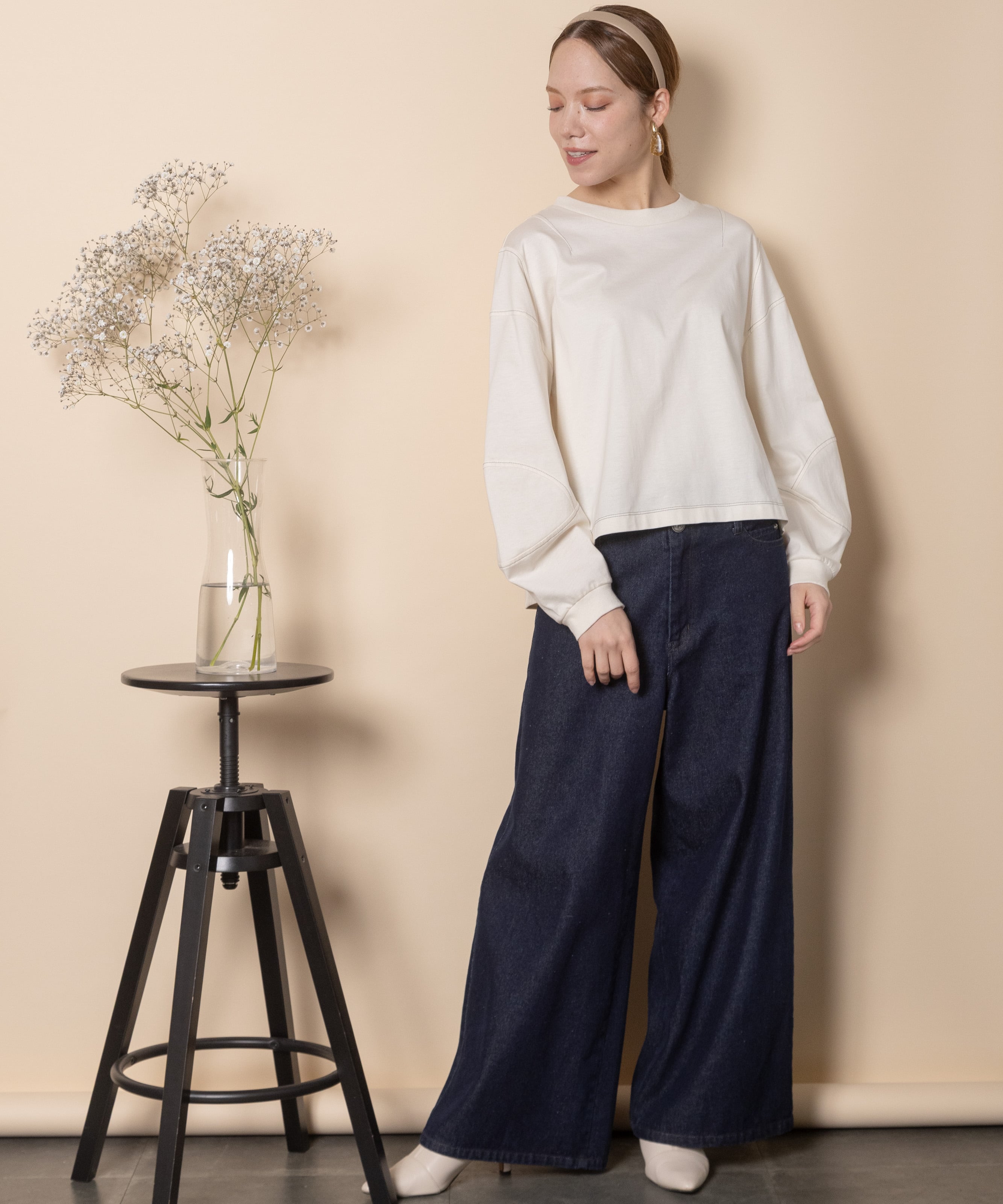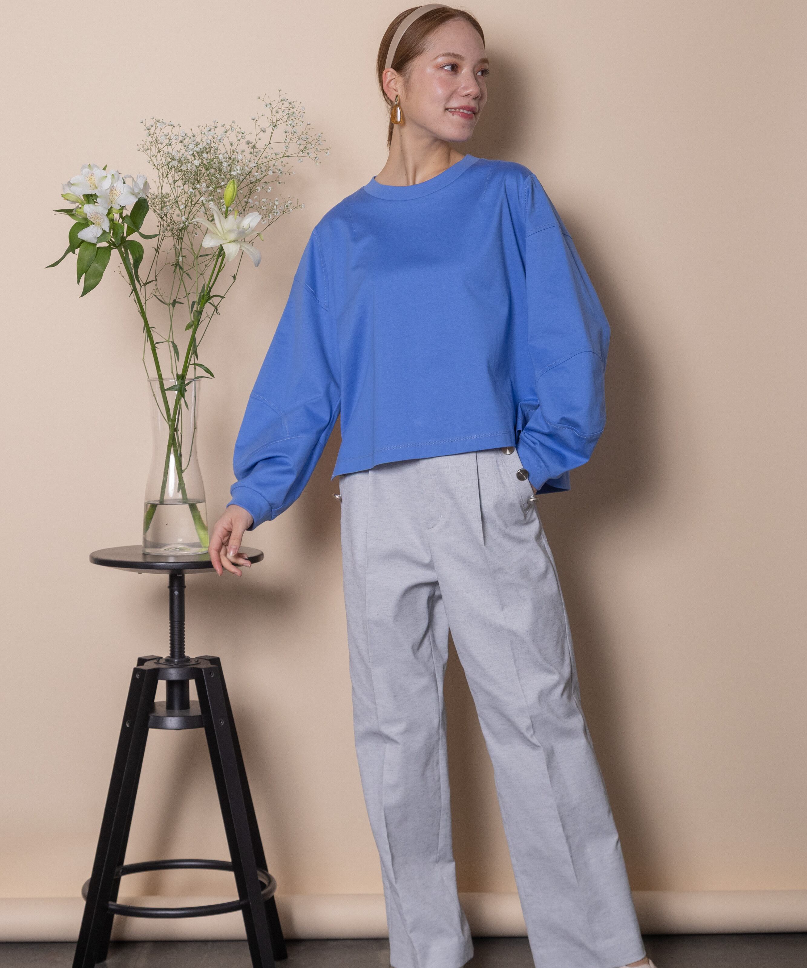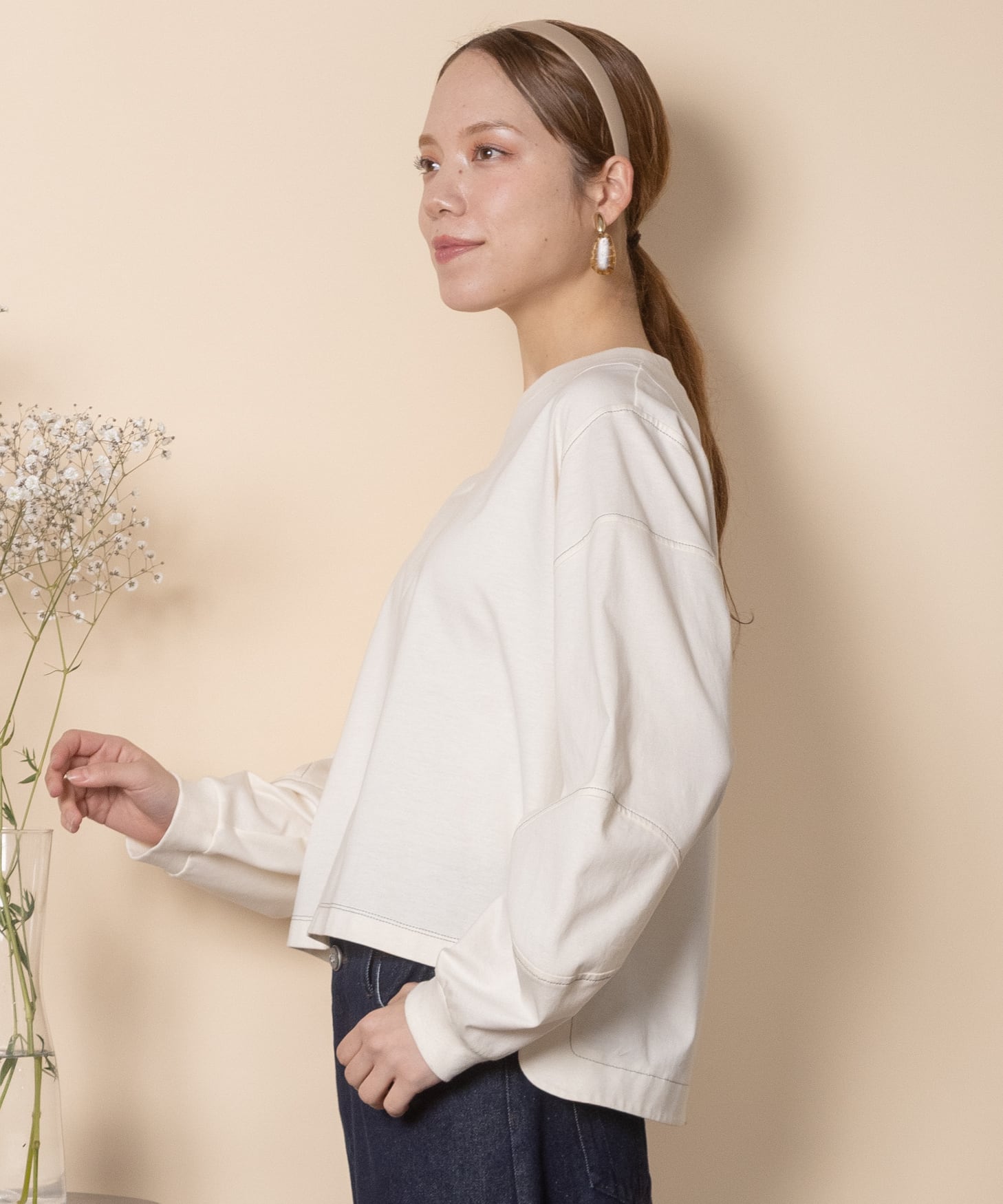 シンプルながらも1枚で主役級のこだわりデザイントップス。全体的に配色ステッチが効いており、肘の部分が立体的なデザイン。トレンドのショート丈にボックスシルエット。