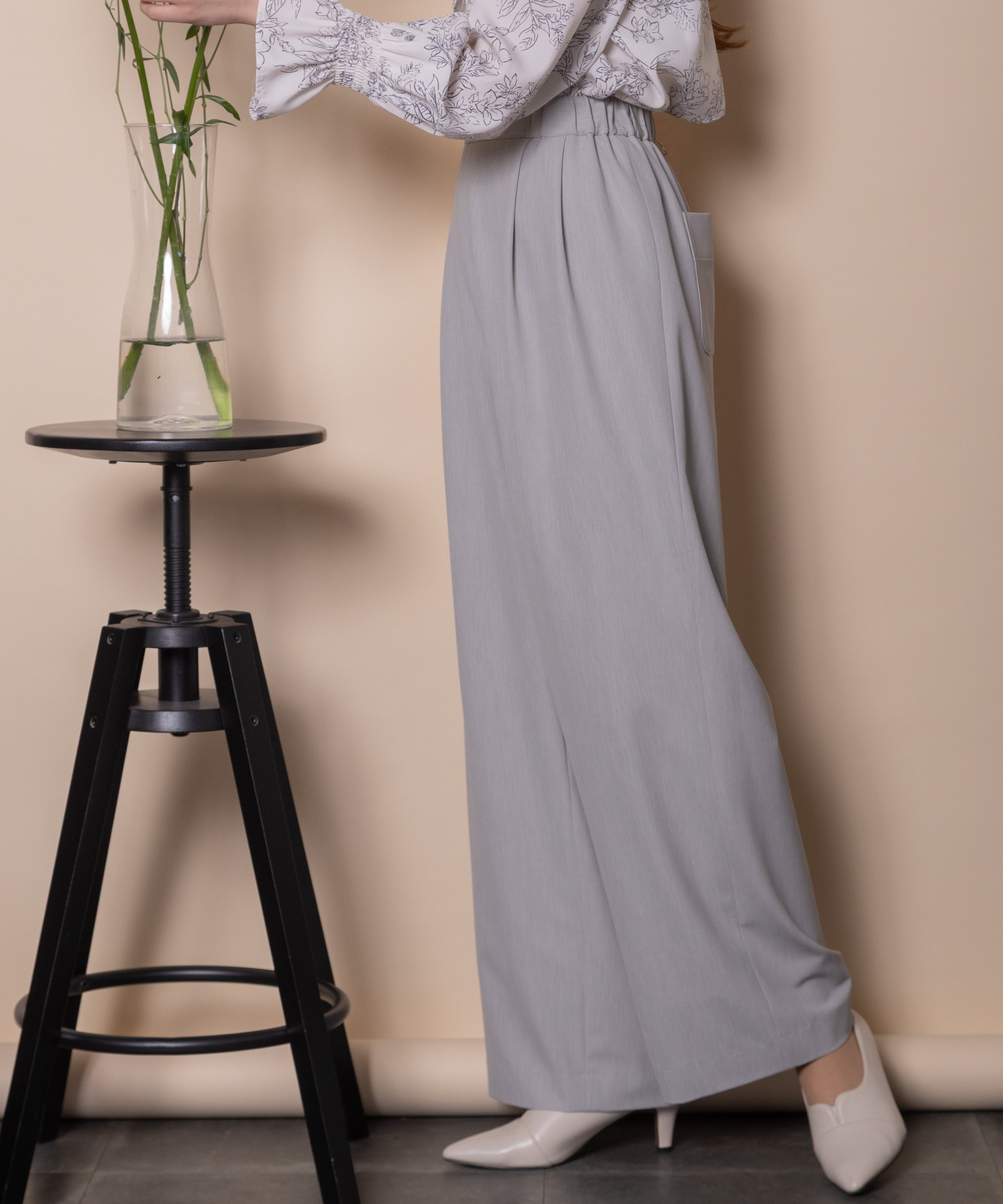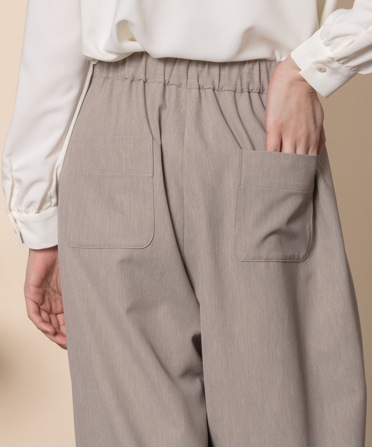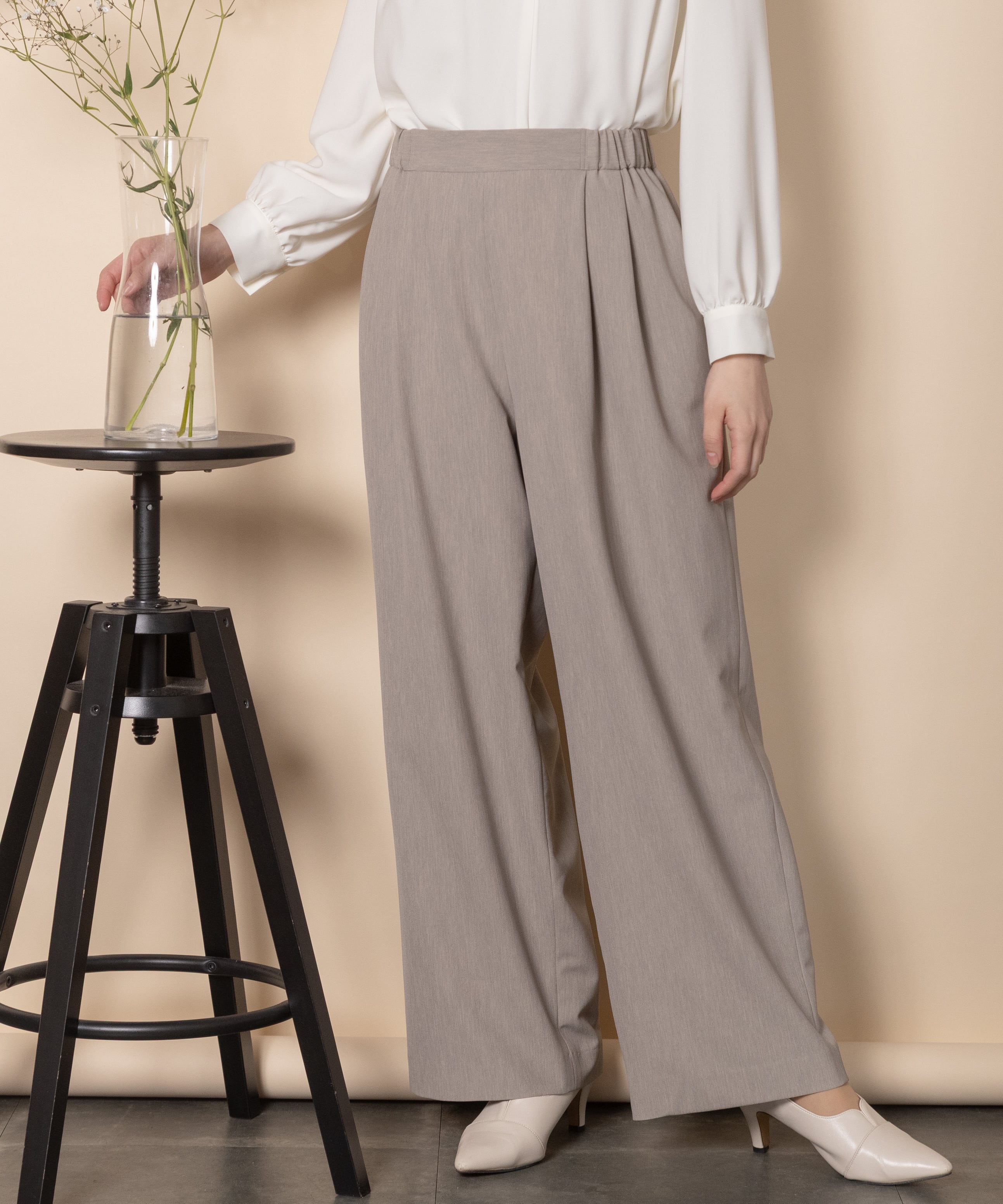 キレイめボトムの定番ワイドイージーパンツ。一枚あると重宝するキレイめのワイドイージーパンツ。ウエストはバックゴム仕様でリラックス感のあるワイドフレアシルエット。マニッシュにクールに決まります。