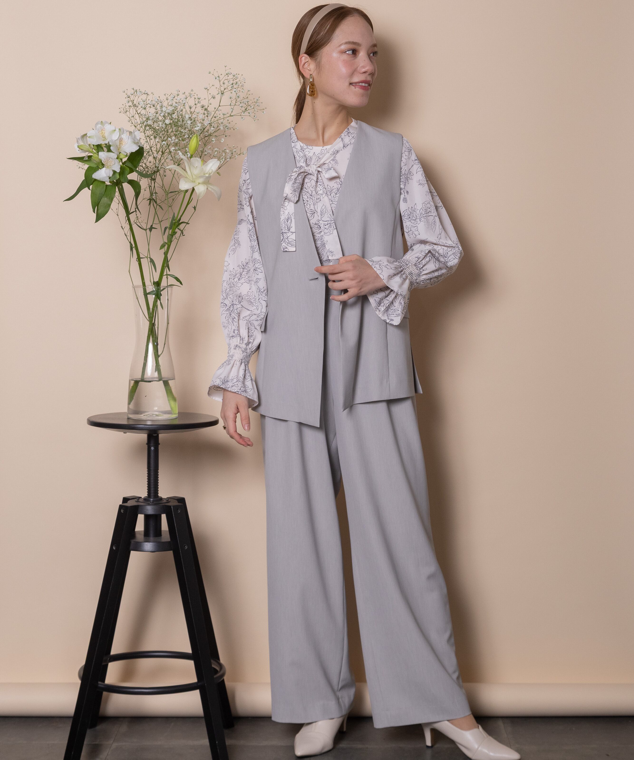 セレモニーシーンやオフィスシーンなどきちんとしたシーンで大活躍するセットアイテム。インには綺麗めのブラウスがおすすめ。