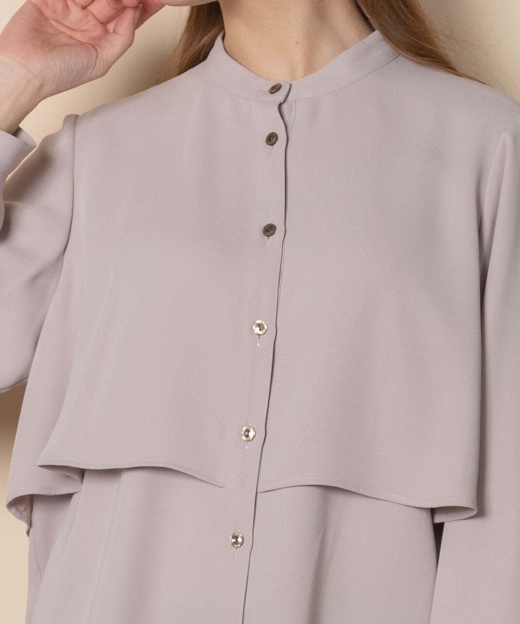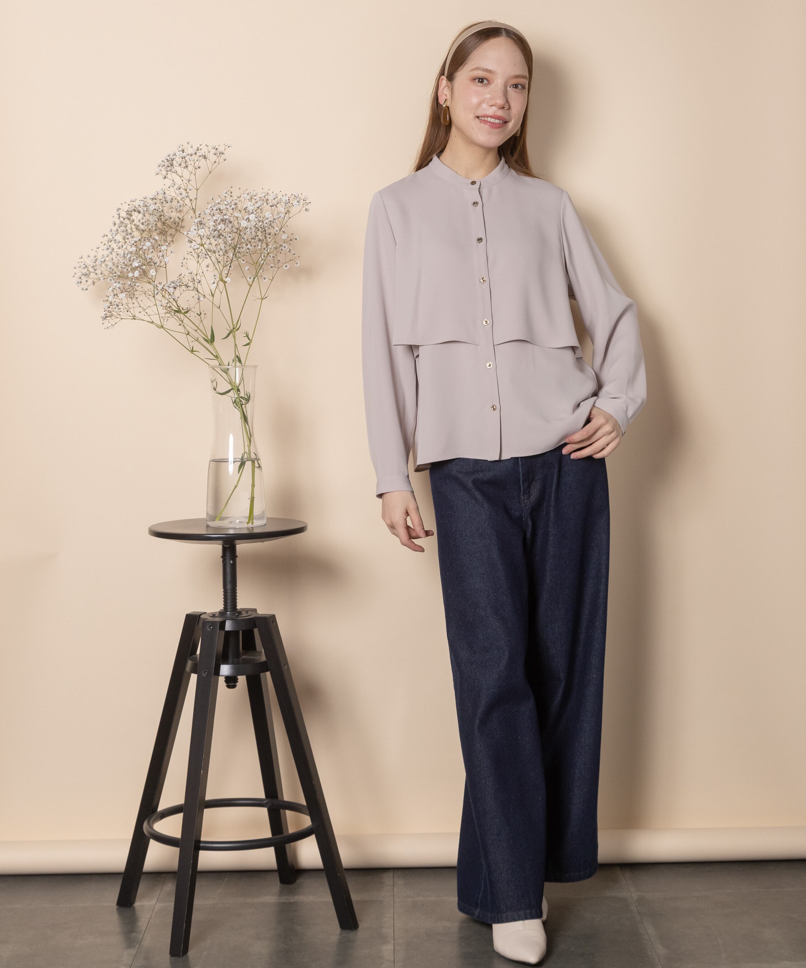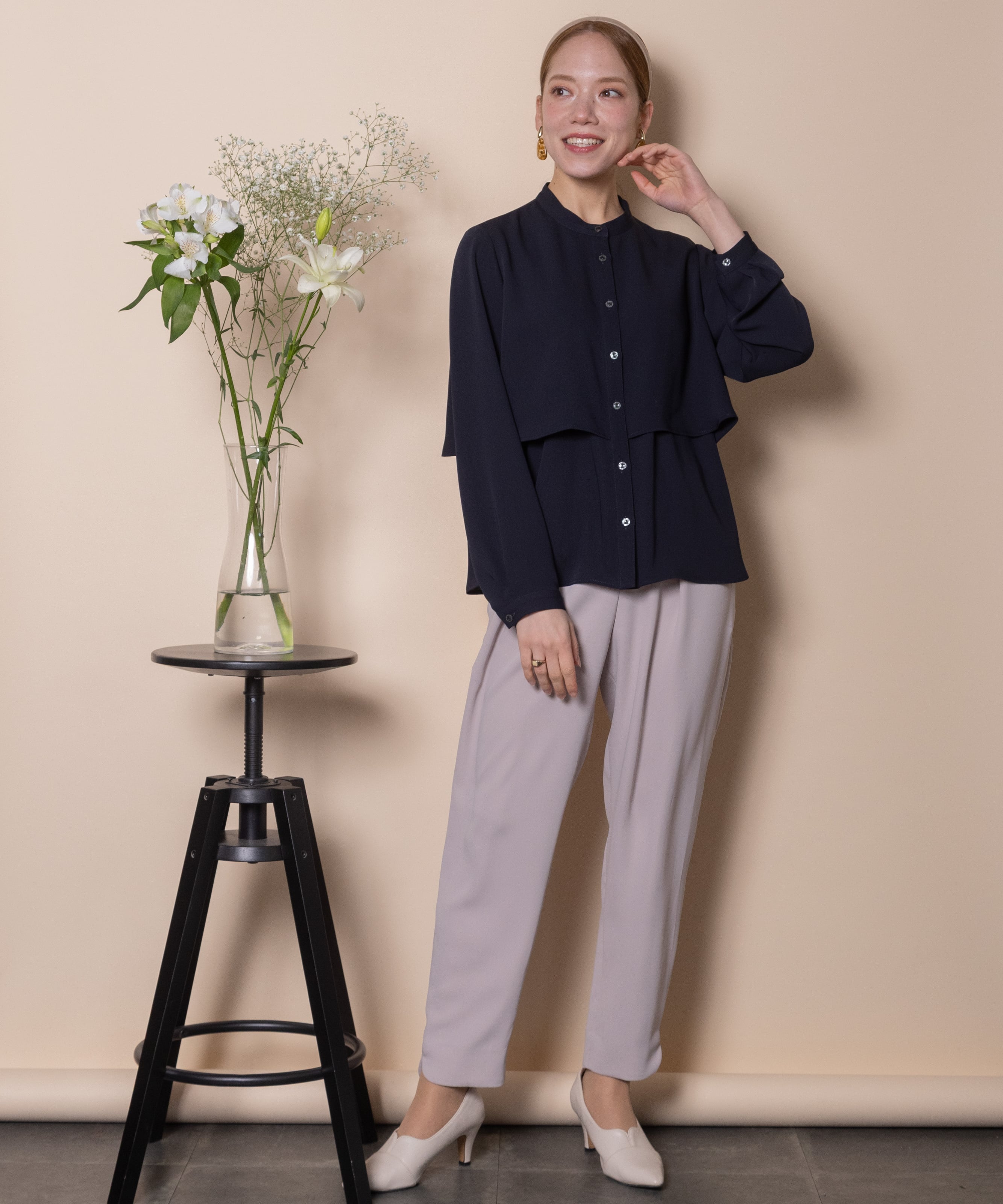 身頃に重ねたレイヤードデザインがポイント。パンツと合わせて身頃をインにするとコンパクトなフレアーブラウスに変身する2WAYブラウス。視線を引き上げる効果のあるスタイルアップのデザイン。マニッシュにクールに決まります。