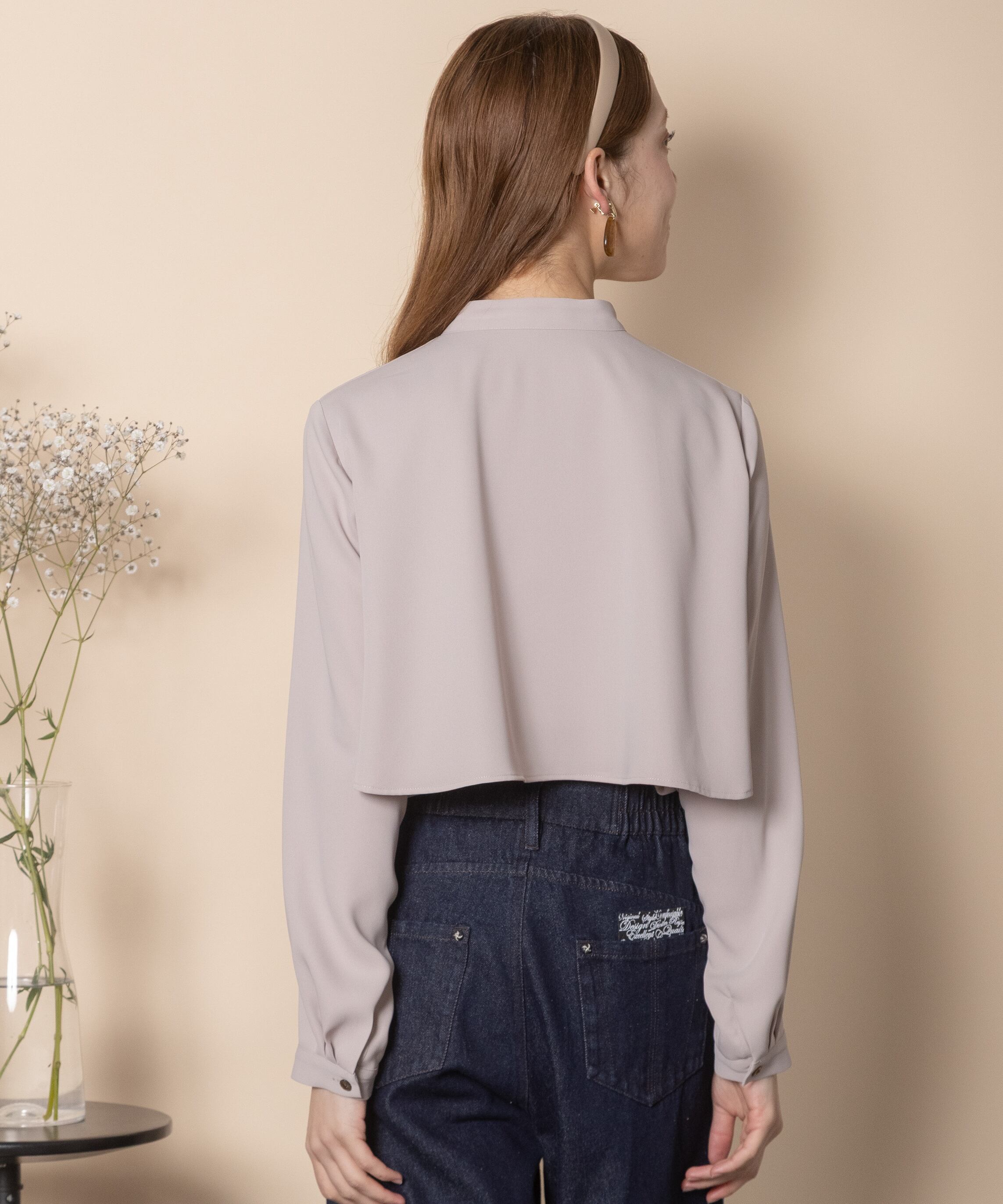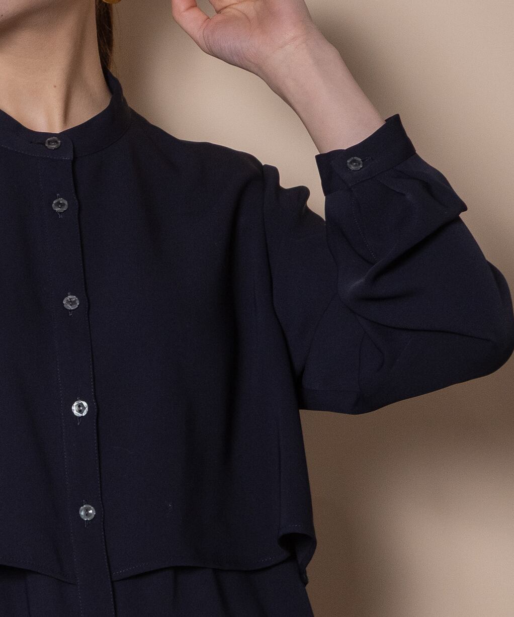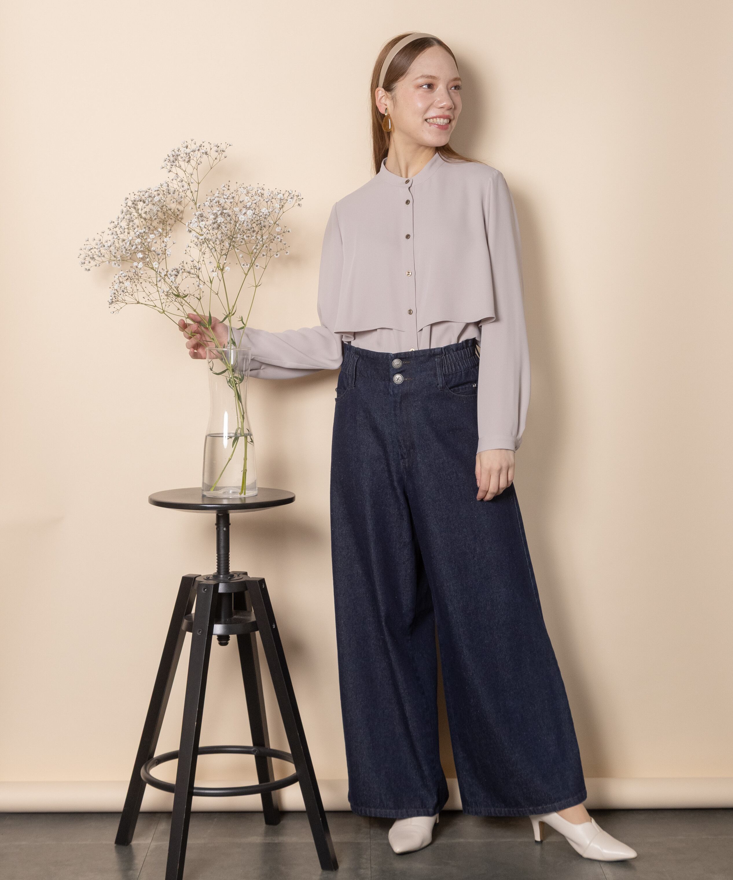 身頃に重ねたレイヤードデザインがポイント。パンツと合わせて身頃をインにするとコンパクトなフレアーブラウスに変身する2WAYブラウス。視線を引き上げる効果のあるスタイルアップのデザイン。マニッシュにクールに決まります。