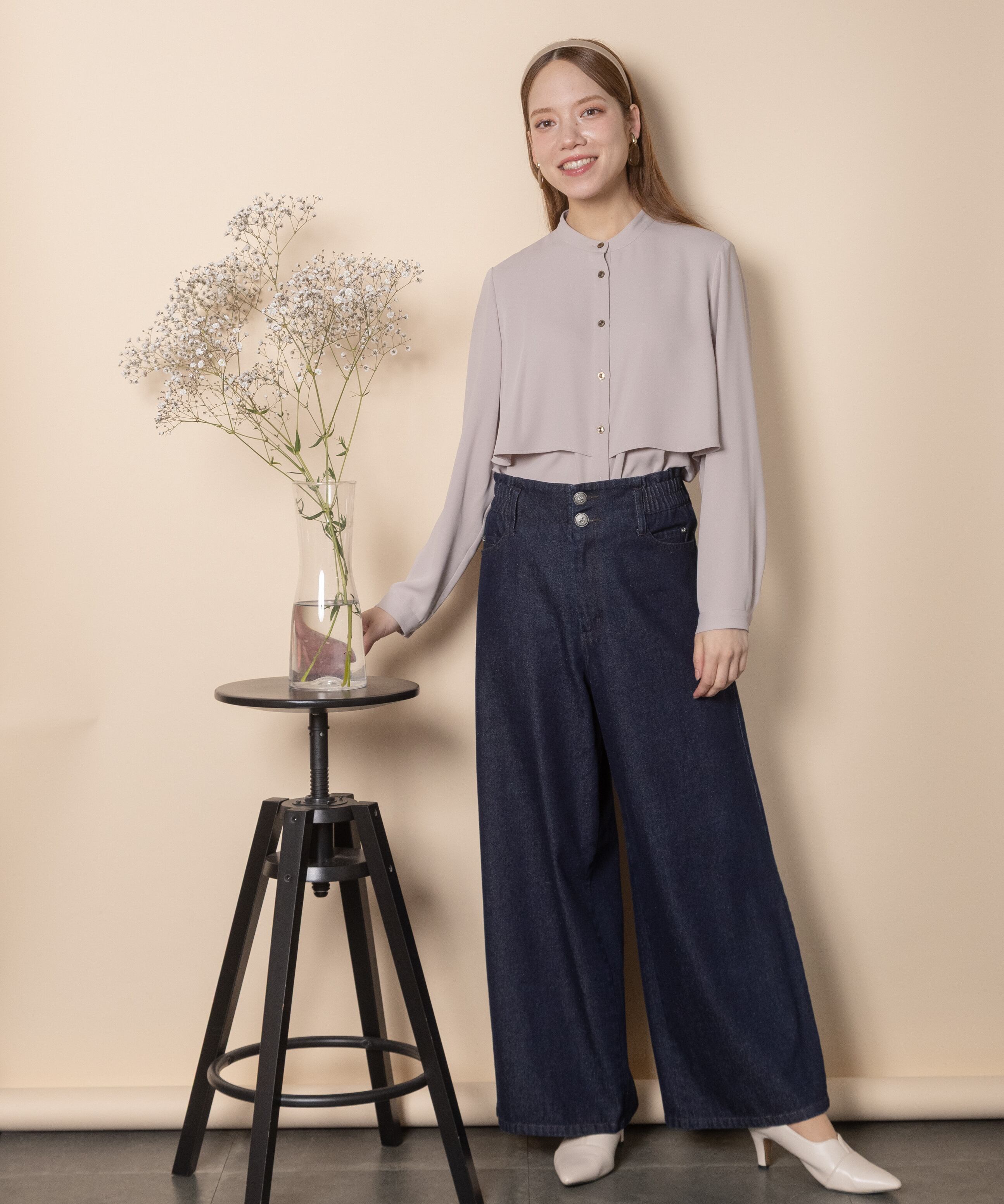 身頃に重ねたレイヤードデザインがポイント。パンツと合わせて身頃をインにするとコンパクトなフレアーブラウスに変身する2WAYブラウス。視線を引き上げる効果のあるスタイルアップのデザイン。マニッシュにクールに決まります。