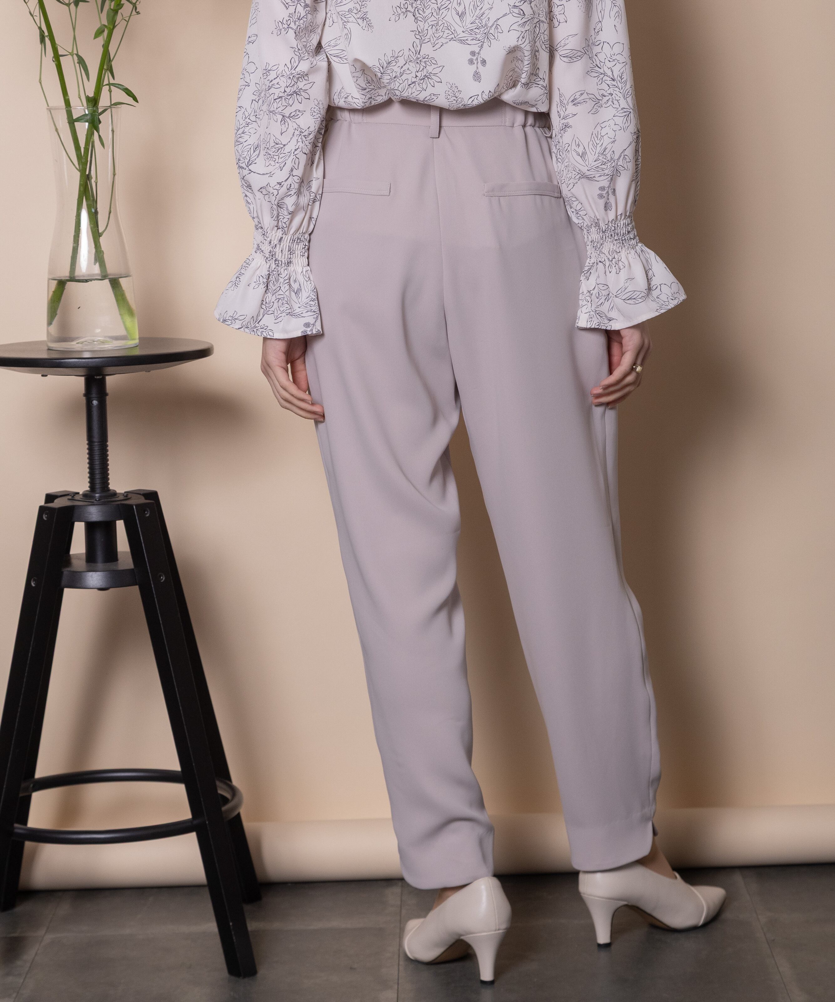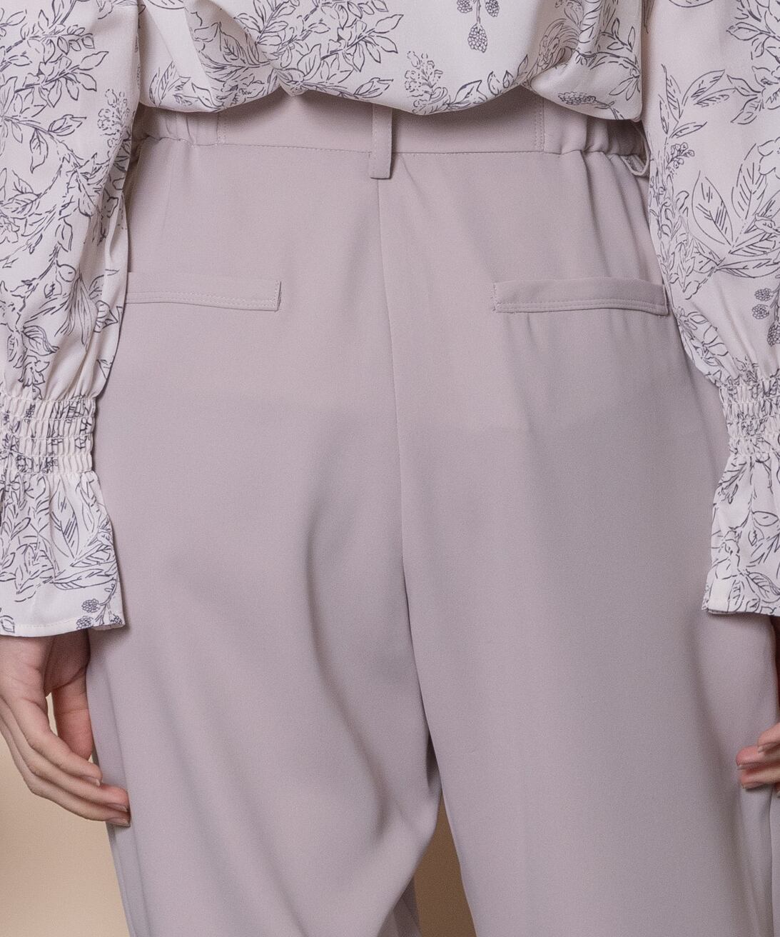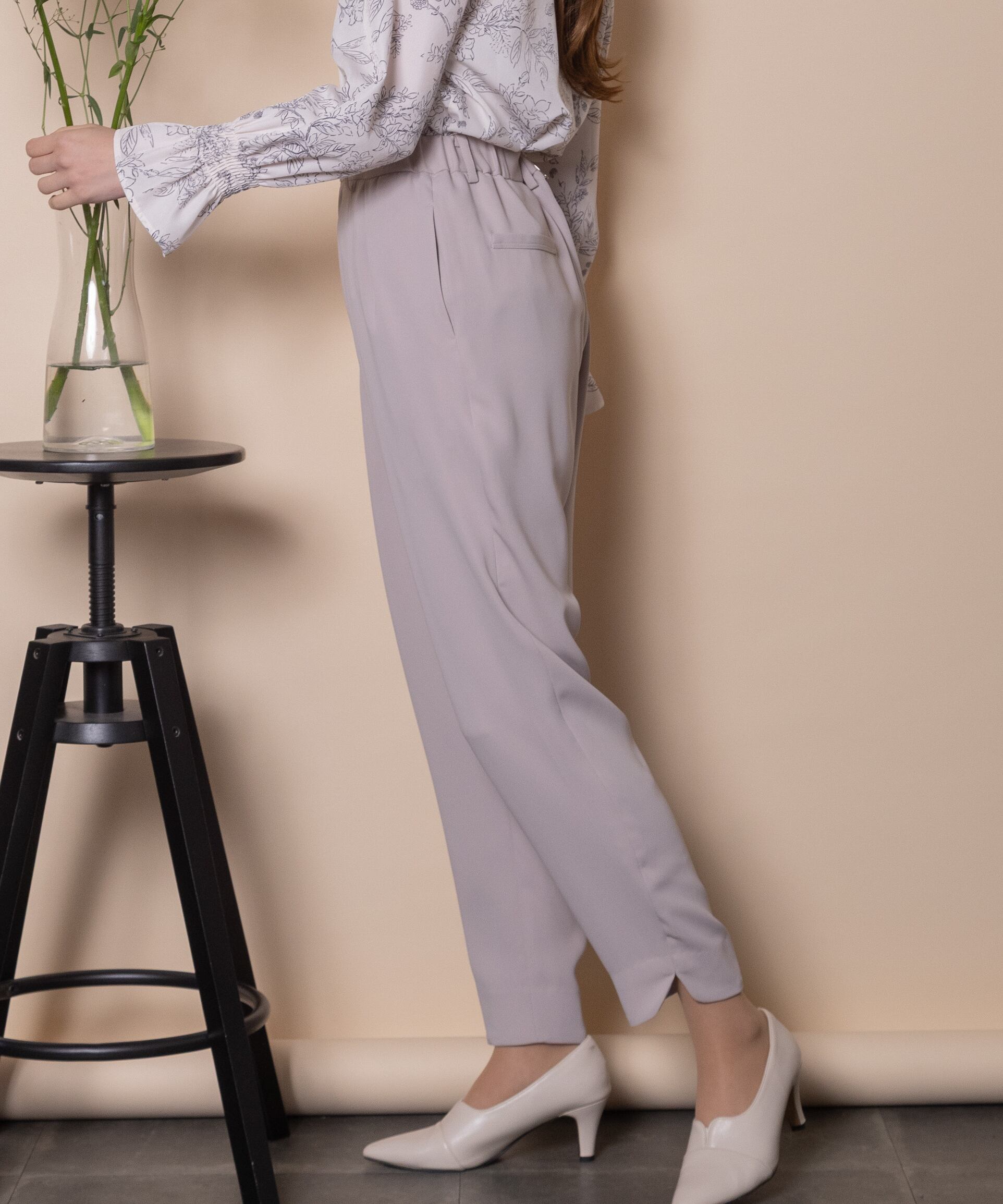 アニープラスで定評のある美脚テーパードパンツ。一枚あると重宝するキレイめパンツ。腰回りは程よいゆとりを持たせたタック入りテーパードパンツ。ウエストはバックゴム仕様、裾はラウンドスリットデザイン。