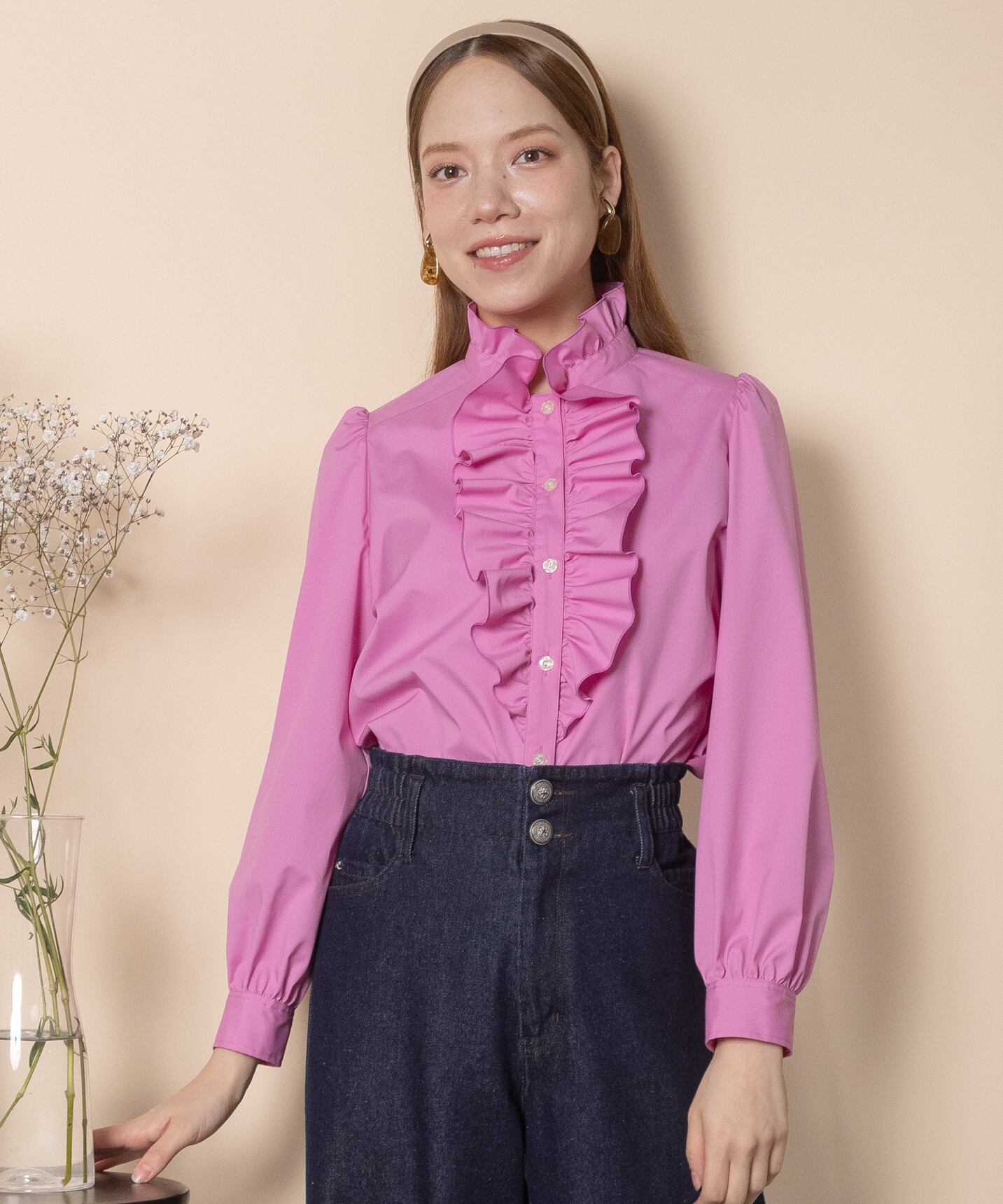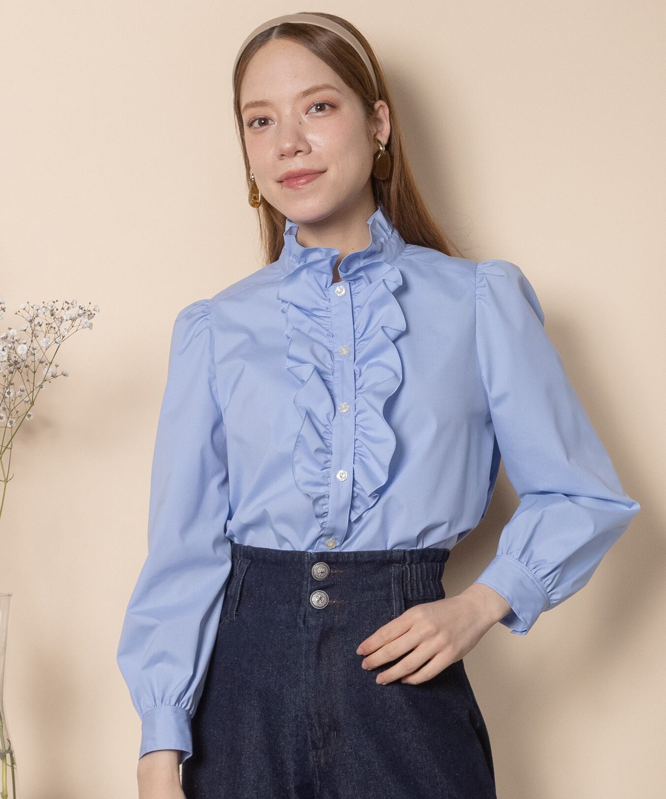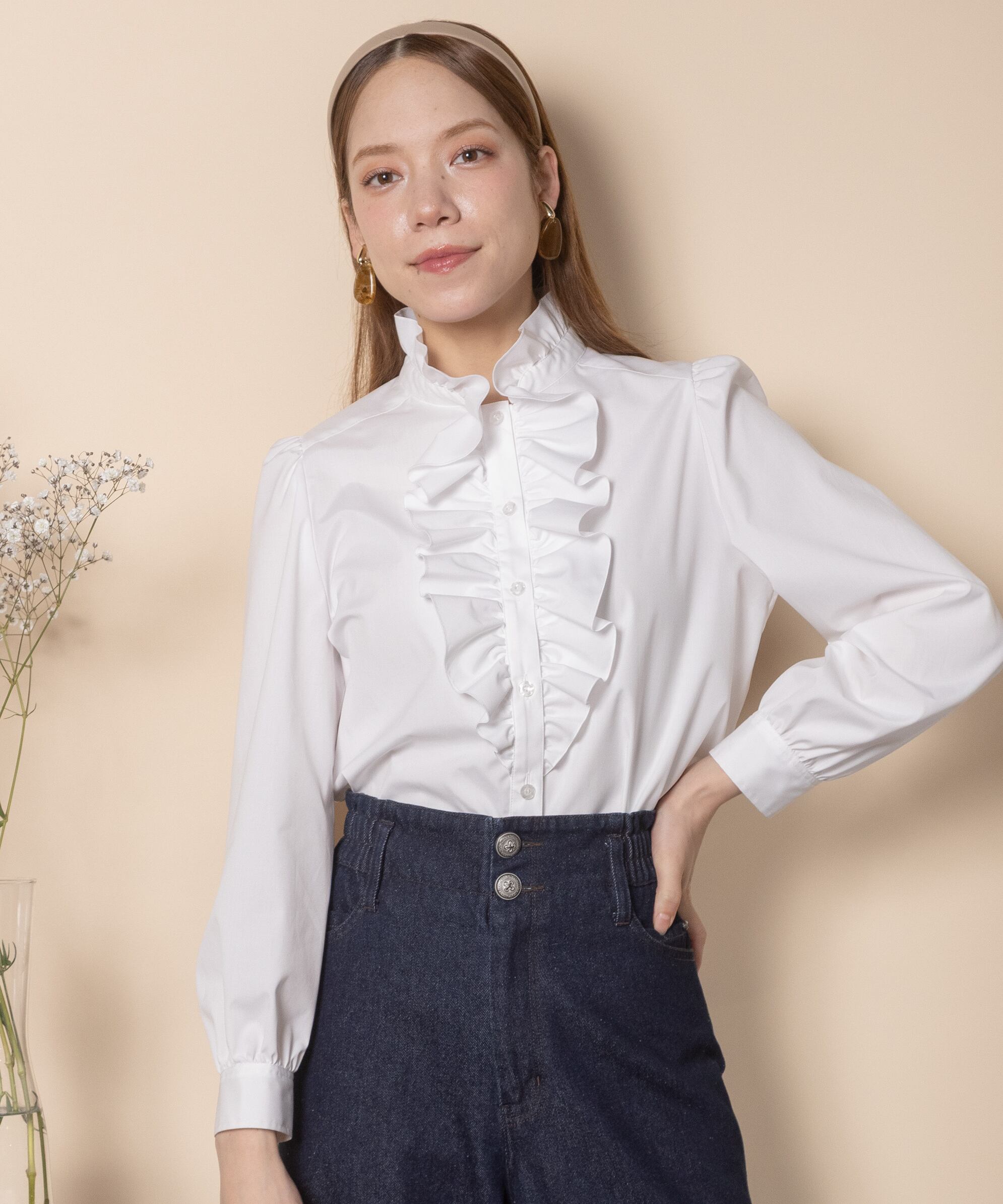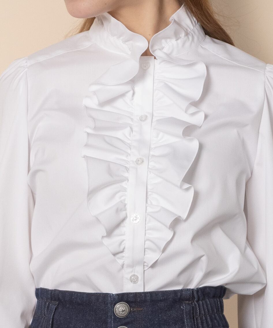 フロントのゴージャスなフリルが魅力のクラシカルなシャツブラウス。お顔周りが華やかになる立体的なフリルが魅力。ジャケットと相性もよく、お仕事シーンやお出かけシーンにおすすめ。コンサバティブな仕立てのキレイなシャツブラウスです。