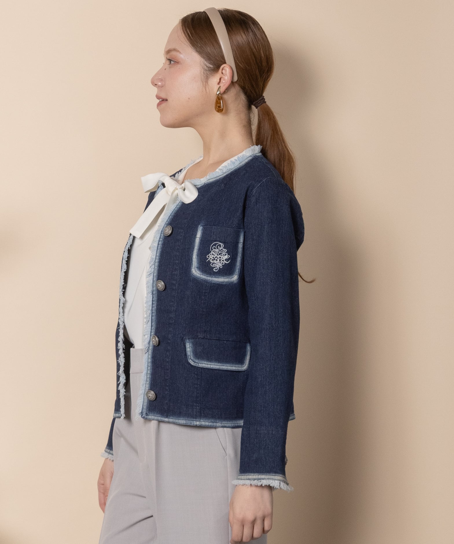定番人気のノーカラーデニムジャケットがアップデート。胸元のブランドロゴのワッペン刺繍、配色のフリンジパイピング、アンティーク風ボタンとこだわりの詰まったデニムジャケット。肩周りはコンパクトなデザイン。着心地が良く軽量で羽織りやすいライトジャケット。