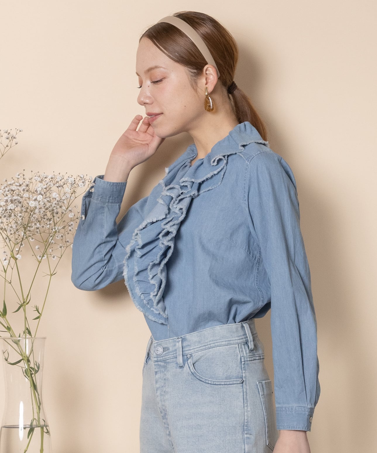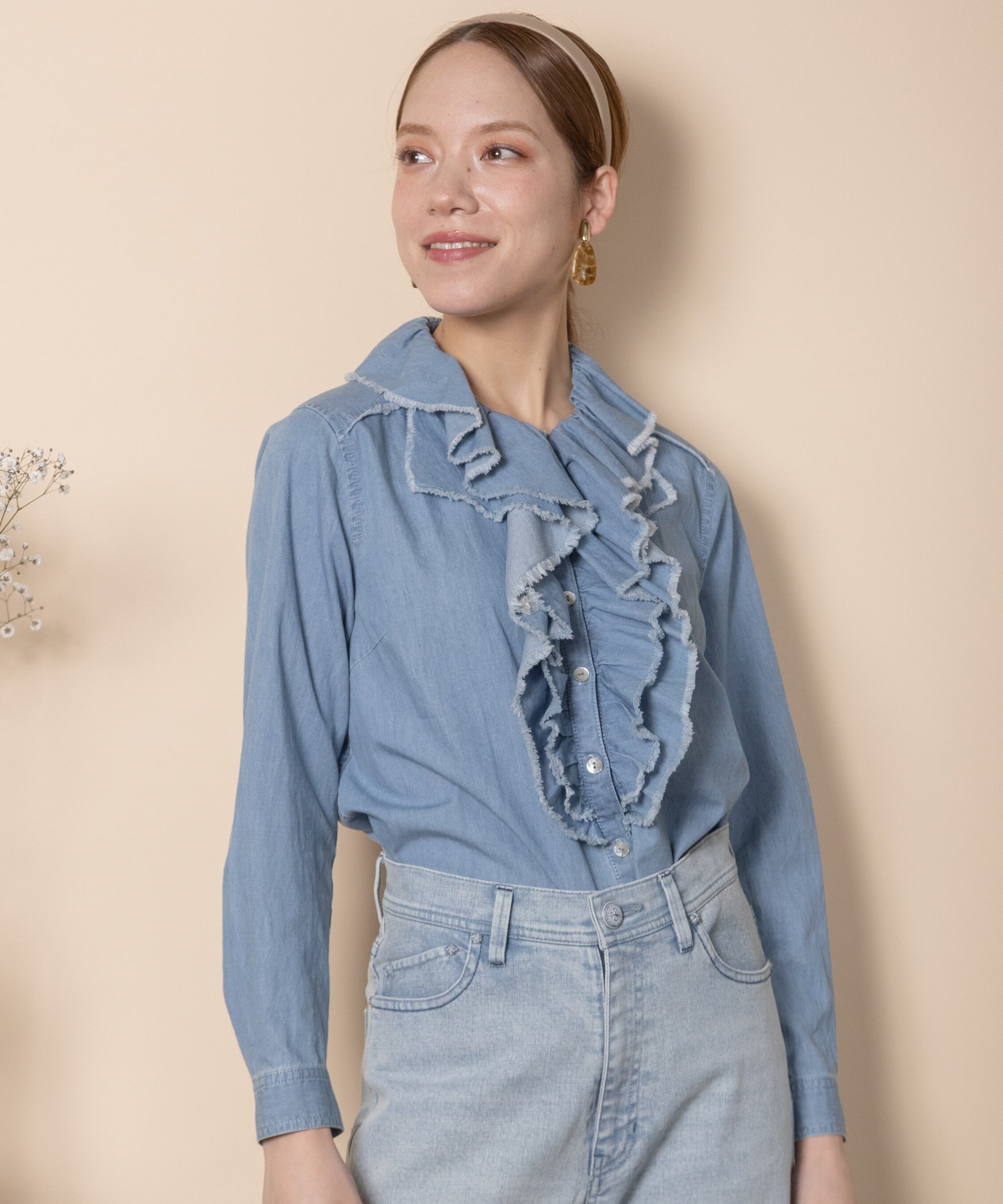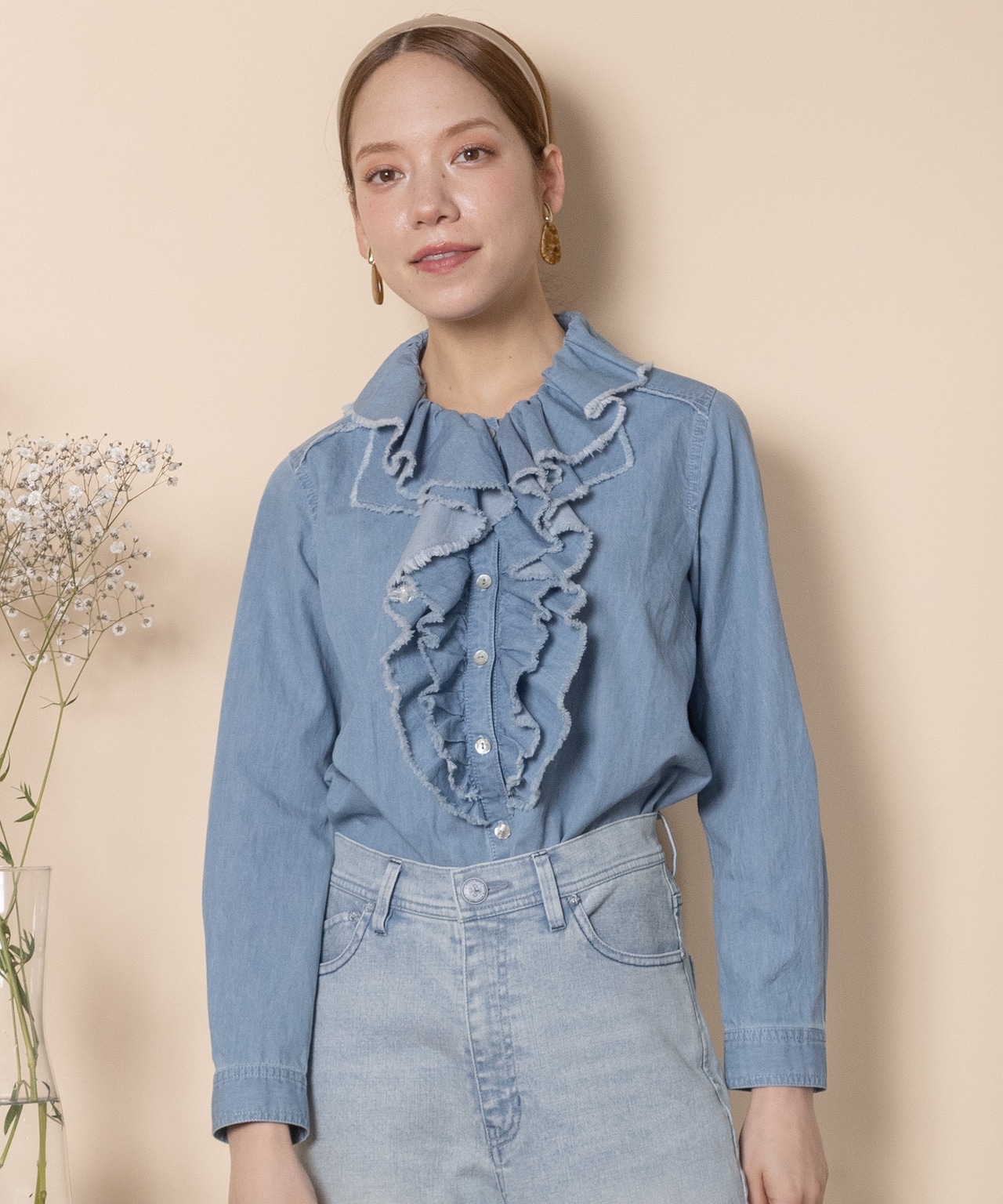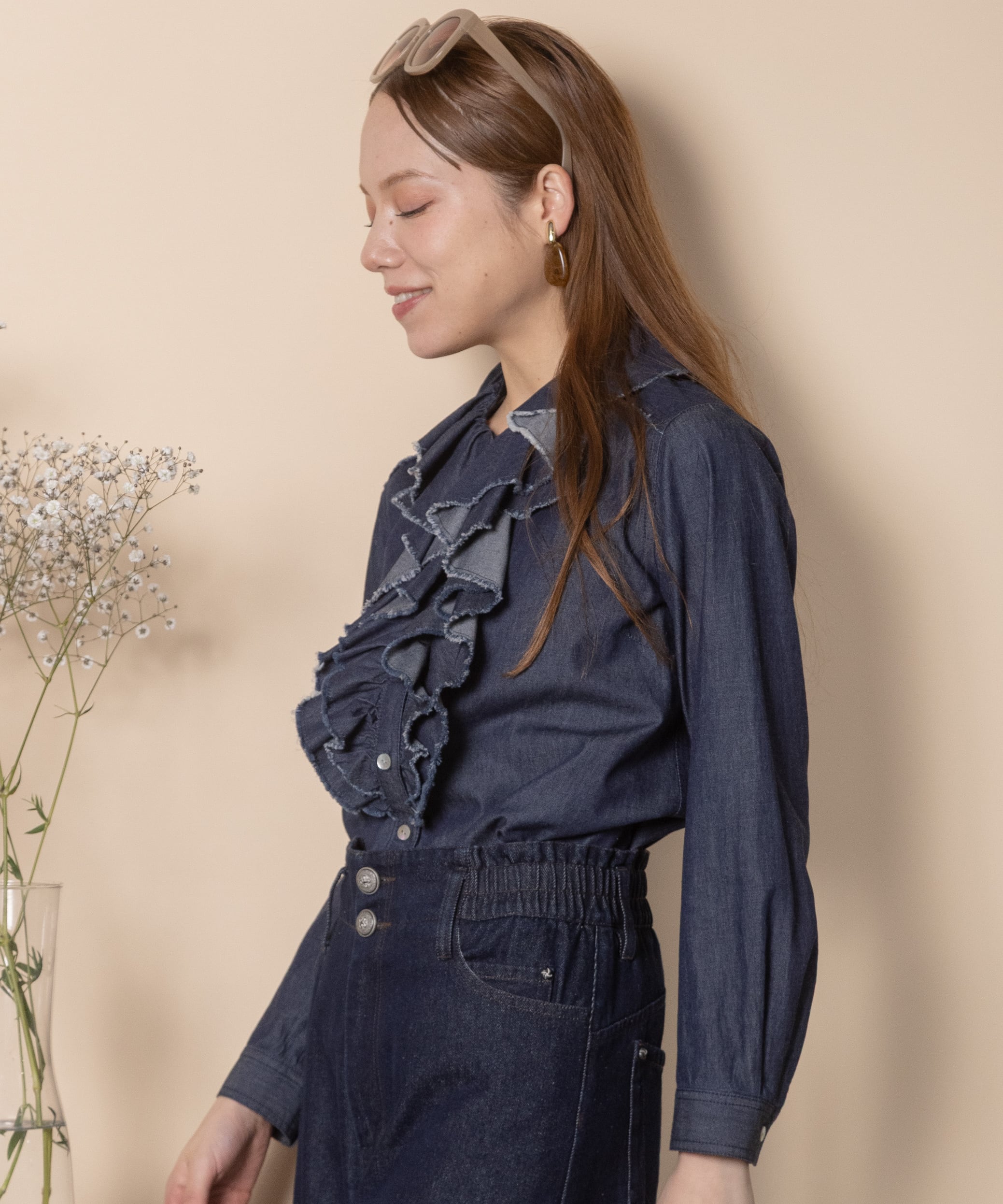 トレンドの大胆なフリルがデザインされたデニムシャツ。ヴィンテージライクな立ち切りのラッフルフリルデザイン。甘さが魅力のフリルに肩がキュッと入ったコンパクトショルダーがおしゃれなアイテムです。