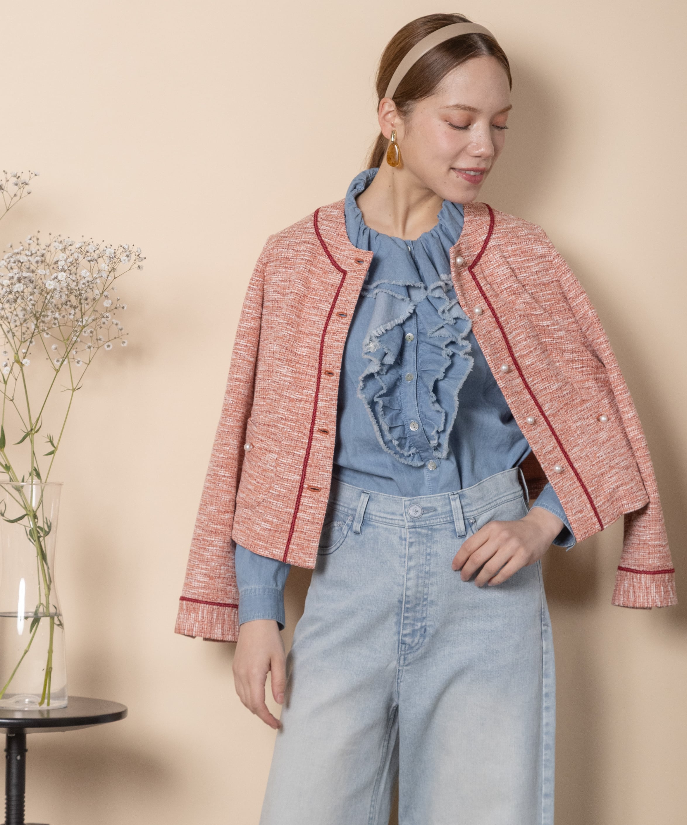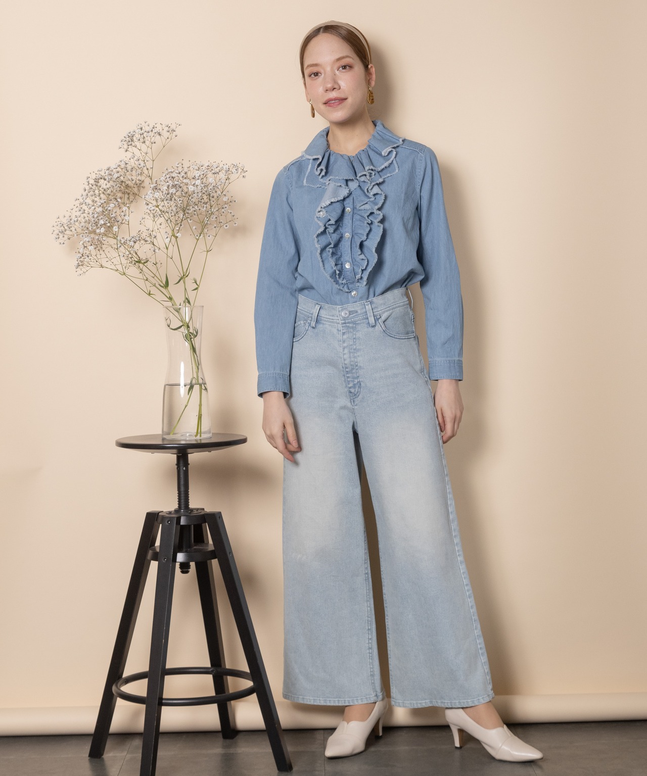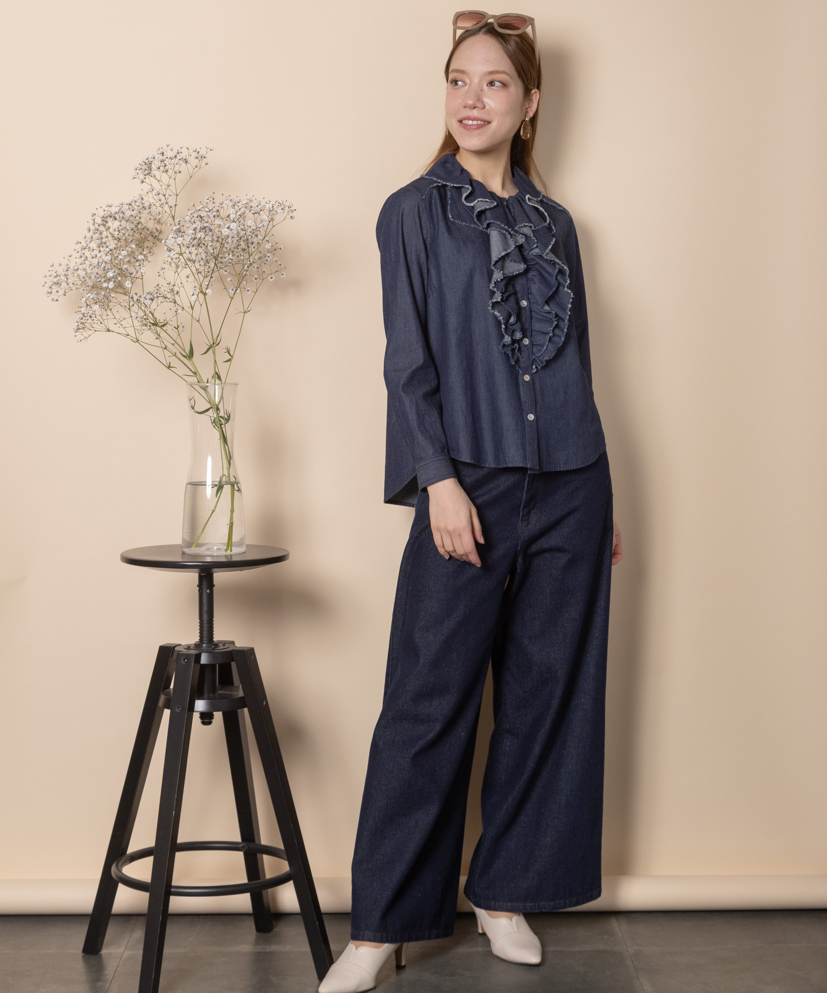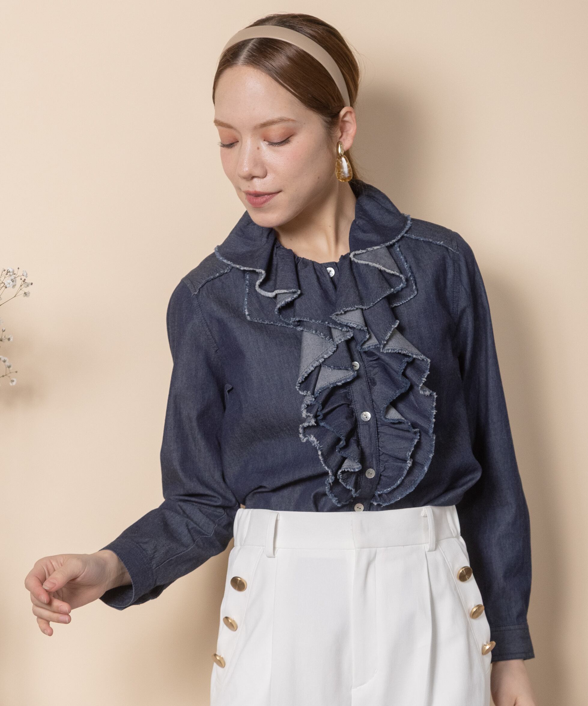 トレンドの大胆なフリルがデザインされたデニムシャツ。ヴィンテージライクな立ち切りのラッフルフリルデザイン。甘さが魅力のフリルに肩がキュッと入ったコンパクトショルダーがおしゃれなアイテムです。